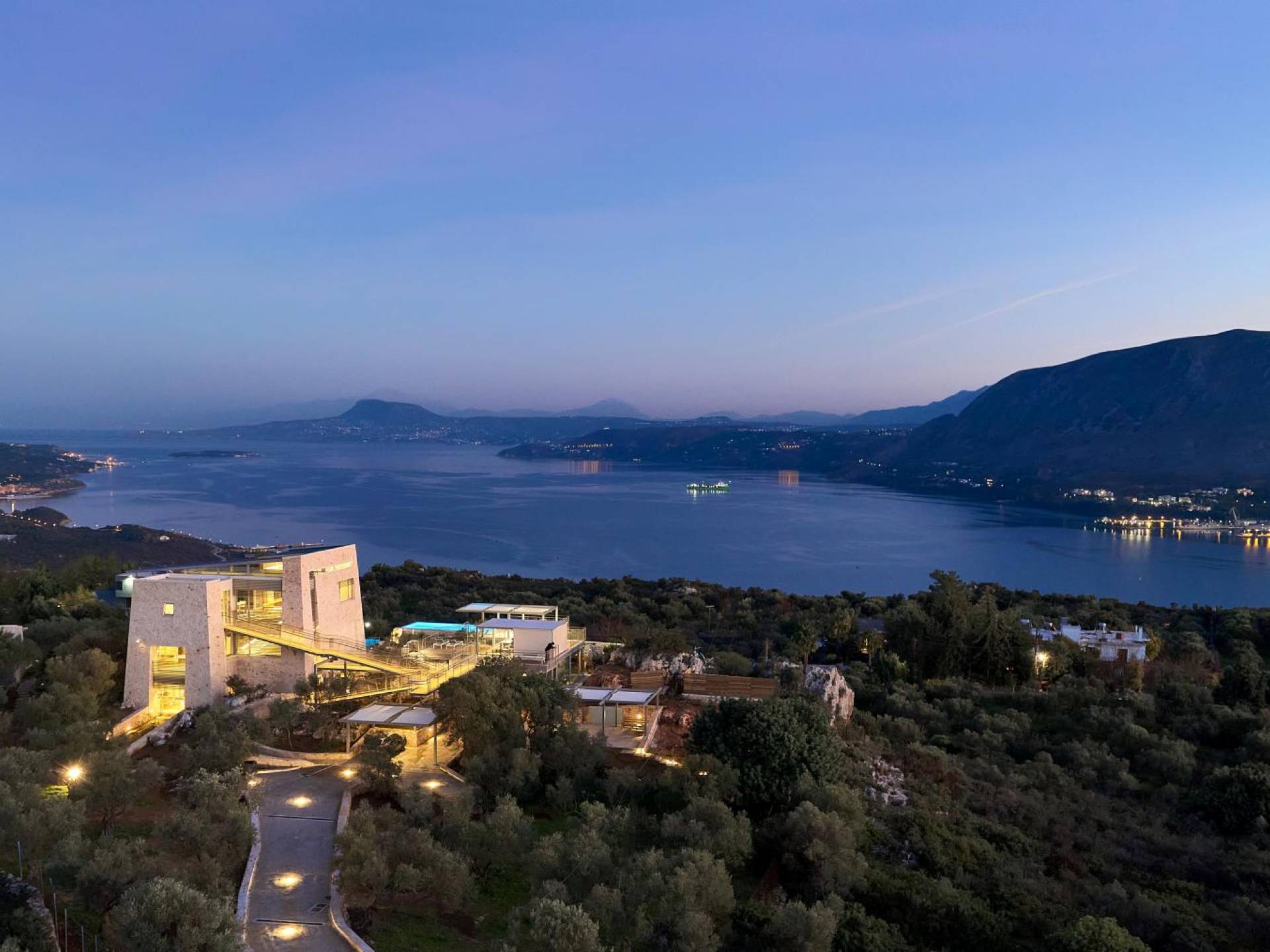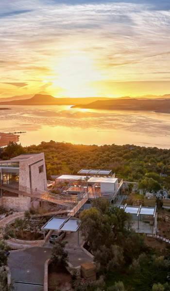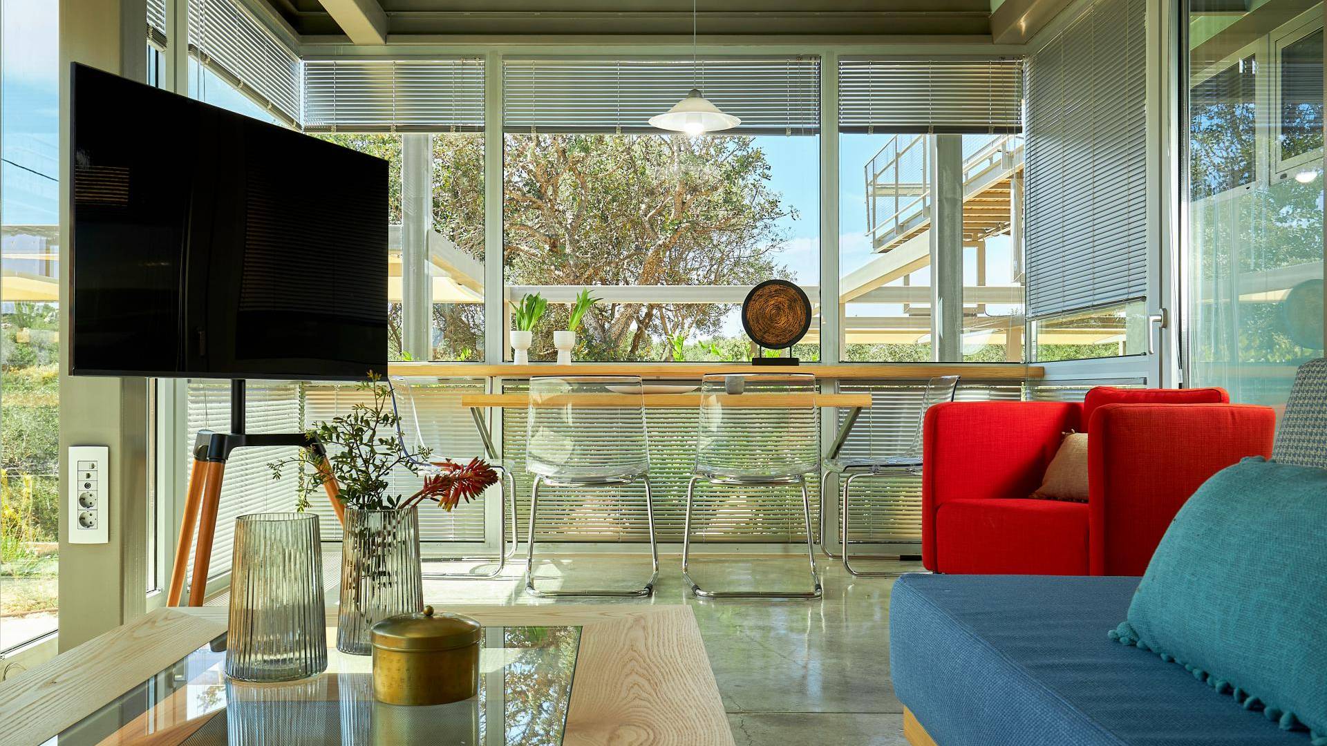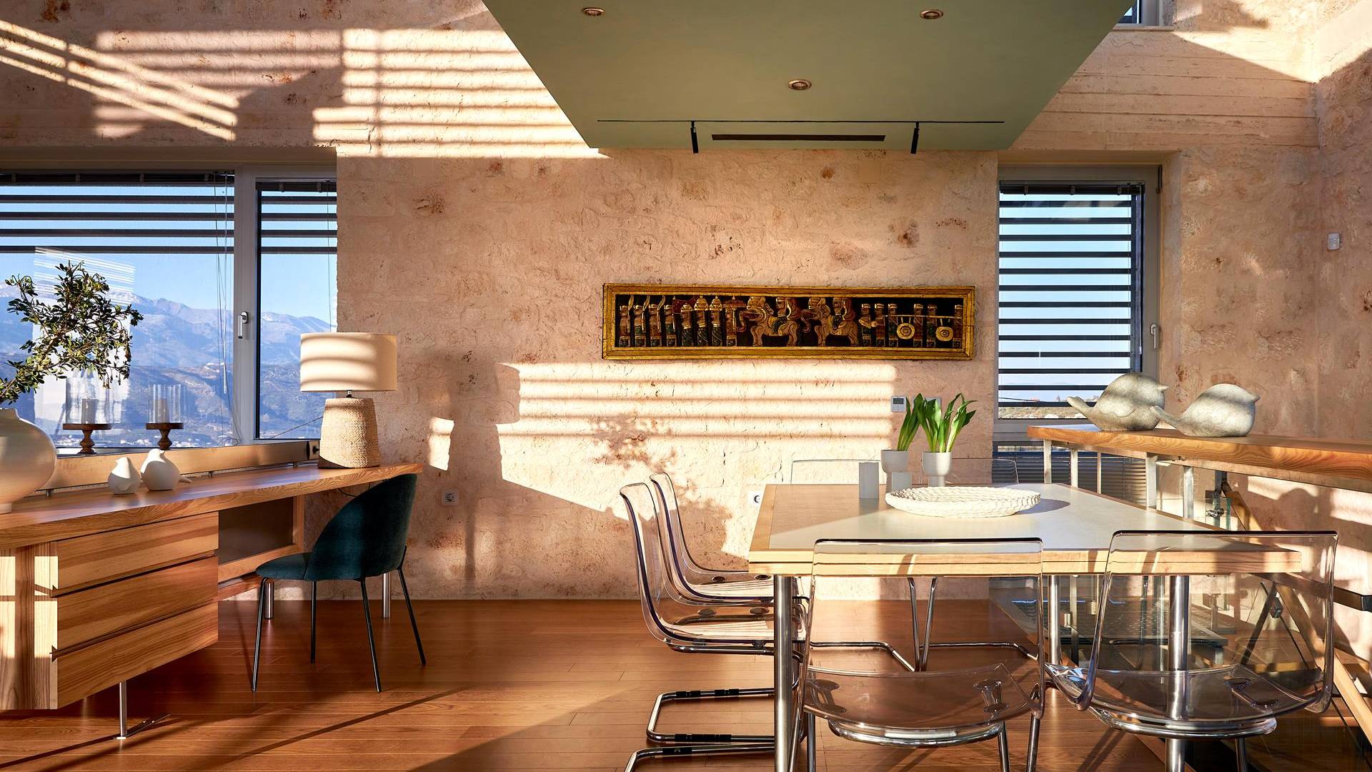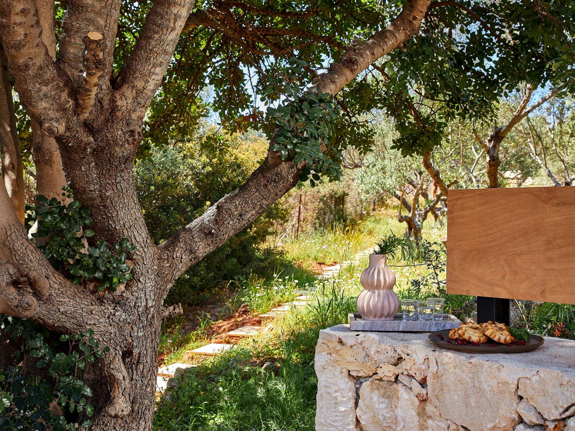 Benvenuti a Olives and Thyme Retreat, uno spazio unico totalmente privato a cui si accede solo da una strada, senza che nessuno si affaccia su di esso. Arroccato sul bordo di una scogliera che domina la baia di Souda e attraverso le maestose Montagne Bianche e sopra la strada da Souda ad Akrotiri, Olives and Thyme offre la sua posizione unica. Il suo mix di pietra, legno, vetro e metallo crea uno stile newyorkese-svedese seduto in un uliveto cretese. Il complesso è costituito dall'edificio principale a forma di torre ''The Keep'', con un cottage in pietra separato sulla sinistra.