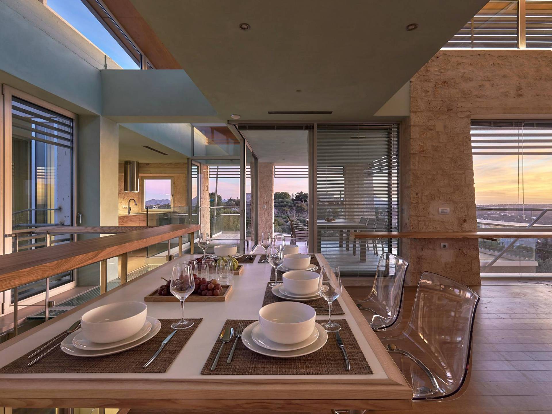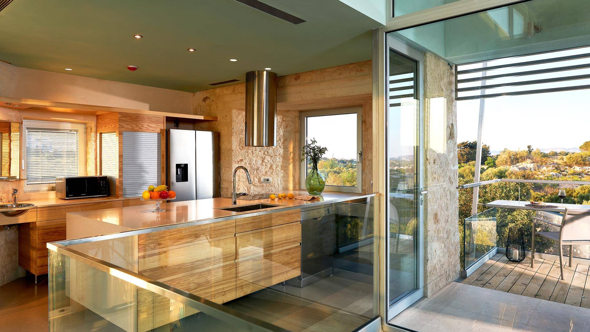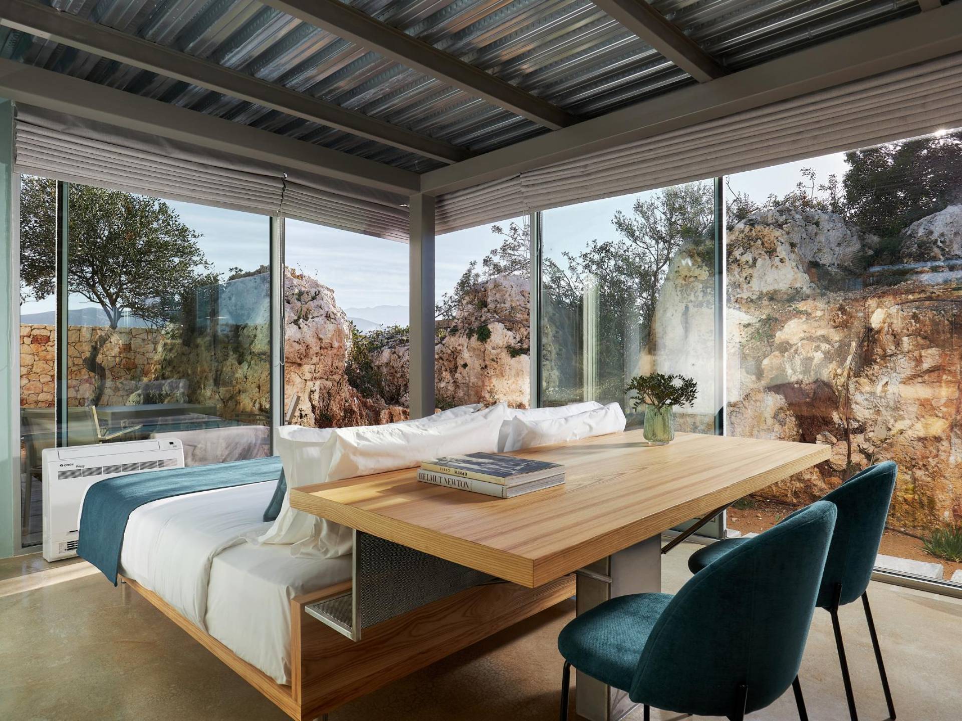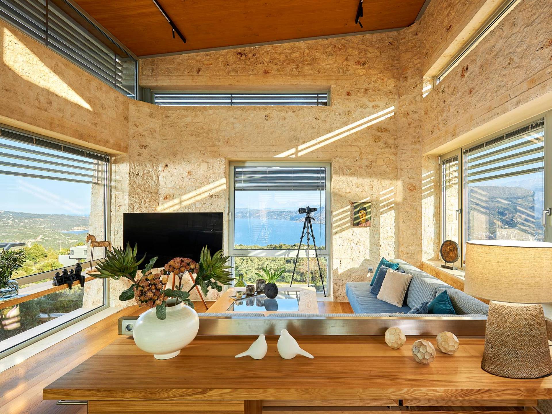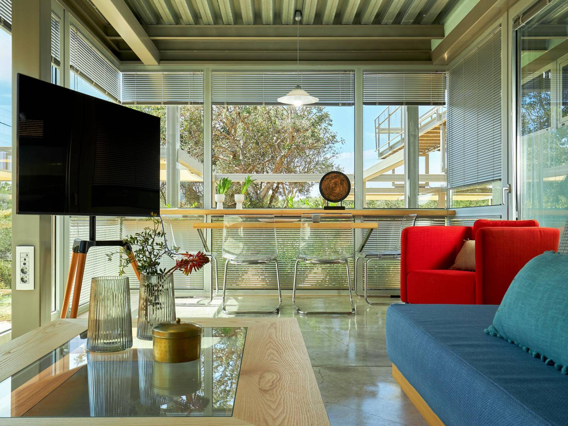 Benvenuti a Olives and Thyme Retreat, uno spazio unico totalmente privato a cui si accede solo da una strada, senza che nessuno si affaccia su di esso. Arroccato sul bordo di una scogliera che domina la baia di Souda e attraverso le maestose Montagne Bianche e sopra la strada da Souda ad Akrotiri, Olives and Thyme offre la sua posizione unica. Il suo mix di pietra, legno, vetro e metallo crea uno stile newyorkese-svedese seduto in un uliveto cretese. Il complesso è costituito dall'edificio principale a forma di torre ''The Keep'', con un cottage in pietra separato sulla sinistra.