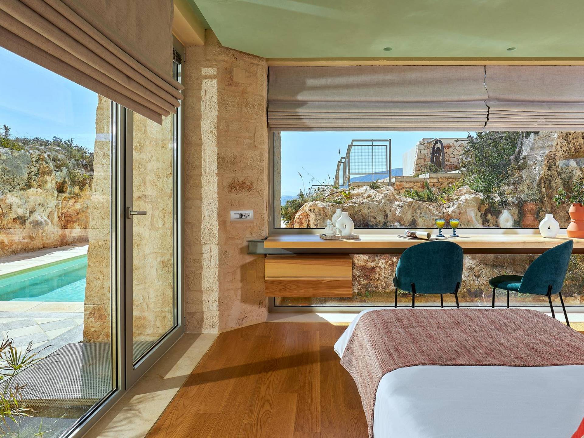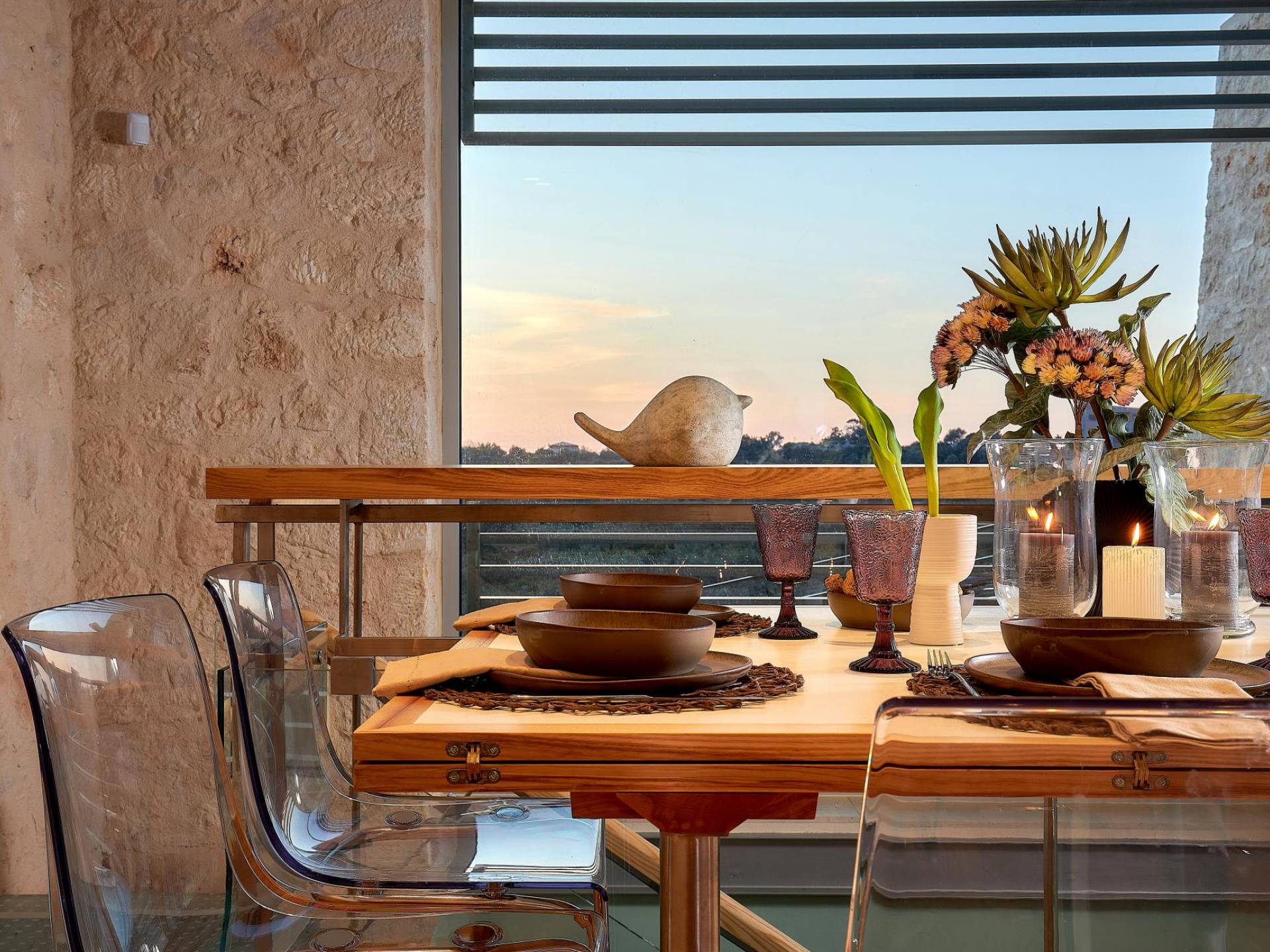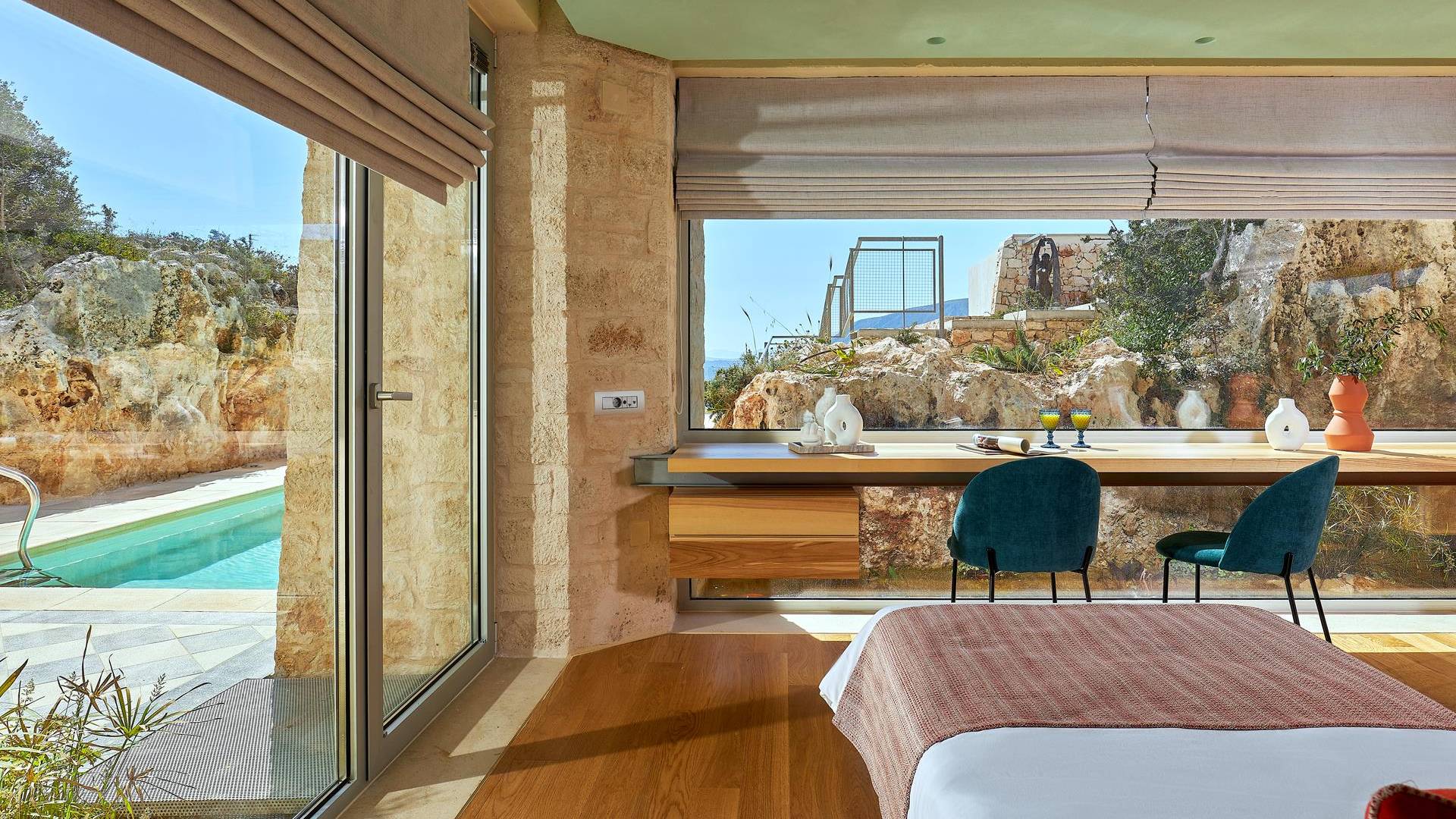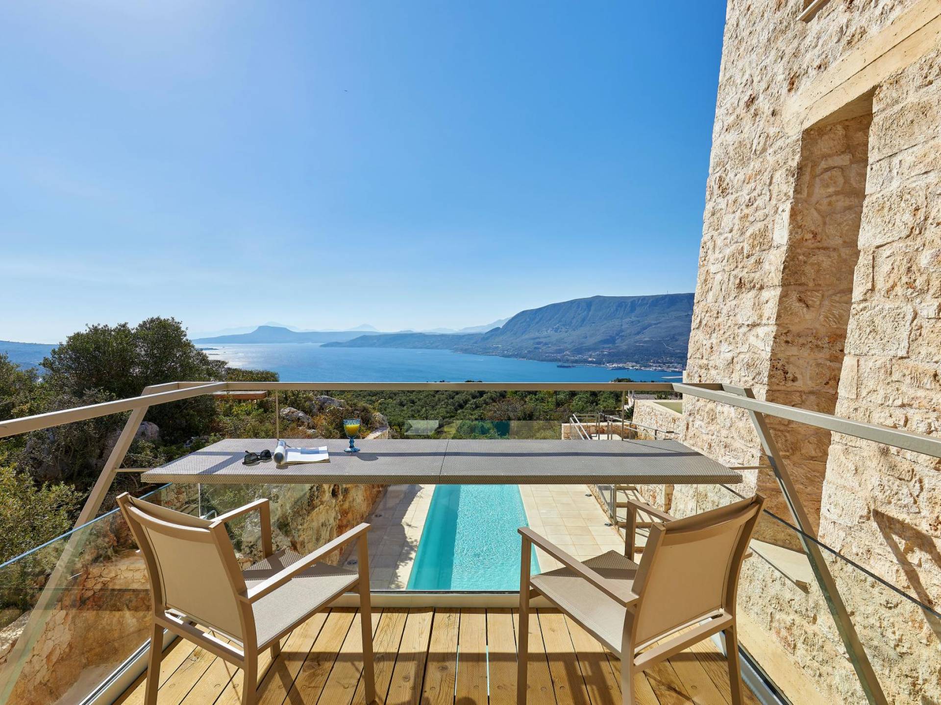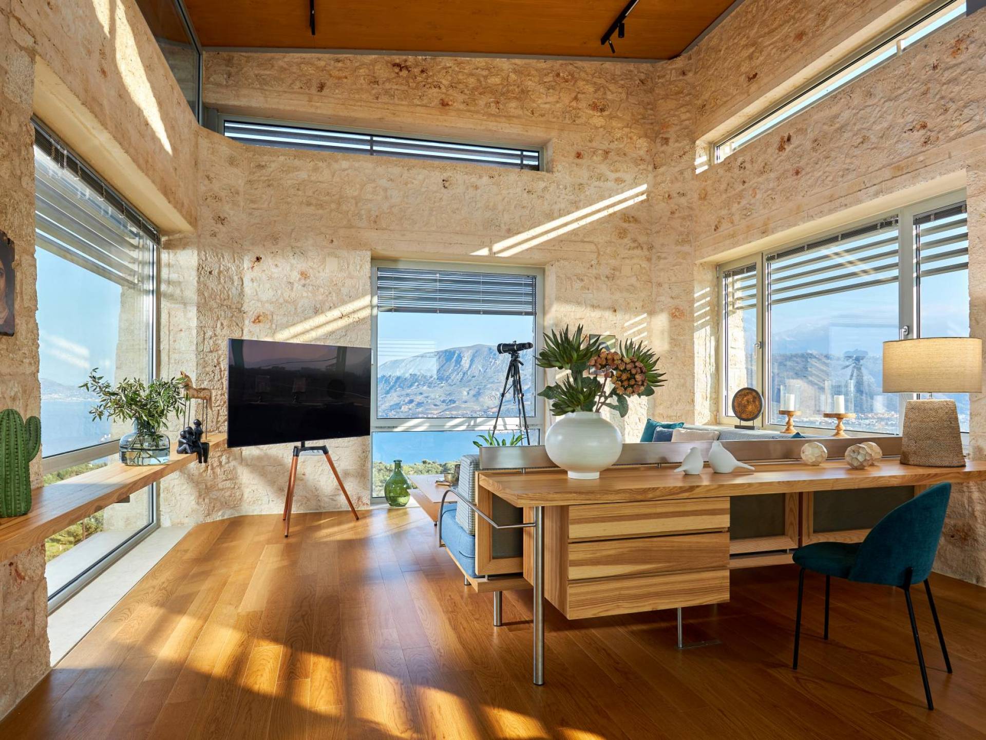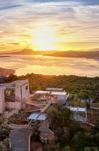 Benvenuti a Olives and Thyme Retreat, uno spazio unico totalmente privato a cui si accede solo da una strada, senza che nessuno si affaccia su di esso. Arroccato sul bordo di una scogliera che domina la baia di Souda e attraverso le maestose Montagne Bianche e sopra la strada da Souda ad Akrotiri, Olives and Thyme offre la sua posizione unica. Il suo mix di pietra, legno, vetro e metallo crea uno stile newyorkese-svedese seduto in un uliveto cretese. Il complesso è costituito dall'edificio principale a forma di torre ''The Keep'', con un cottage in pietra separato sulla sinistra.