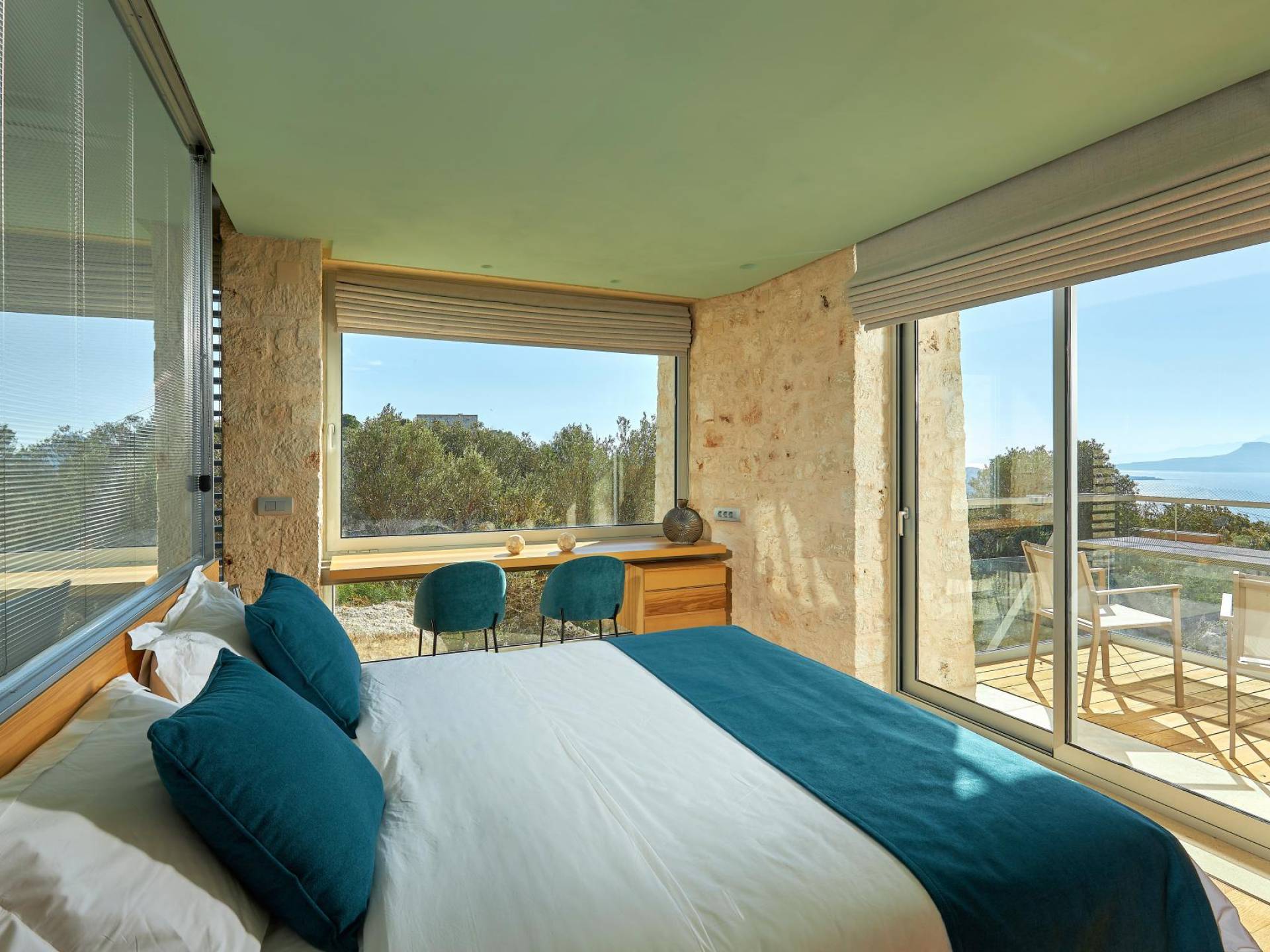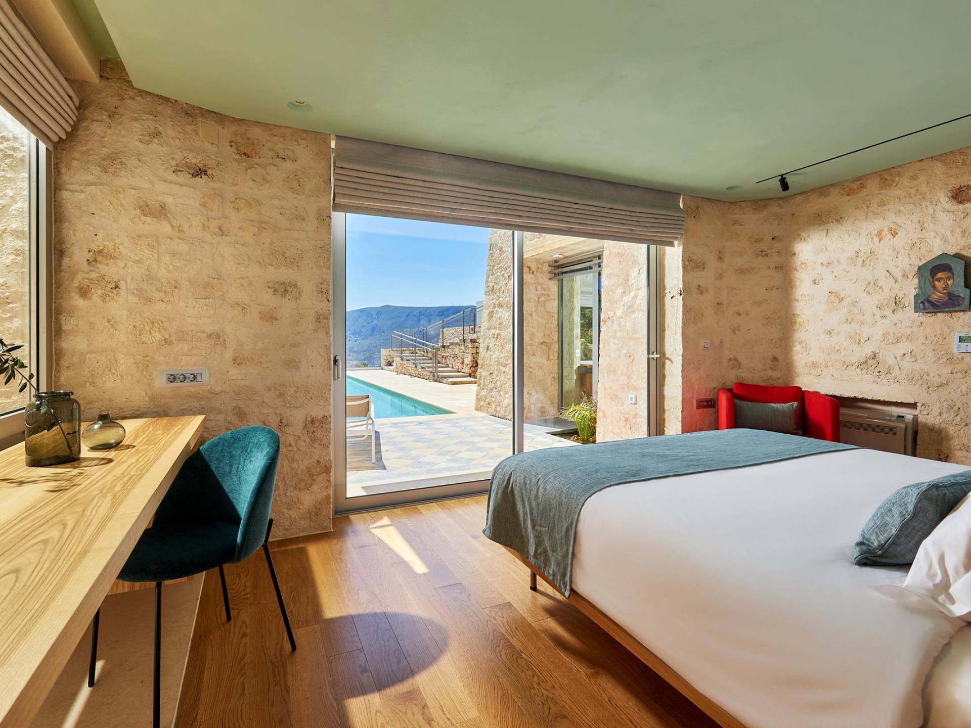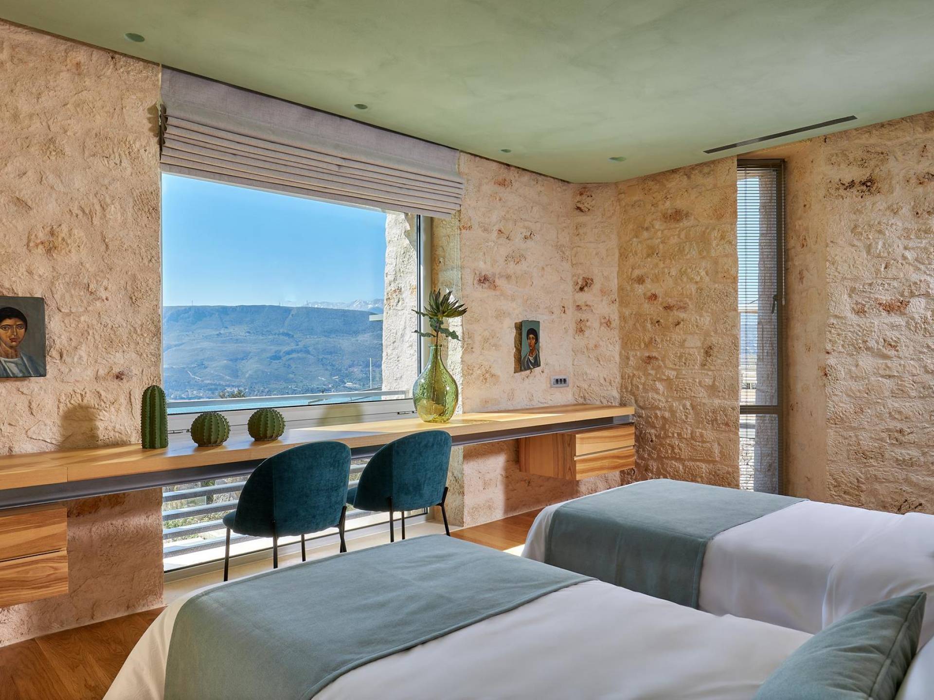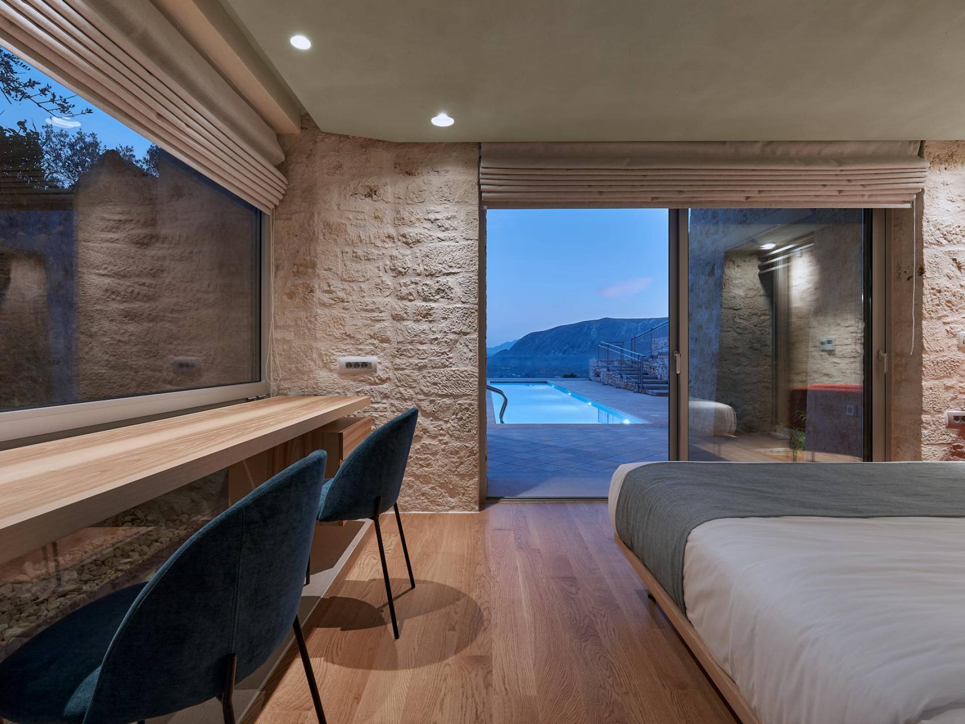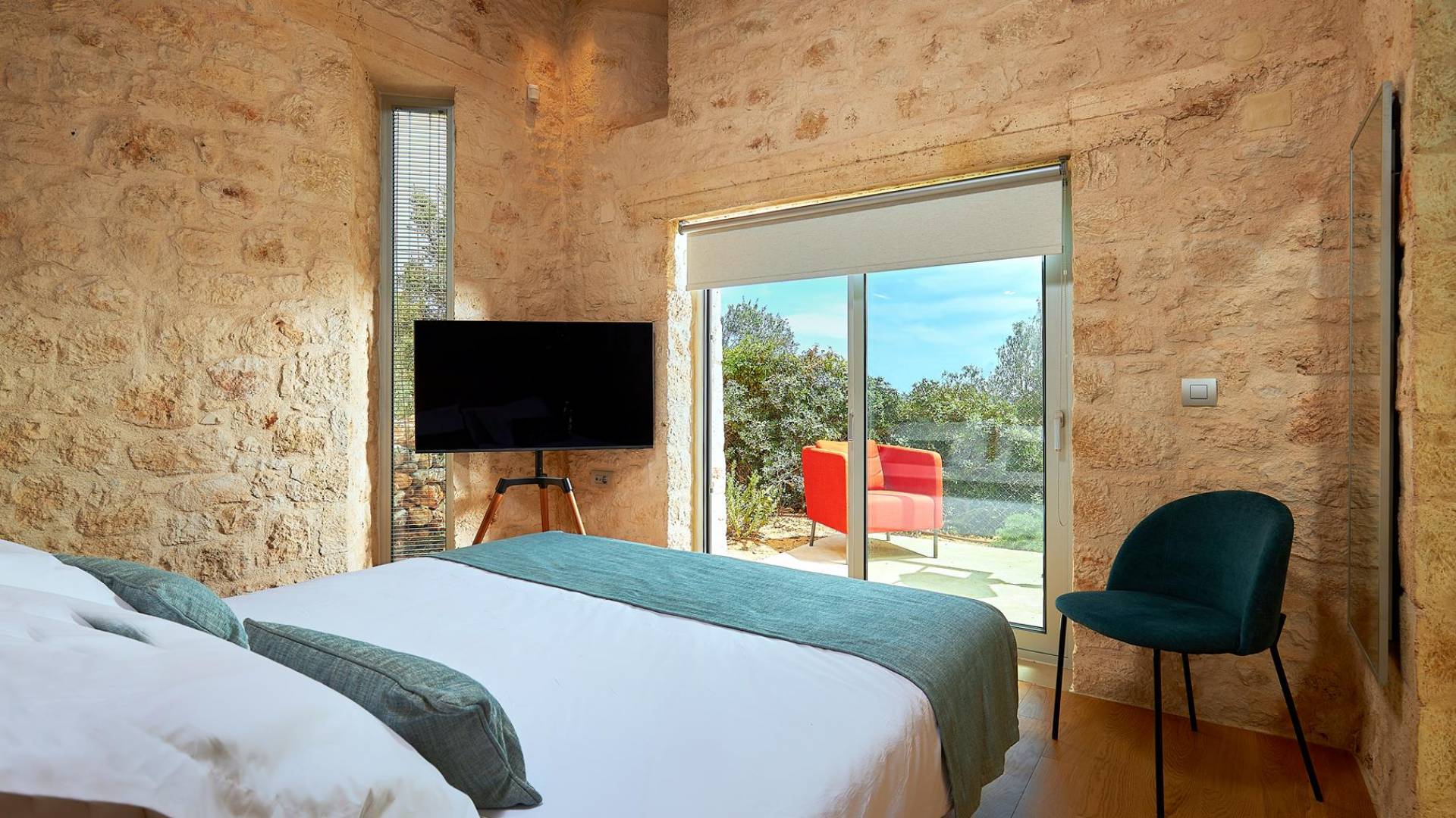 Le quattro ampie camere da letto del Mastio dispongono di comodi letti king-size, due dei quali possono essere separati per formare letti singoli. Le docce walk-in e i doppi lavandini danno spazio personale a ogni ospite. Gli armadi aperti offrono un sacco di spazio per appendere e mensole, con alcuni cassetti che offrono molto spazio per tutti i tuoi vestiti e oggetti personali. I grandi ripiani in legno possono essere utilizzati come spazio per scrivere o semplicemente come spazio per appoggiare i tuoi libri. Tutte le finestre, interne ed esterne, sono dotate di oscuranti per la privacy e per oscurare la luce. Le due camere da letto al piano terra hanno accesso alla piscina olimpionica e le due camere al primo piano hanno un accesso pedonale alla piscina infinita e all'area ricreativa.