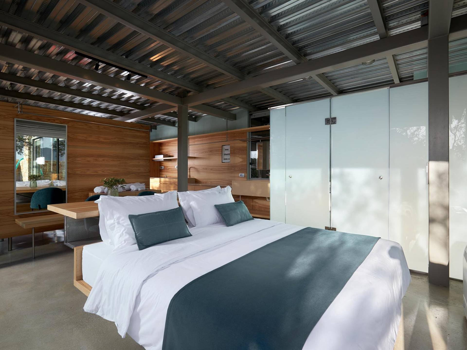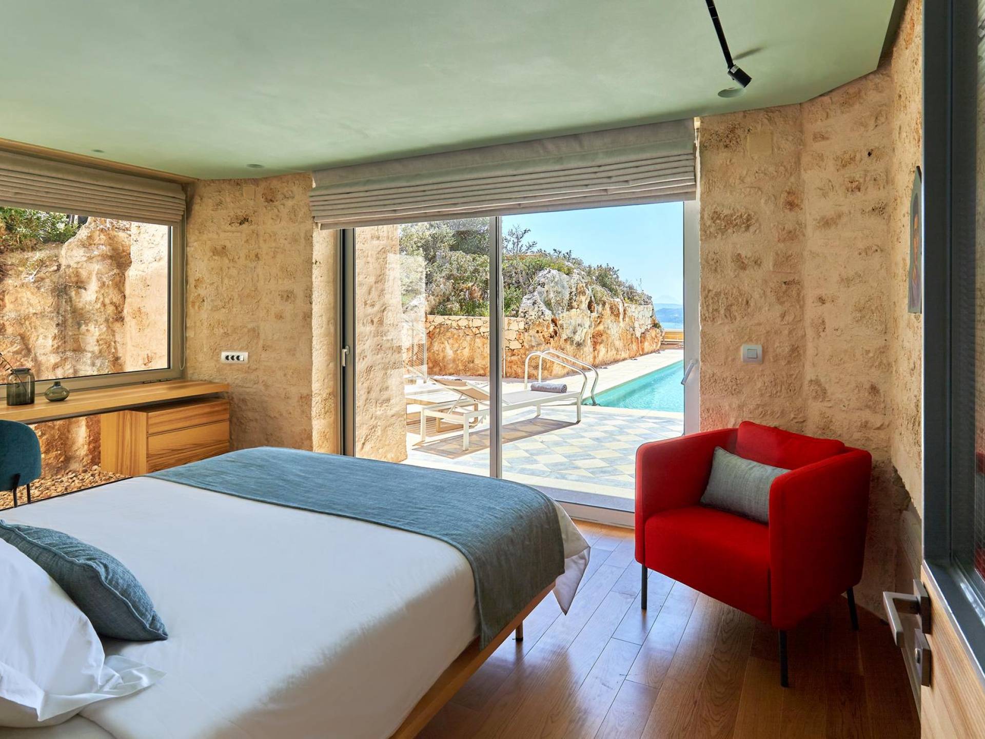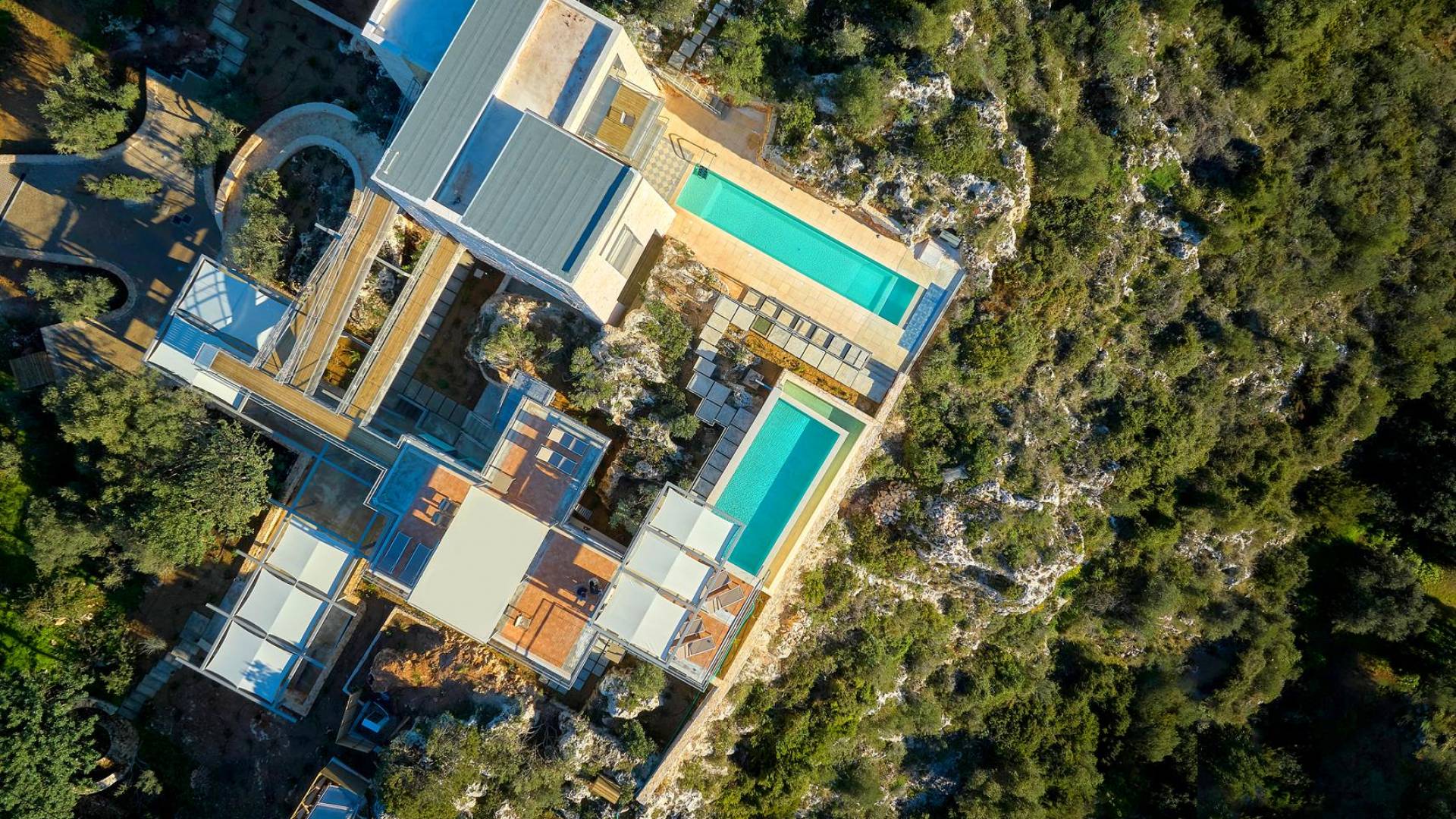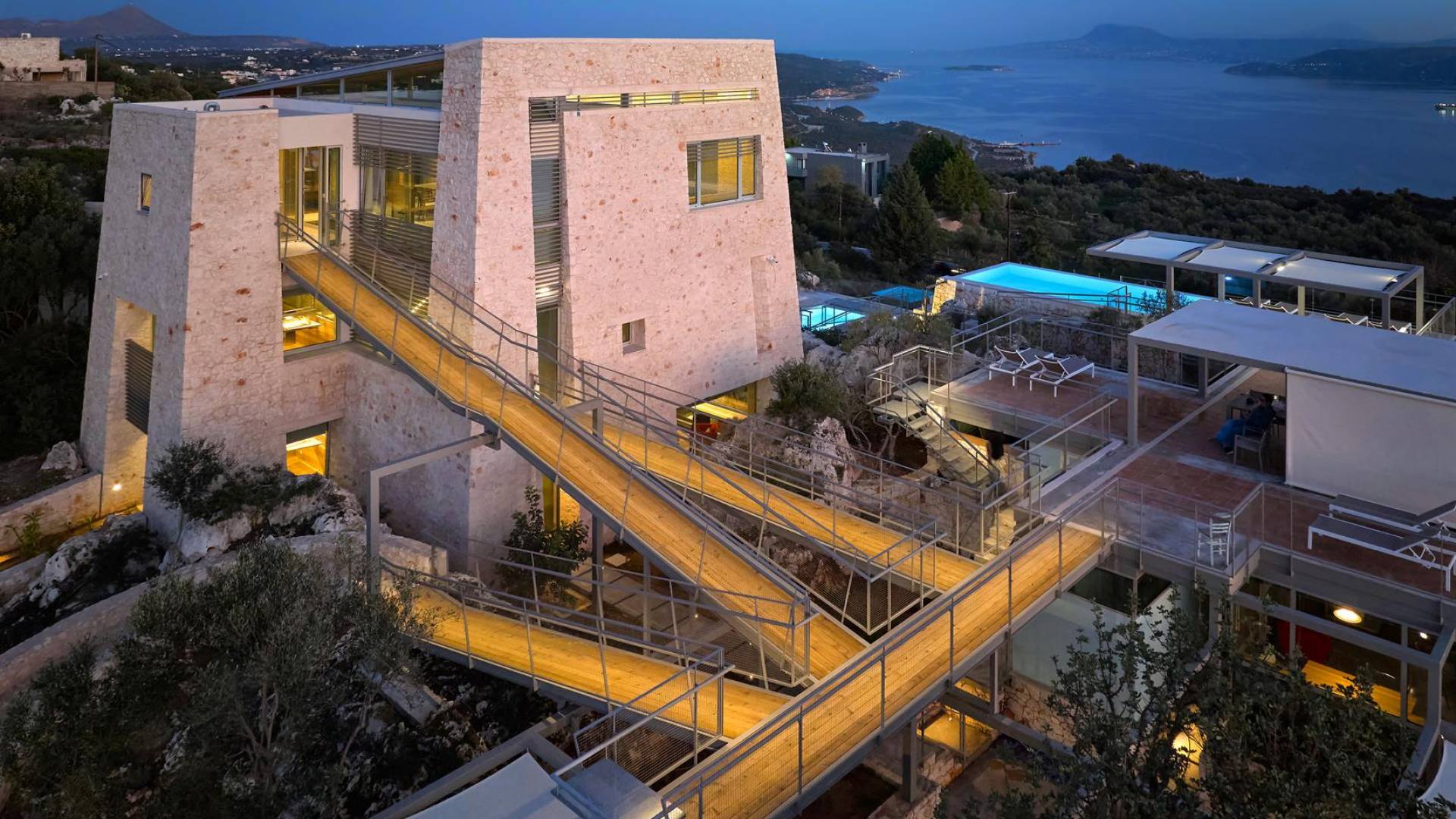 A queste due camere da letto si accede dall'interno salendo la scala in metallo e legno o dal parcheggio auto salendo tramite rampe. Una piattaforma conduce direttamente alla zona giorno esterna e alla piscina infinita.