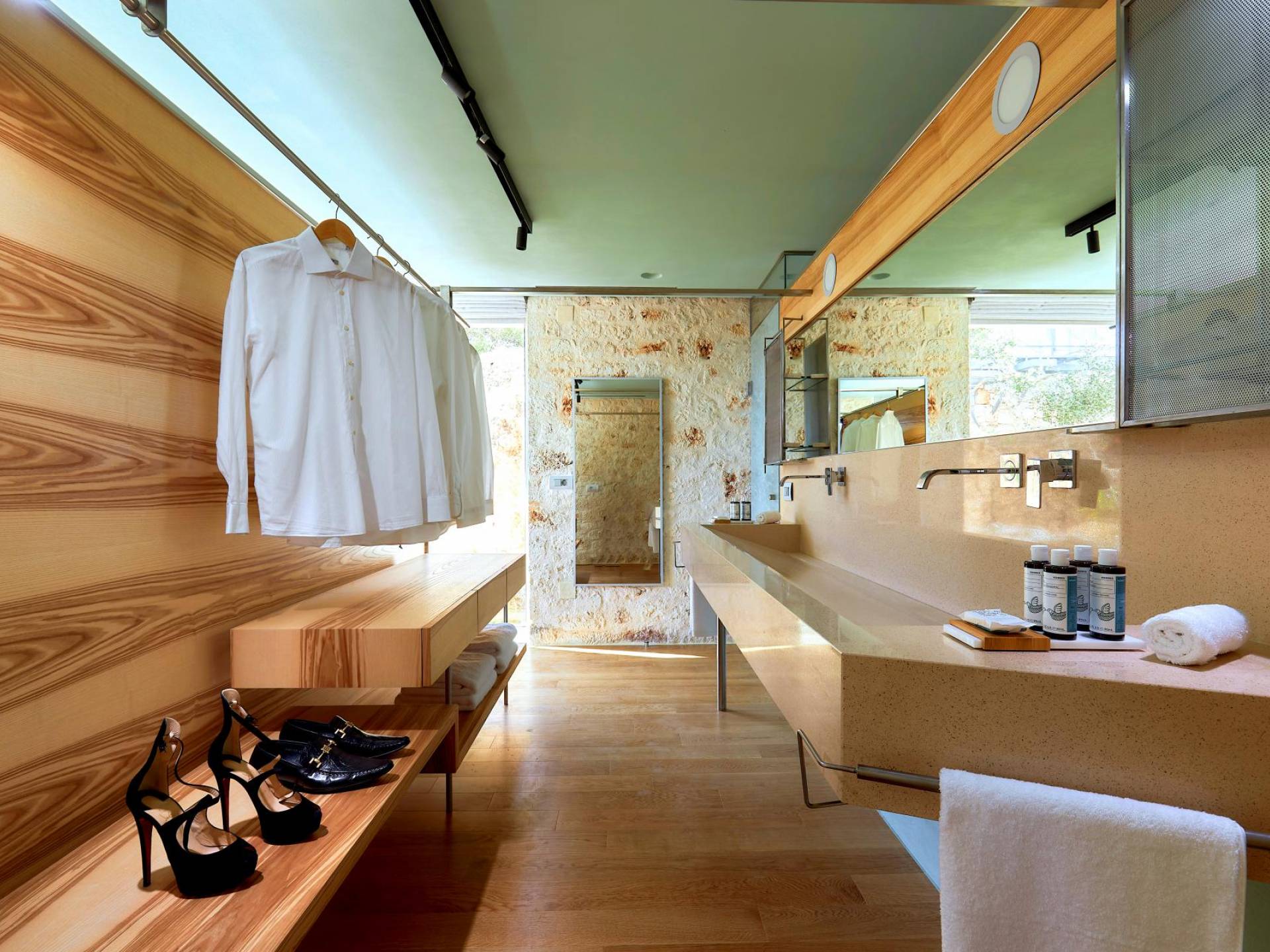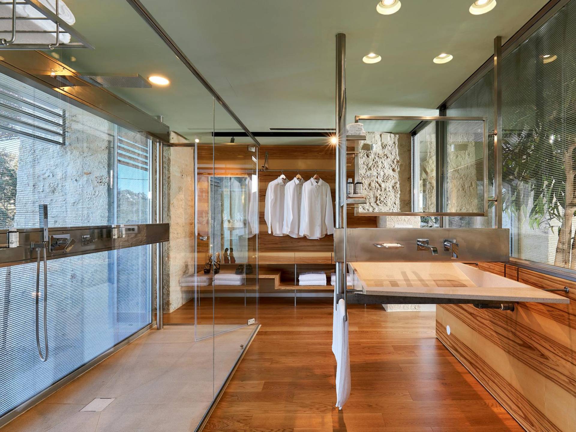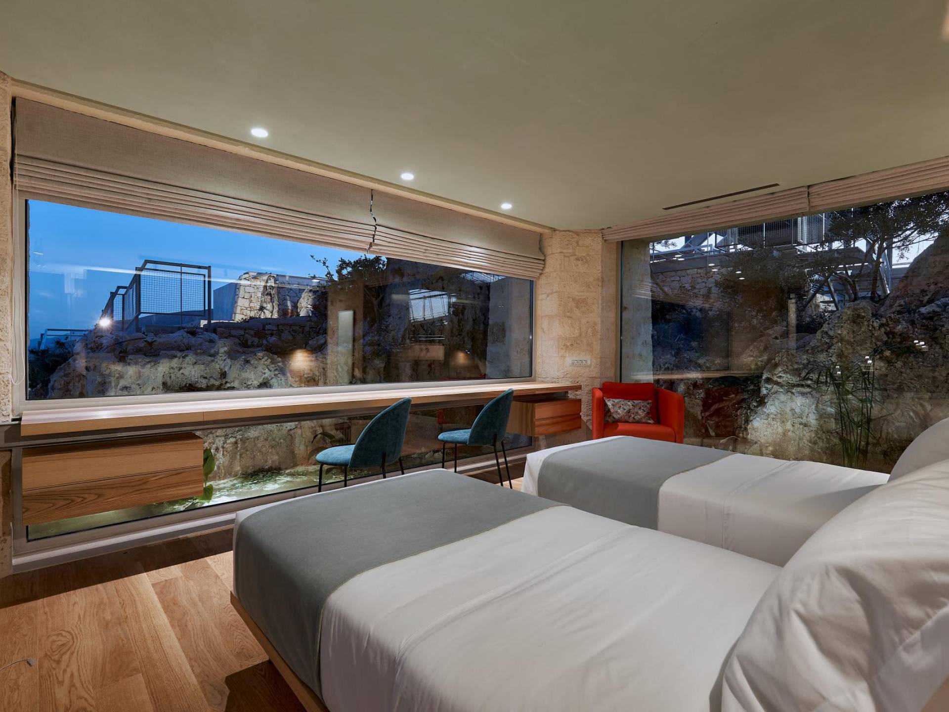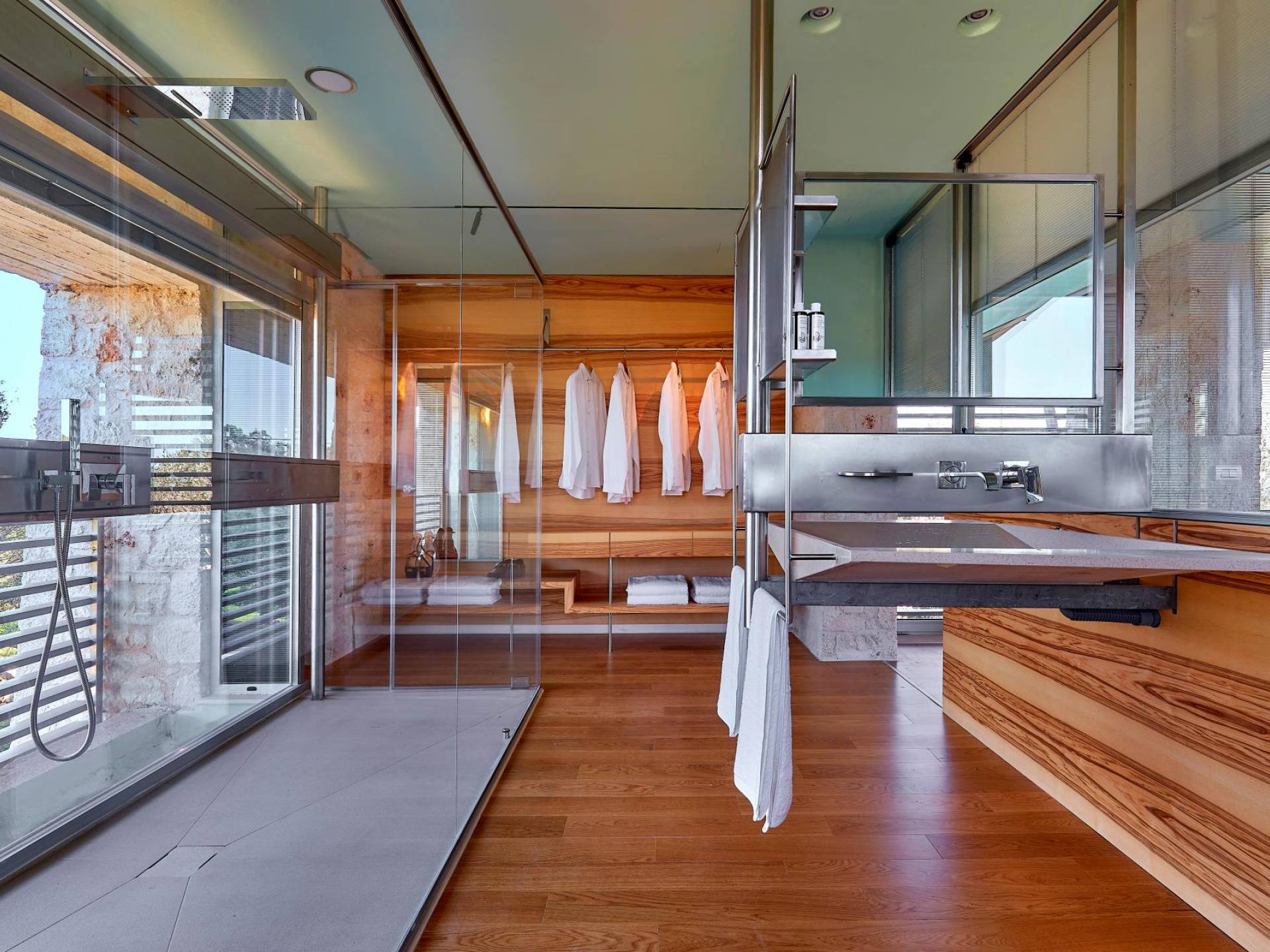 A queste due camere da letto si accede dall'interno salendo la scala in metallo e legno o dal parcheggio auto salendo tramite rampe. Una piattaforma conduce direttamente alla zona giorno esterna e alla piscina infinita.