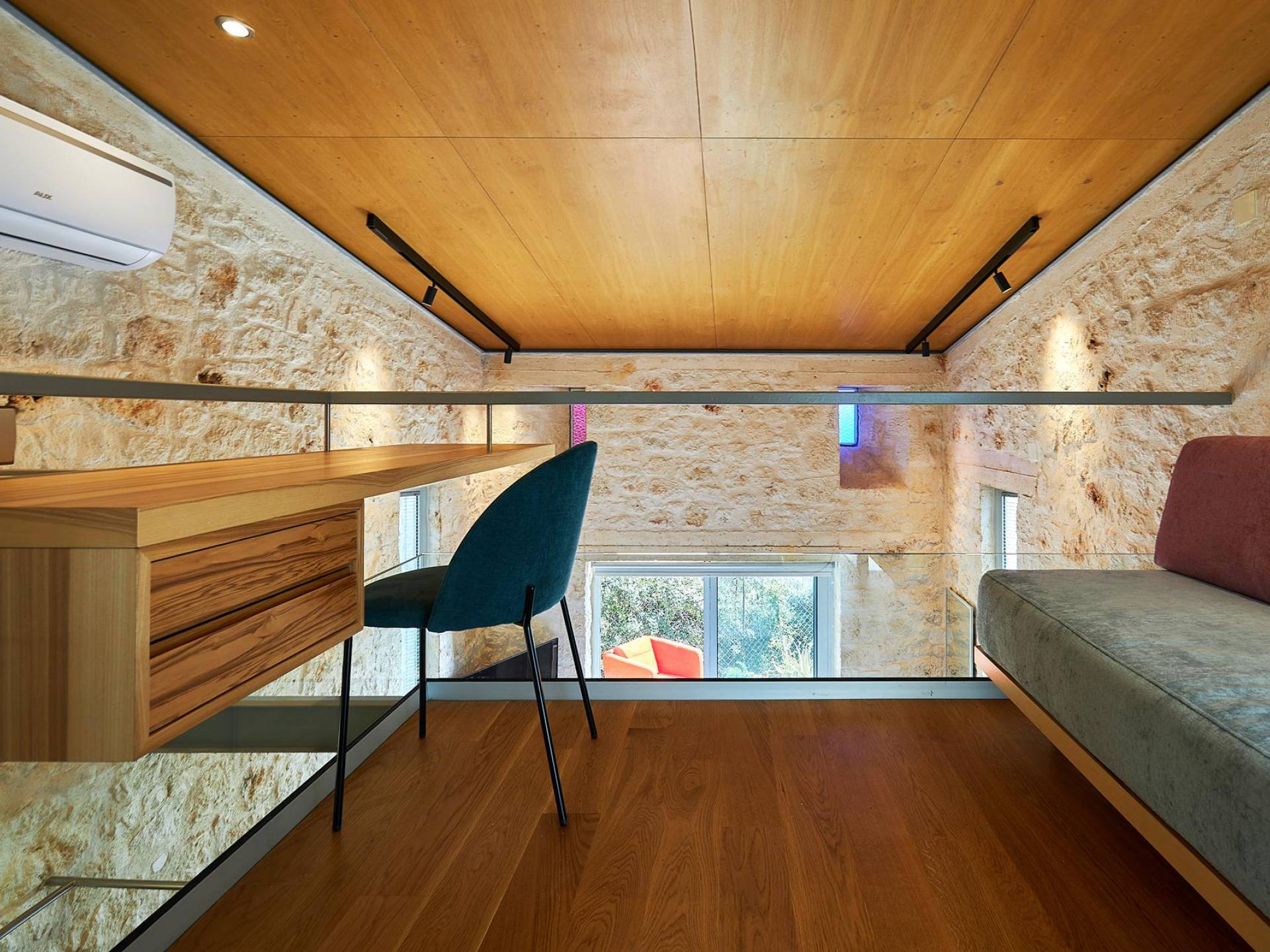 Questo spazio accogliente, a cui si accede da un sentiero in cemento, è l'ideale per una coppia che vuole stare con, ma separata, dal gruppo principale. Il piano terra dispone di un ampio letto matrimoniale con vista sulla flora naturale fino alla baia. Tra la camera da letto e il bagno c'è un angolo cottura, per prepararsi da bere. Il bagno ha una cabina doccia. Su una scala a chiocciola c'è un soppalco con un divano e una scrivania.