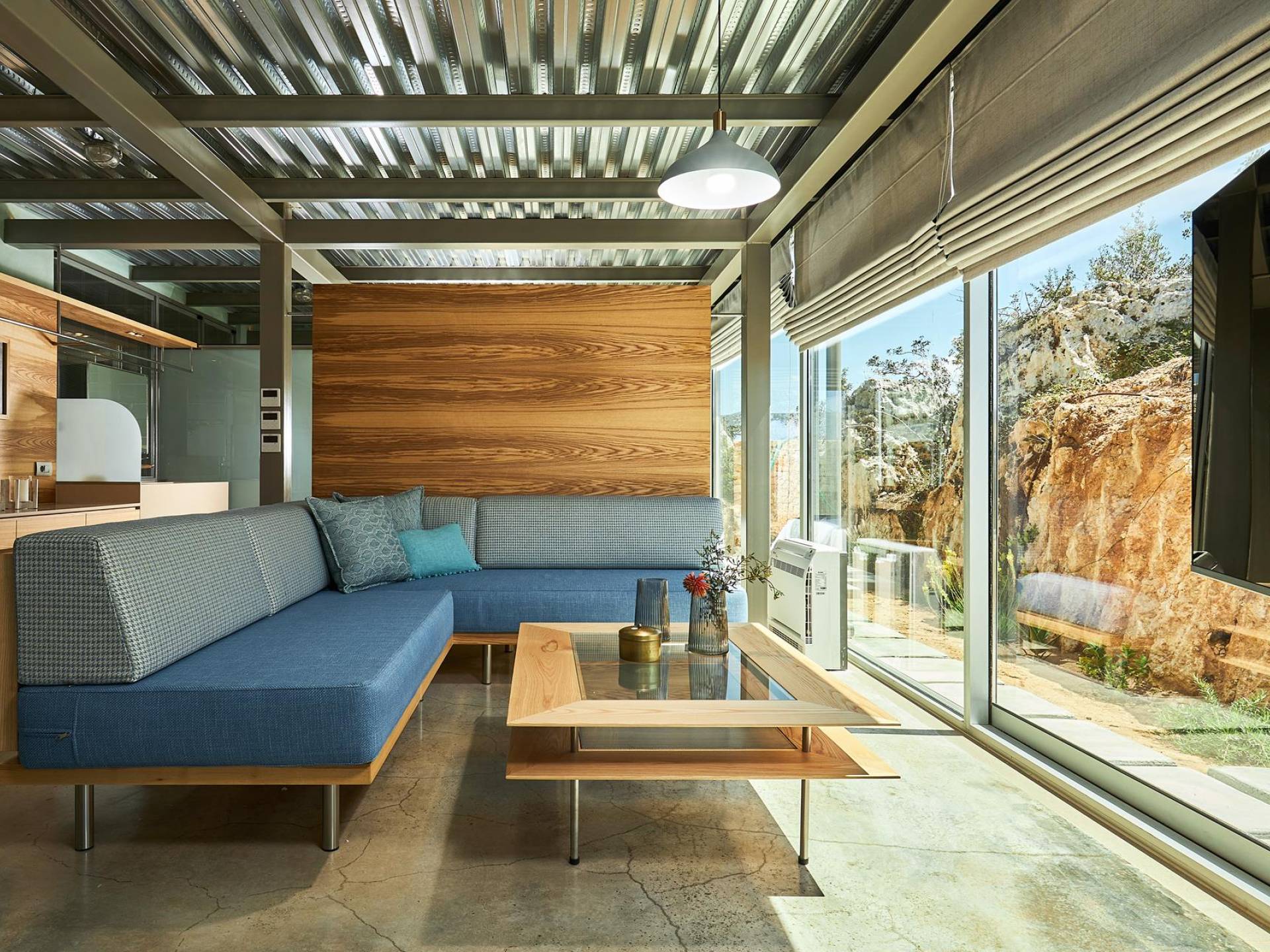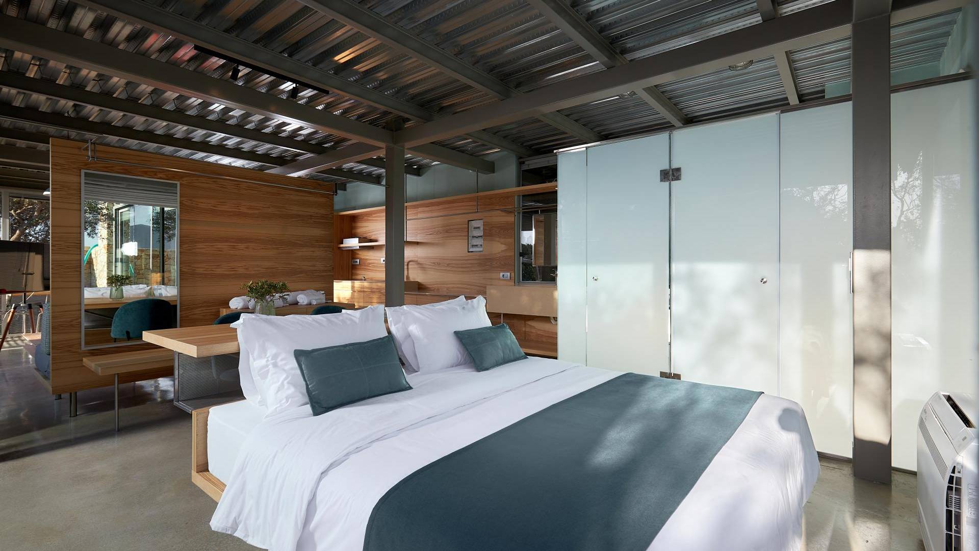 A queste due camere da letto si accede da una rampa che parte dal parcheggio. C'è una scala in metallo che conduce allo spazio abitativo all'aperto e una piscina infinita.