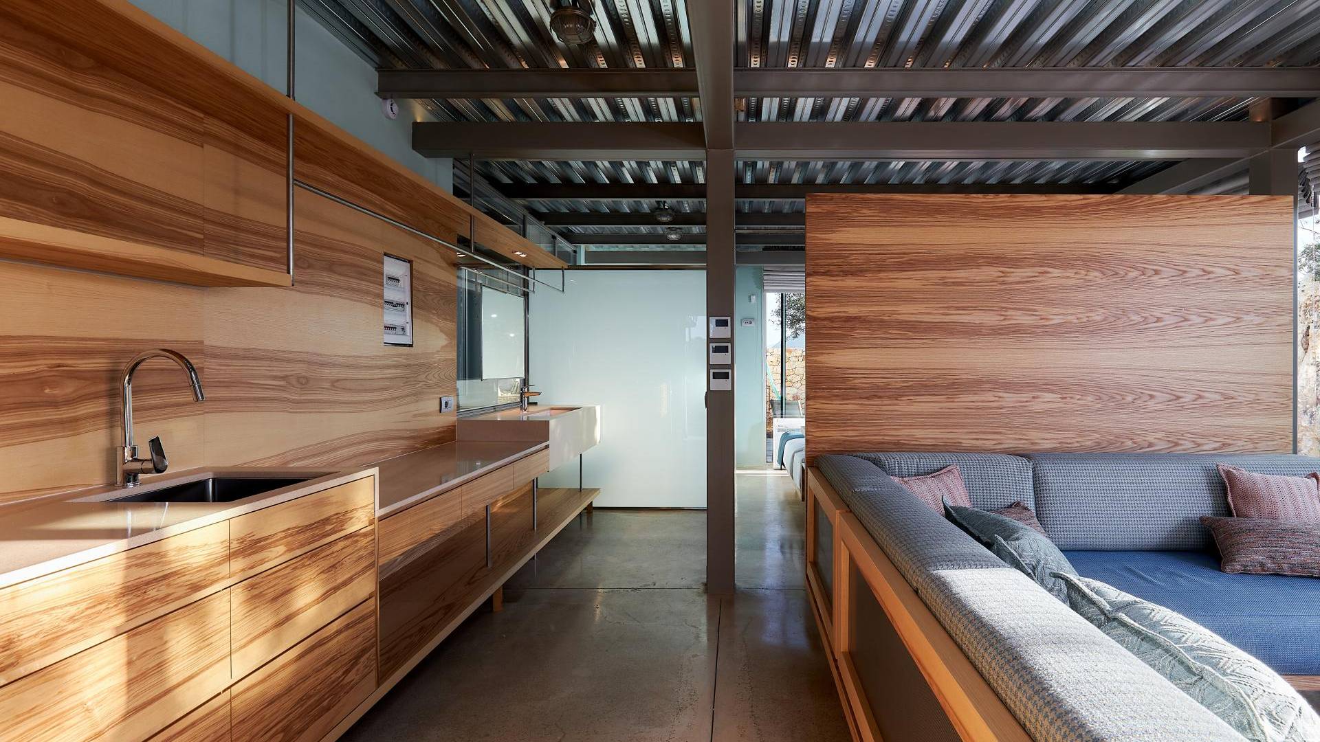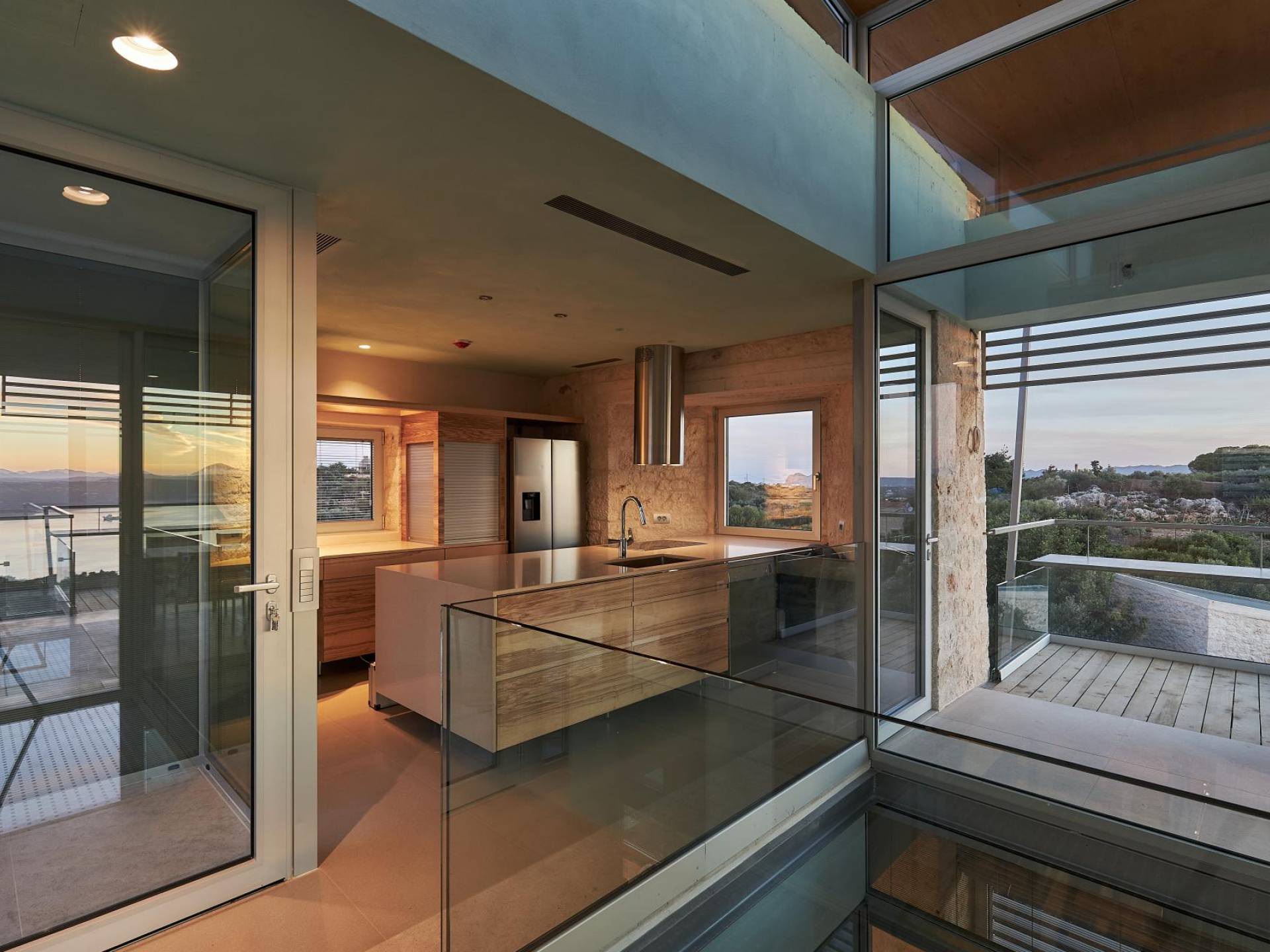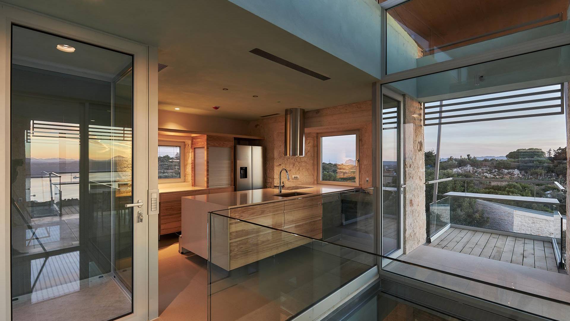 Quattro camere doppie con bagno privato occupano il piano terra e il primo piano. Una scala in metallo e legno dà accesso ad ogni piano. Un atrio di vetro si estende verso l'alto fino all'ultimo piano ospitando un grande Ficus Alii, o Amstel King, albero che cresce all'interno, portando la natura in casa. L'ultimo piano è dove si trova la zona giorno e la cucina completamente attrezzata, con un ampio balcone coperto e pensile con vista spettacolare su tutta la baia. Una scala in metallo e legno collega i piani internamente con rampe e pedane esternamente che danno accesso ad ogni piano e alle zone relax e ristoro esterne.