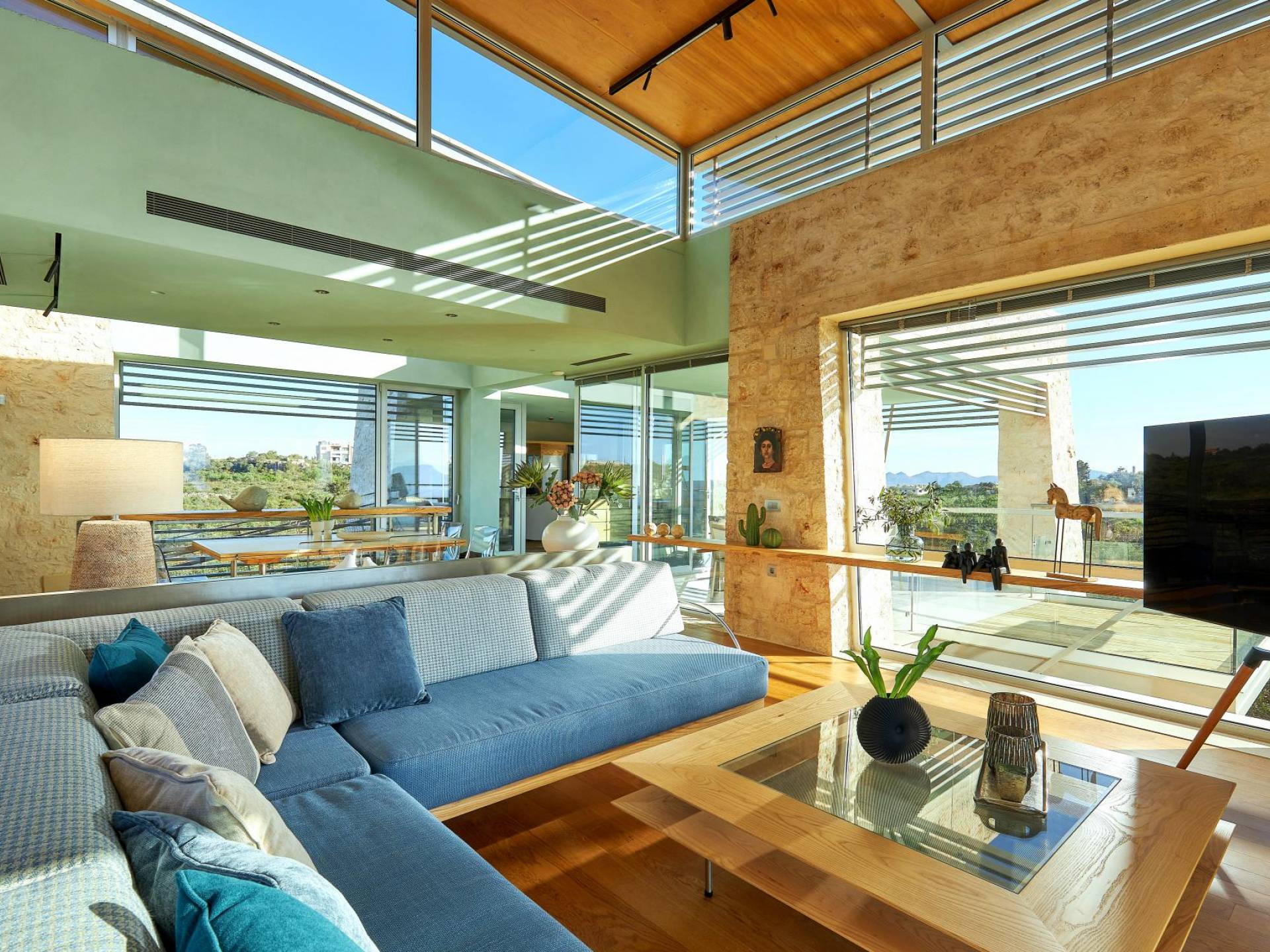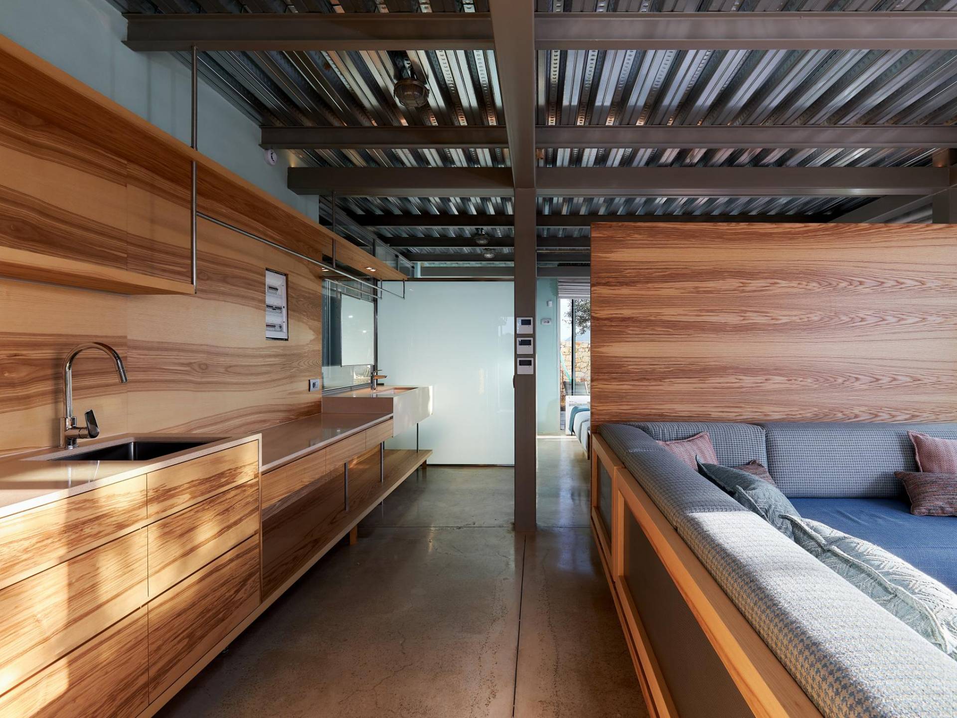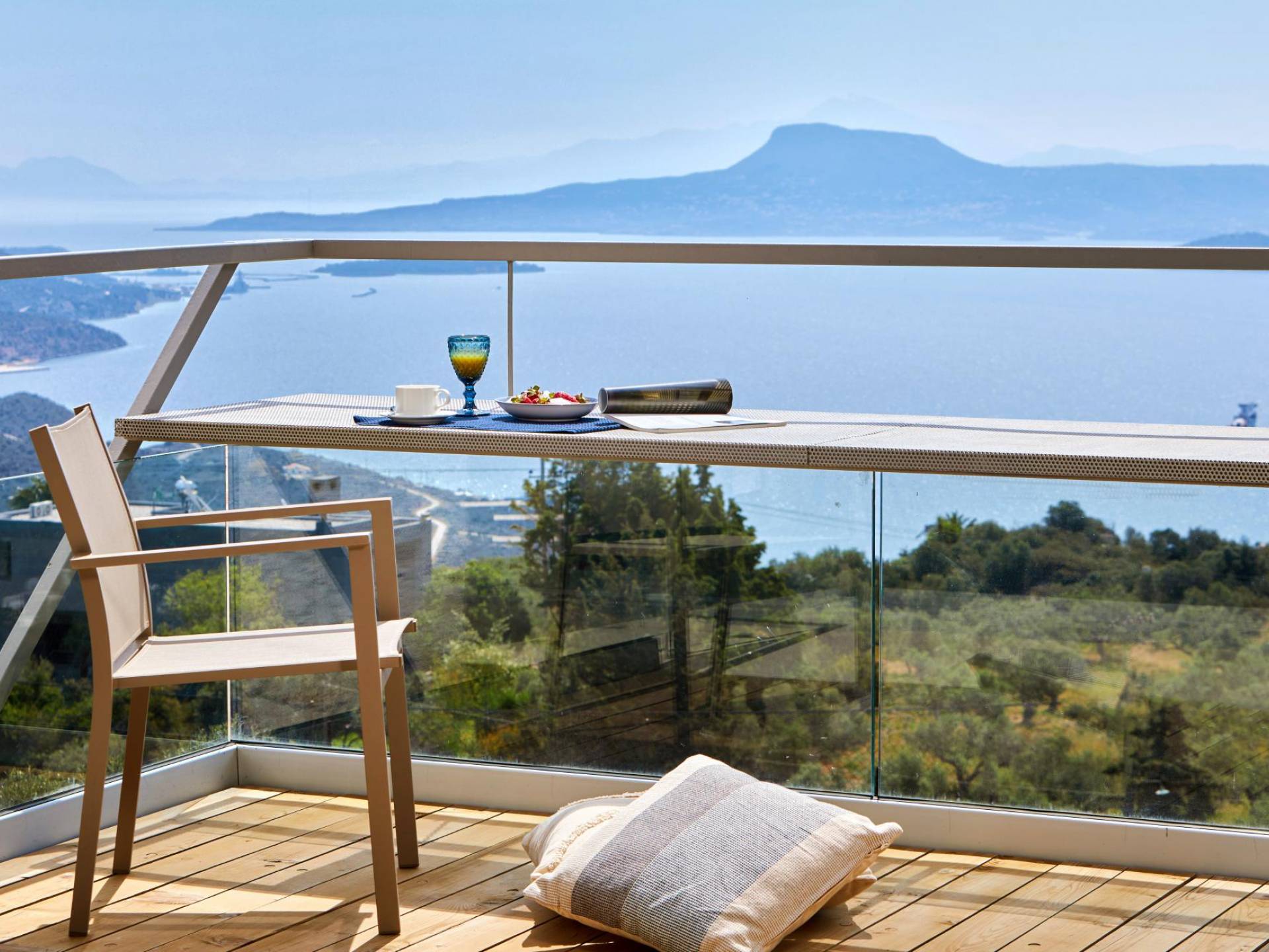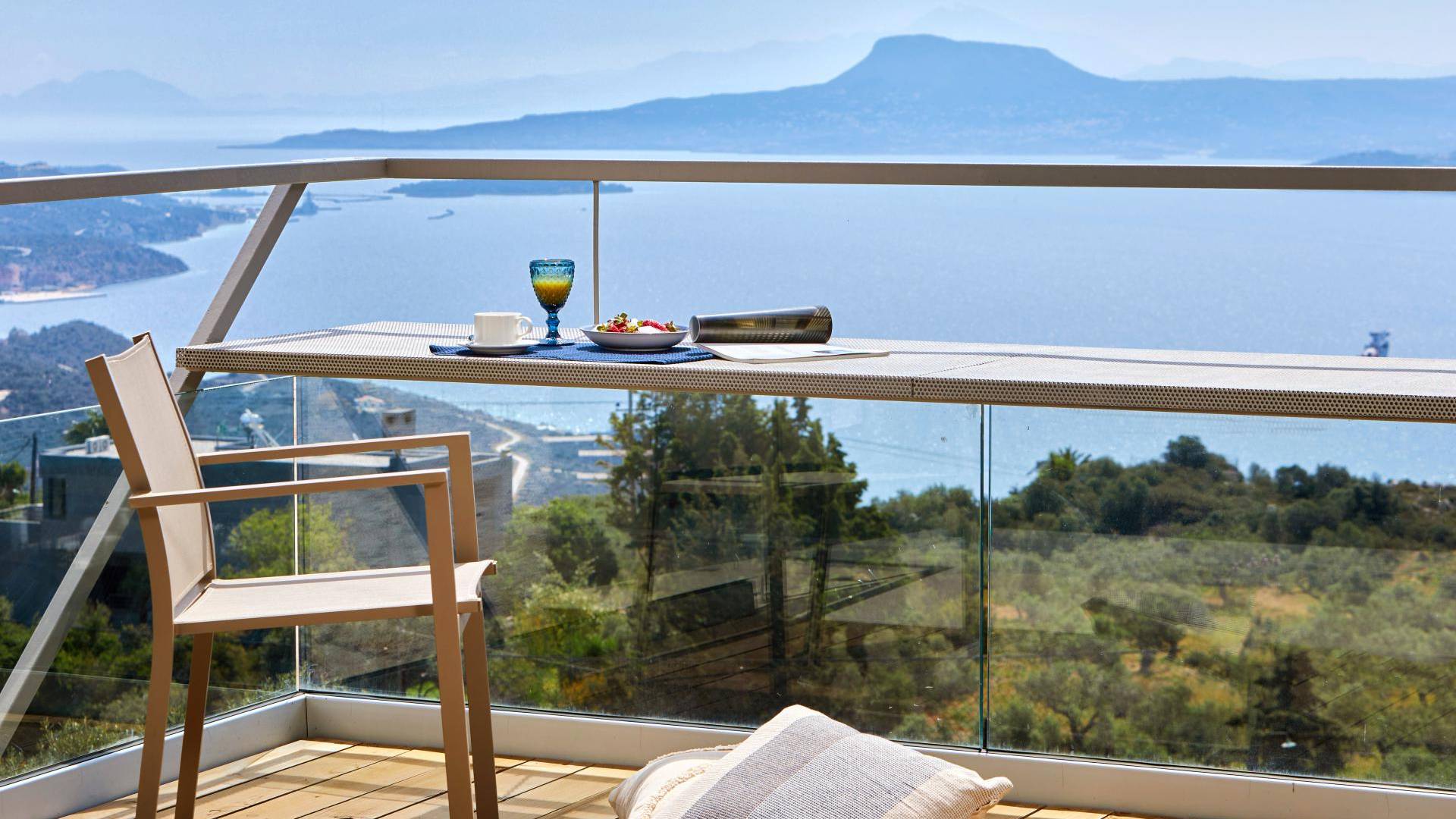 Quattro camere doppie con bagno privato occupano il piano terra e il primo piano. Una scala in metallo e legno dà accesso ad ogni piano. Un atrio di vetro si estende verso l'alto fino all'ultimo piano ospitando un grande Ficus Alii, o Amstel King, albero che cresce all'interno, portando la natura in casa. L'ultimo piano è dove si trova la zona giorno e la cucina completamente attrezzata, con un ampio balcone coperto e pensile con vista spettacolare su tutta la baia. Una scala in metallo e legno collega i piani internamente con rampe e pedane esternamente che danno accesso ad ogni piano e alle zone relax e ristoro esterne.