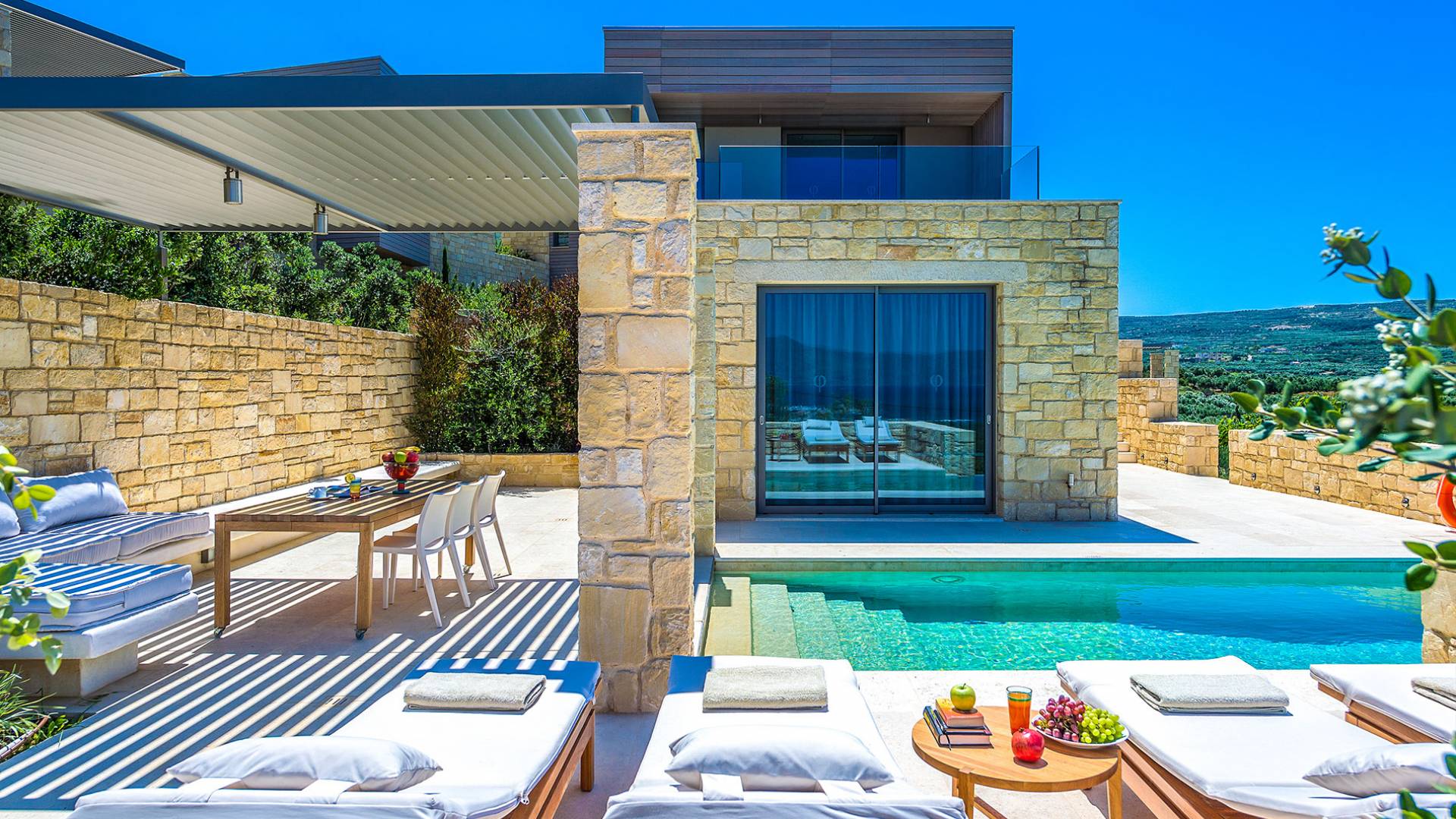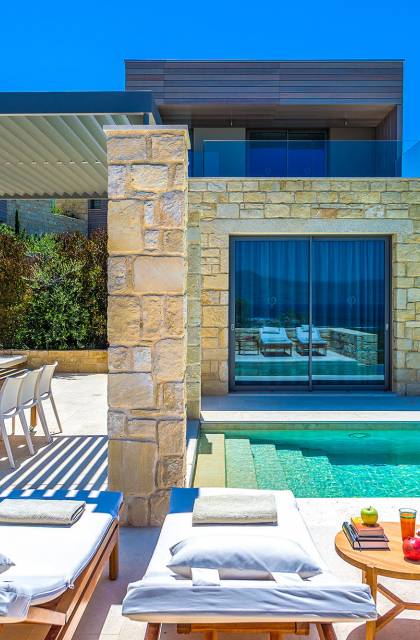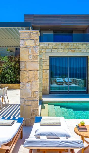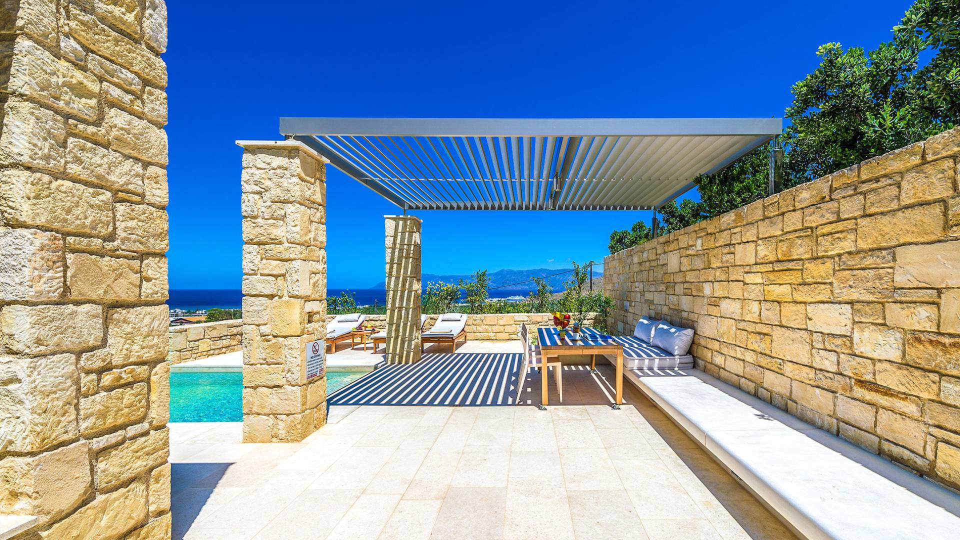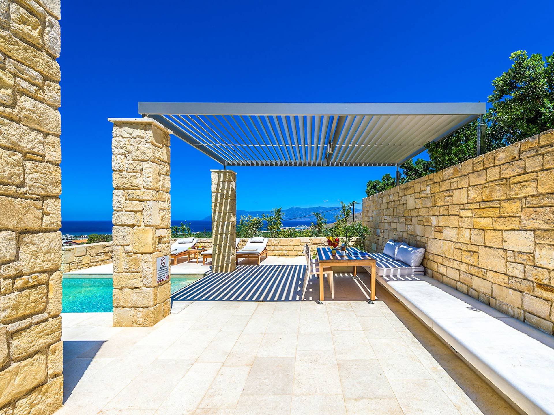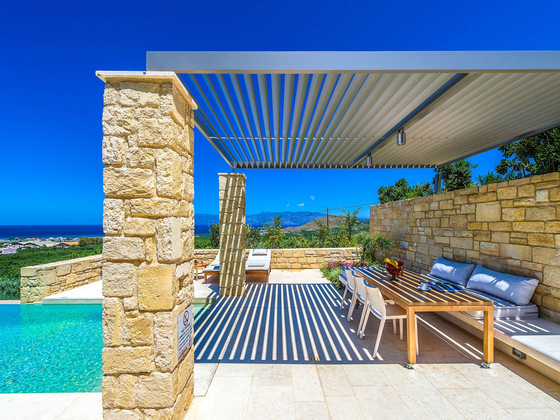 Oneiro Villa Crete è uno splendido edificio a due piani e due camere da letto con un'ampia terrazza in pietra naturale che include un'incantevole zona pranzo dotata di un pergolato appositamente progettato che fornisce riparo dal sole, consentendo il passaggio di alcuni dei suoi raggi discreti attraverso. L'effetto del paesaggio mediterraneo è esaltato dalla piantumazione di arbusti, fiori e alberi endemici nei giardini paesaggistici circostanti.