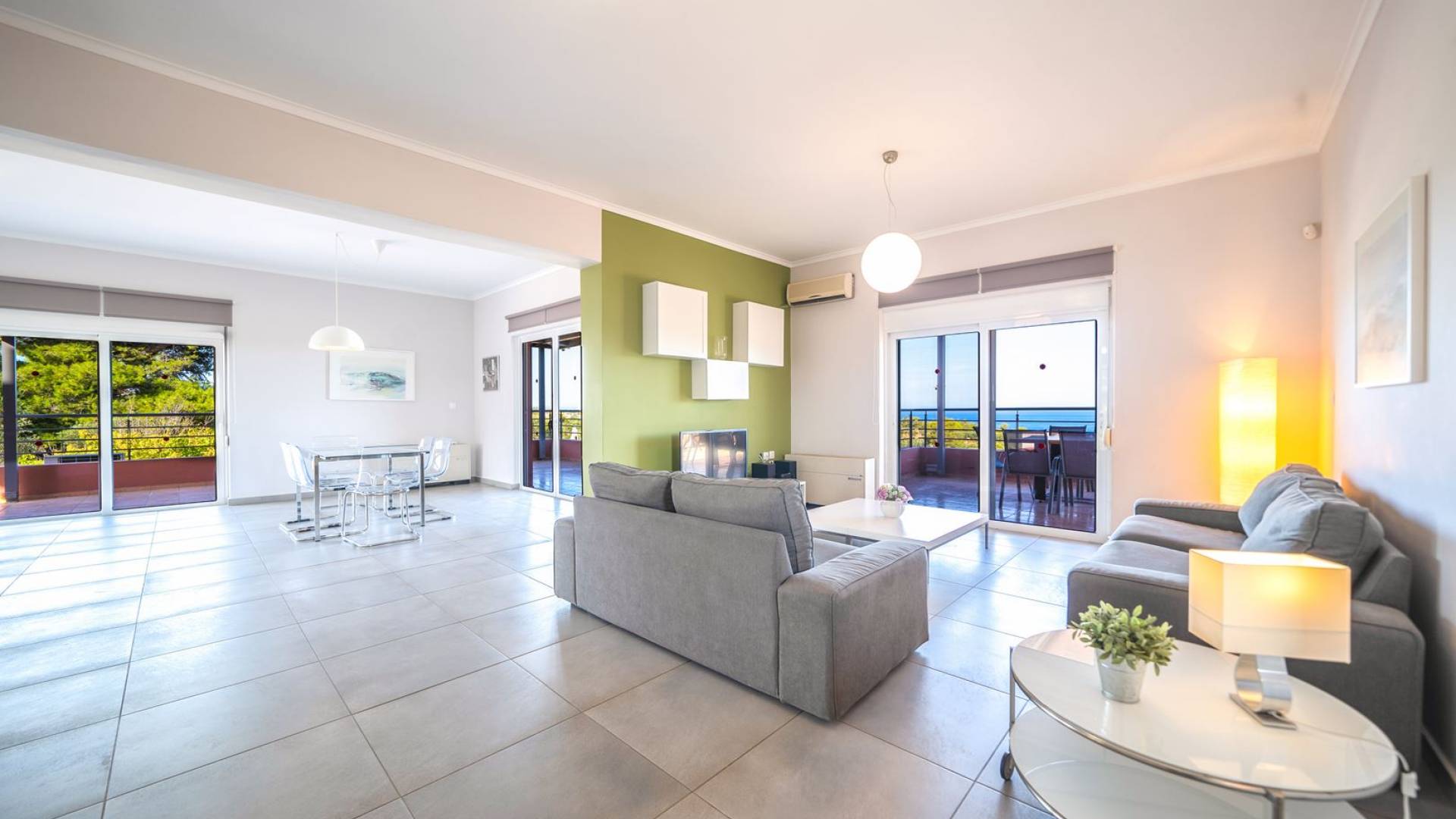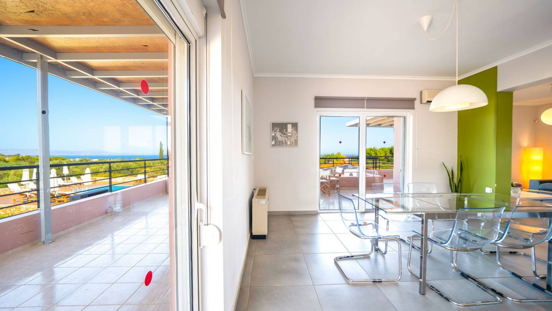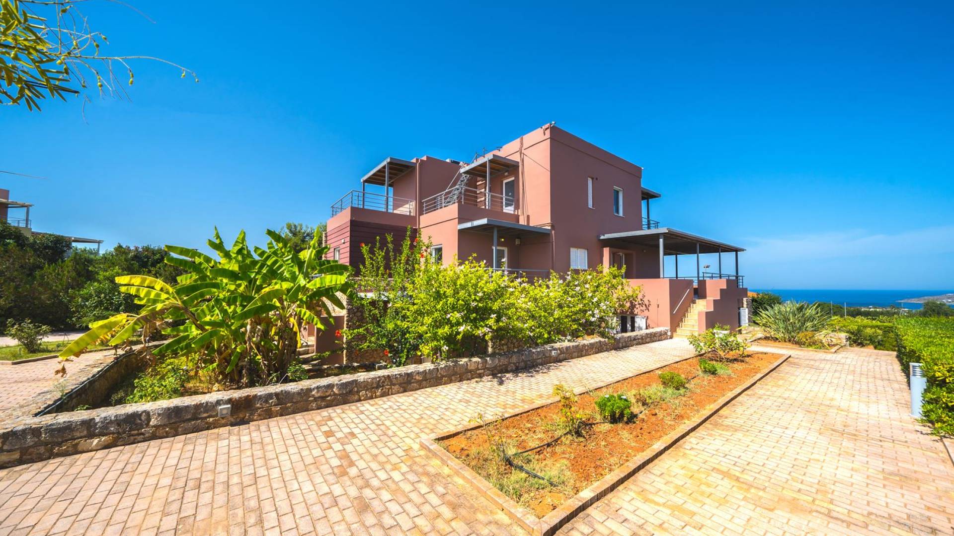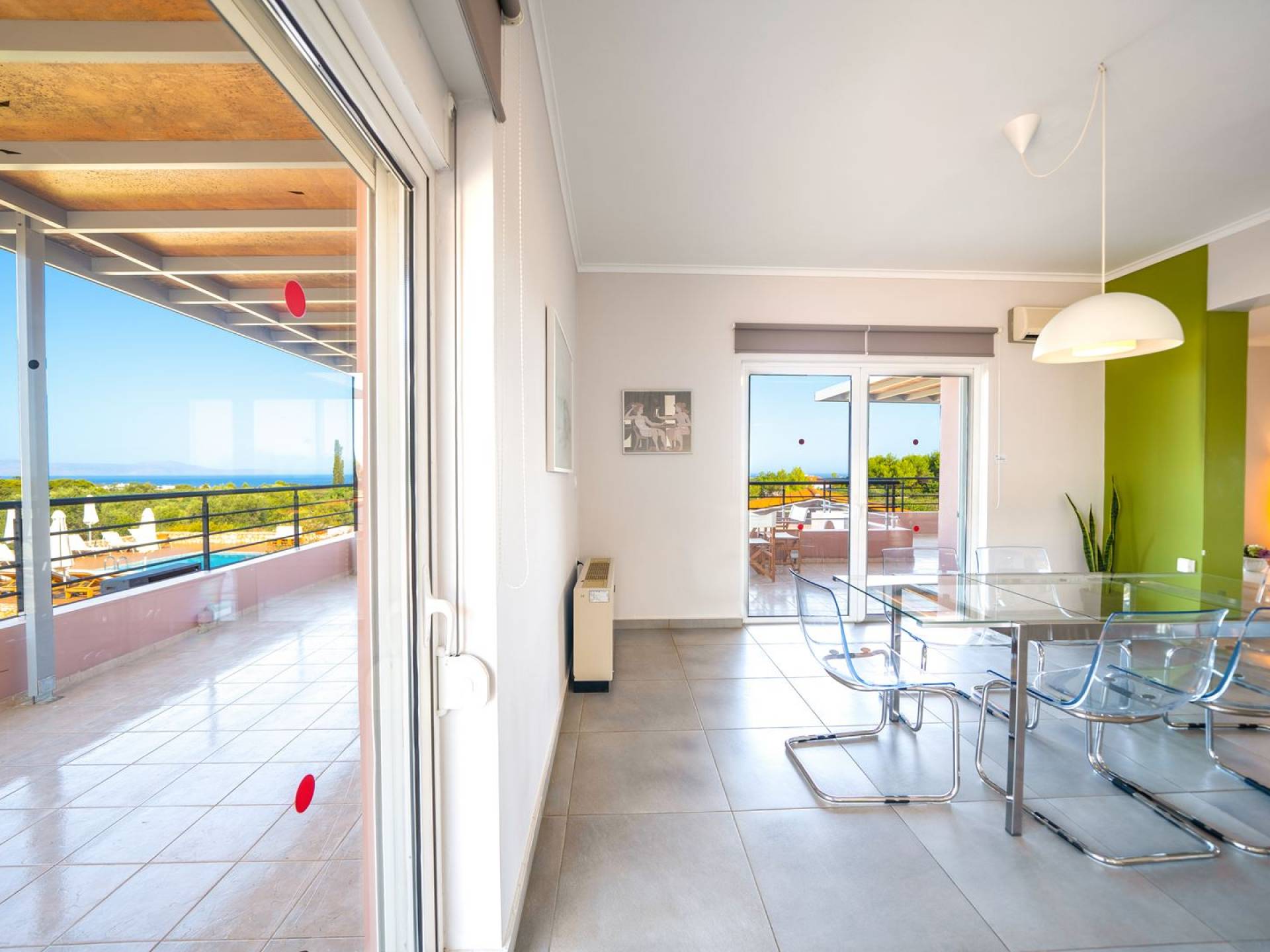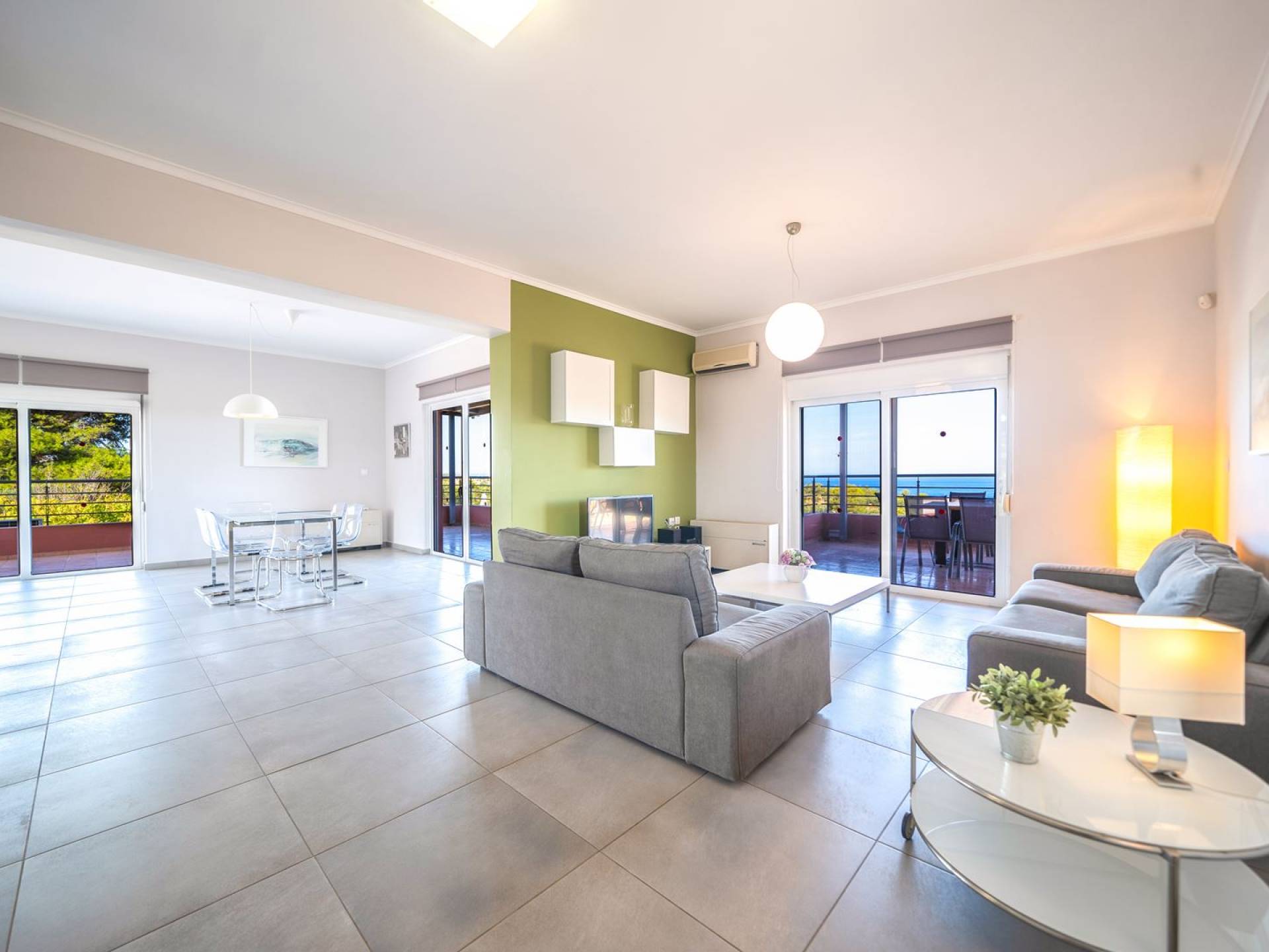 Al piano terra si trovano 3 camere da letto, una con un grande letto matrimoniale e due con 2 letti singoli ciascuna, 1 bagno con vasca e 1 WC con doccia, soggiorno e zona pranzo, ufficio trasformato in matrimoniale camera da letto, cucina completamente attrezzata, guardaroba e lavanderia. Tutte le camere sono dotate di aria condizionata e TV a schermo piatto. Al primo piano si trovano 1 ampio soggiorno e sala da pranzo con TV satellitare 42'', una seconda cucina completamente attrezzata, uno studio che si trasforma in una camera matrimoniale e 1 WC ospiti con doccia. Ci sono anche bellissime verande e balconi che offrono magnifiche viste sul mare. Al secondo piano ci sono altre tre camere da letto, una matrimoniale con letto king-size e bagno privato con vasca idromassaggio e balcone vista mare, un'altra camera matrimoniale e una con due letti singoli. C'è anche un altro bagno con vasca a questo livello.