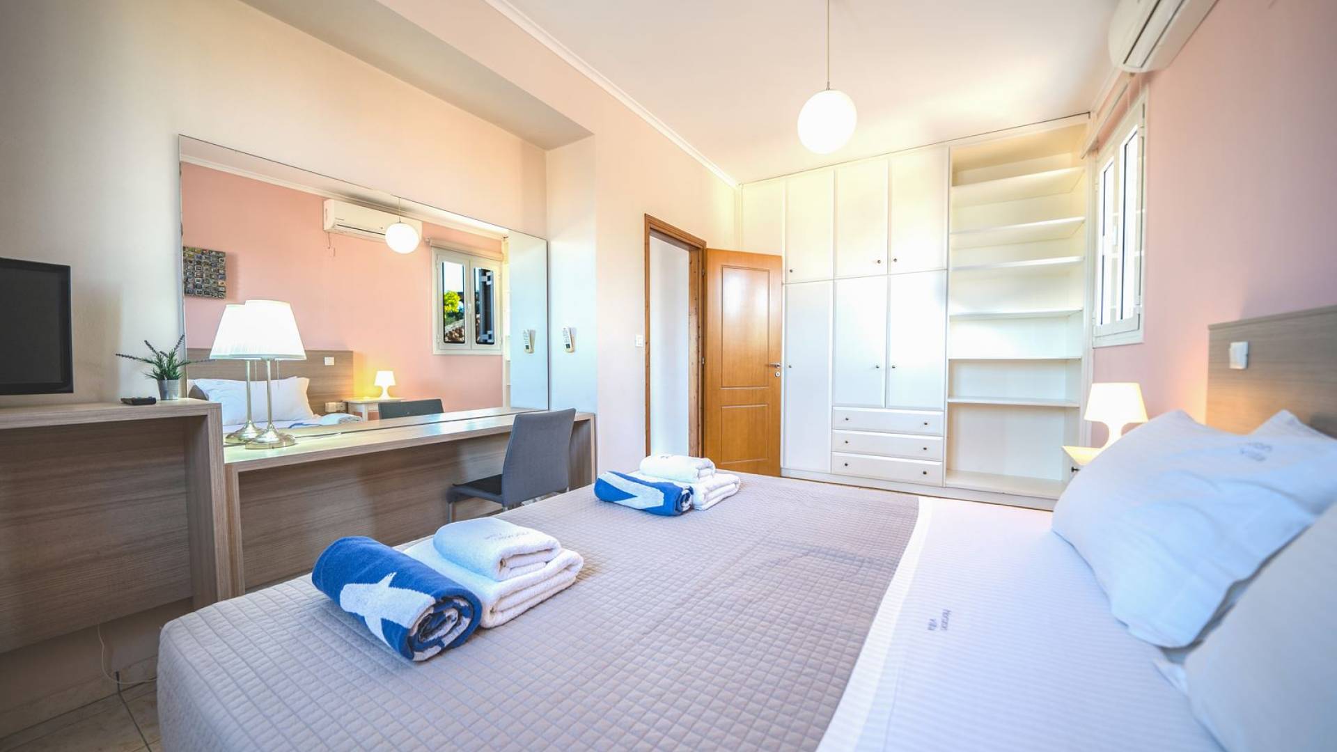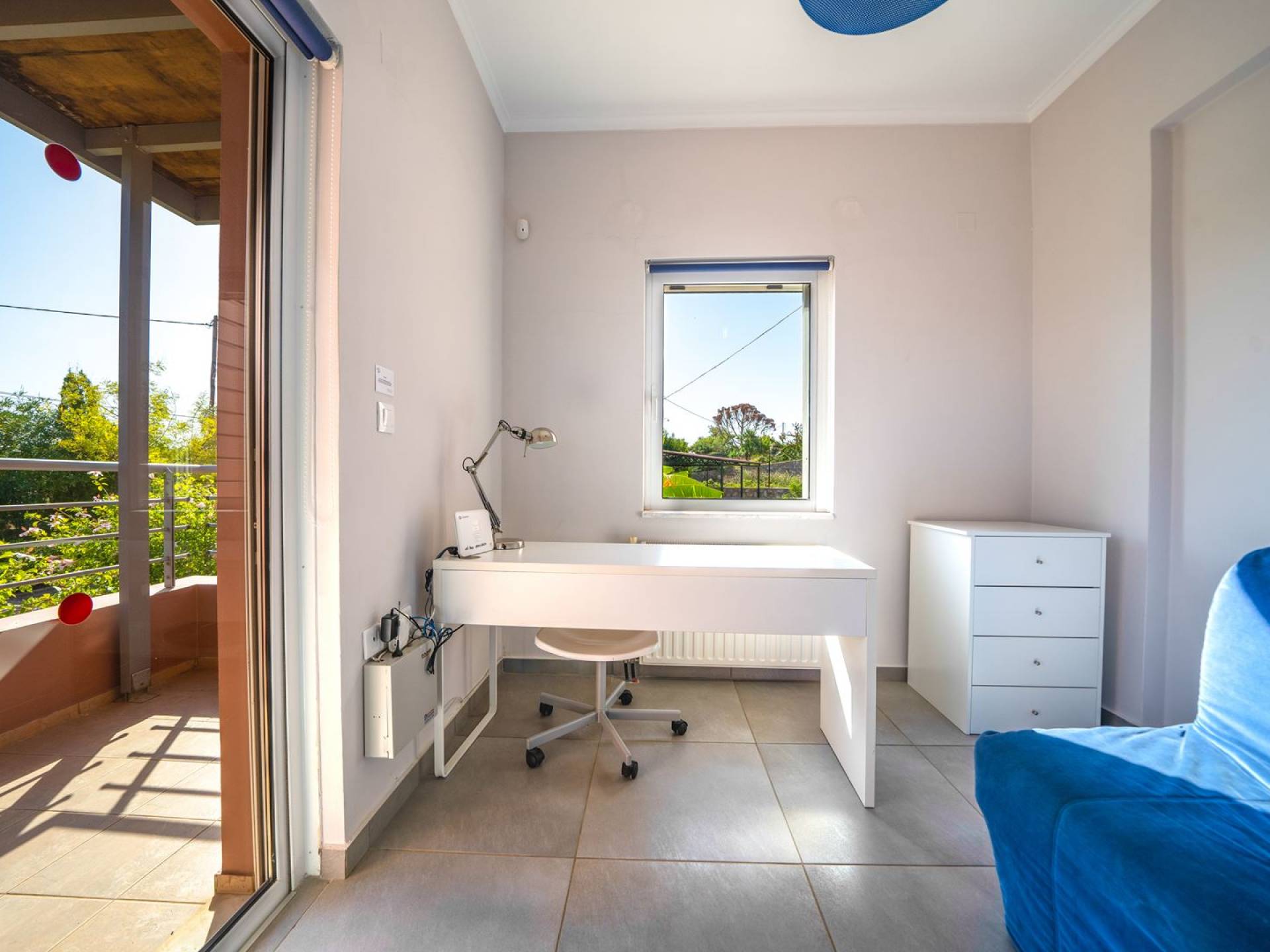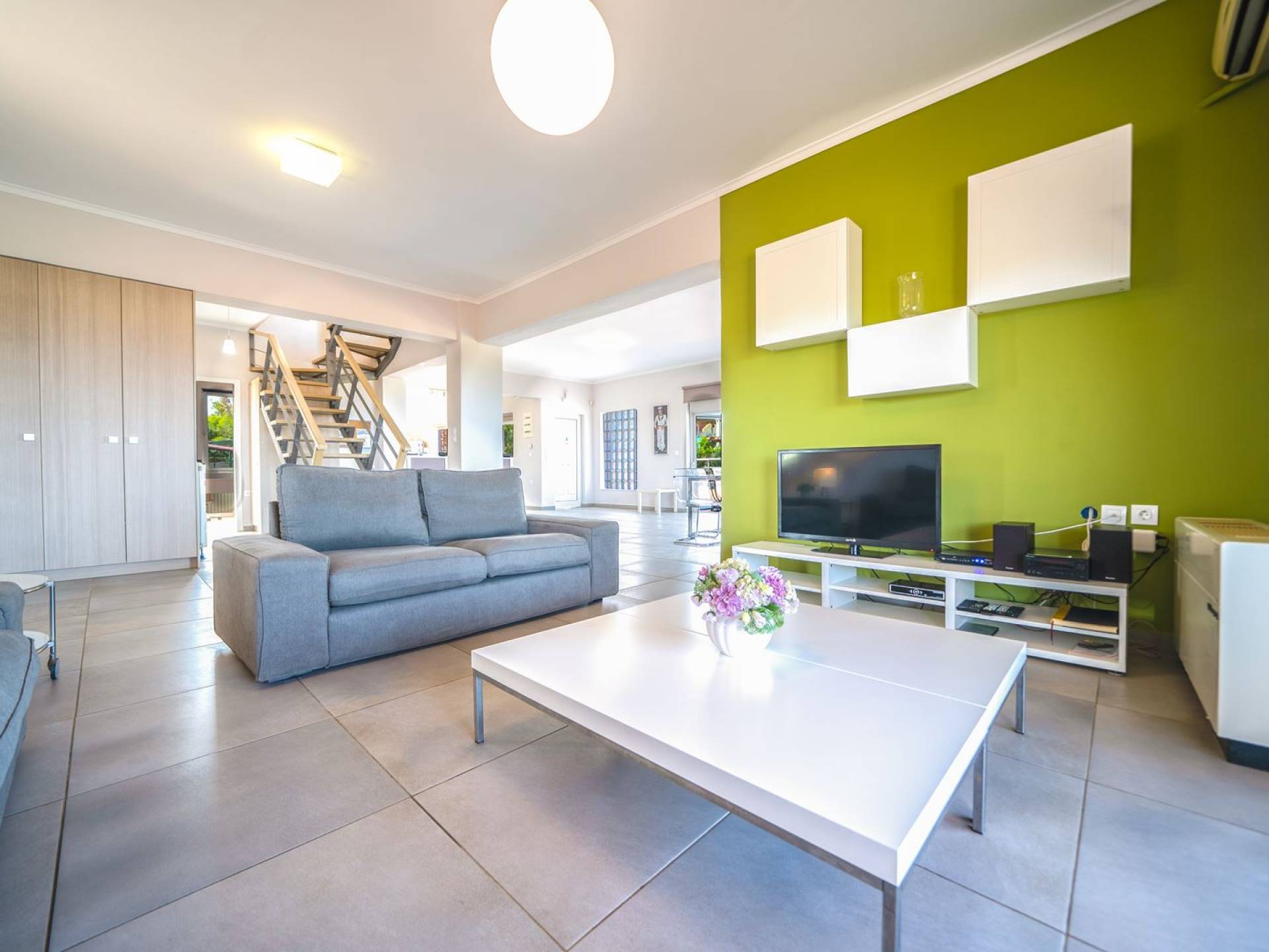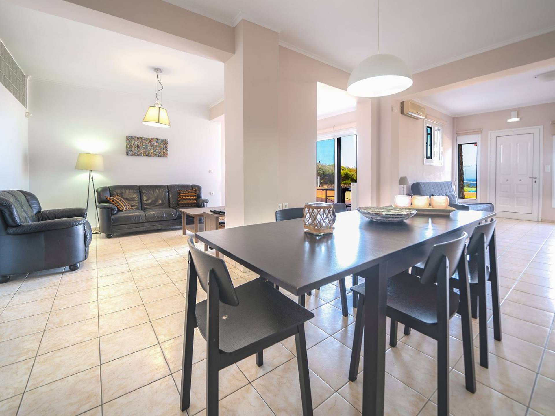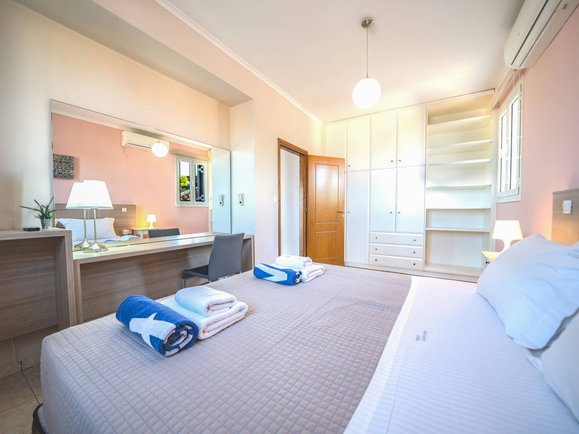 Al piano terra si trovano 3 camere da letto, una con un grande letto matrimoniale e due con 2 letti singoli ciascuna, 1 bagno con vasca e 1 WC con doccia, soggiorno e zona pranzo, ufficio trasformato in matrimoniale camera da letto, cucina completamente attrezzata, guardaroba e lavanderia. Tutte le camere sono dotate di aria condizionata e TV a schermo piatto. Al primo piano si trovano 1 ampio soggiorno e sala da pranzo con TV satellitare 42'', una seconda cucina completamente attrezzata, uno studio che si trasforma in una camera matrimoniale e 1 WC ospiti con doccia. Ci sono anche bellissime verande e balconi che offrono magnifiche viste sul mare. Al secondo piano ci sono altre tre camere da letto, una matrimoniale con letto king-size e bagno privato con vasca idromassaggio e balcone vista mare, un'altra camera matrimoniale e una con due letti singoli. C'è anche un altro bagno con vasca a questo livello.