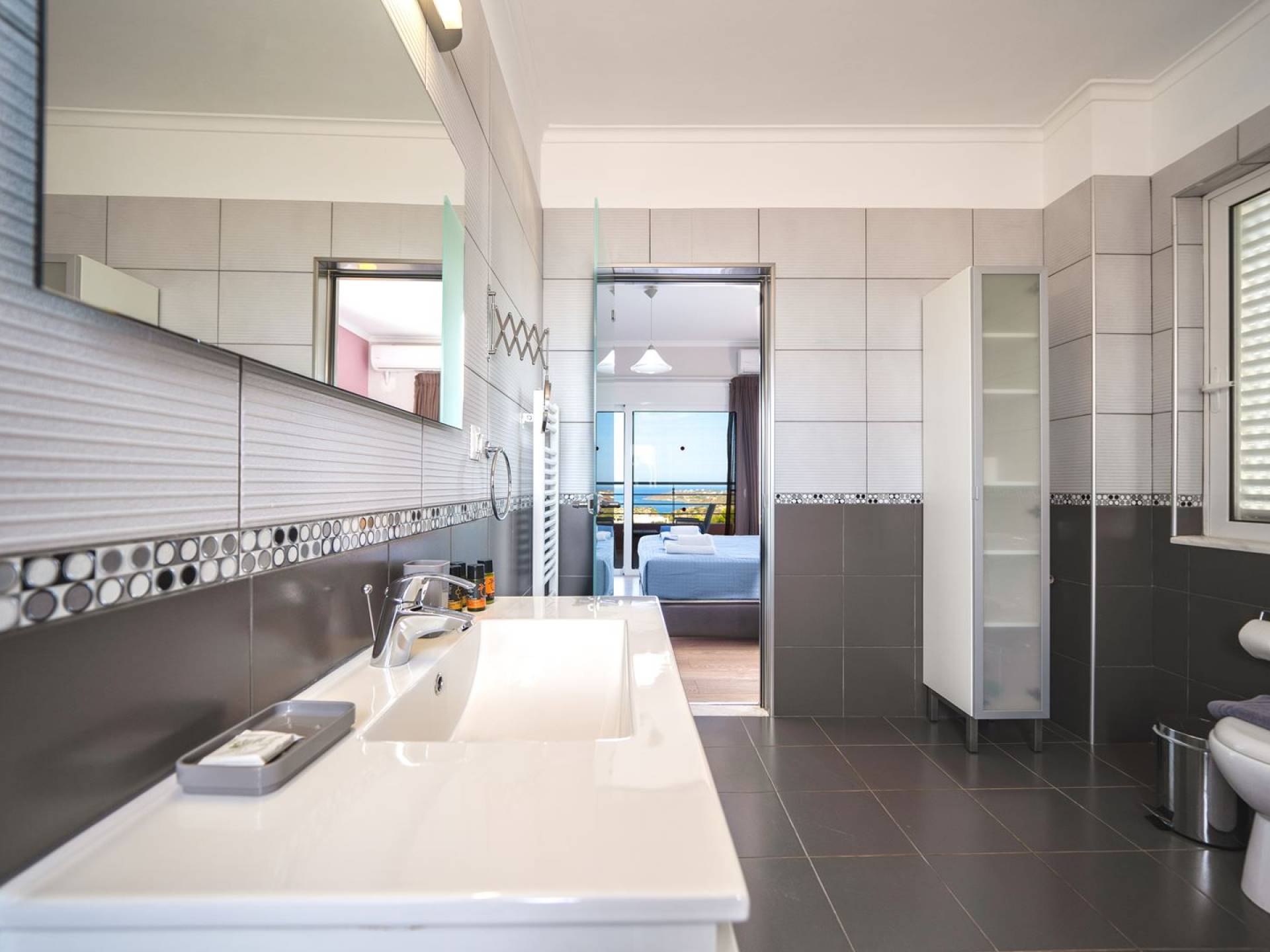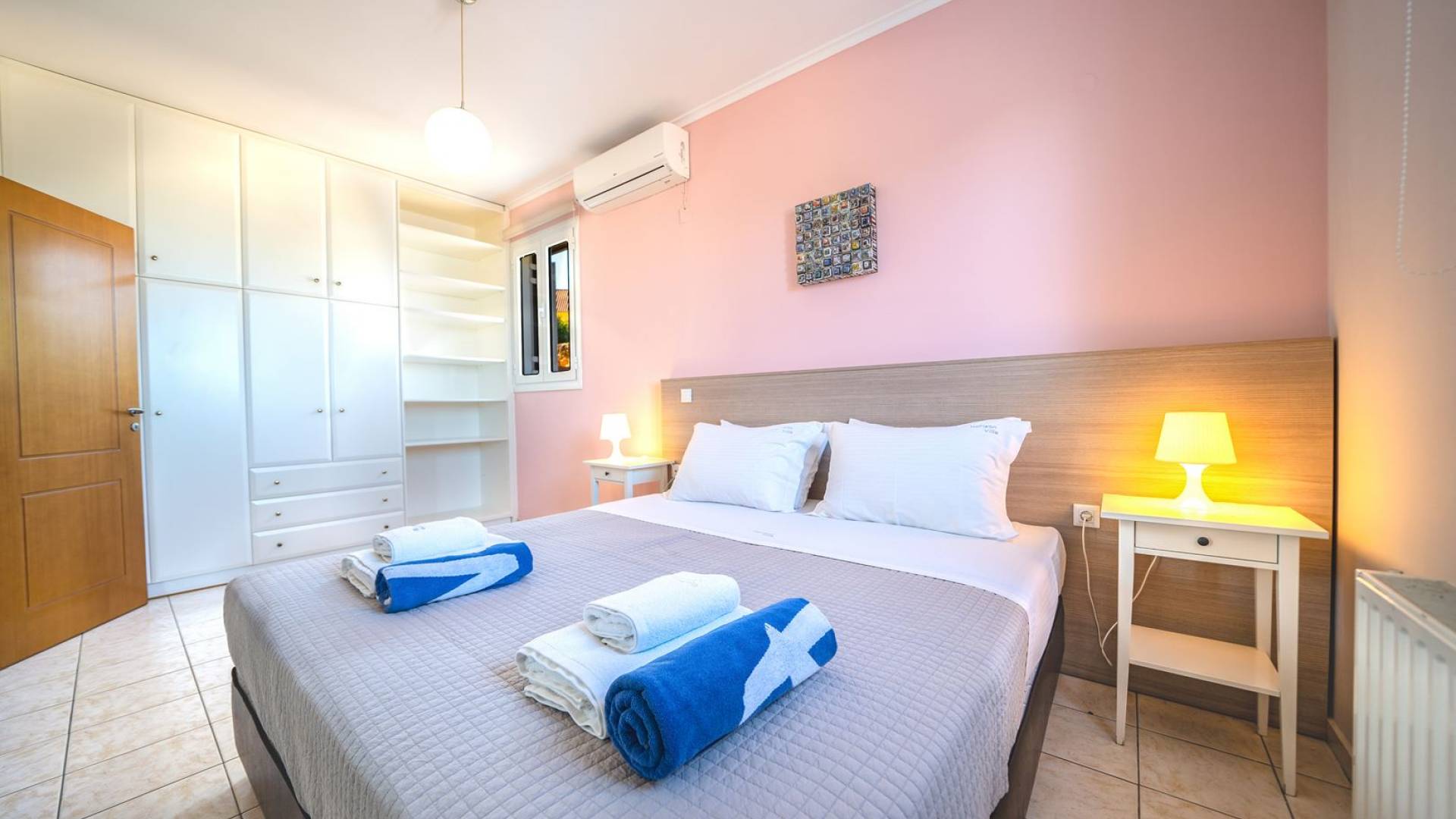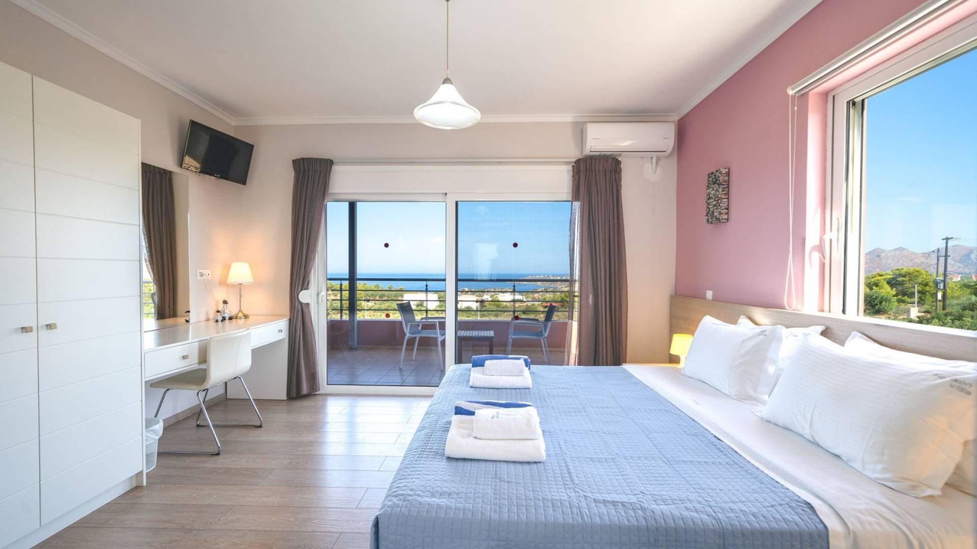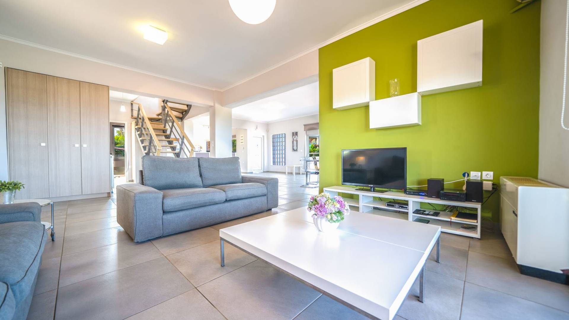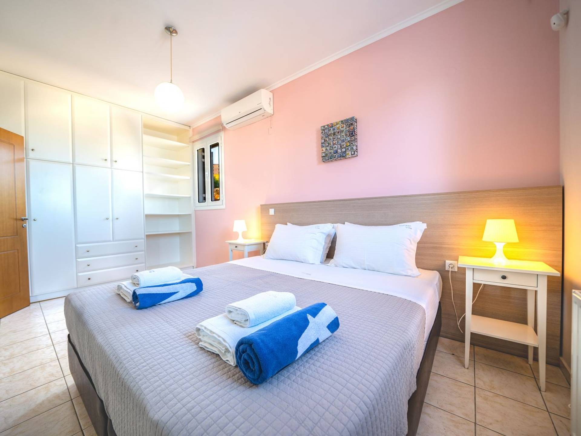 Al piano terra si trovano 3 camere da letto, una con un grande letto matrimoniale e due con 2 letti singoli ciascuna, 1 bagno con vasca e 1 WC con doccia, soggiorno e zona pranzo, ufficio trasformato in matrimoniale camera da letto, cucina completamente attrezzata, guardaroba e lavanderia. Tutte le camere sono dotate di aria condizionata e TV a schermo piatto. Al primo piano si trovano 1 ampio soggiorno e sala da pranzo con TV satellitare 42'', una seconda cucina completamente attrezzata, uno studio che si trasforma in una camera matrimoniale e 1 WC ospiti con doccia. Ci sono anche bellissime verande e balconi che offrono magnifiche viste sul mare. Al secondo piano ci sono altre tre camere da letto, una matrimoniale con letto king-size e bagno privato con vasca idromassaggio e balcone vista mare, un'altra camera matrimoniale e una con due letti singoli. C'è anche un altro bagno con vasca a questo livello.