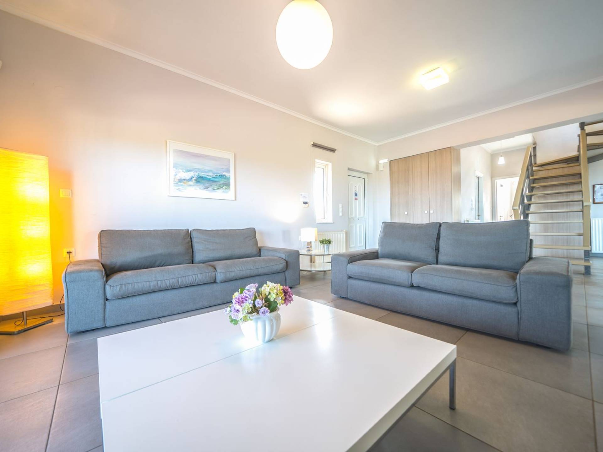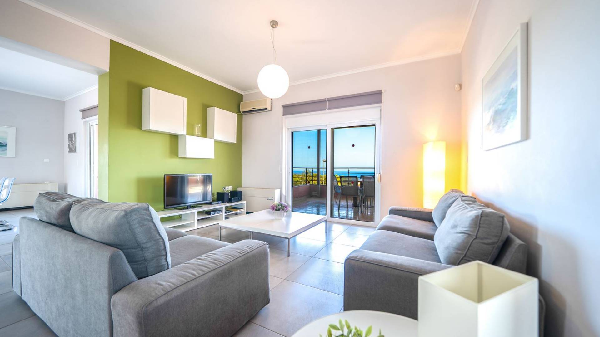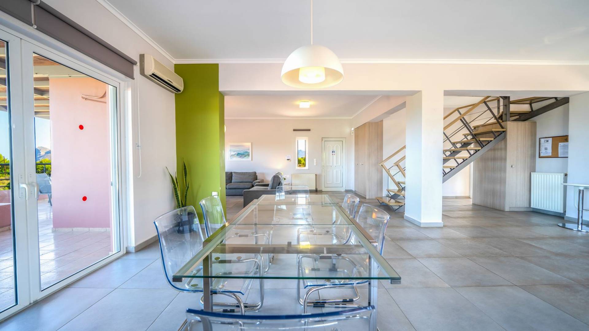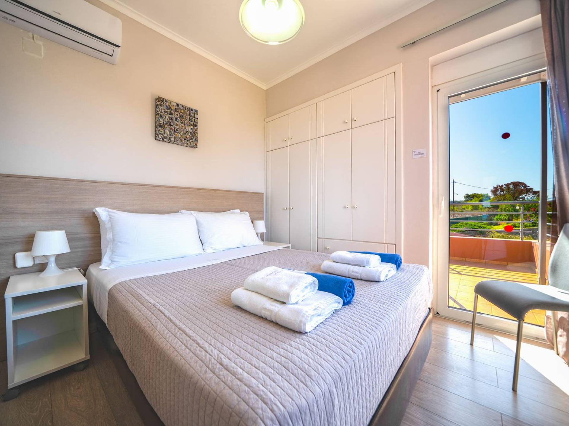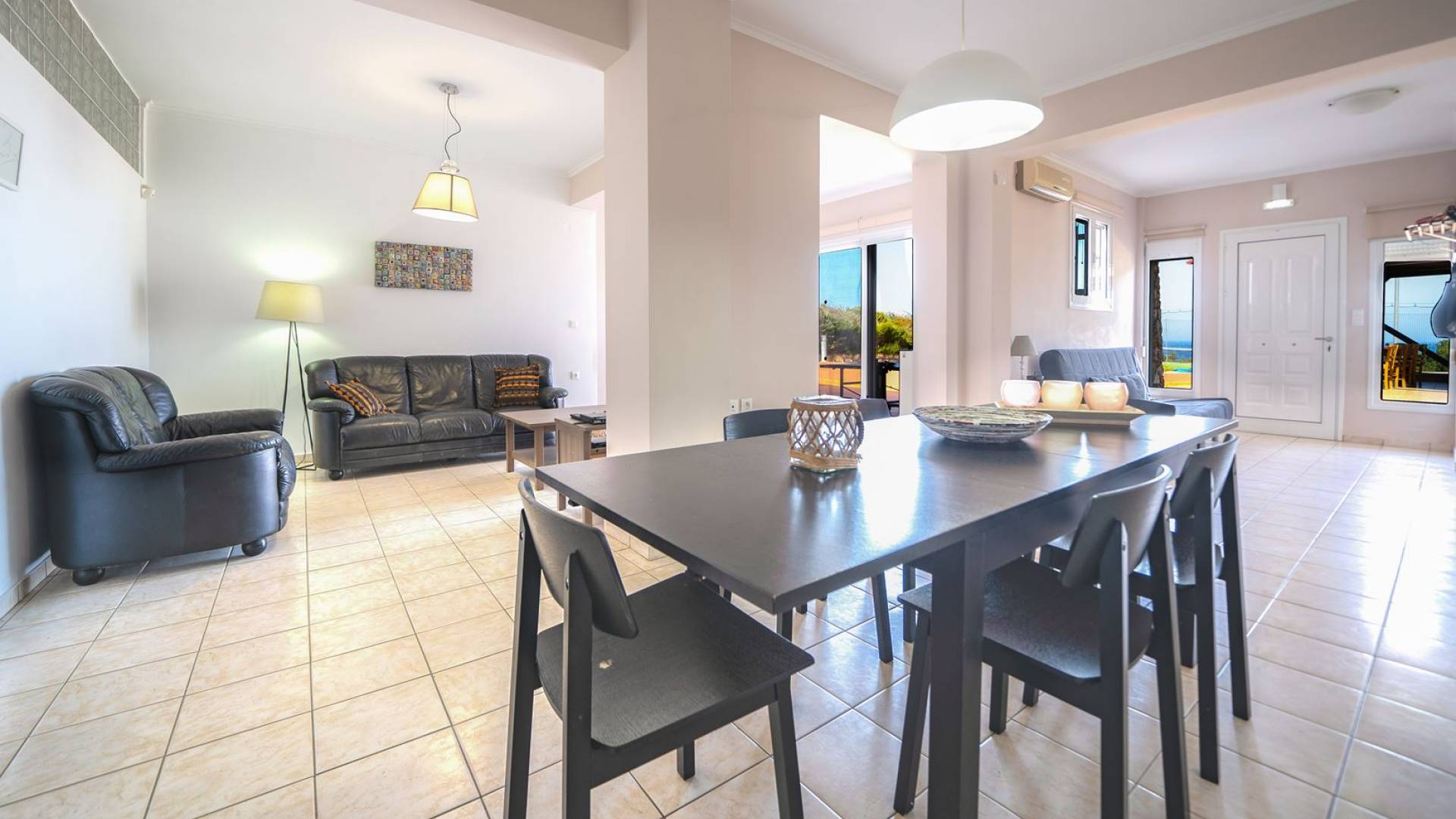 Al piano terra si trovano 3 camere da letto, una con un grande letto matrimoniale e due con 2 letti singoli ciascuna, 1 bagno con vasca e 1 WC con doccia, soggiorno e zona pranzo, ufficio trasformato in matrimoniale camera da letto, cucina completamente attrezzata, guardaroba e lavanderia. Tutte le camere sono dotate di aria condizionata e TV a schermo piatto. Al primo piano si trovano 1 ampio soggiorno e sala da pranzo con TV satellitare 42'', una seconda cucina completamente attrezzata, uno studio che si trasforma in una camera matrimoniale e 1 WC ospiti con doccia. Ci sono anche bellissime verande e balconi che offrono magnifiche viste sul mare. Al secondo piano ci sono altre tre camere da letto, una matrimoniale con letto king-size e bagno privato con vasca idromassaggio e balcone vista mare, un'altra camera matrimoniale e una con due letti singoli. C'è anche un altro bagno con vasca a questo livello.