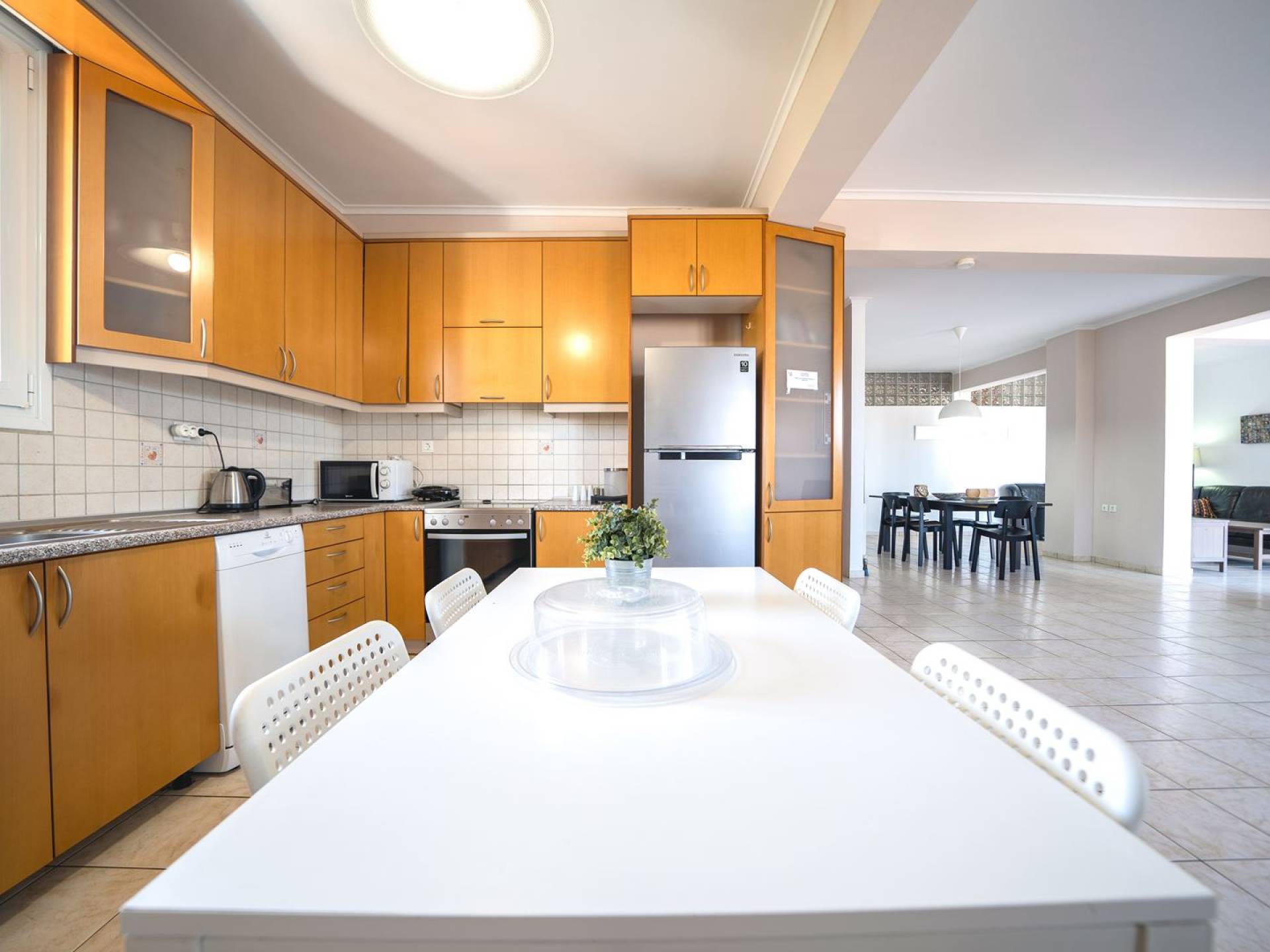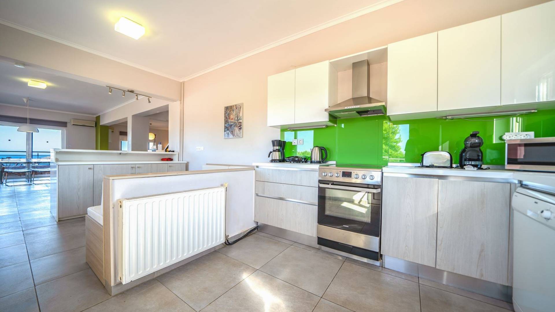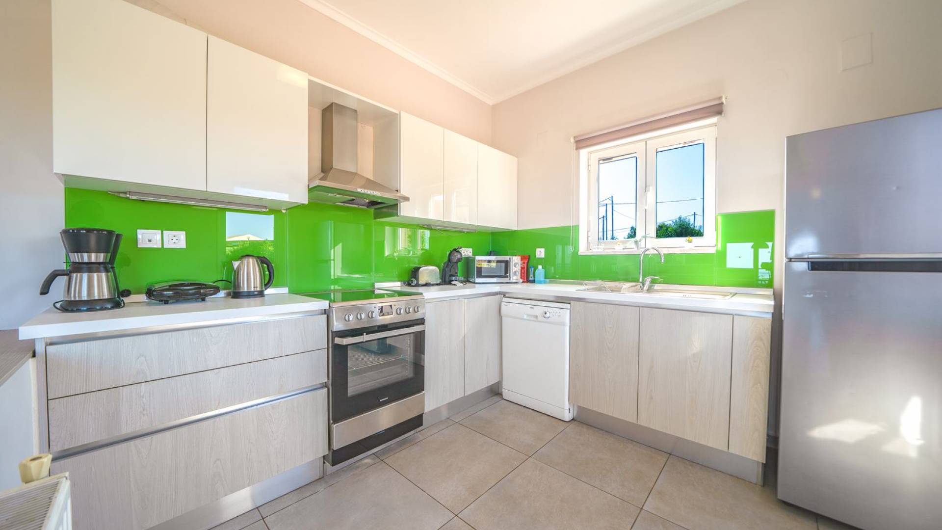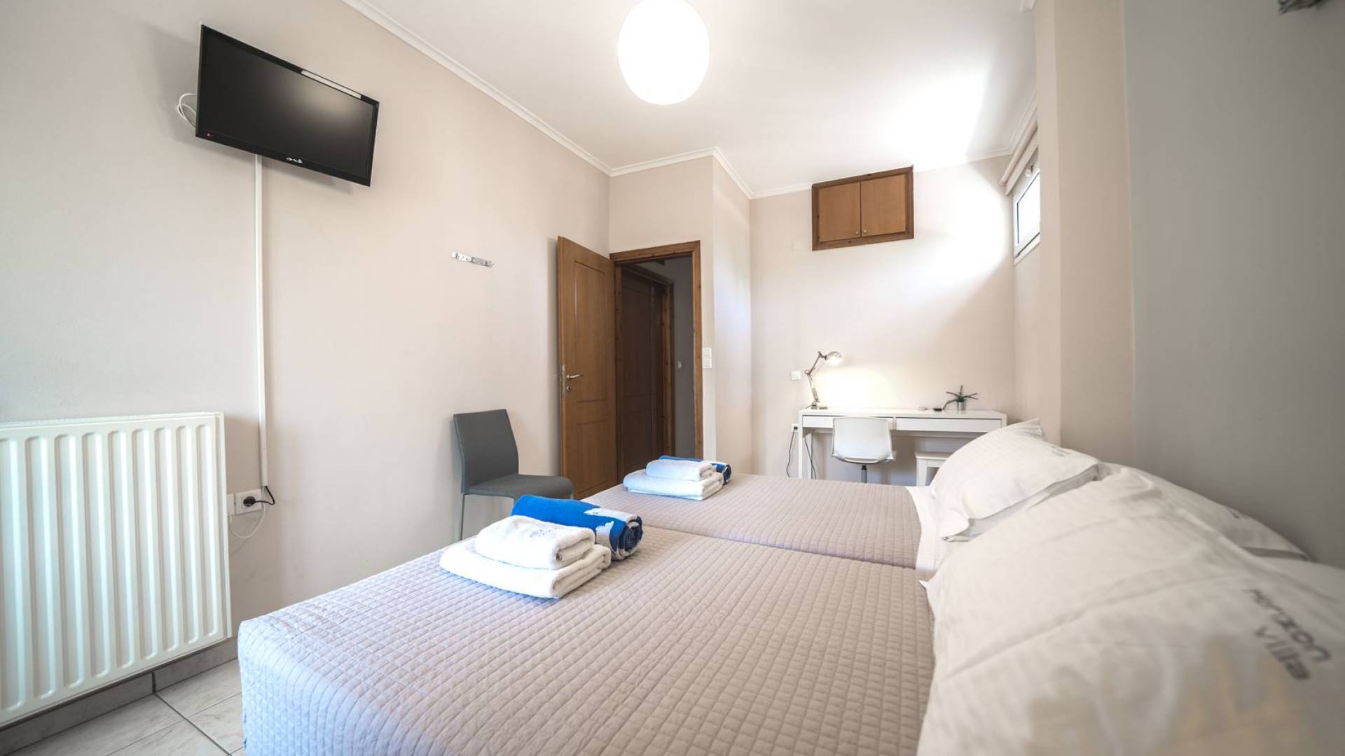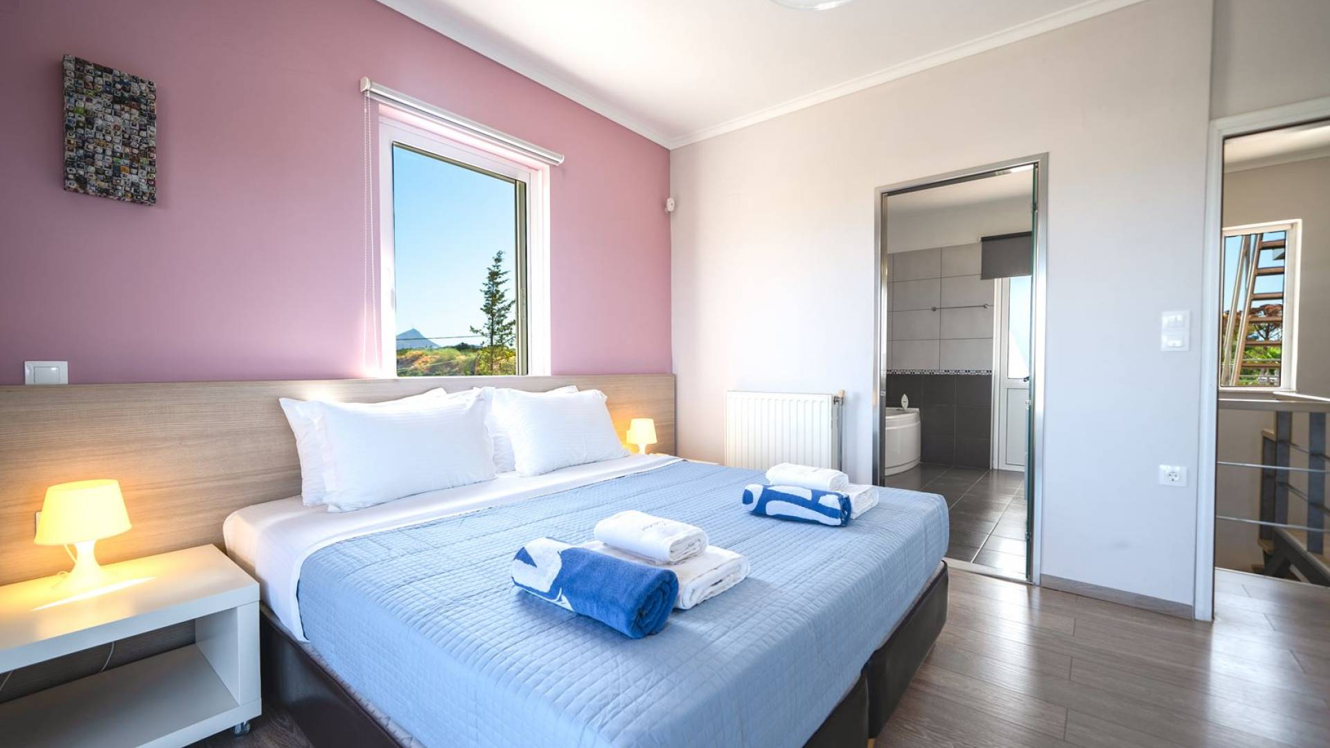 Al piano terra si trovano 3 camere da letto, una con un grande letto matrimoniale e due con 2 letti singoli ciascuna, 1 bagno con vasca e 1 WC con doccia, soggiorno e zona pranzo, ufficio trasformato in matrimoniale camera da letto, cucina completamente attrezzata, guardaroba e lavanderia. Tutte le camere sono dotate di aria condizionata e TV a schermo piatto. Al primo piano si trovano 1 ampio soggiorno e sala da pranzo con TV satellitare 42'', una seconda cucina completamente attrezzata, uno studio che si trasforma in una camera matrimoniale e 1 WC ospiti con doccia. Ci sono anche bellissime verande e balconi che offrono magnifiche viste sul mare. Al secondo piano ci sono altre tre camere da letto, una matrimoniale con letto king-size e bagno privato con vasca idromassaggio e balcone vista mare, un'altra camera matrimoniale e una con due letti singoli. C'è anche un altro bagno con vasca a questo livello.