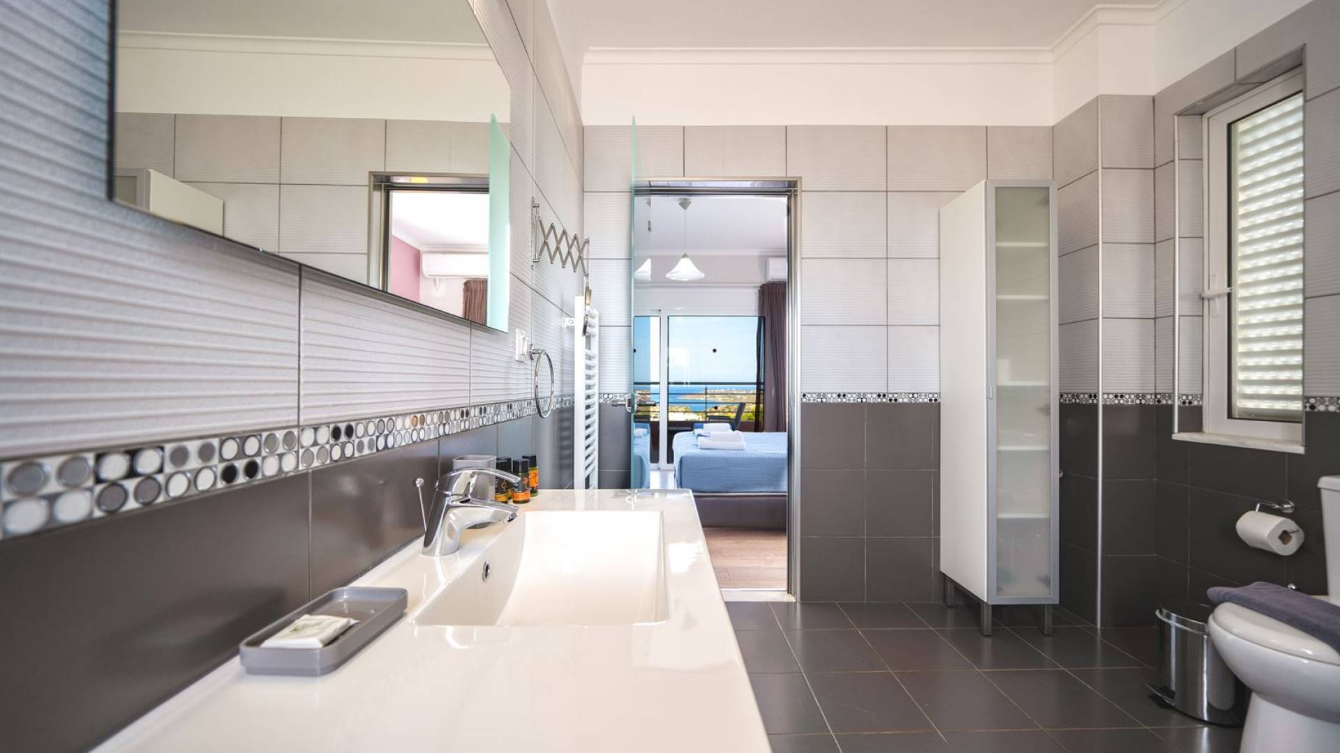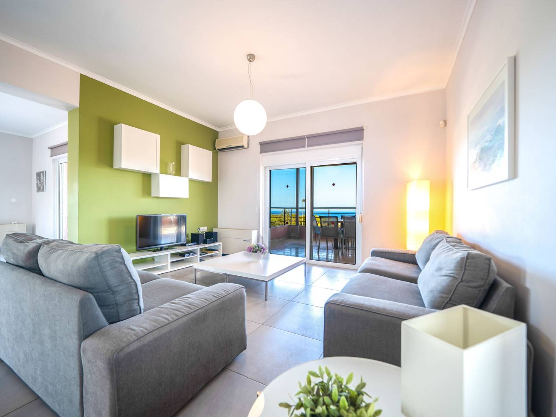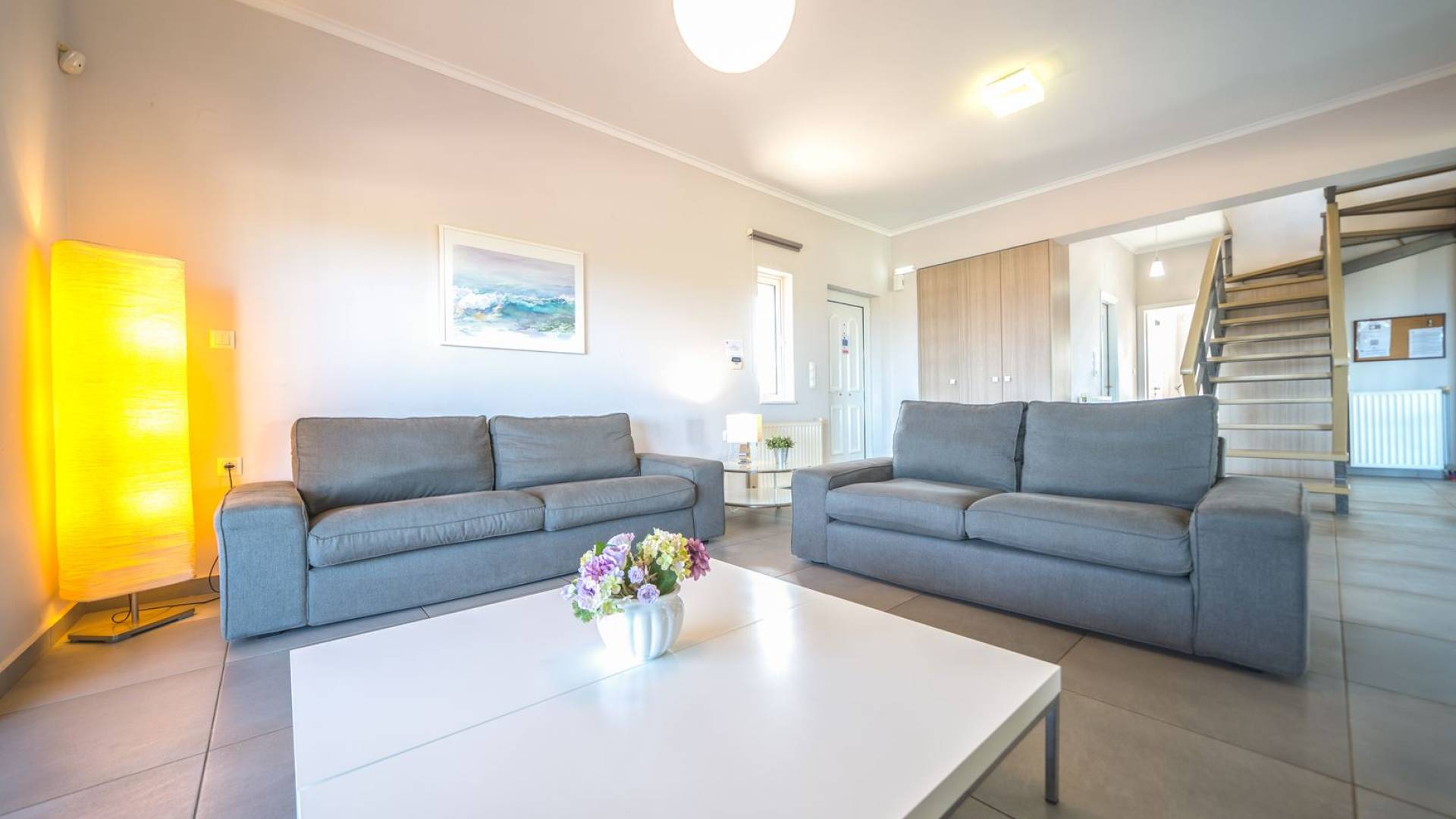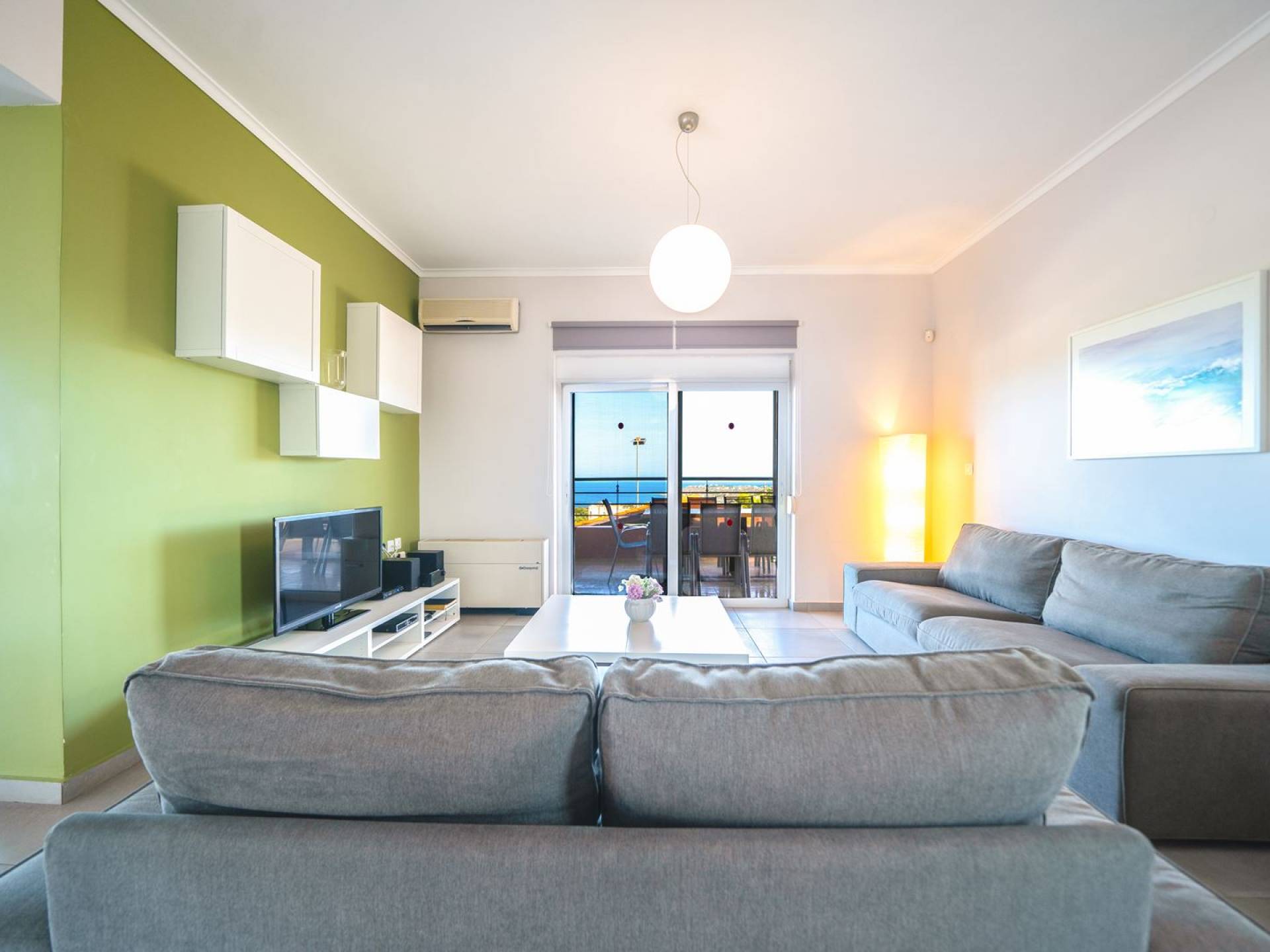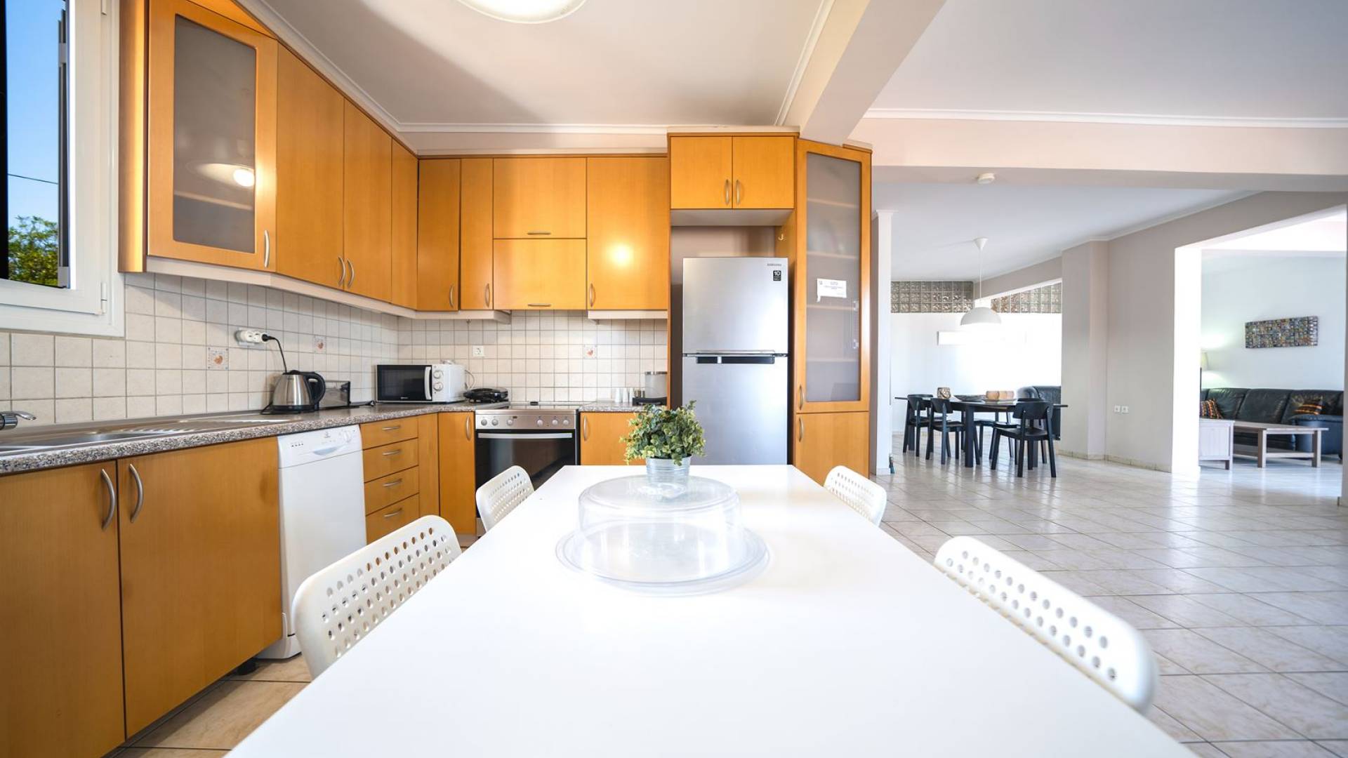 Al piano terra si trovano 3 camere da letto, una con un grande letto matrimoniale e due con 2 letti singoli ciascuna, 1 bagno con vasca e 1 WC con doccia, soggiorno e zona pranzo, ufficio trasformato in matrimoniale camera da letto, cucina completamente attrezzata, guardaroba e lavanderia. Tutte le camere sono dotate di aria condizionata e TV a schermo piatto. Al primo piano si trovano 1 ampio soggiorno e sala da pranzo con TV satellitare 42'', una seconda cucina completamente attrezzata, uno studio che si trasforma in una camera matrimoniale e 1 WC ospiti con doccia. Ci sono anche bellissime verande e balconi che offrono magnifiche viste sul mare. Al secondo piano ci sono altre tre camere da letto, una matrimoniale con letto king-size e bagno privato con vasca idromassaggio e balcone vista mare, un'altra camera matrimoniale e una con due letti singoli. C'è anche un altro bagno con vasca a questo livello.