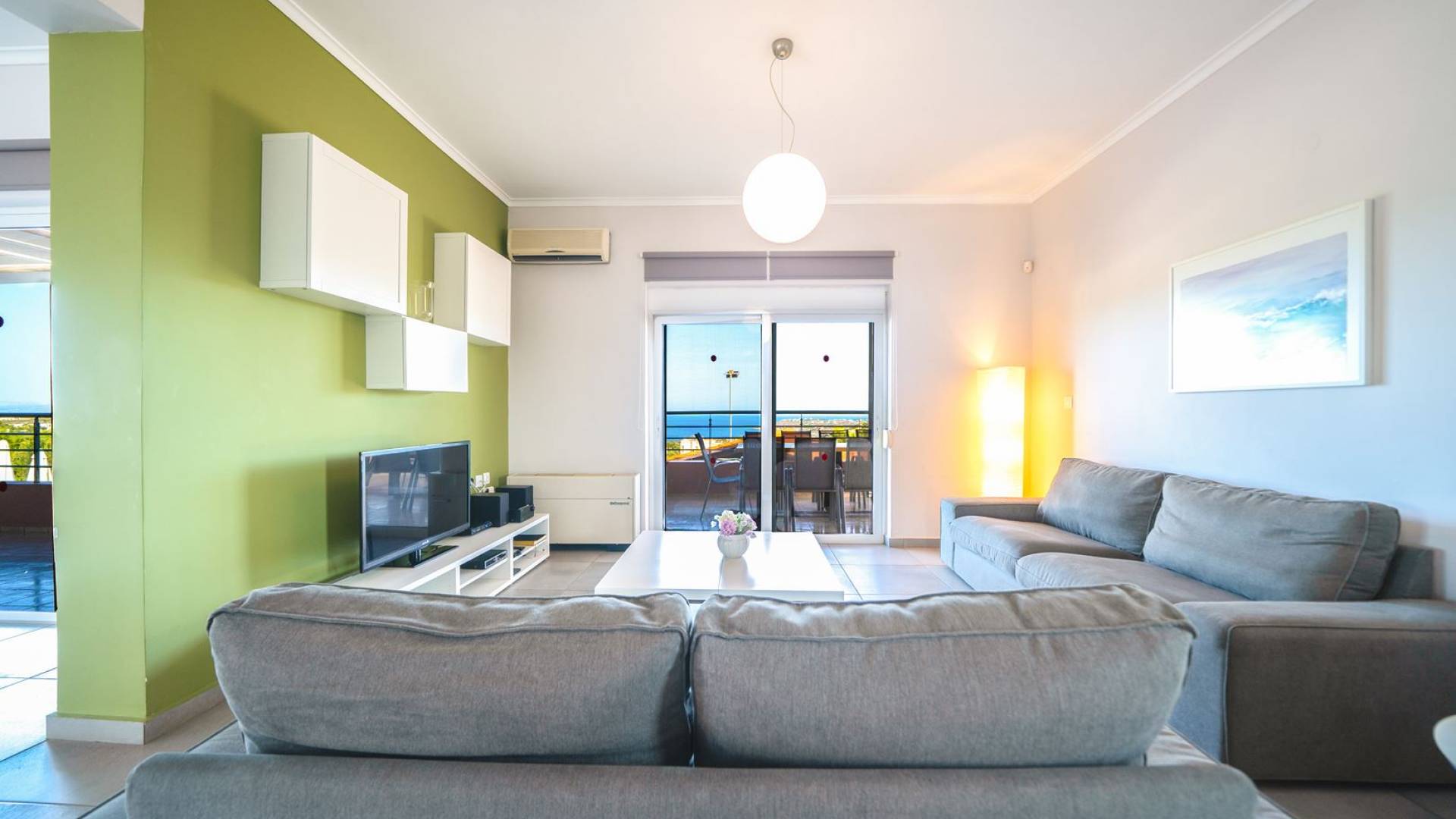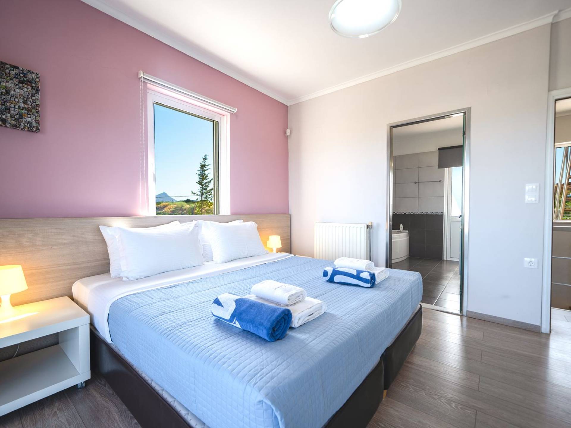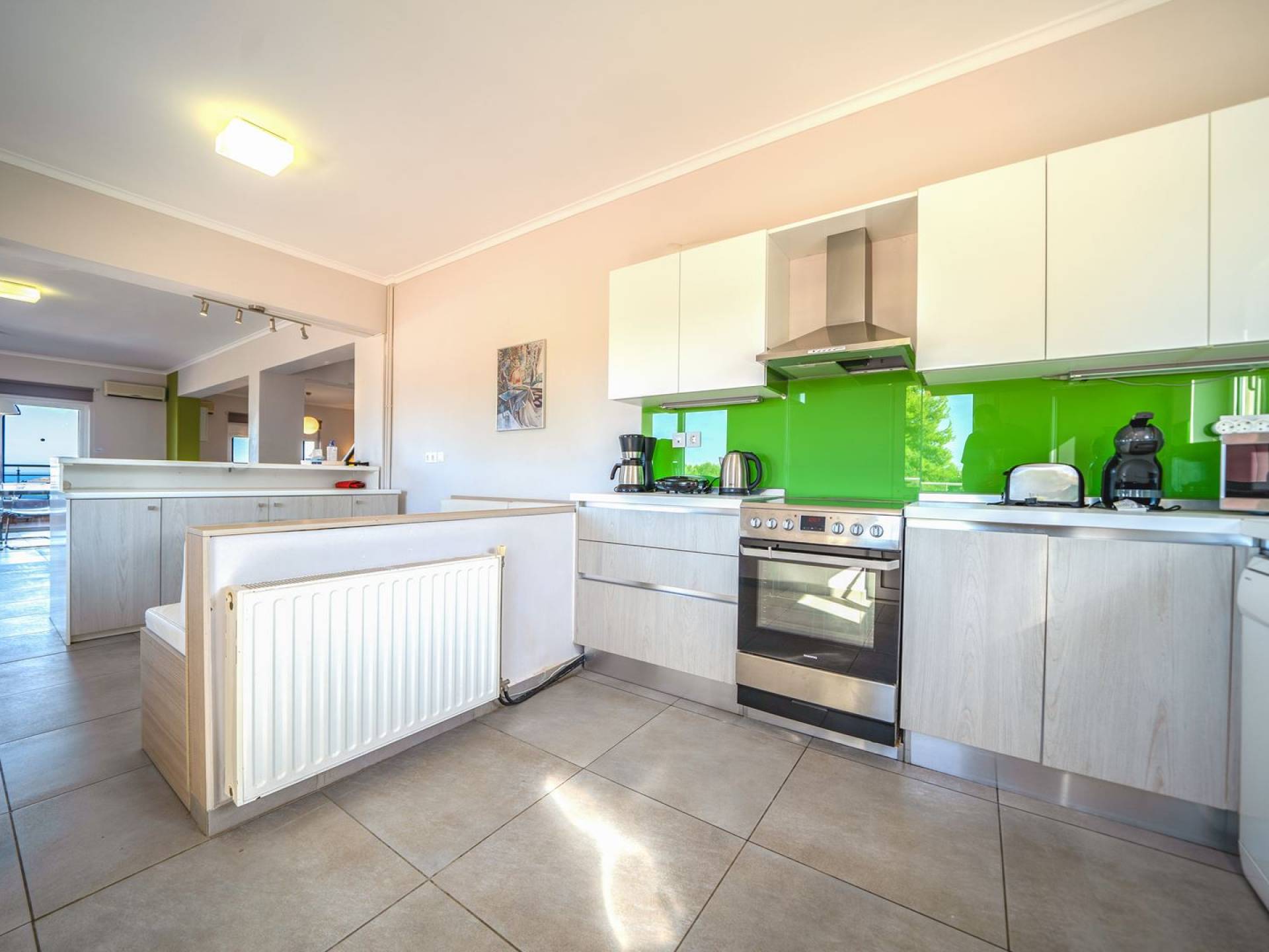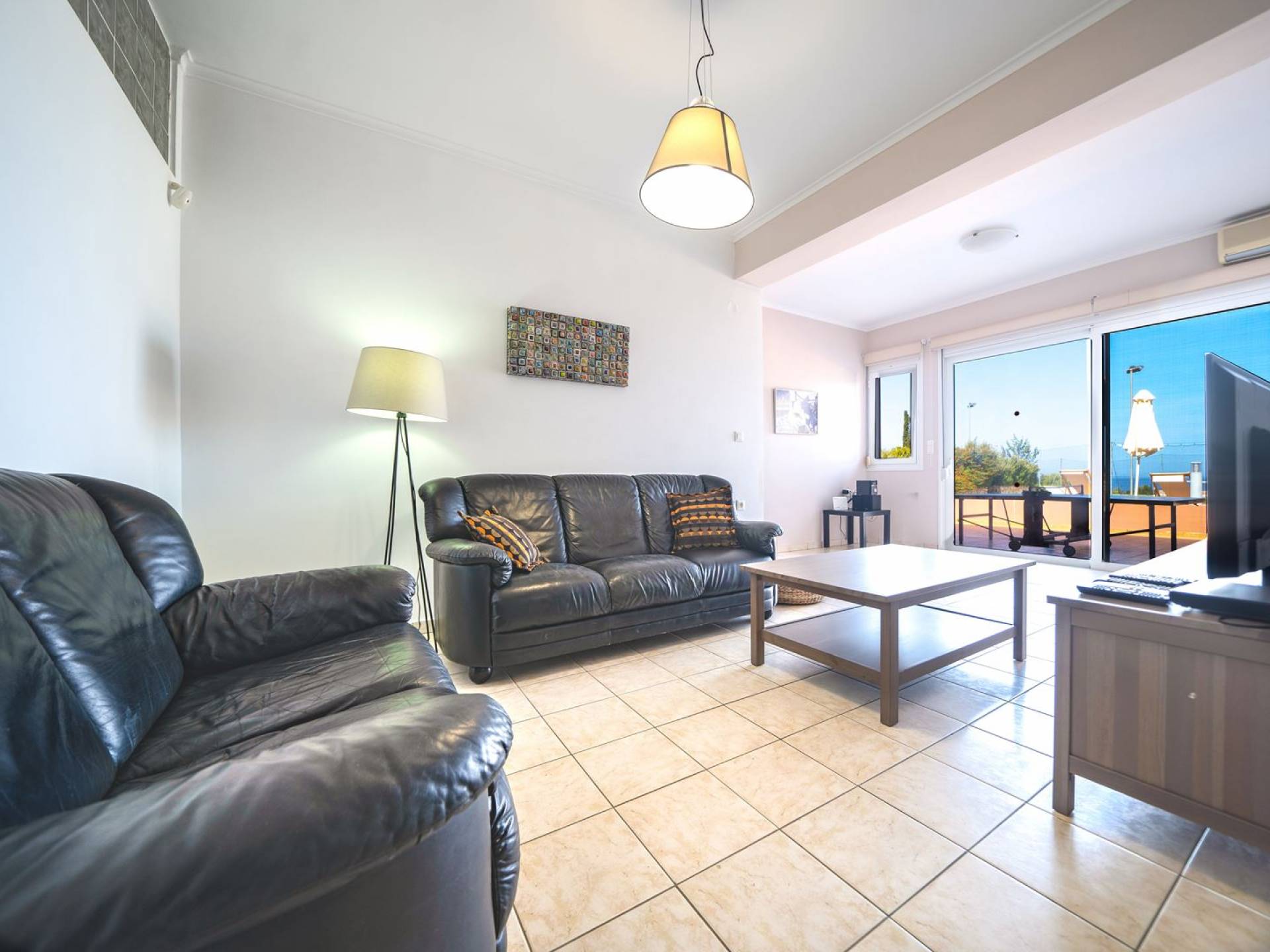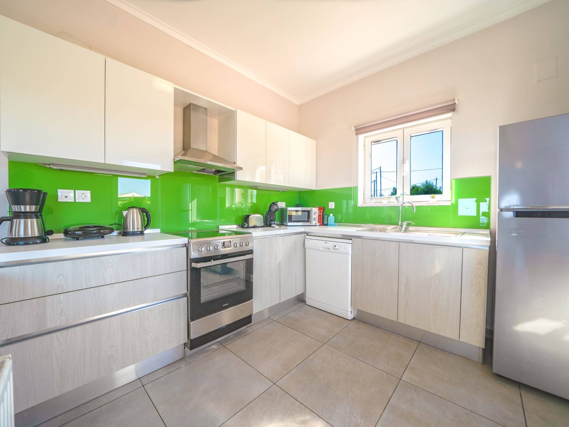 Al piano terra si trovano 3 camere da letto, una con un grande letto matrimoniale e due con 2 letti singoli ciascuna, 1 bagno con vasca e 1 WC con doccia, soggiorno e zona pranzo, ufficio trasformato in matrimoniale camera da letto, cucina completamente attrezzata, guardaroba e lavanderia. Tutte le camere sono dotate di aria condizionata e TV a schermo piatto. Al primo piano si trovano 1 ampio soggiorno e sala da pranzo con TV satellitare 42'', una seconda cucina completamente attrezzata, uno studio che si trasforma in una camera matrimoniale e 1 WC ospiti con doccia. Ci sono anche bellissime verande e balconi che offrono magnifiche viste sul mare. Al secondo piano ci sono altre tre camere da letto, una matrimoniale con letto king-size e bagno privato con vasca idromassaggio e balcone vista mare, un'altra camera matrimoniale e una con due letti singoli. C'è anche un altro bagno con vasca a questo livello.