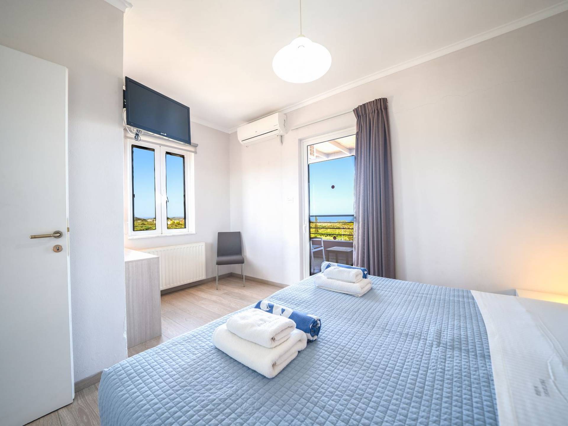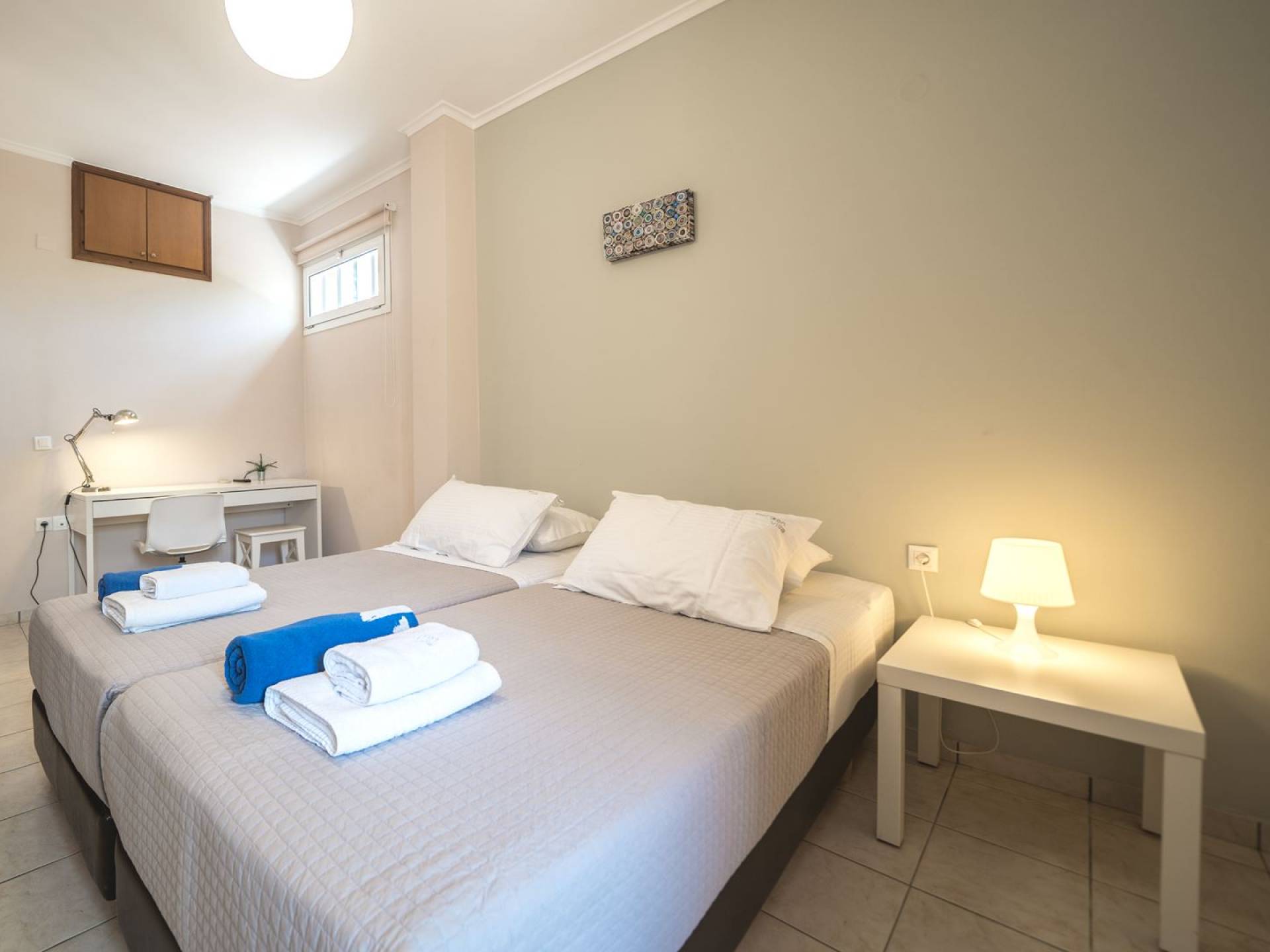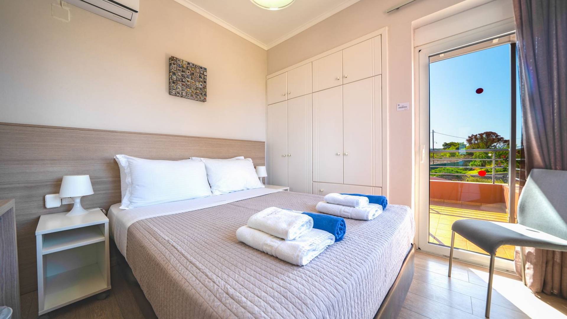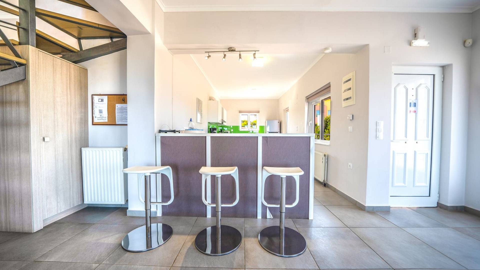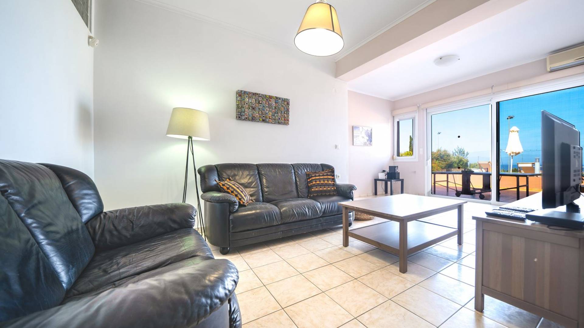 Al piano terra si trovano 3 camere da letto, una con un grande letto matrimoniale e due con 2 letti singoli ciascuna, 1 bagno con vasca e 1 WC con doccia, soggiorno e zona pranzo, ufficio trasformato in matrimoniale camera da letto, cucina completamente attrezzata, guardaroba e lavanderia. Tutte le camere sono dotate di aria condizionata e TV a schermo piatto. Al primo piano si trovano 1 ampio soggiorno e sala da pranzo con TV satellitare 42'', una seconda cucina completamente attrezzata, uno studio che si trasforma in una camera matrimoniale e 1 WC ospiti con doccia. Ci sono anche bellissime verande e balconi che offrono magnifiche viste sul mare. Al secondo piano ci sono altre tre camere da letto, una matrimoniale con letto king-size e bagno privato con vasca idromassaggio e balcone vista mare, un'altra camera matrimoniale e una con due letti singoli. C'è anche un altro bagno con vasca a questo livello.