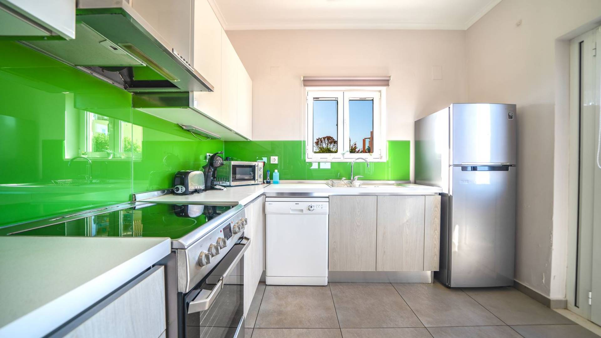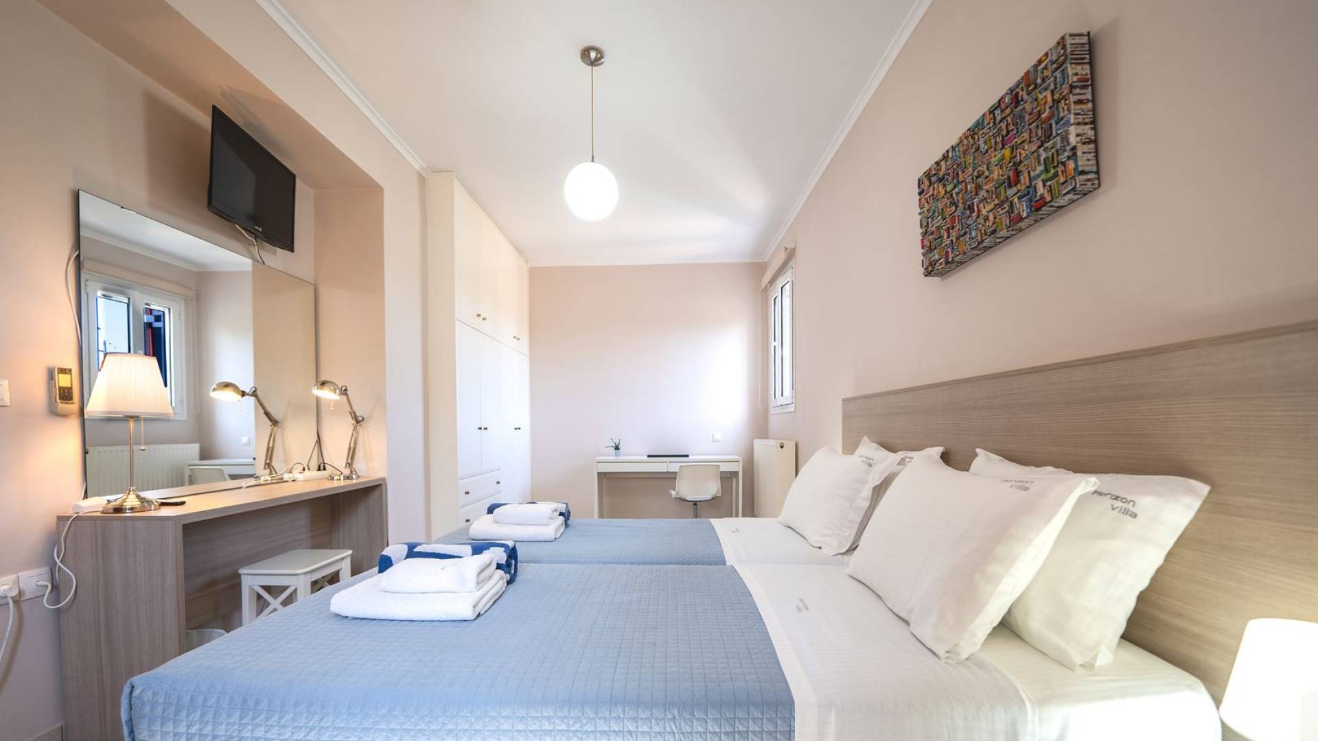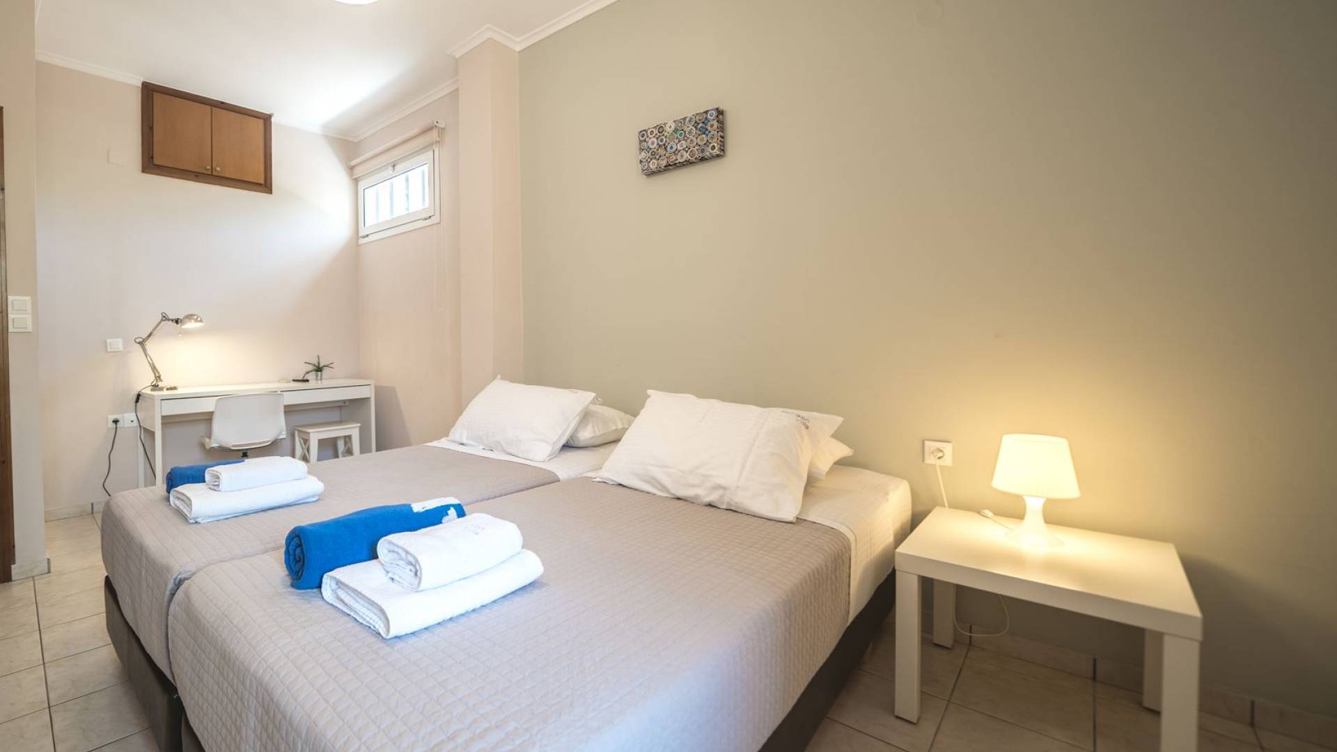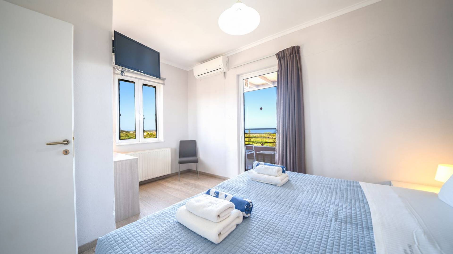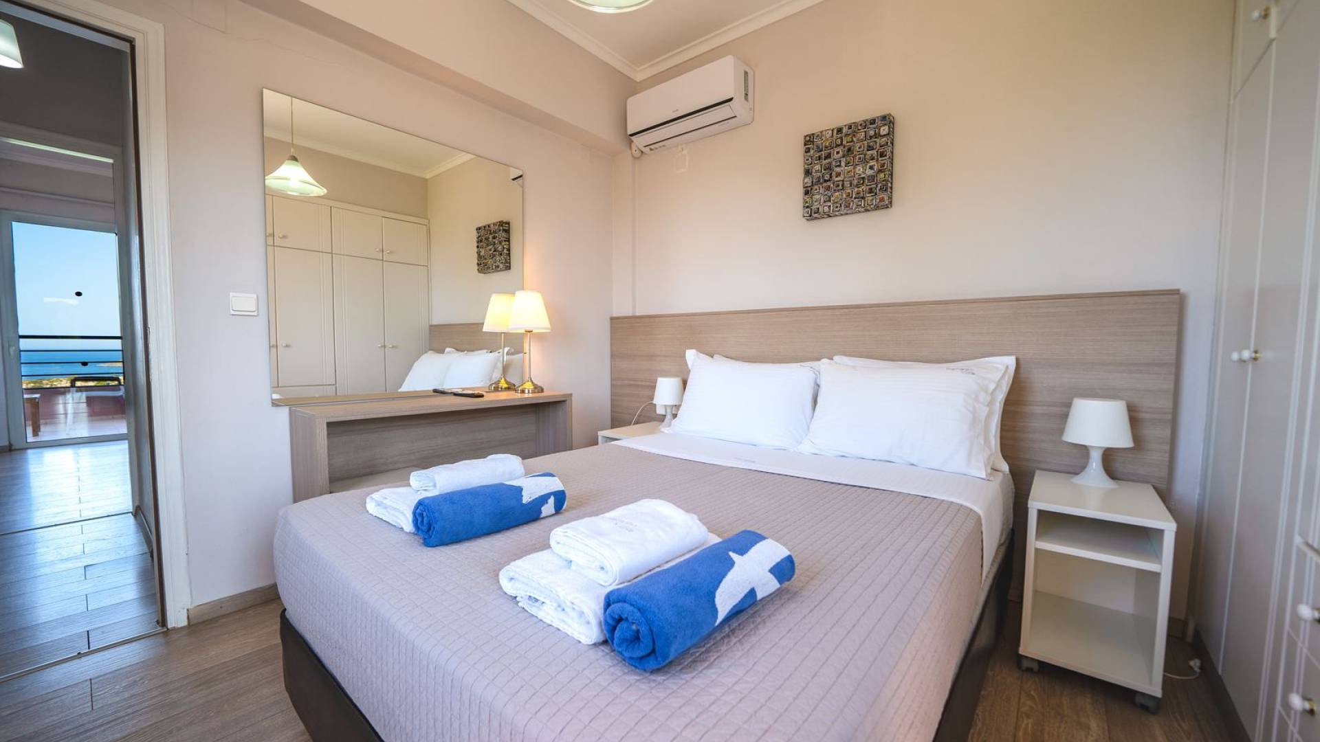 Al piano terra si trovano 3 camere da letto, una con un grande letto matrimoniale e due con 2 letti singoli ciascuna, 1 bagno con vasca e 1 WC con doccia, soggiorno e zona pranzo, ufficio trasformato in matrimoniale camera da letto, cucina completamente attrezzata, guardaroba e lavanderia. Tutte le camere sono dotate di aria condizionata e TV a schermo piatto. Al primo piano si trovano 1 ampio soggiorno e sala da pranzo con TV satellitare 42'', una seconda cucina completamente attrezzata, uno studio che si trasforma in una camera matrimoniale e 1 WC ospiti con doccia. Ci sono anche bellissime verande e balconi che offrono magnifiche viste sul mare. Al secondo piano ci sono altre tre camere da letto, una matrimoniale con letto king-size e bagno privato con vasca idromassaggio e balcone vista mare, un'altra camera matrimoniale e una con due letti singoli. C'è anche un altro bagno con vasca a questo livello.