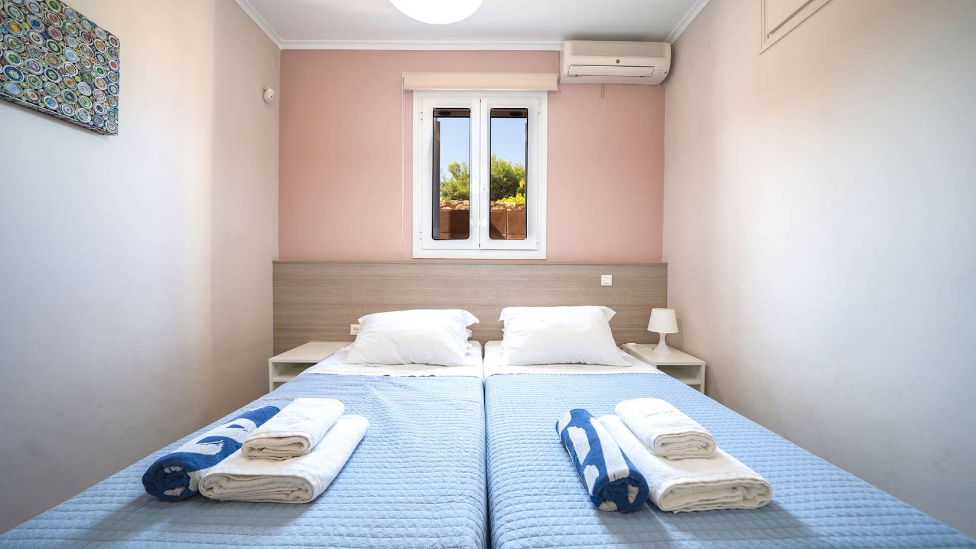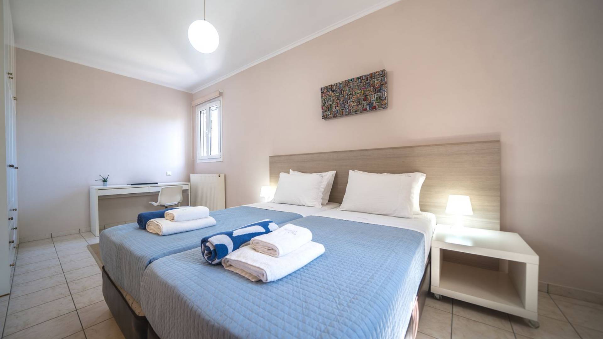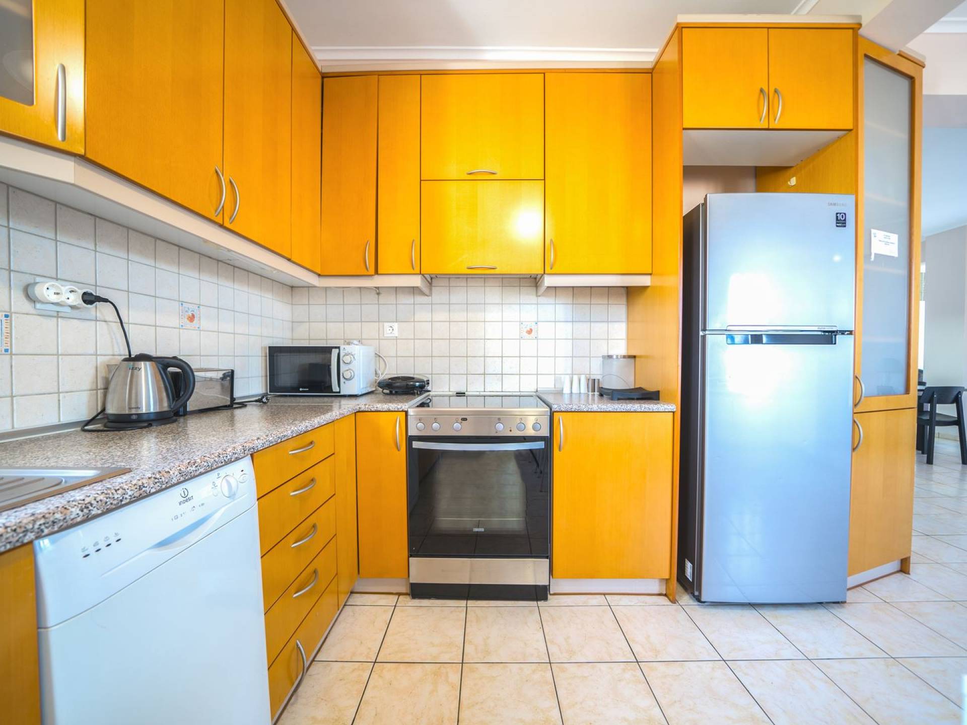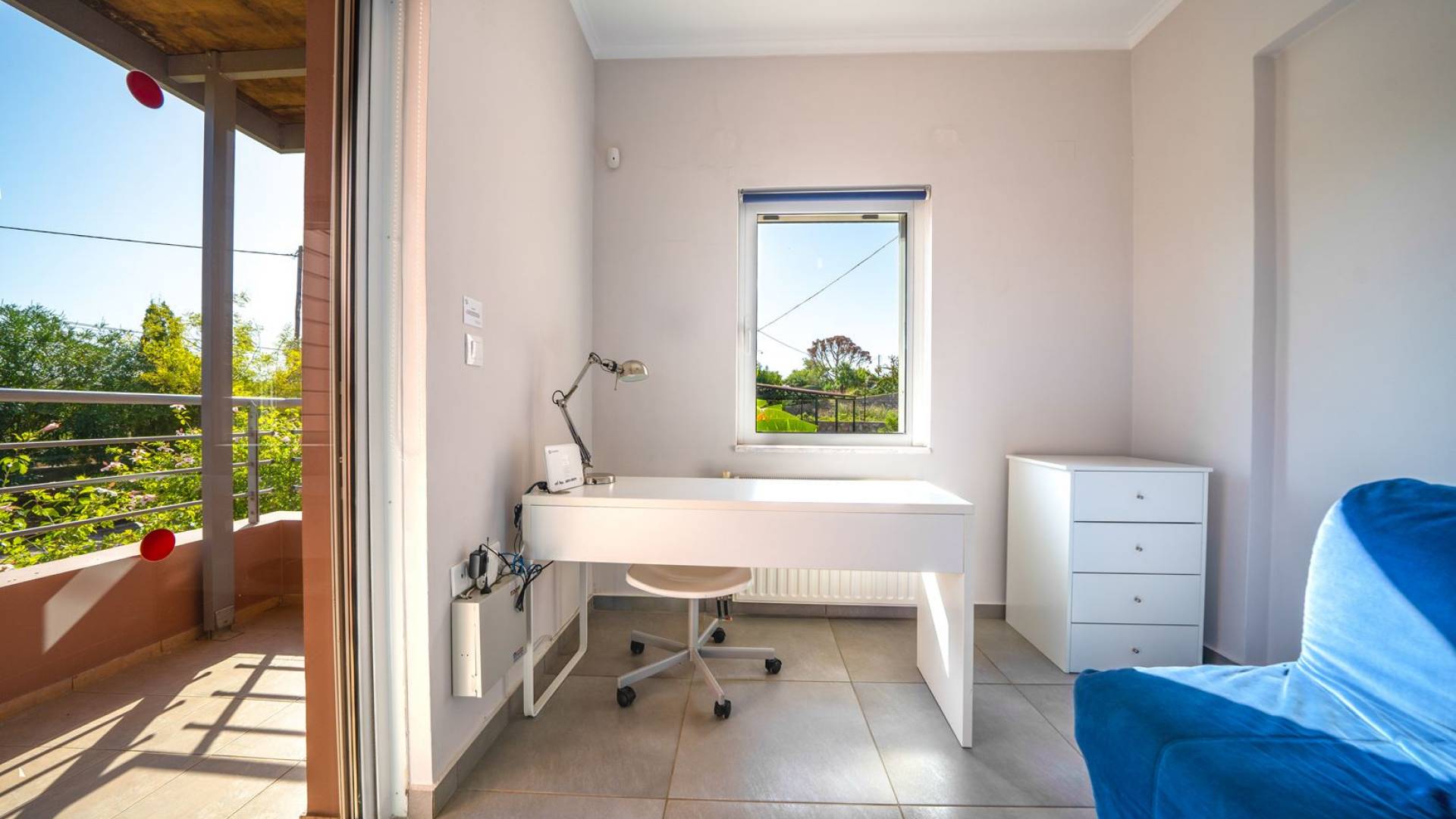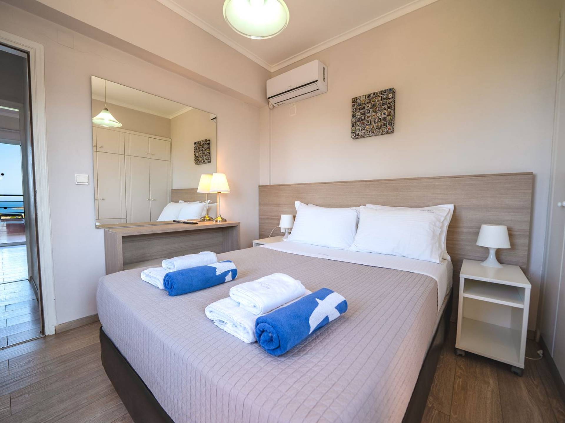 Al piano terra si trovano 3 camere da letto, una con un grande letto matrimoniale e due con 2 letti singoli ciascuna, 1 bagno con vasca e 1 WC con doccia, soggiorno e zona pranzo, ufficio trasformato in matrimoniale camera da letto, cucina completamente attrezzata, guardaroba e lavanderia. Tutte le camere sono dotate di aria condizionata e TV a schermo piatto. Al primo piano si trovano 1 ampio soggiorno e sala da pranzo con TV satellitare 42'', una seconda cucina completamente attrezzata, uno studio che si trasforma in una camera matrimoniale e 1 WC ospiti con doccia. Ci sono anche bellissime verande e balconi che offrono magnifiche viste sul mare. Al secondo piano ci sono altre tre camere da letto, una matrimoniale con letto king-size e bagno privato con vasca idromassaggio e balcone vista mare, un'altra camera matrimoniale e una con due letti singoli. C'è anche un altro bagno con vasca a questo livello.