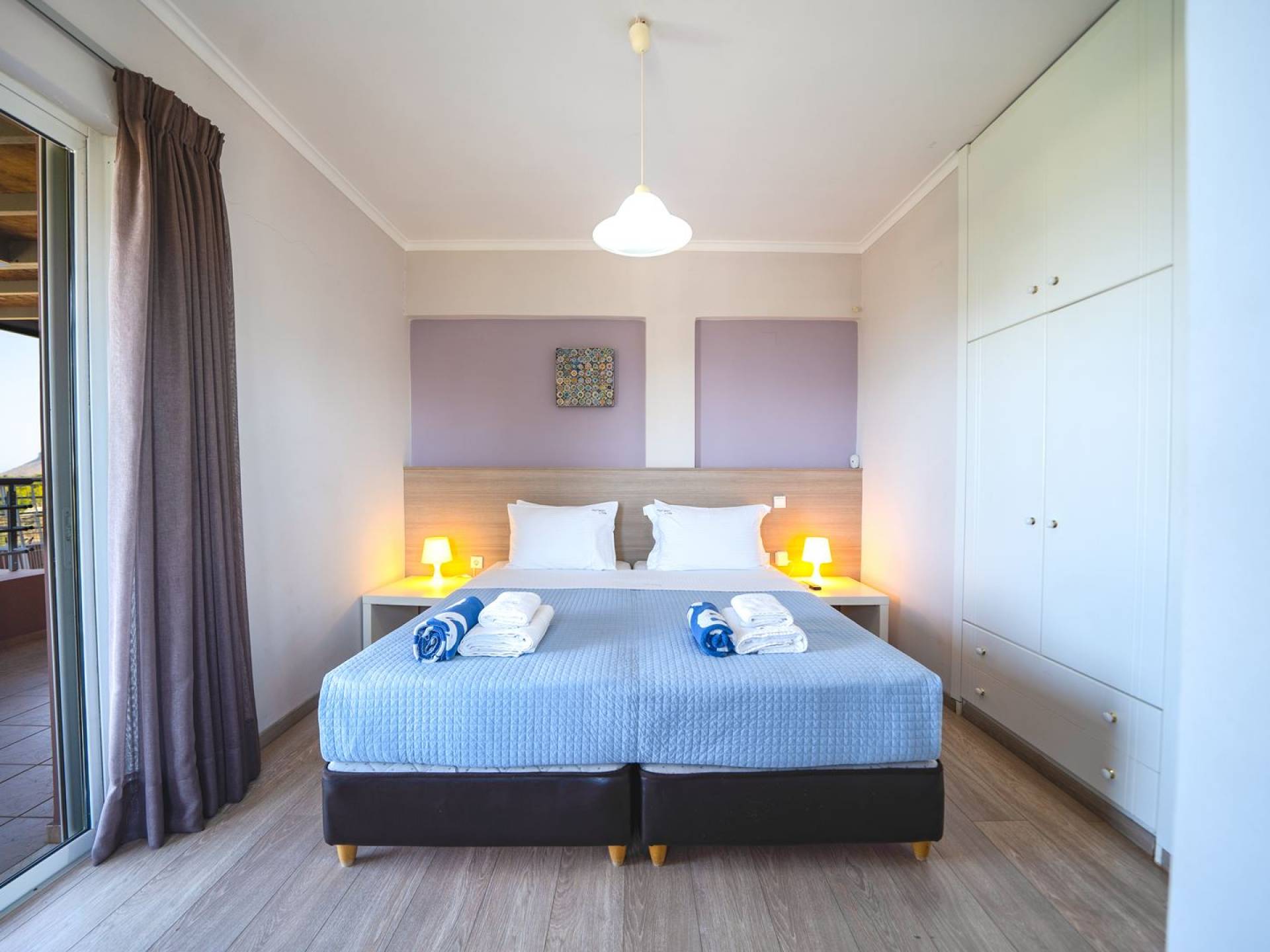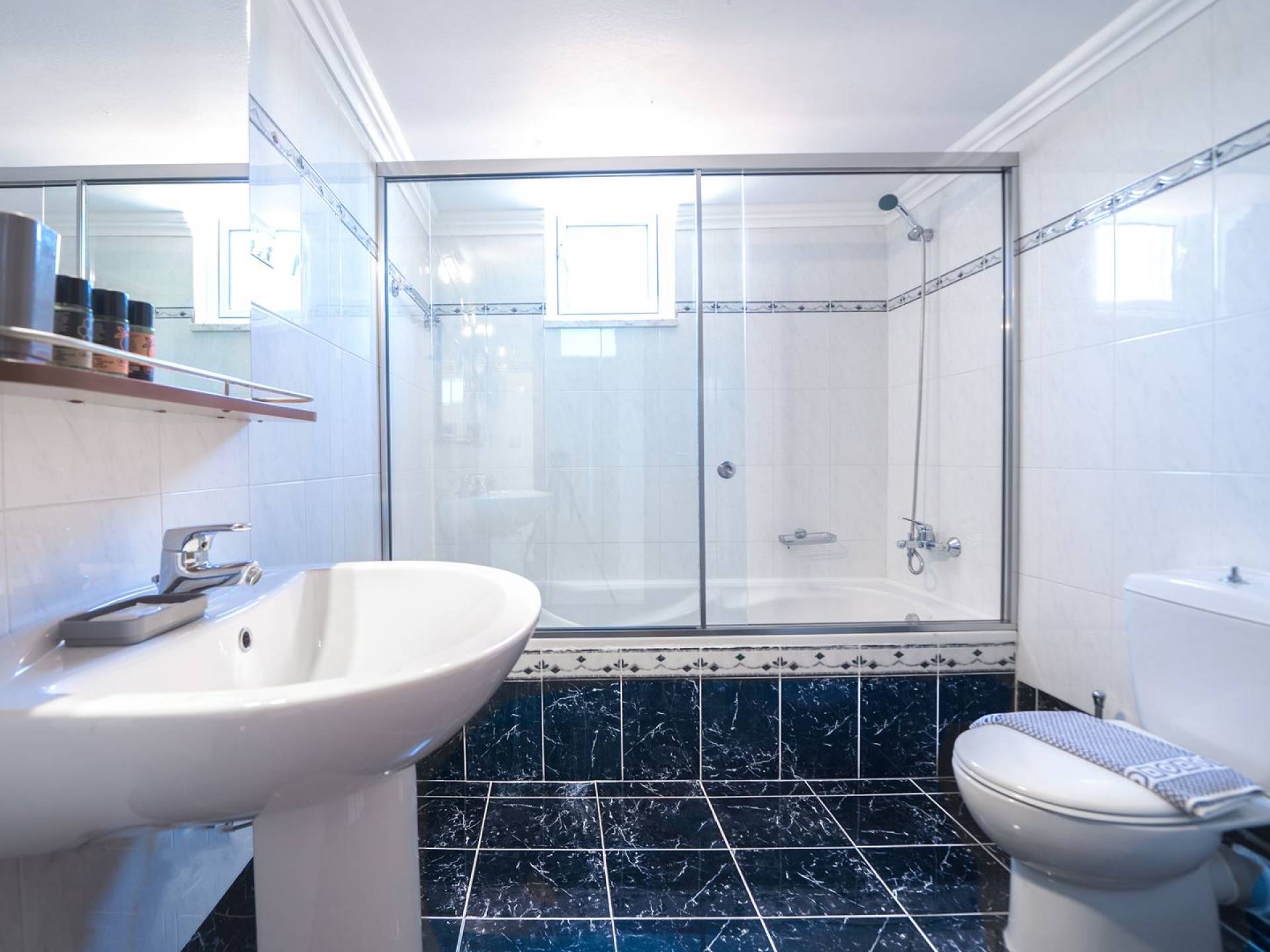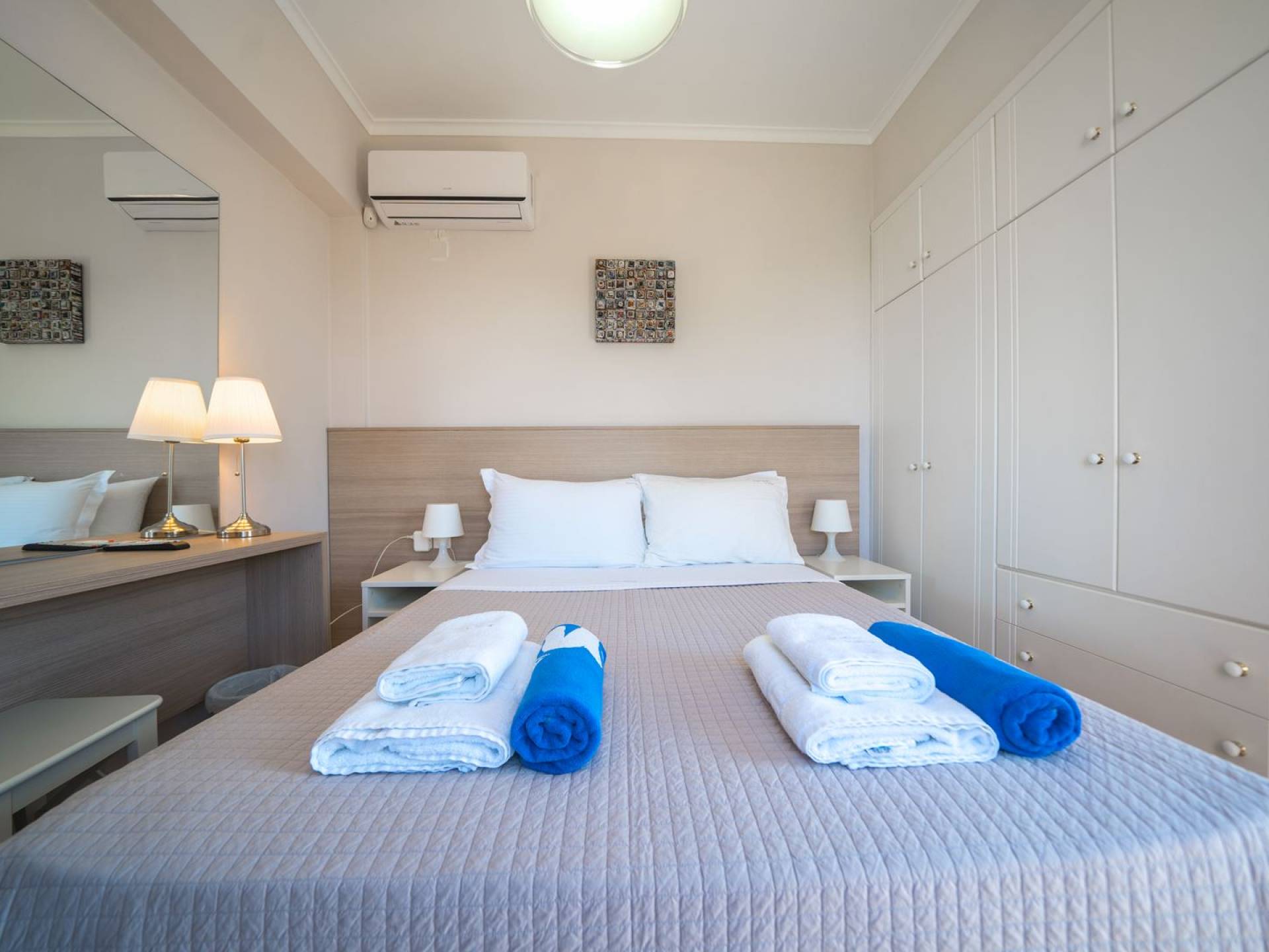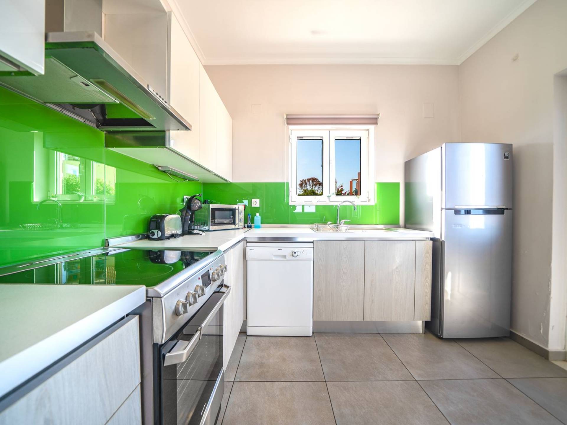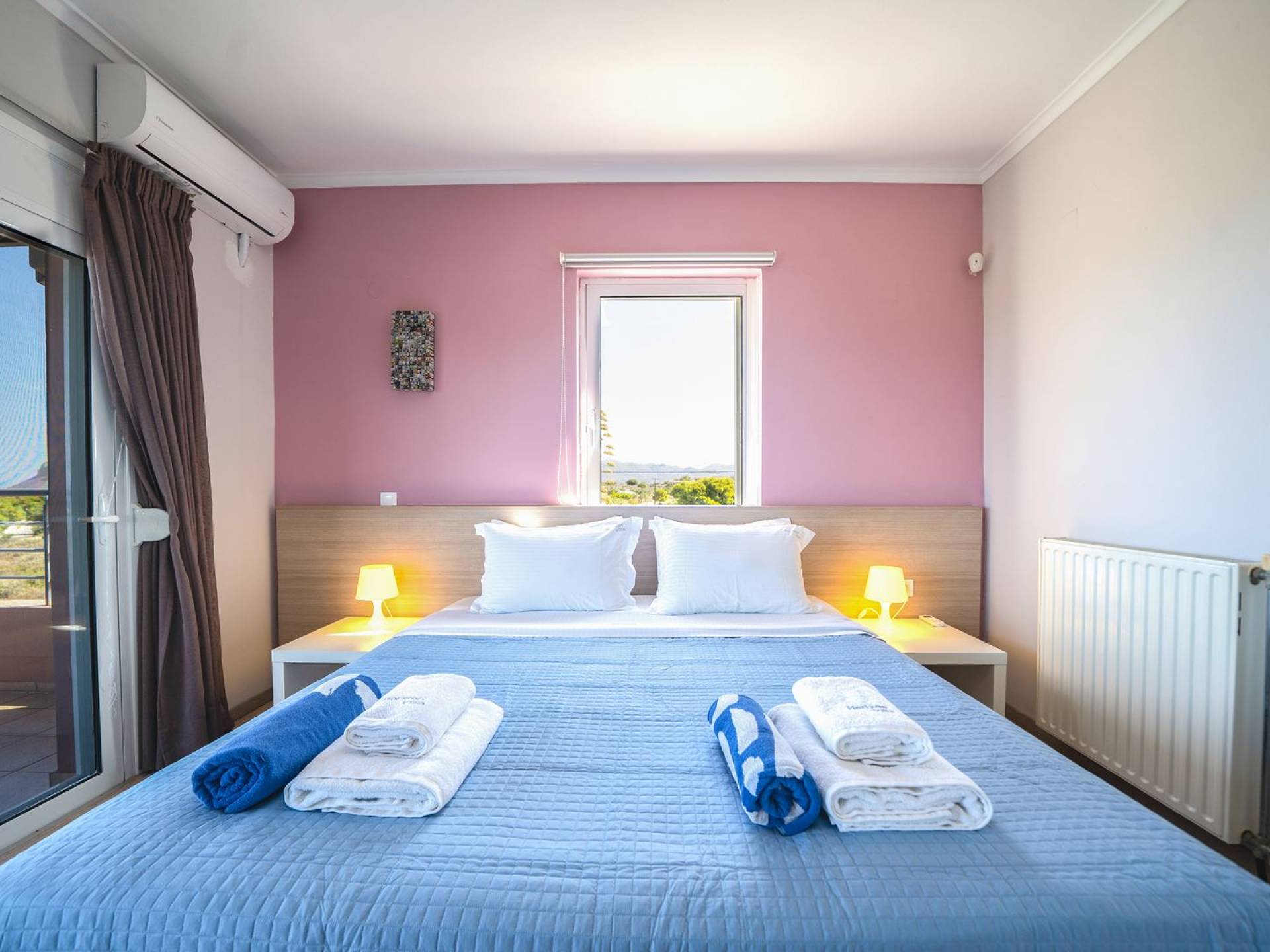 Al piano terra si trovano 3 camere da letto, una con un grande letto matrimoniale e due con 2 letti singoli ciascuna, 1 bagno con vasca e 1 WC con doccia, soggiorno e zona pranzo, ufficio trasformato in matrimoniale camera da letto, cucina completamente attrezzata, guardaroba e lavanderia. Tutte le camere sono dotate di aria condizionata e TV a schermo piatto. Al primo piano si trovano 1 ampio soggiorno e sala da pranzo con TV satellitare 42'', una seconda cucina completamente attrezzata, uno studio che si trasforma in una camera matrimoniale e 1 WC ospiti con doccia. Ci sono anche bellissime verande e balconi che offrono magnifiche viste sul mare. Al secondo piano ci sono altre tre camere da letto, una matrimoniale con letto king-size e bagno privato con vasca idromassaggio e balcone vista mare, un'altra camera matrimoniale e una con due letti singoli. C'è anche un altro bagno con vasca a questo livello.