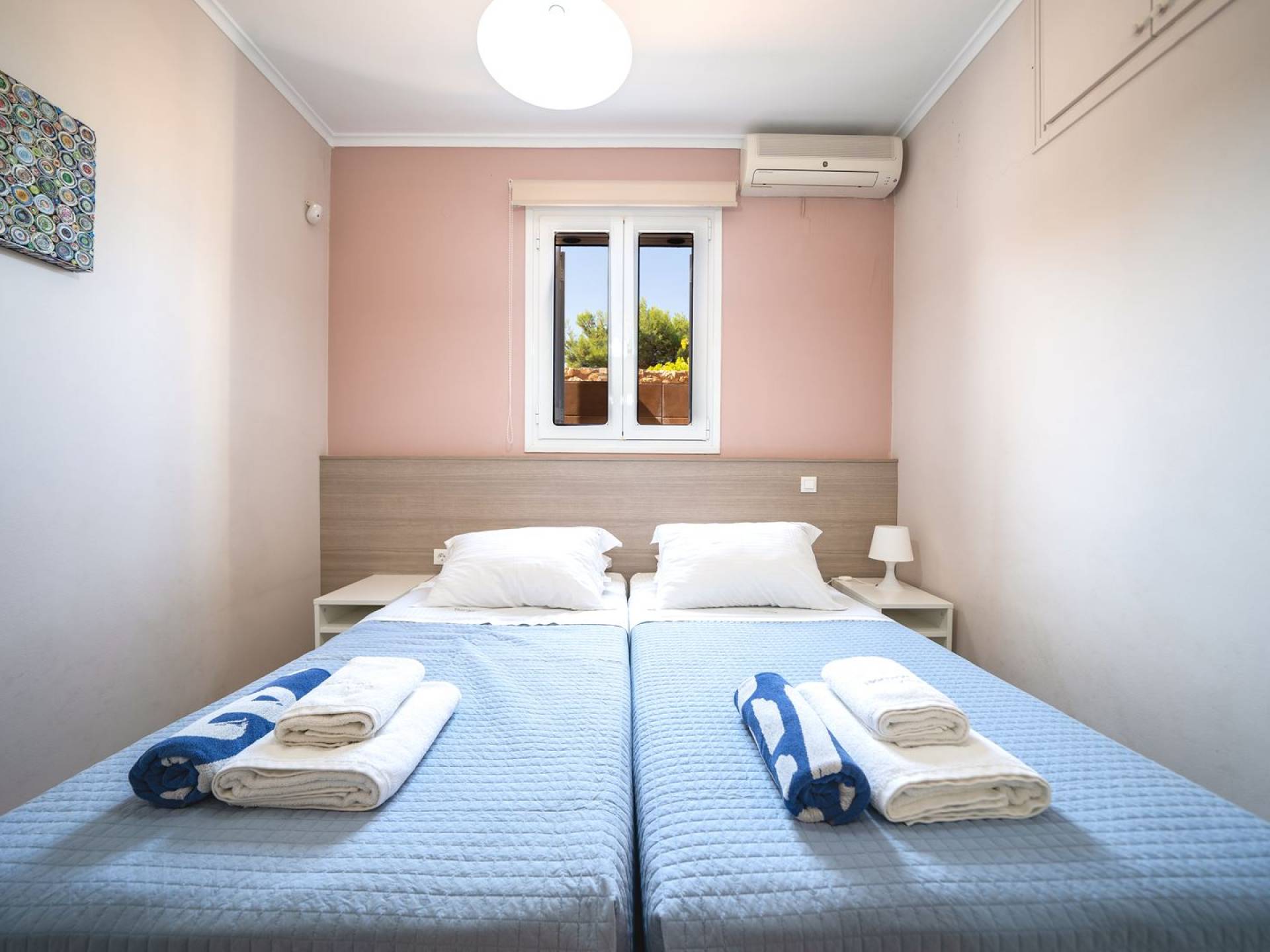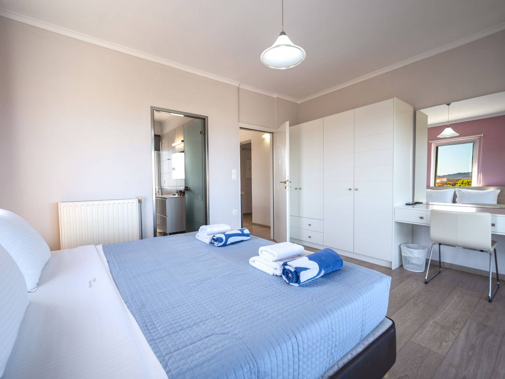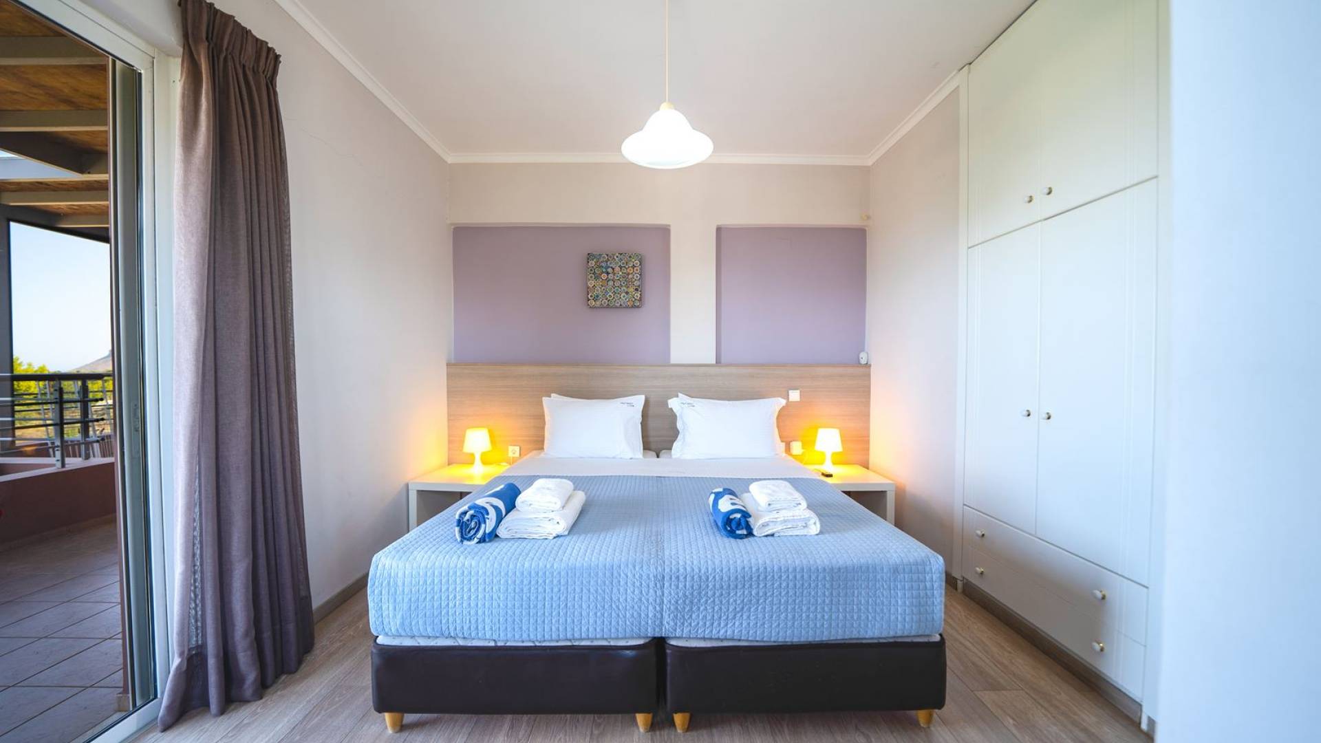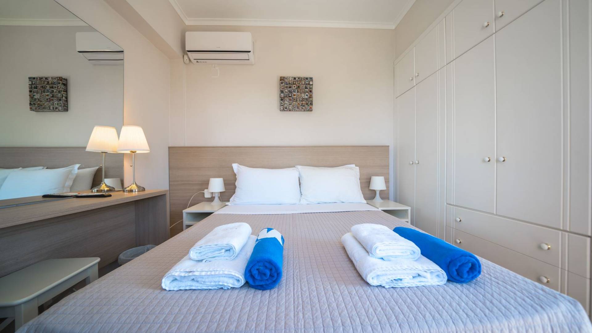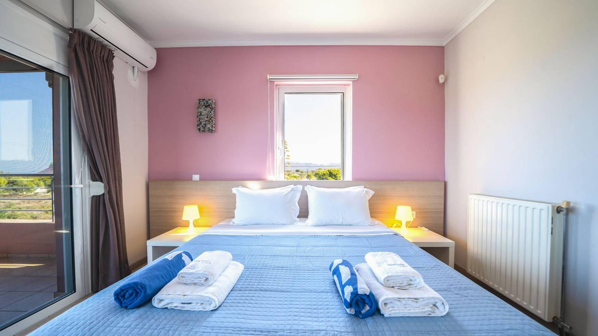Al piano terra si trovano 3 camere da letto, una con un grande letto matrimoniale e due con 2 letti singoli ciascuna, 1 bagno con vasca e 1 WC con doccia, soggiorno e zona pranzo, ufficio trasformato in matrimoniale camera da letto, cucina completamente attrezzata, guardaroba e lavanderia. Tutte le camere sono dotate di aria condizionata e TV a schermo piatto. Al primo piano si trovano 1 ampio soggiorno e sala da pranzo con TV satellitare 42'', una seconda cucina completamente attrezzata, uno studio che si trasforma in una camera matrimoniale e 1 WC ospiti con doccia. Ci sono anche bellissime verande e balconi che offrono magnifiche viste sul mare. Al secondo piano ci sono altre tre camere da letto, una matrimoniale con letto king-size e bagno privato con vasca idromassaggio e balcone vista mare, un'altra camera matrimoniale e una con due letti singoli. C'è anche un altro bagno con vasca a questo livello.