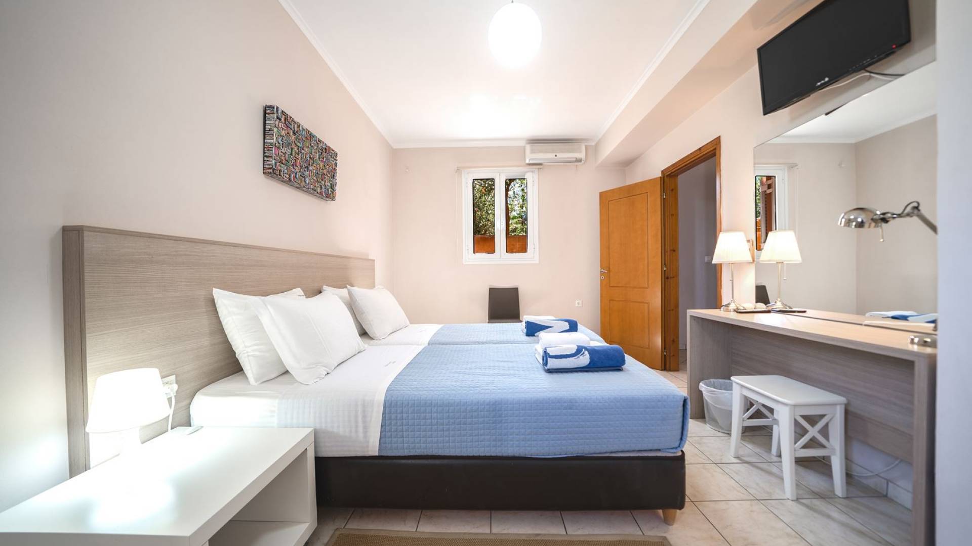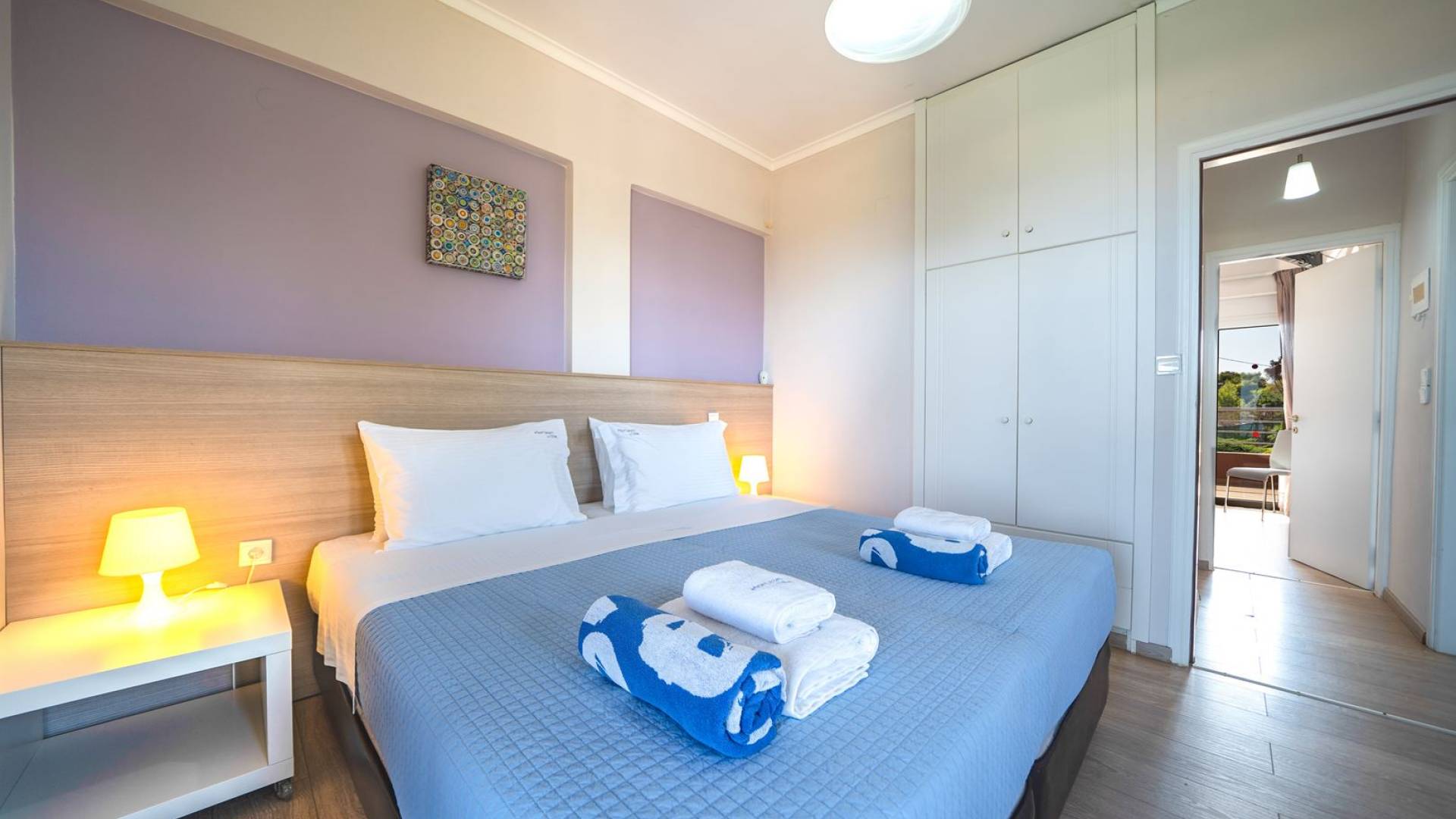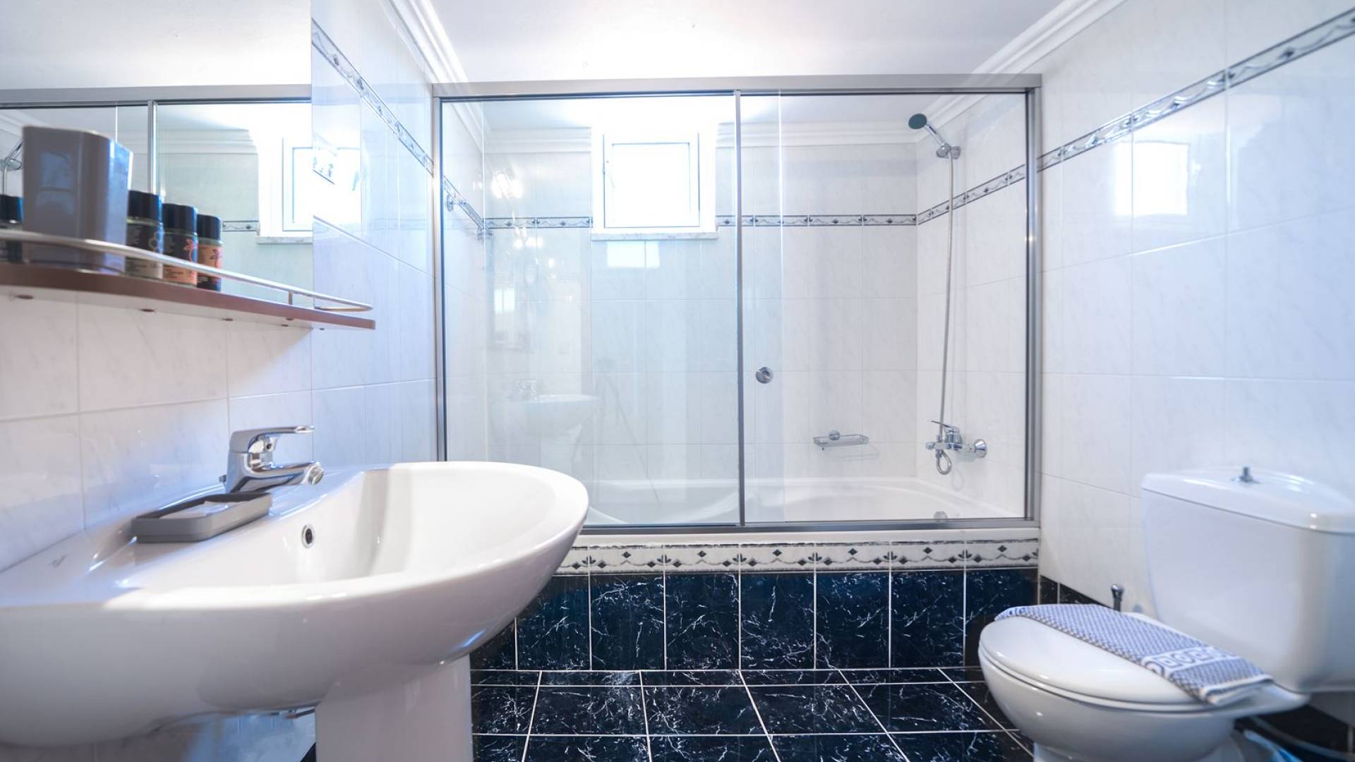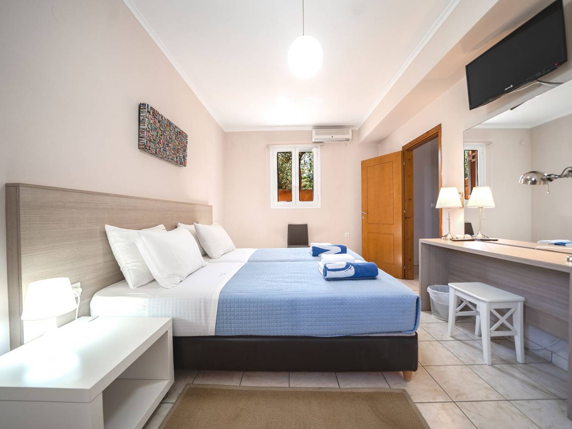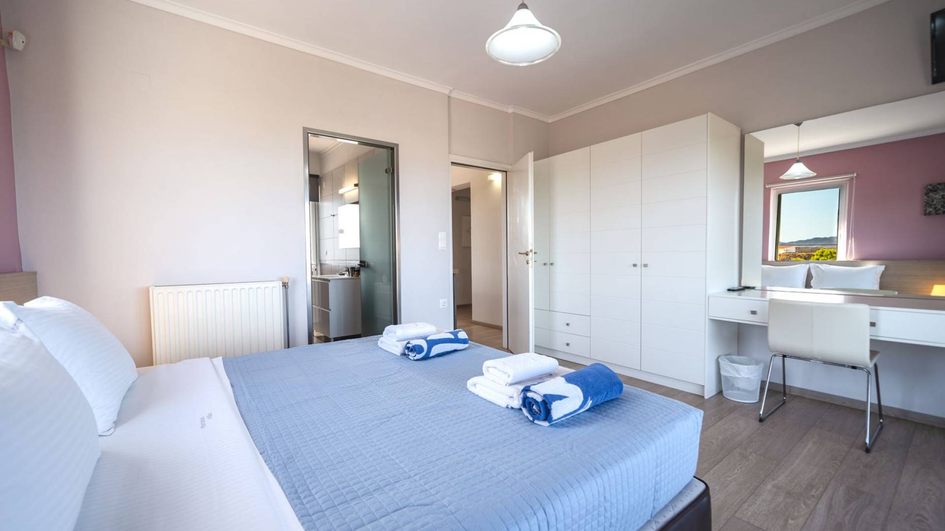 Al piano terra si trovano 3 camere da letto, una con un grande letto matrimoniale e due con 2 letti singoli ciascuna, 1 bagno con vasca e 1 WC con doccia, soggiorno e zona pranzo, ufficio trasformato in matrimoniale camera da letto, cucina completamente attrezzata, guardaroba e lavanderia. Tutte le camere sono dotate di aria condizionata e TV a schermo piatto. Al primo piano si trovano 1 ampio soggiorno e sala da pranzo con TV satellitare 42'', una seconda cucina completamente attrezzata, uno studio che si trasforma in una camera matrimoniale e 1 WC ospiti con doccia. Ci sono anche bellissime verande e balconi che offrono magnifiche viste sul mare. Al secondo piano ci sono altre tre camere da letto, una matrimoniale con letto king-size e bagno privato con vasca idromassaggio e balcone vista mare, un'altra camera matrimoniale e una con due letti singoli. C'è anche un altro bagno con vasca a questo livello.