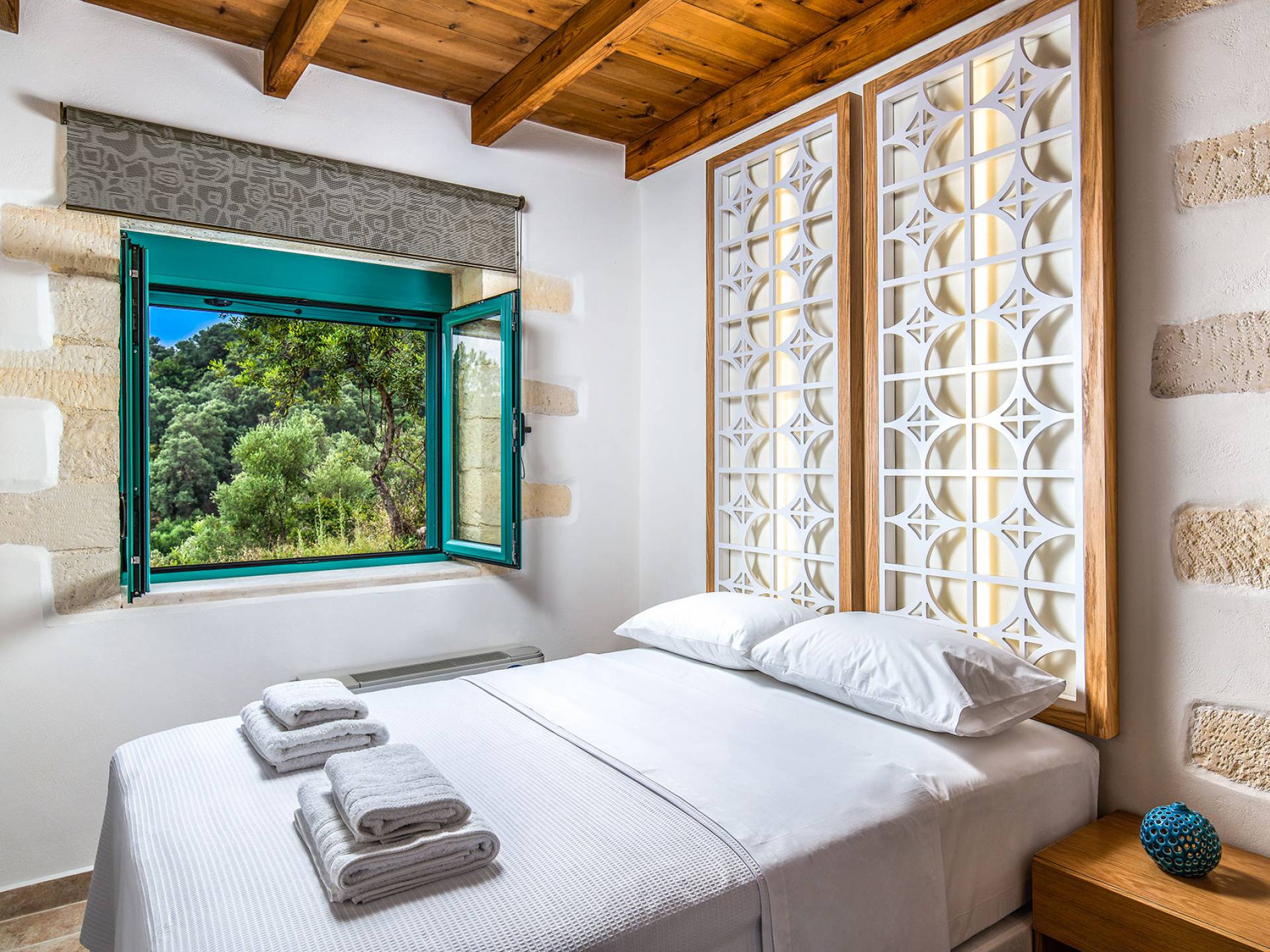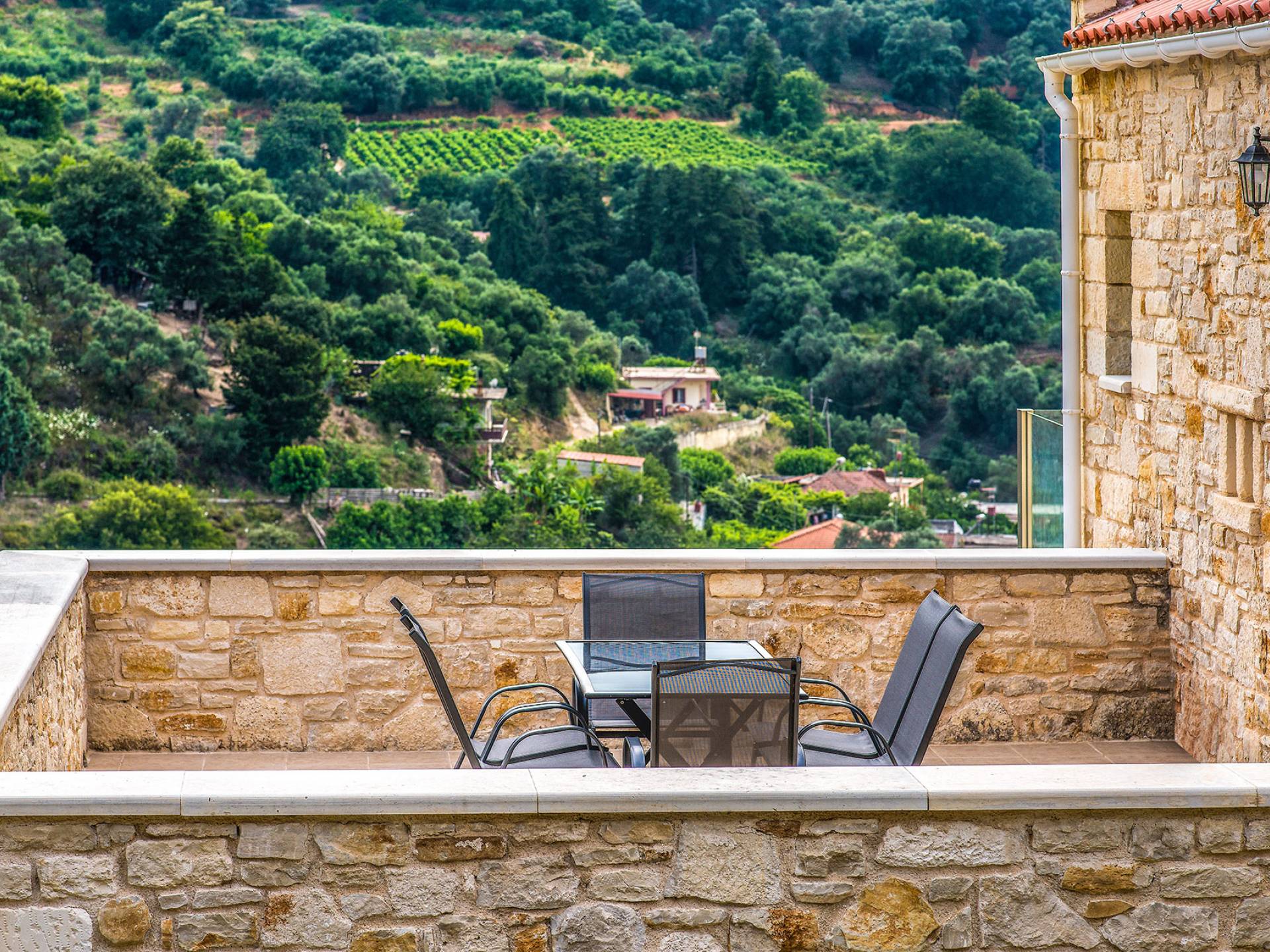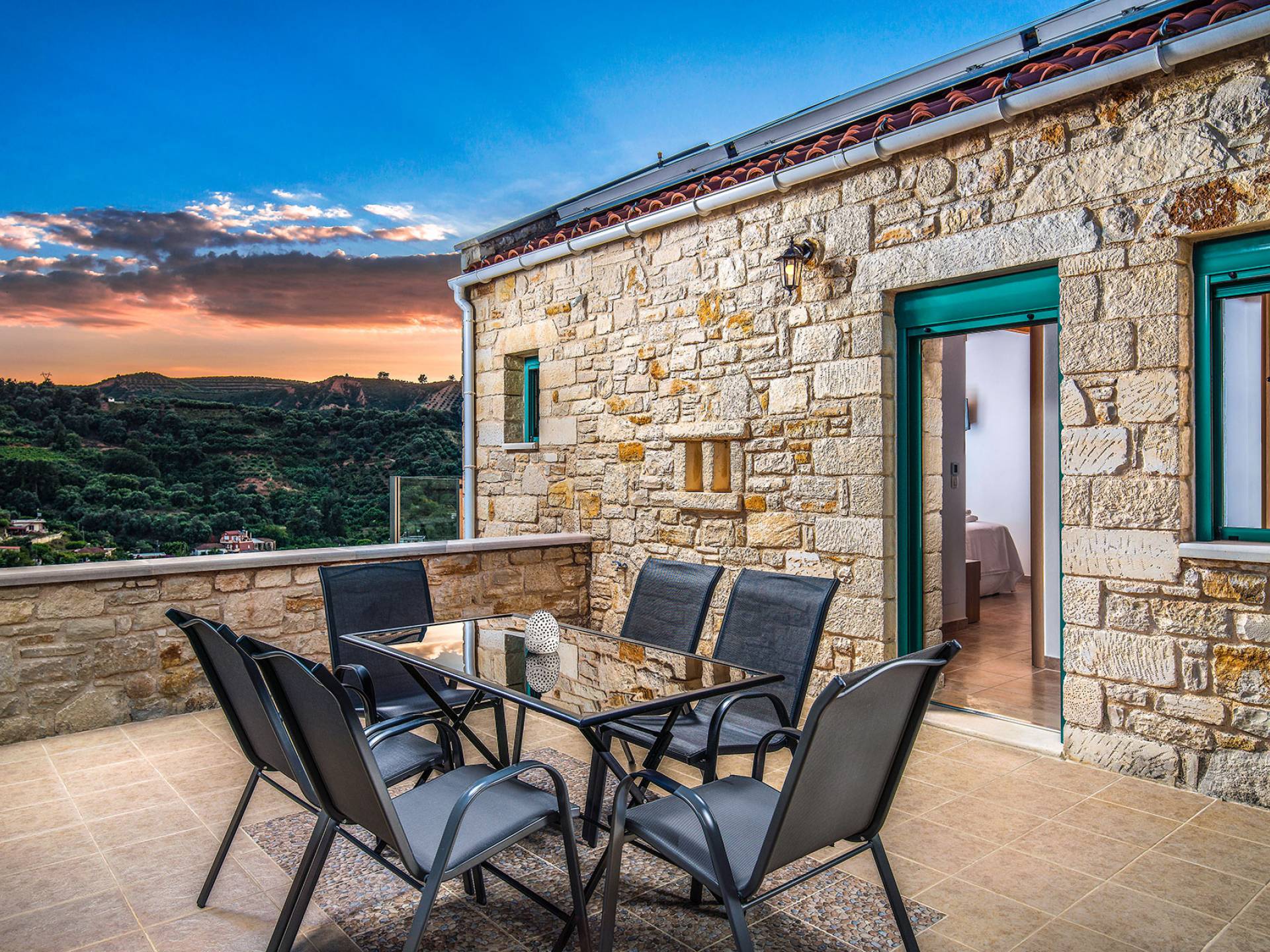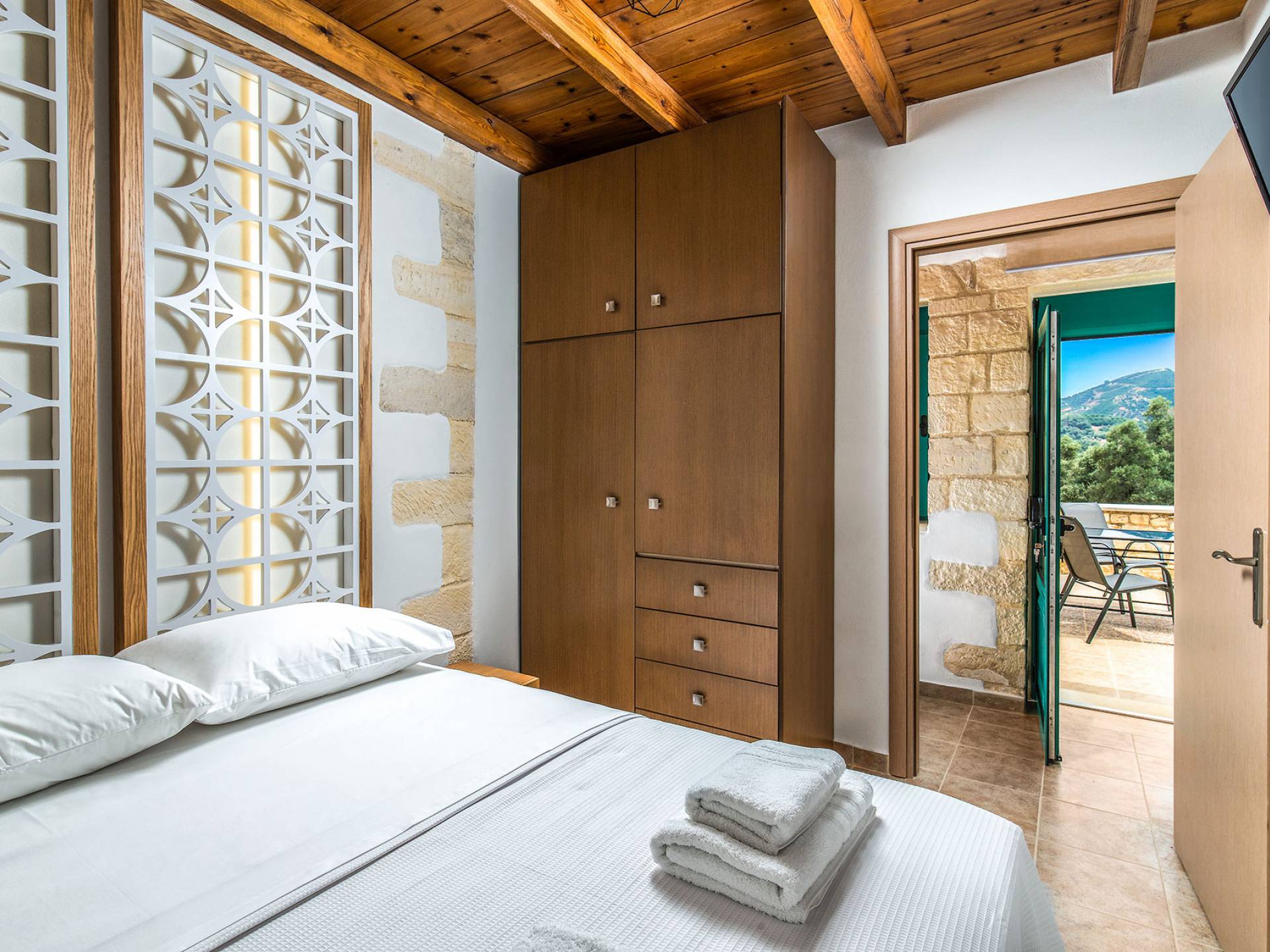 Al primo piano ci sono due camere da letto di cui una con balcone con vista panoramica sul paese e sulle montagne fangose oltre ad una matrimoniale con possibilità di separarla in due singole. L'altra camera da letto ha un letto matrimoniale e una grande finestra anch'essa con vista mozzafiato sulla natura rilassante. Entrambe le camere sono dotate di TV. Al primo piano c'è anche un ampio bagno con vasca e lavatrice. C'è anche un'ampia veranda con zona pranzo all'aperto e una magnifica vista. Piedra Villa Chania dispone anche di una piscina privata di 25 m² con una confortevole area salotto con ombrelloni, lettini e barbecue. L'aria condizionata della villa è quella più moderna e c'è anche la connessione Wi-Fi veloce e gratuita. La villa è ideale per vacanze tranquille e rilassanti vicino alla spiaggia e a tutti i servizi.