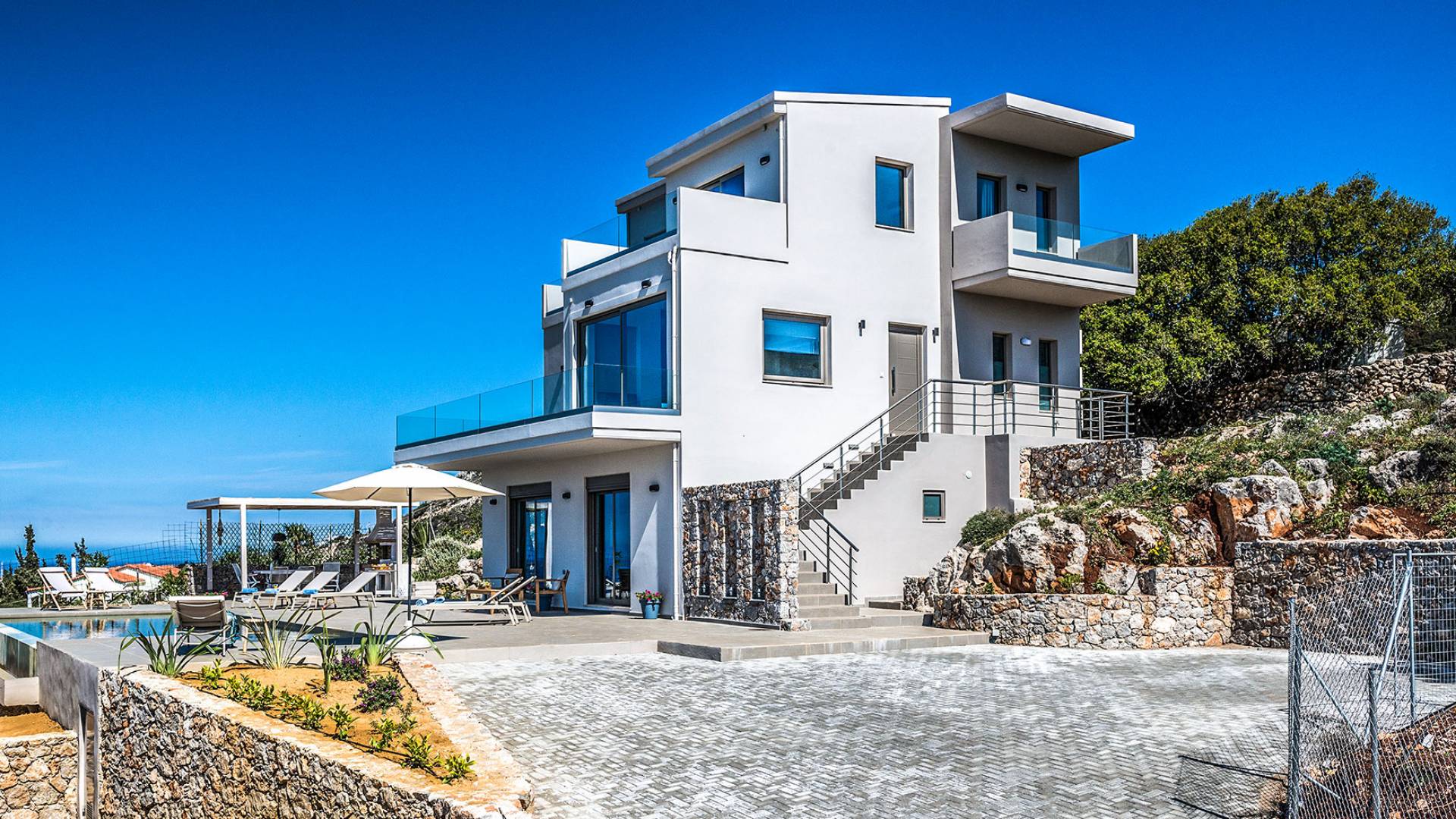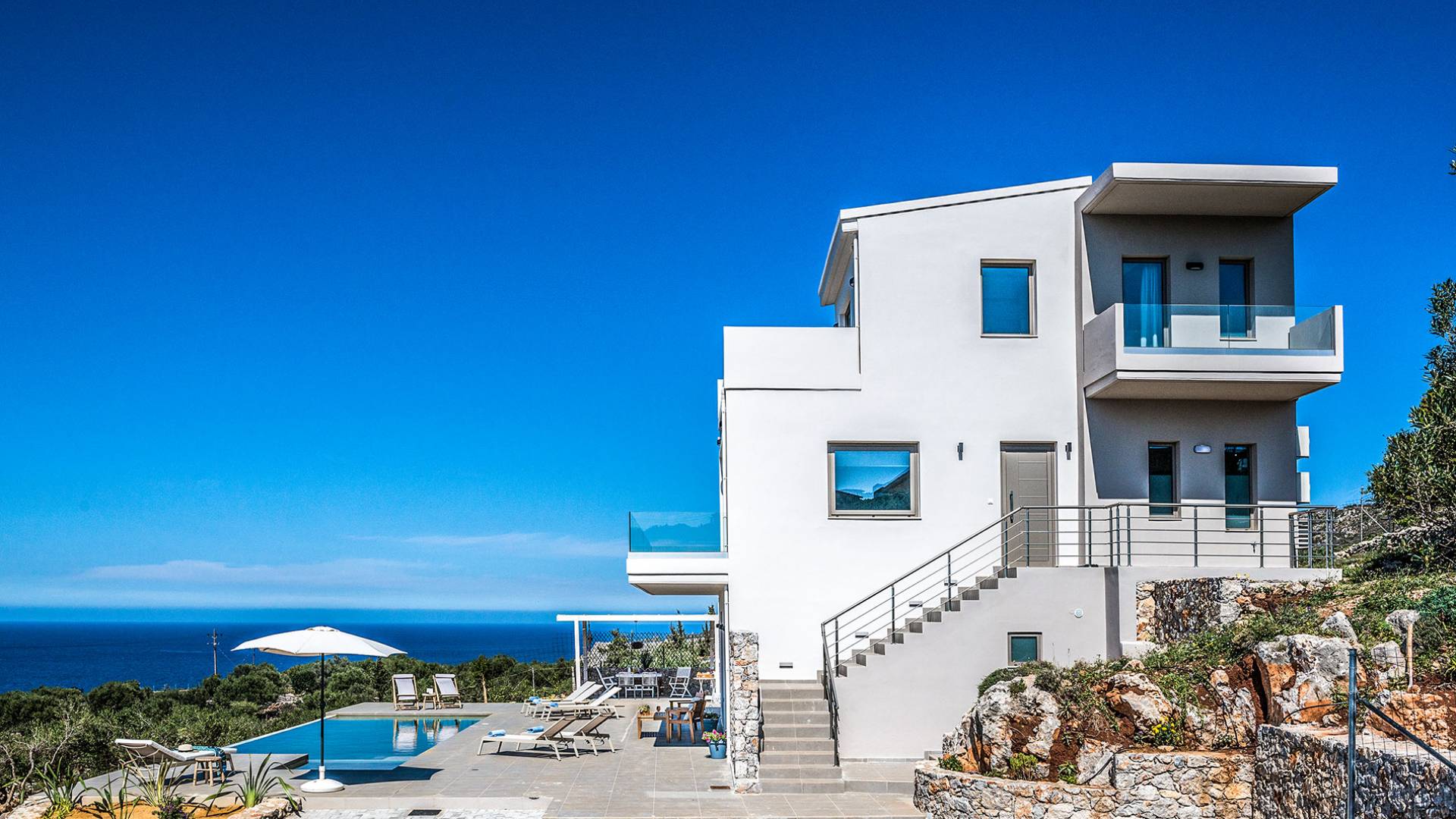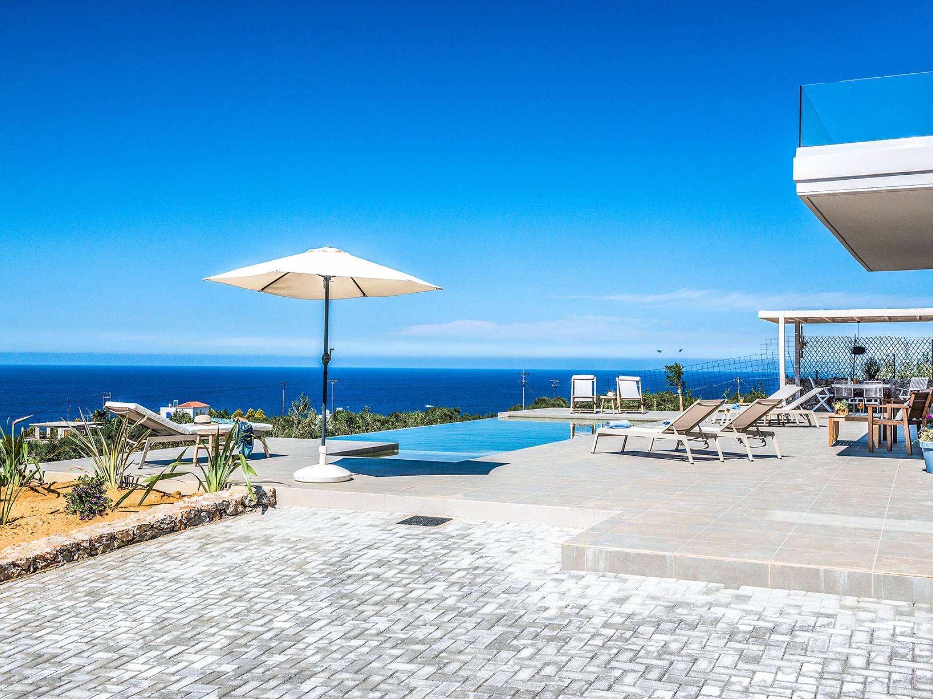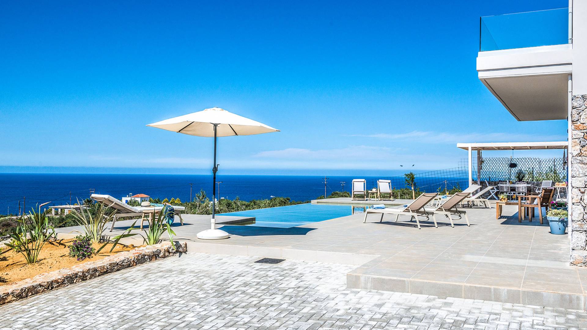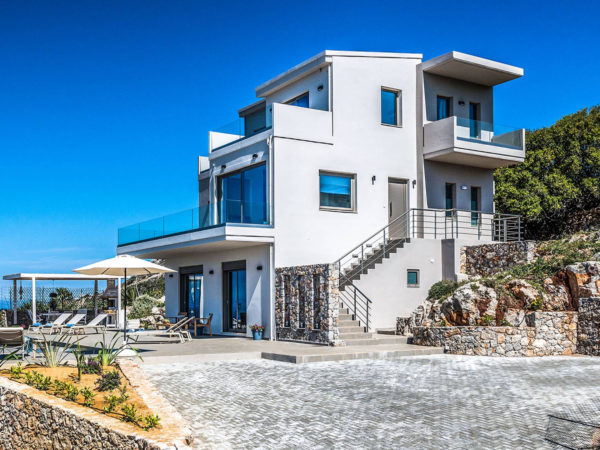 On the first floor, there is a living room with a fully-equipped kitchen & dining area (seats 8-10), a large terrace with a dining /sitting set, and stunning sea, mountain, and sunset views. Also one bedroom with twin beds (convertible into a 1.70 m) and a private balcony with a sitting set and sea view, a bathroom with shower and bath and a guest WC, On the upper floor, there are two large bedrooms with 1.60 beds and an en-suite bathroom room, large window doors open to a private balcony with sitting set, a large terrace with sun loungers which allows you to stare at the magnificent view and the green of the thymes and olive trees. Outdoors there is a private infinity pool with a children’s area, sunloungers, umbrellas, a wooden pergola with a curler that leaves sunless shadows to the dining area which has a built-in charcoal BBQ and sink. A rocky garden, diligently untidy by wild shrubs, unites the house with the scenery, the sea, and the sunset.
