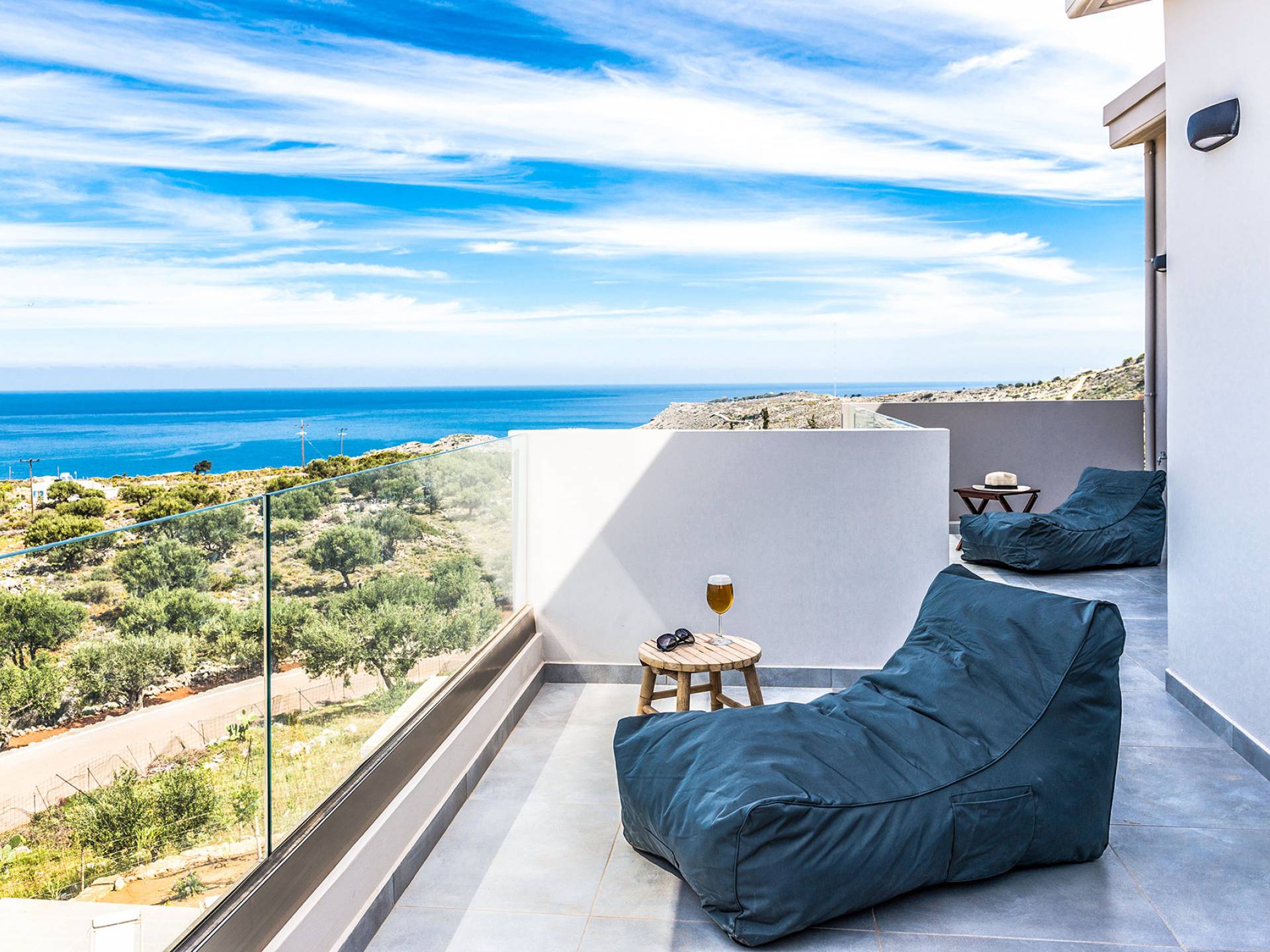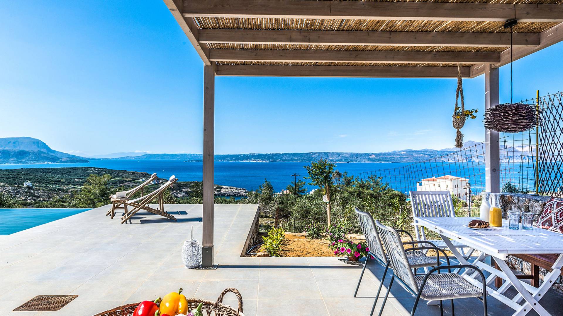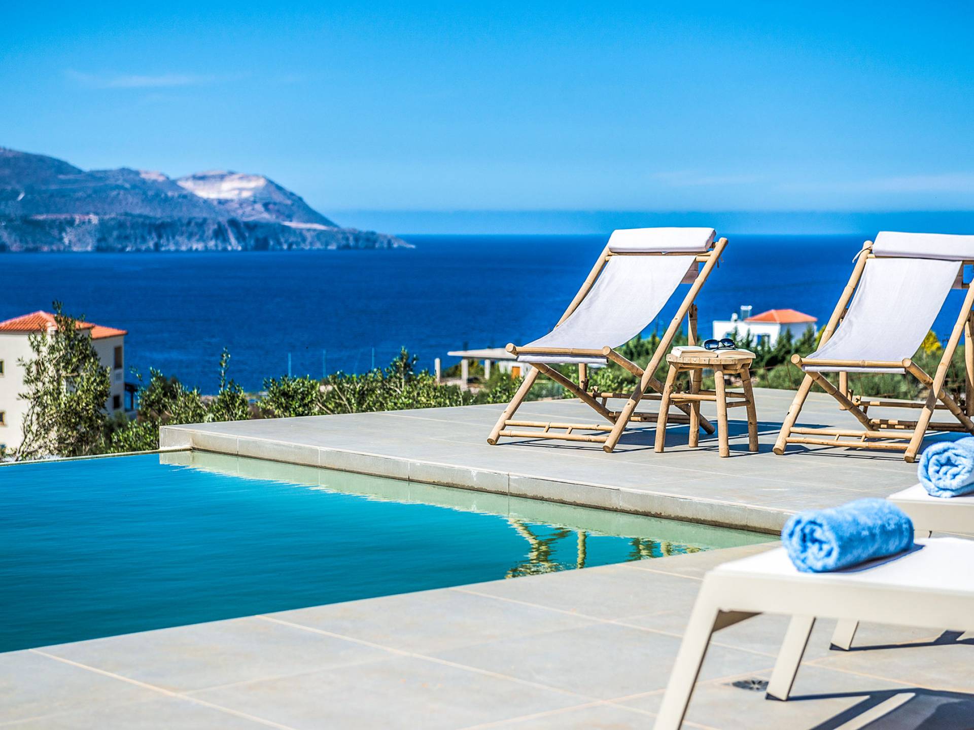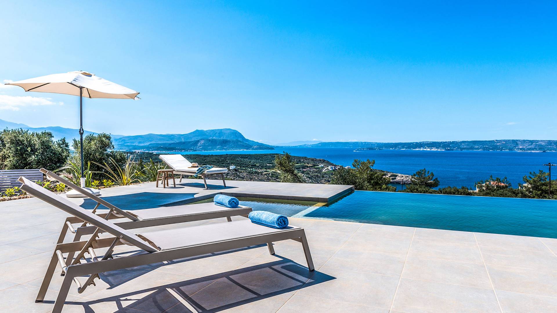 On the first floor, there is a living room with a fully-equipped kitchen & dining area (seats 8-10), a large terrace with a dining /sitting set, and stunning sea, mountain, and sunset views. Also one bedroom with twin beds (convertible into a 1.70 m) and a private balcony with a sitting set and sea view, a bathroom with shower and bath and a guest WC, On the upper floor, there are two large bedrooms with 1.60 beds and an en-suite bathroom room, large window doors open to a private balcony with sitting set, a large terrace with sun loungers which allows you to stare at the magnificent view and the green of the thymes and olive trees. Outdoors there is a private infinity pool with a children’s area, sunloungers, umbrellas, a wooden pergola with a curler that leaves sunless shadows to the dining area which has a built-in charcoal BBQ and sink. A rocky garden, diligently untidy by wild shrubs, unites the house with the scenery, the sea, and the sunset.