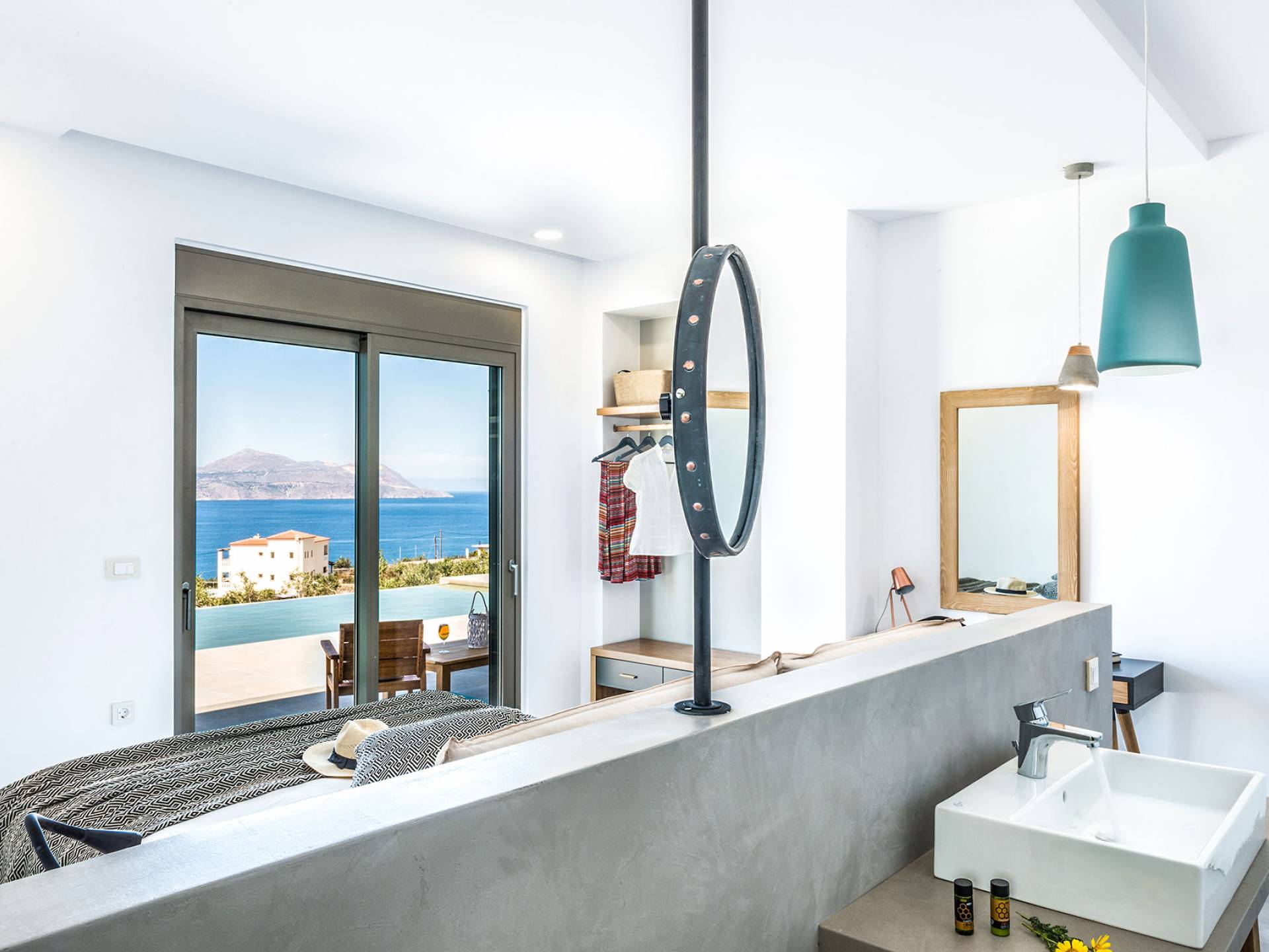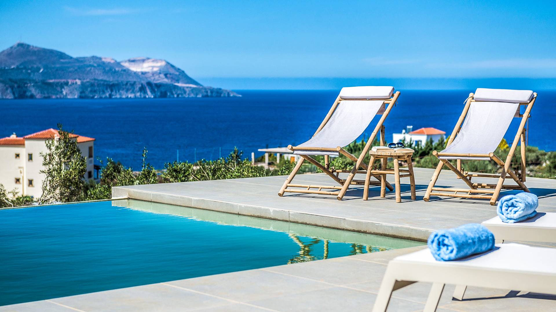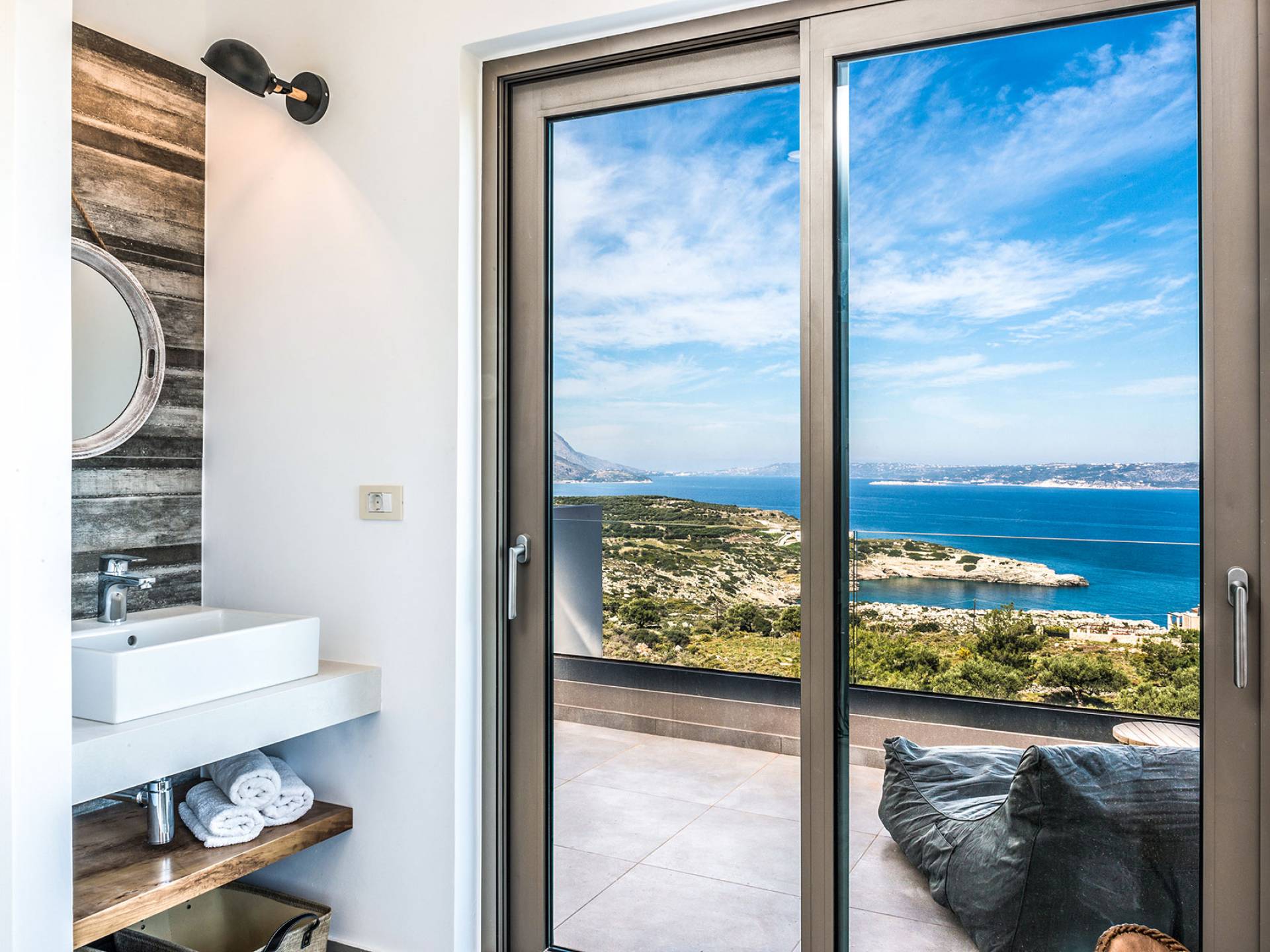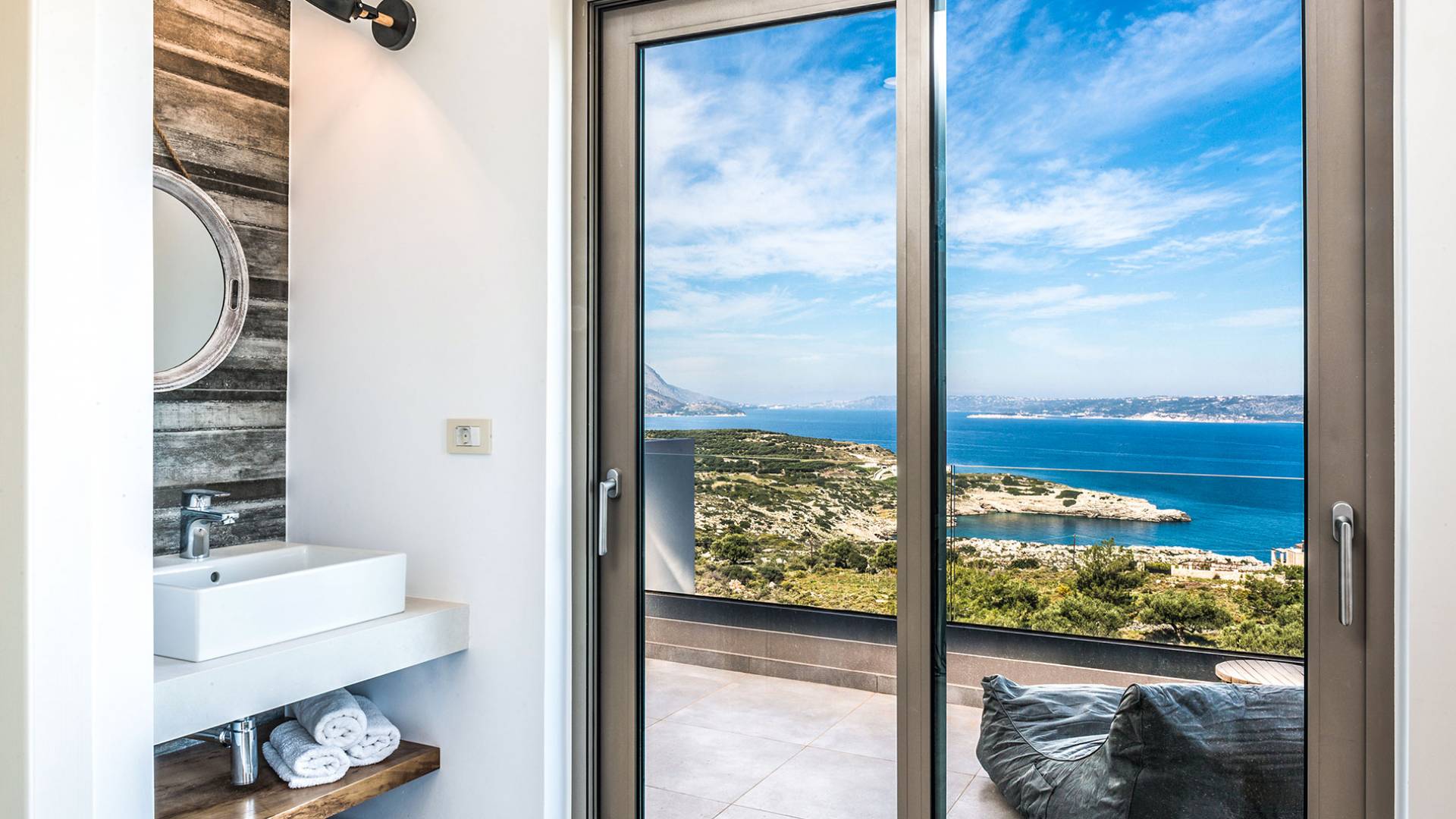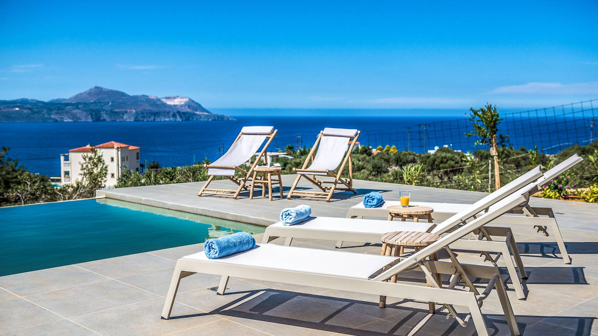 On the first floor, there is a living room with a fully-equipped kitchen & dining area (seats 8-10), a large terrace with a dining /sitting set, and stunning sea, mountain, and sunset views. Also one bedroom with twin beds (convertible into a 1.70 m) and a private balcony with a sitting set and sea view, a bathroom with shower and bath and a guest WC, On the upper floor, there are two large bedrooms with 1.60 beds and an en-suite bathroom room, large window doors open to a private balcony with sitting set, a large terrace with sun loungers which allows you to stare at the magnificent view and the green of the thymes and olive trees. Outdoors there is a private infinity pool with a children’s area, sunloungers, umbrellas, a wooden pergola with a curler that leaves sunless shadows to the dining area which has a built-in charcoal BBQ and sink. A rocky garden, diligently untidy by wild shrubs, unites the house with the scenery, the sea, and the sunset.