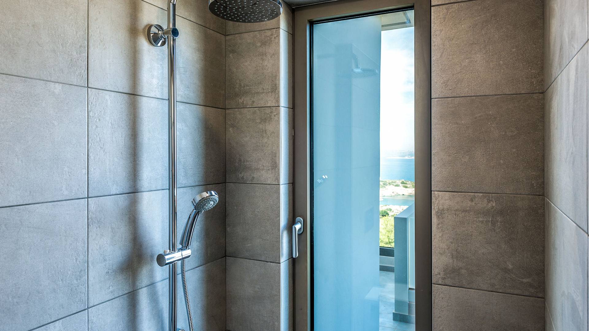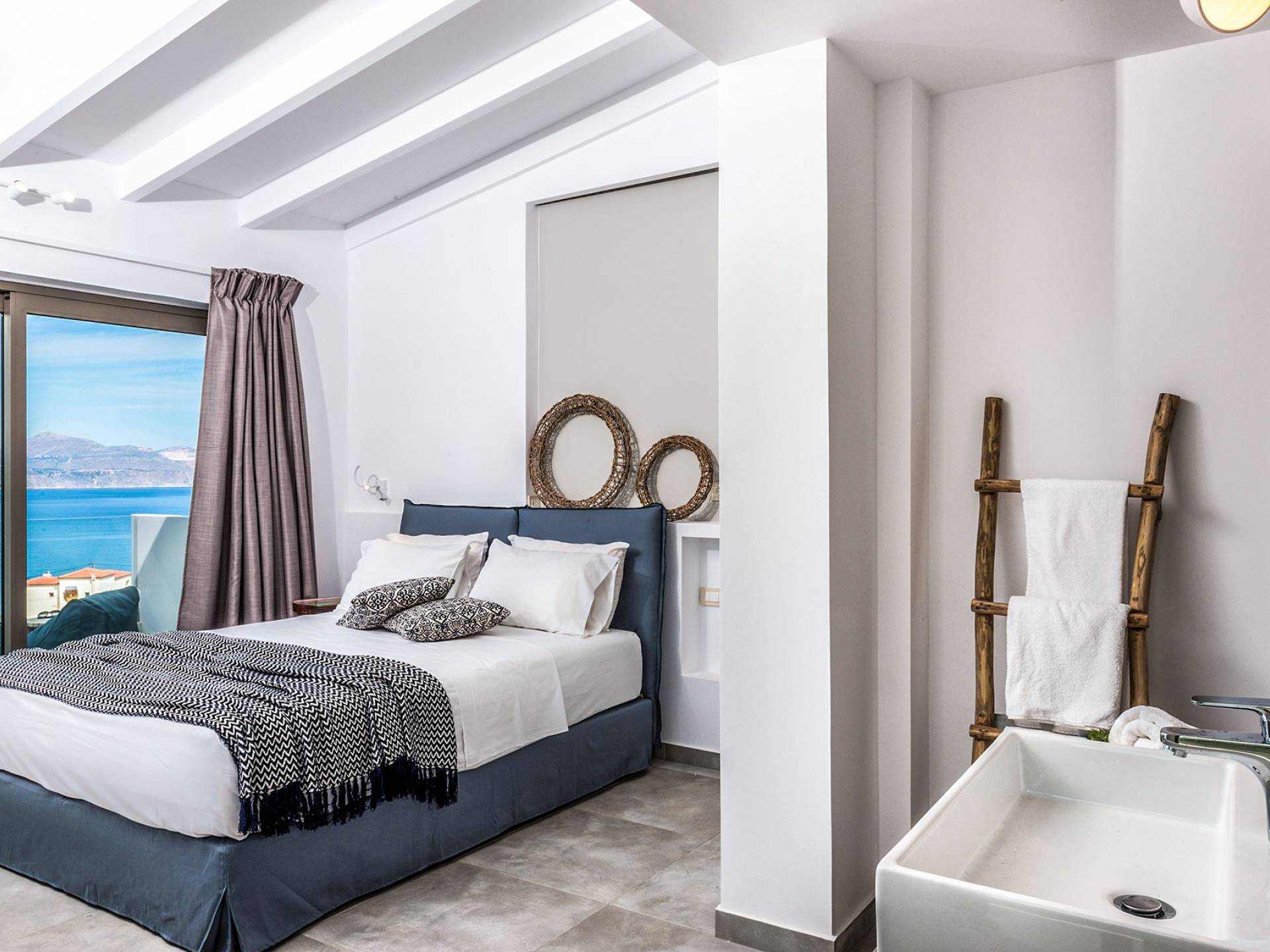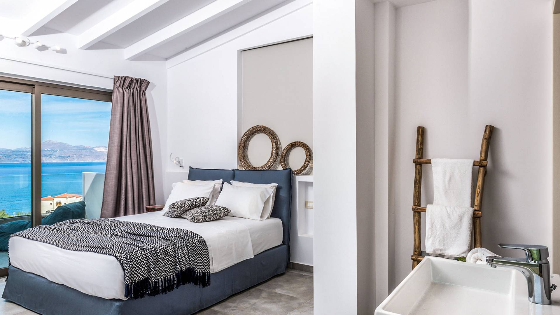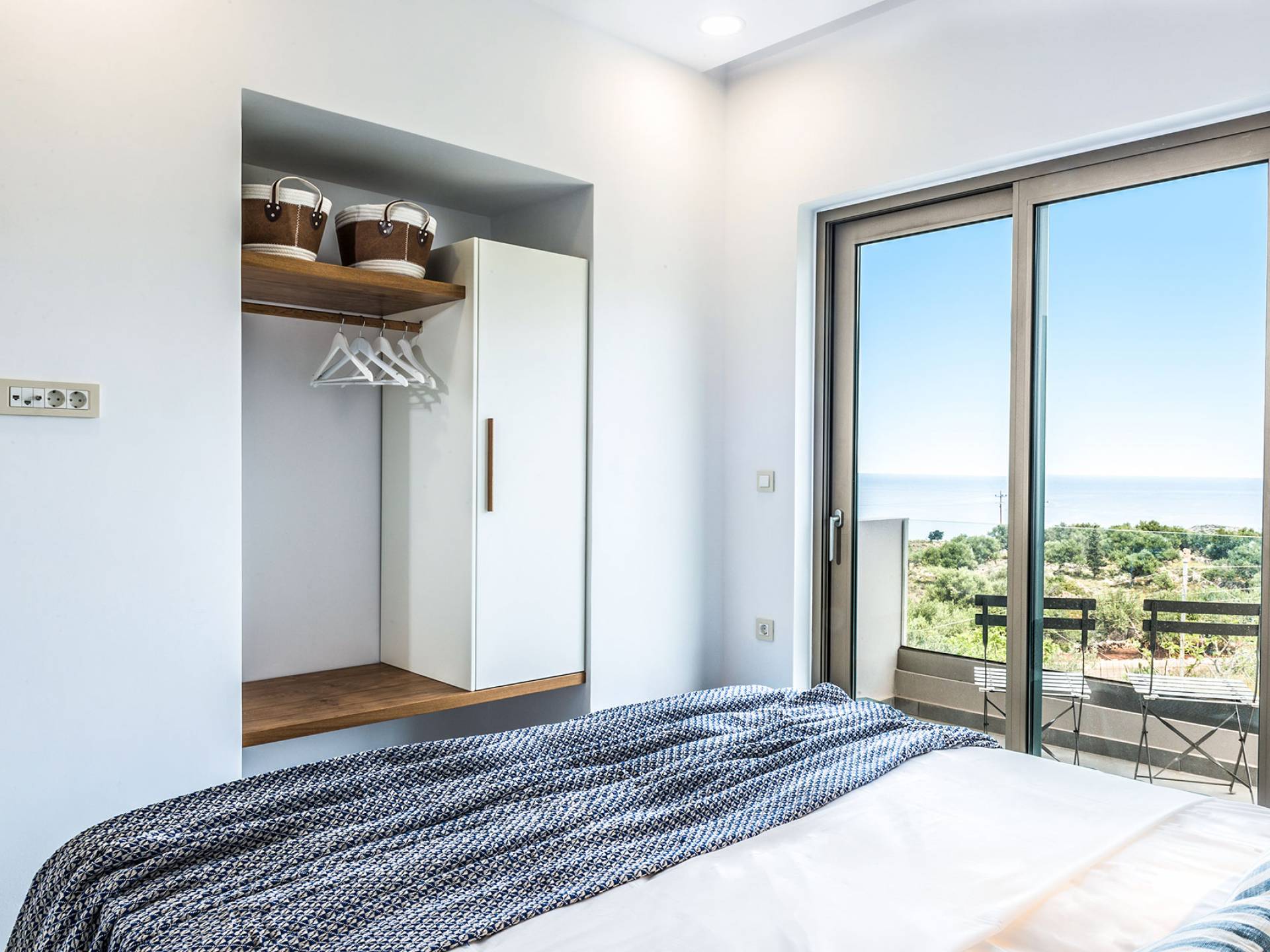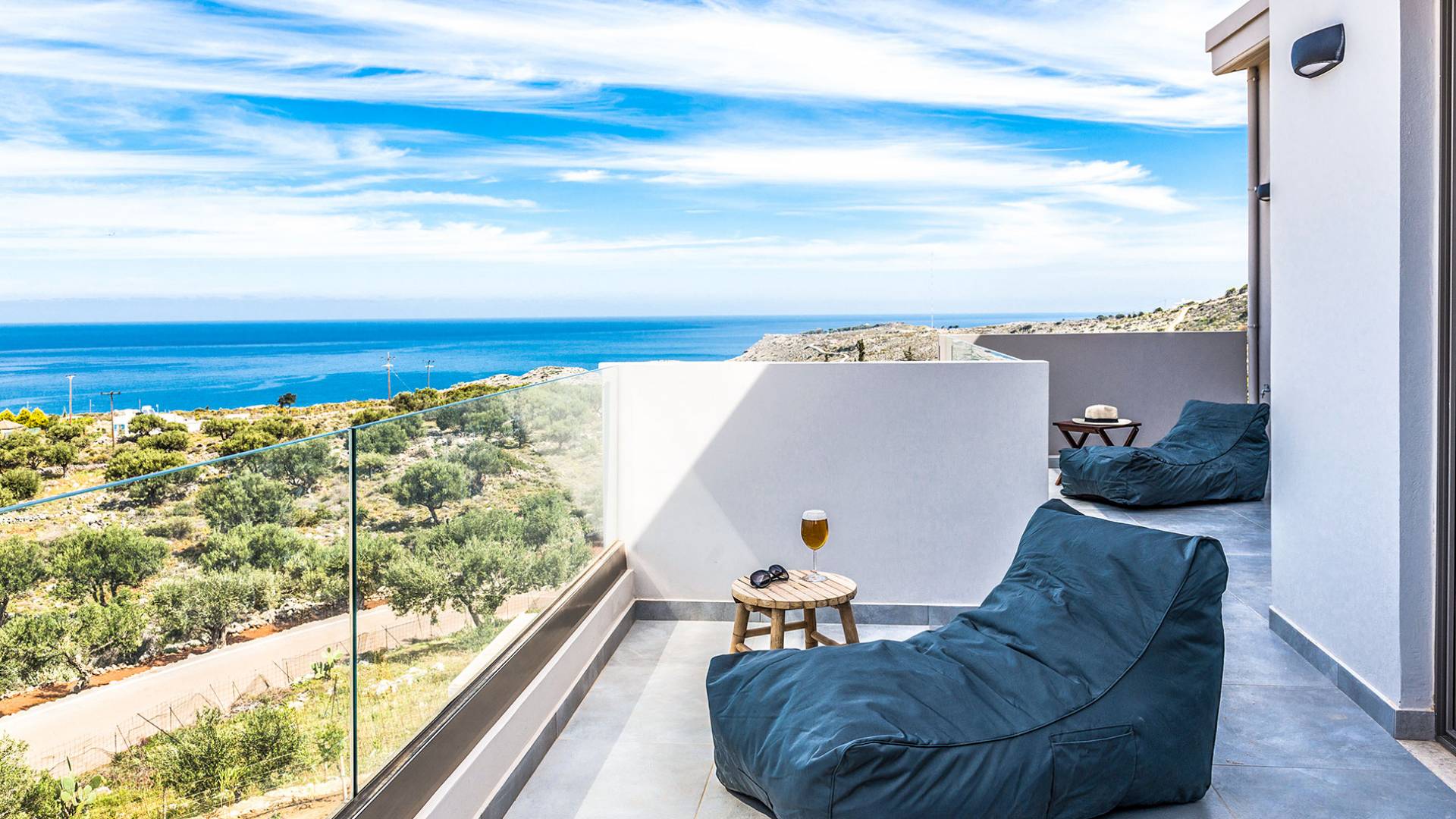 On the first floor, there is a living room with a fully-equipped kitchen & dining area (seats 8-10), a large terrace with a dining /sitting set, and stunning sea, mountain, and sunset views. Also one bedroom with twin beds (convertible into a 1.70 m) and a private balcony with a sitting set and sea view, a bathroom with shower and bath and a guest WC, On the upper floor, there are two large bedrooms with 1.60 beds and an en-suite bathroom room, large window doors open to a private balcony with sitting set, a large terrace with sun loungers which allows you to stare at the magnificent view and the green of the thymes and olive trees. Outdoors there is a private infinity pool with a children’s area, sunloungers, umbrellas, a wooden pergola with a curler that leaves sunless shadows to the dining area which has a built-in charcoal BBQ and sink. A rocky garden, diligently untidy by wild shrubs, unites the house with the scenery, the sea, and the sunset.