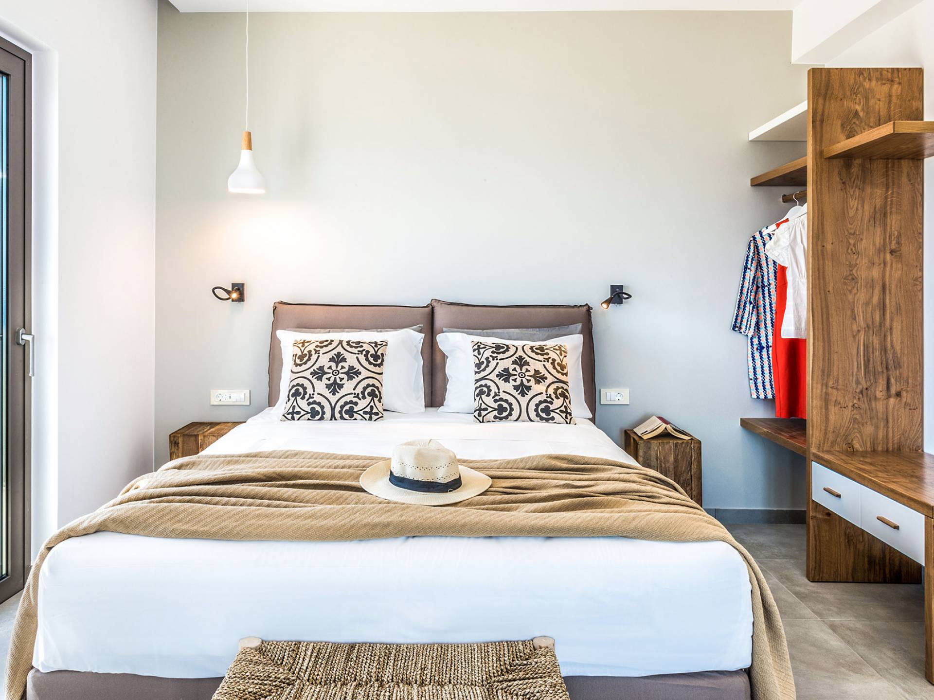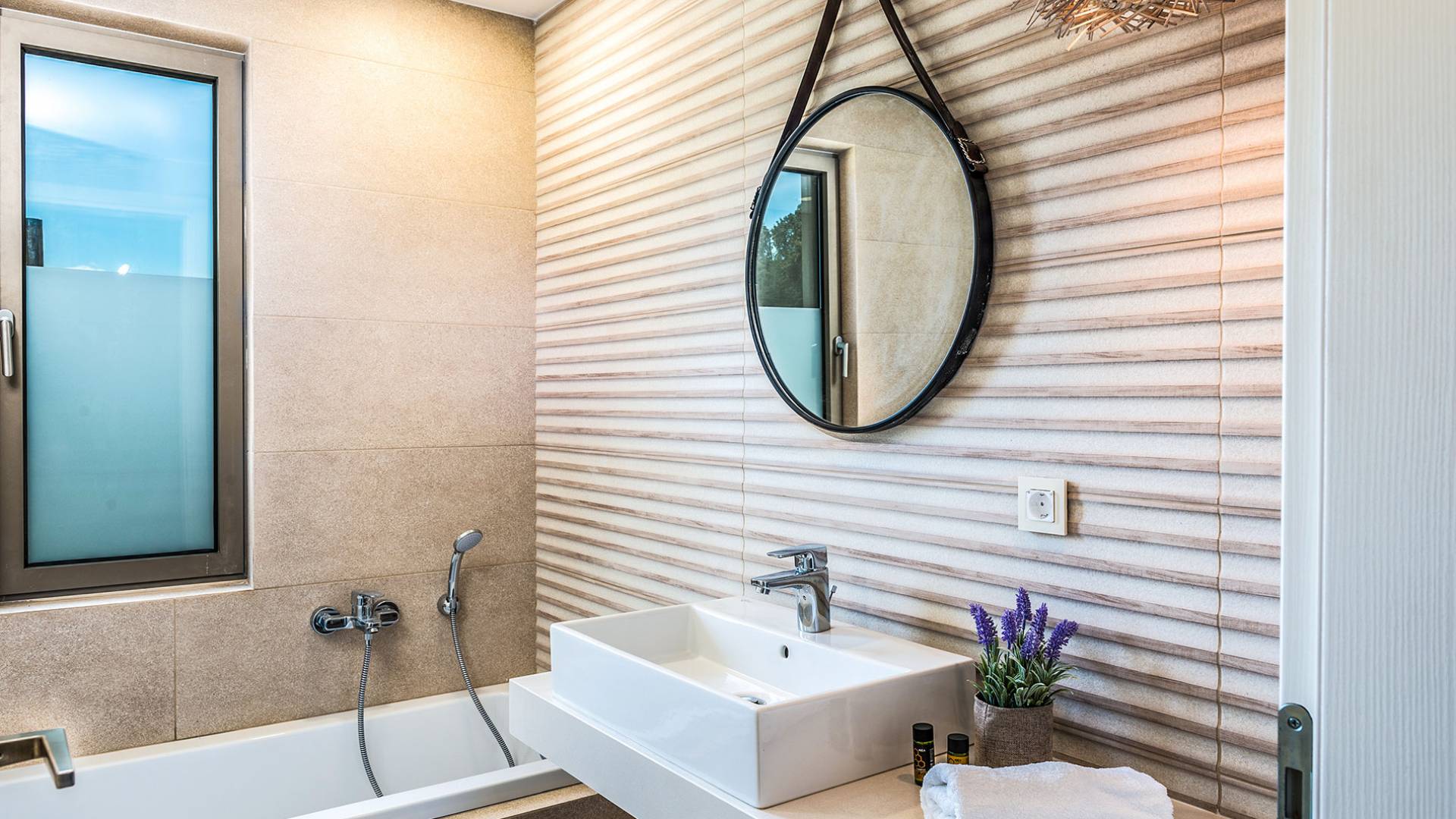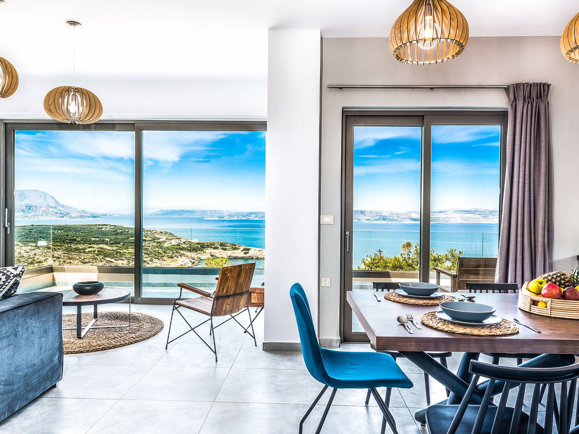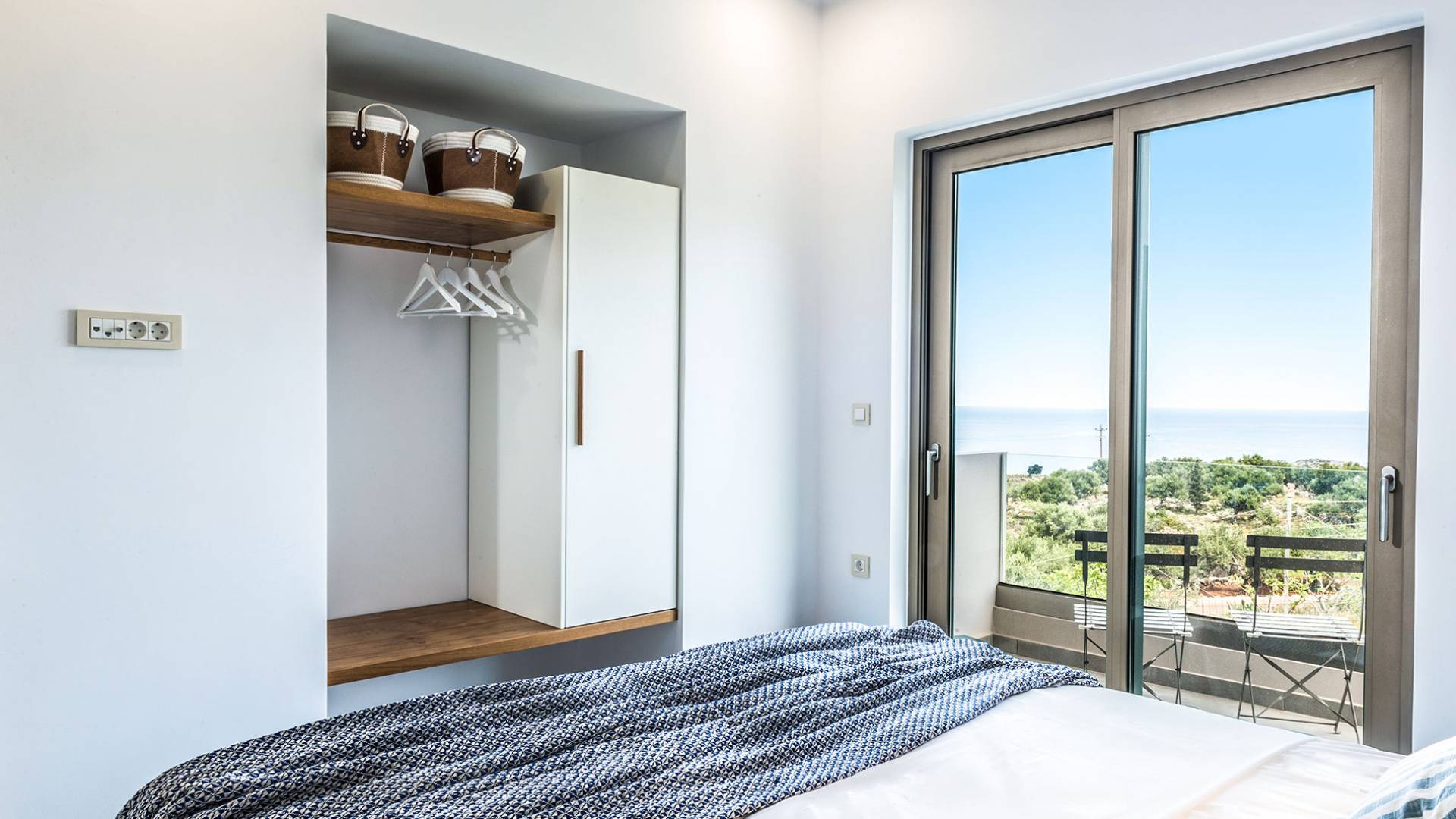 On the first floor, there is a living room with a fully-equipped kitchen & dining area (seats 8-10), a large terrace with a dining /sitting set, and stunning sea, mountain, and sunset views. Also one bedroom with twin beds (convertible into a 1.70 m) and a private balcony with a sitting set and sea view, a bathroom with shower and bath and a guest WC, On the upper floor, there are two large bedrooms with 1.60 beds and an en-suite bathroom room, large window doors open to a private balcony with sitting set, a large terrace with sun loungers which allows you to stare at the magnificent view and the green of the thymes and olive trees. Outdoors there is a private infinity pool with a children’s area, sunloungers, umbrellas, a wooden pergola with a curler that leaves sunless shadows to the dining area which has a built-in charcoal BBQ and sink. A rocky garden, diligently untidy by wild shrubs, unites the house with the scenery, the sea, and the sunset.