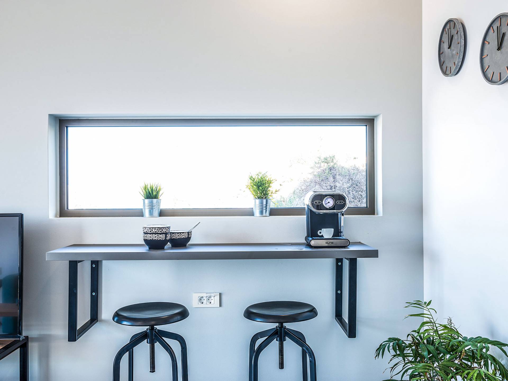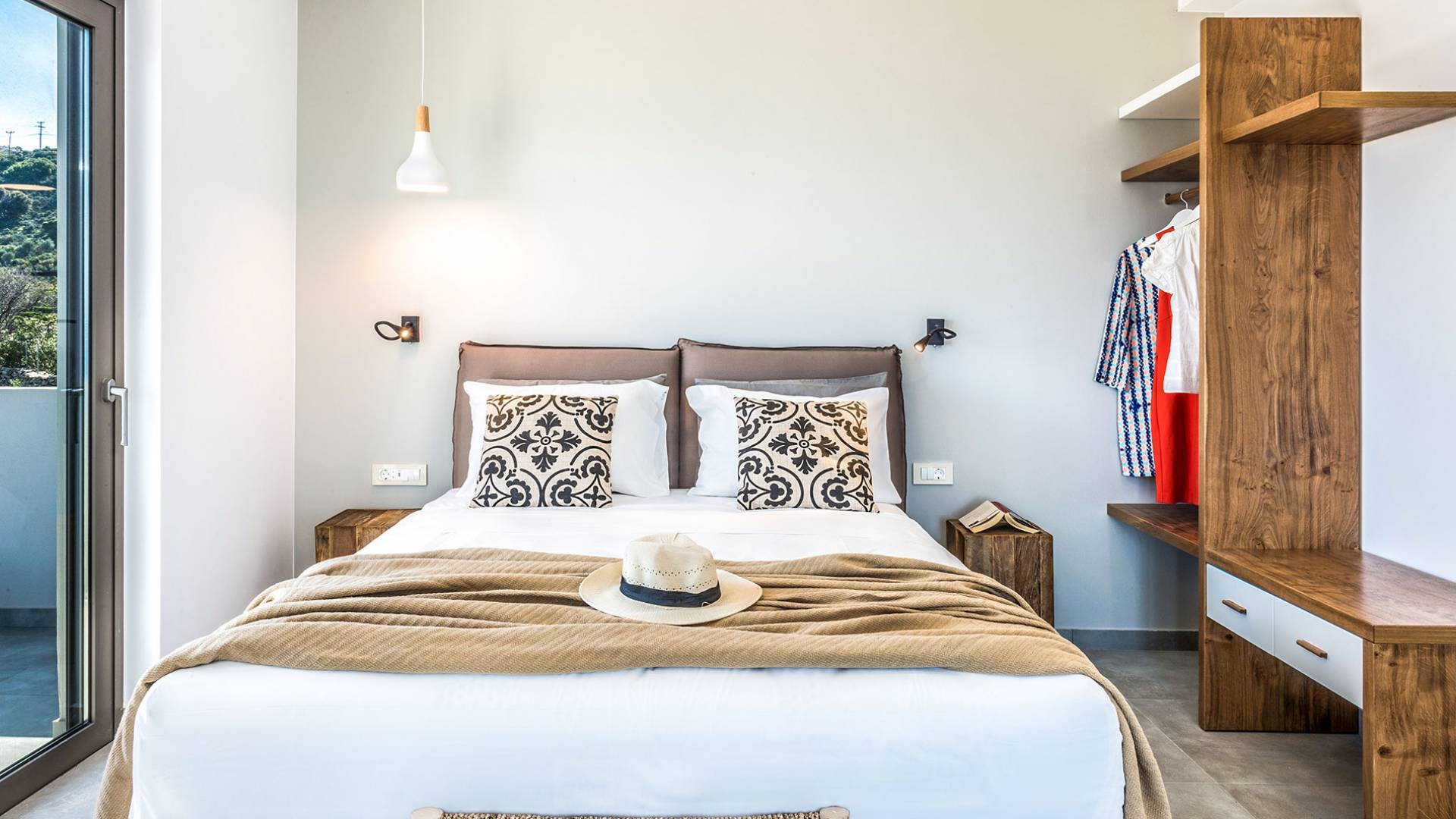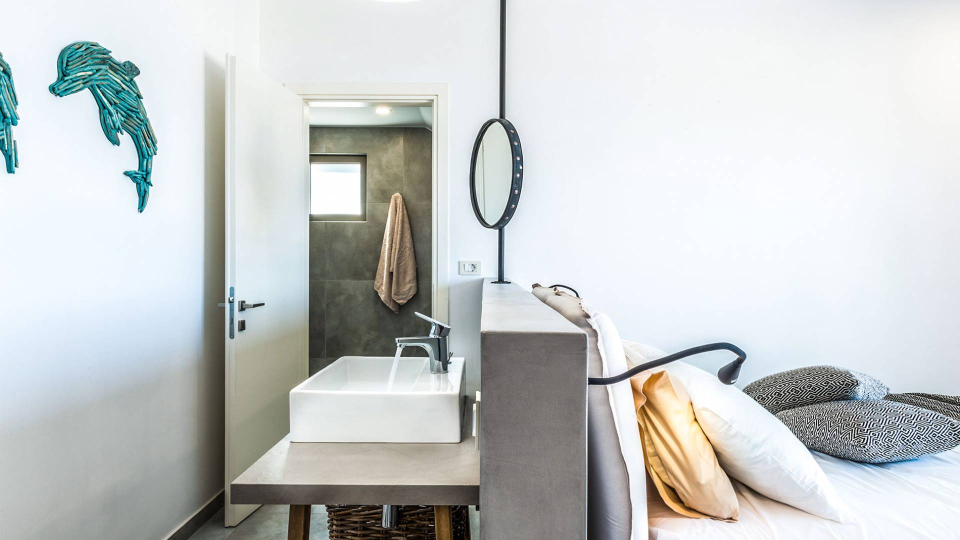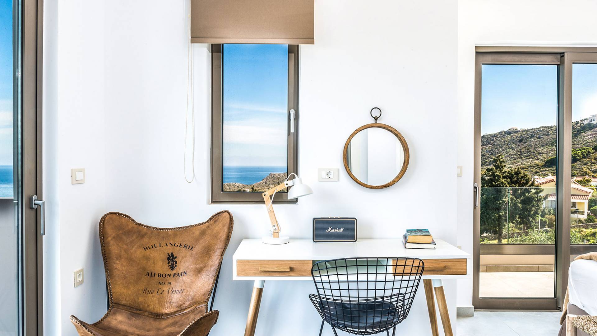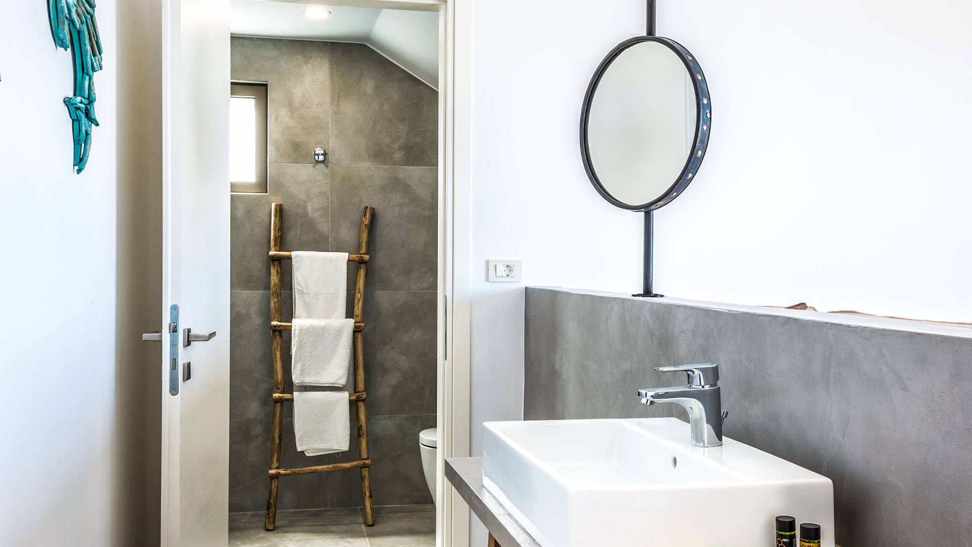 On the first floor, there is a living room with a fully-equipped kitchen & dining area (seats 8-10), a large terrace with a dining /sitting set, and stunning sea, mountain, and sunset views. Also one bedroom with twin beds (convertible into a 1.70 m) and a private balcony with a sitting set and sea view, a bathroom with shower and bath and a guest WC, On the upper floor, there are two large bedrooms with 1.60 beds and an en-suite bathroom room, large window doors open to a private balcony with sitting set, a large terrace with sun loungers which allows you to stare at the magnificent view and the green of the thymes and olive trees. Outdoors there is a private infinity pool with a children’s area, sunloungers, umbrellas, a wooden pergola with a curler that leaves sunless shadows to the dining area which has a built-in charcoal BBQ and sink. A rocky garden, diligently untidy by wild shrubs, unites the house with the scenery, the sea, and the sunset.