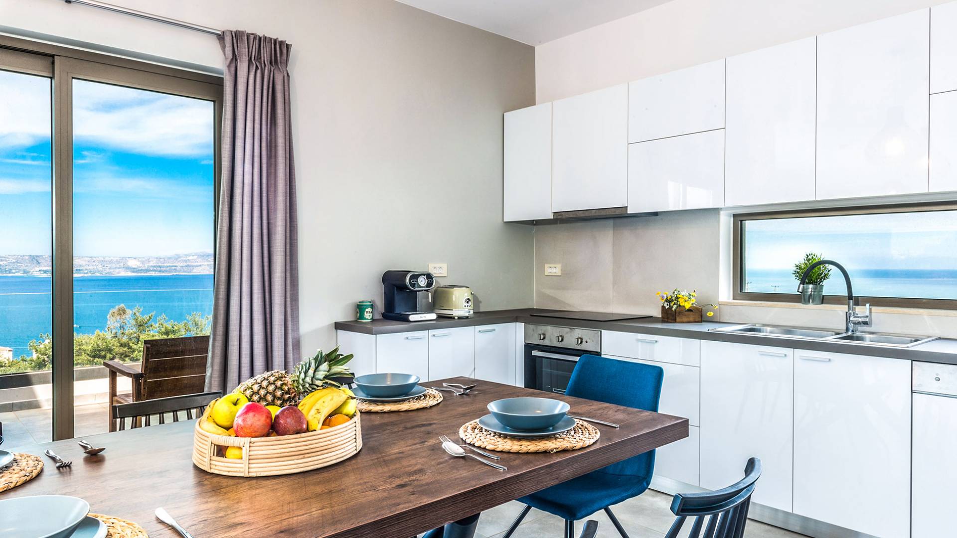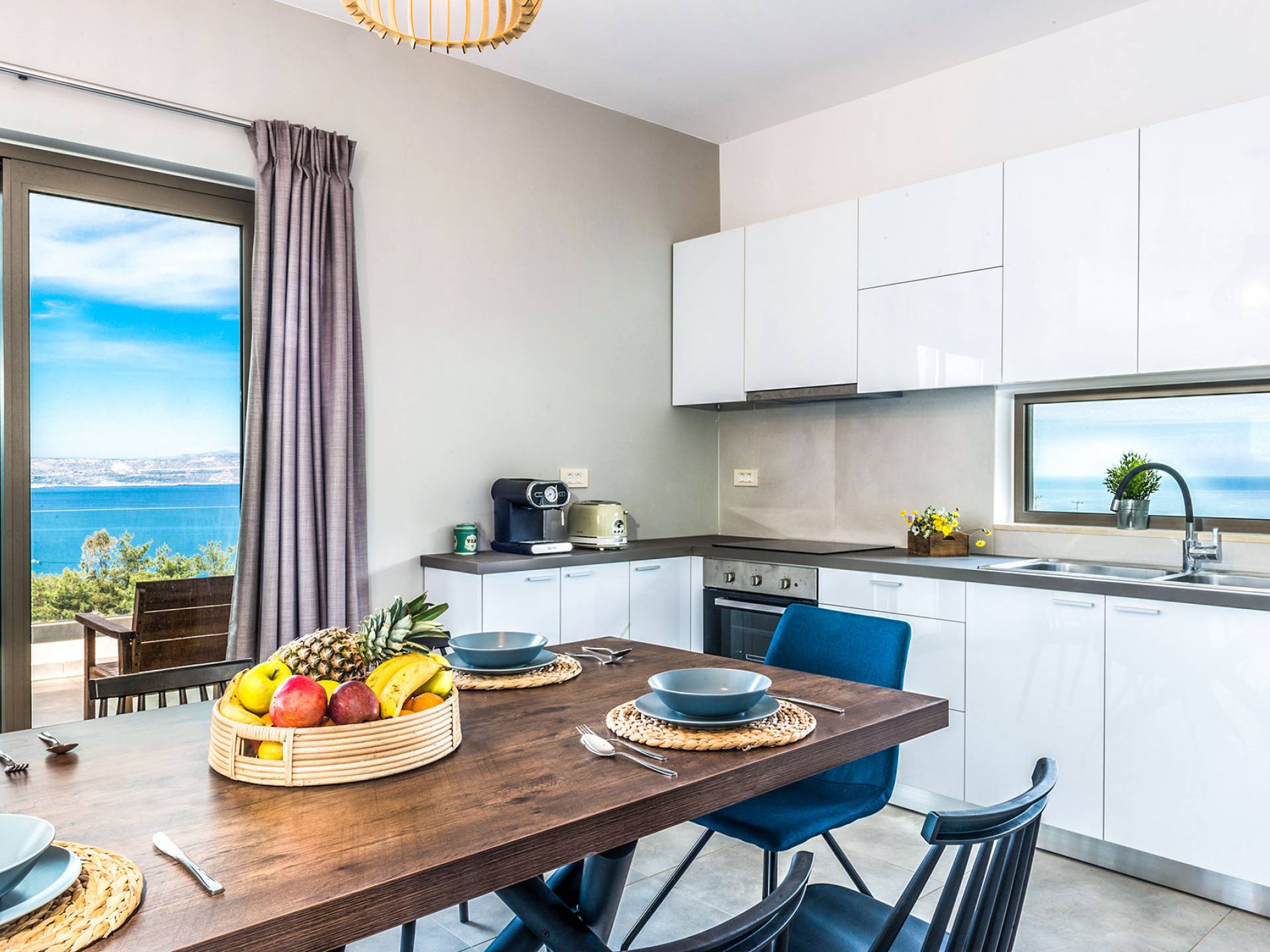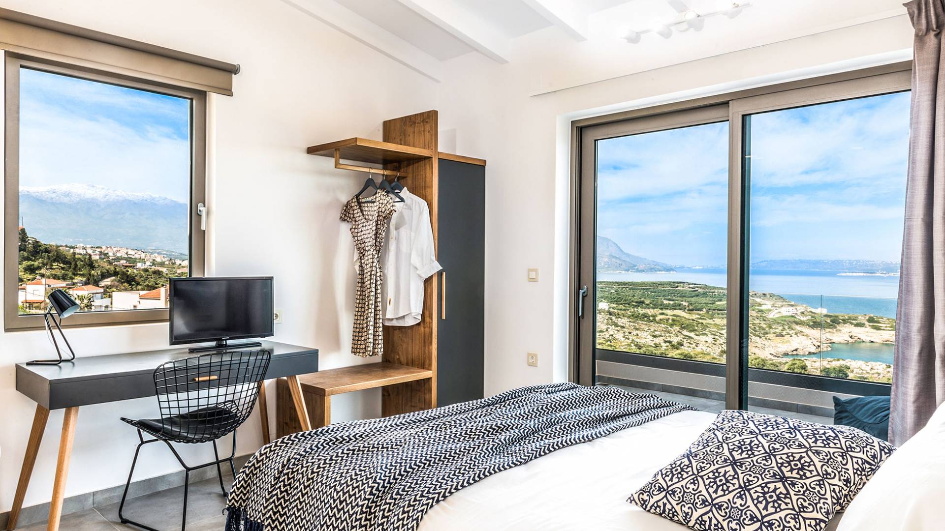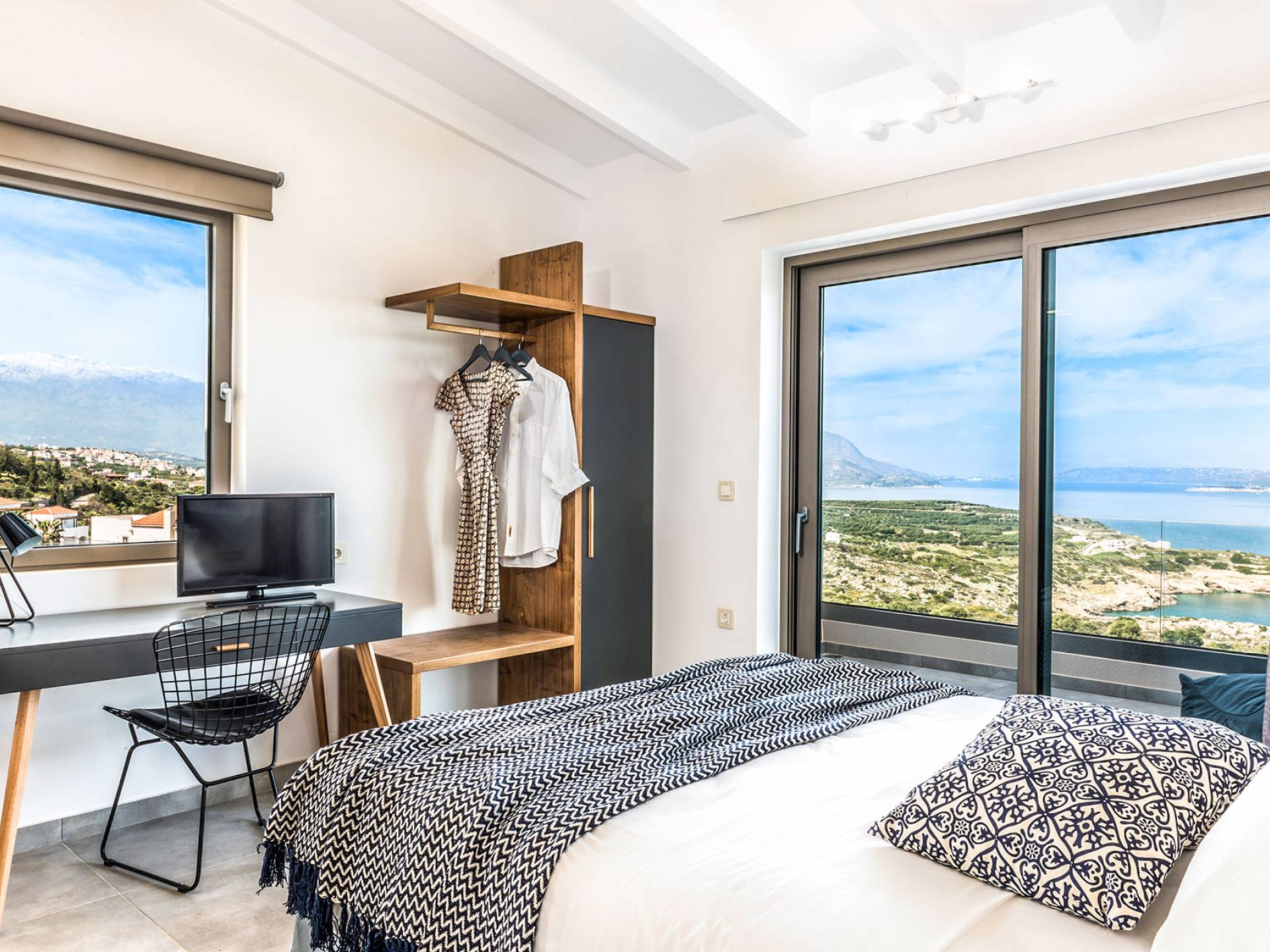 Ramino VIlla Chania with 5 bedrooms grows on three levels following the restless terrain of the land looking out over the spectacular view of Souda Bay leaving room for the spectacular views of the White Mountains. On the ground level, there is a living room with a fully-equipped kitchenette, one bedroom with a 1.60m bed and en-suite bathroom with shower, another bedroom with twin beds convert to 1.70 m bed, and a guest bathroom with shower. Also, there is a separate utility room with a washing machine, dryer, ironing board, and iron.