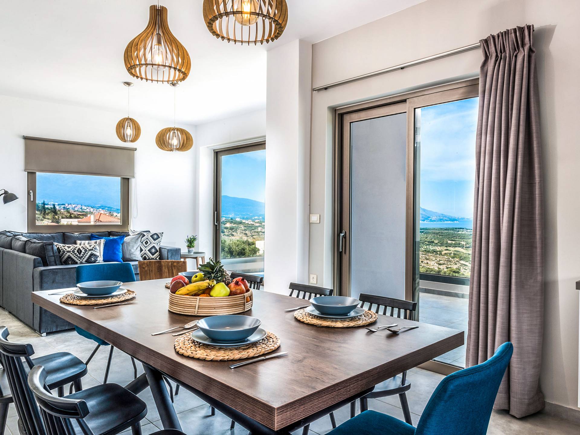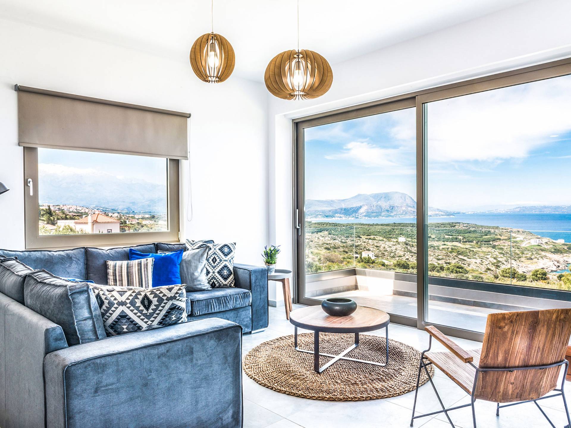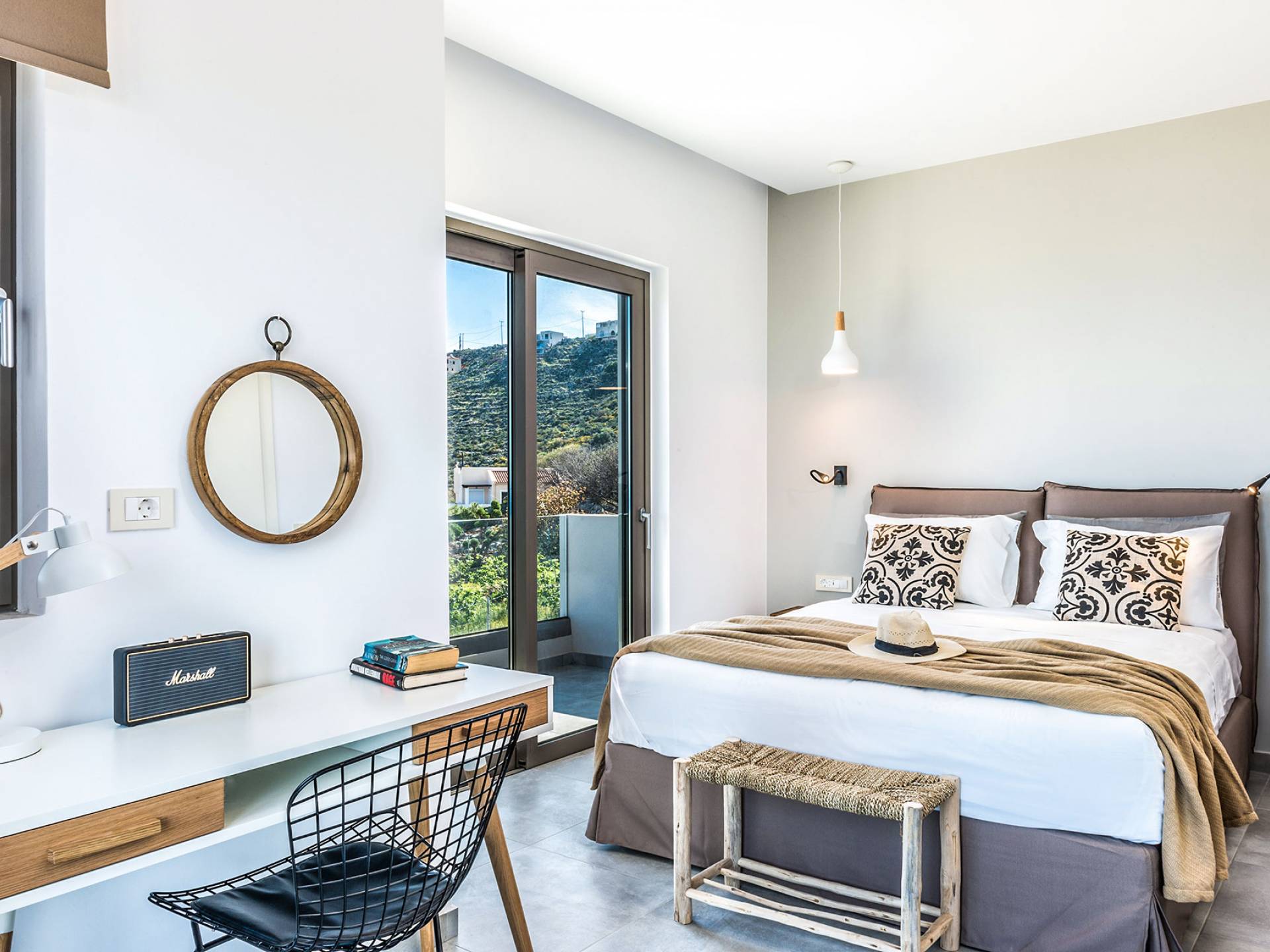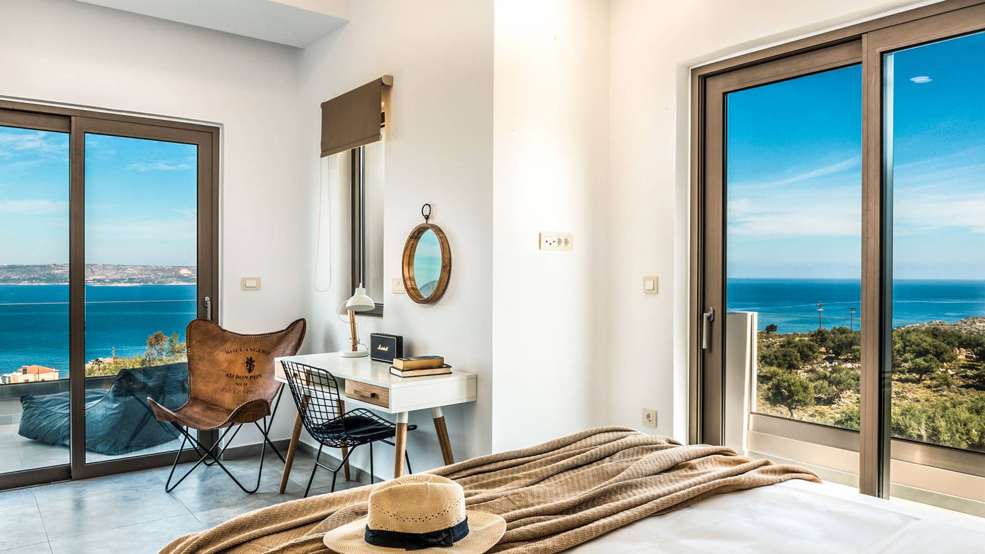 Ramino VIlla Chania with 5 bedrooms grows on three levels following the restless terrain of the land looking out over the spectacular view of Souda Bay leaving room for the spectacular views of the White Mountains. On the ground level, there is a living room with a fully-equipped kitchenette, one bedroom with a 1.60m bed and en-suite bathroom with shower, another bedroom with twin beds convert to 1.70 m bed, and a guest bathroom with shower. Also, there is a separate utility room with a washing machine, dryer, ironing board, and iron.