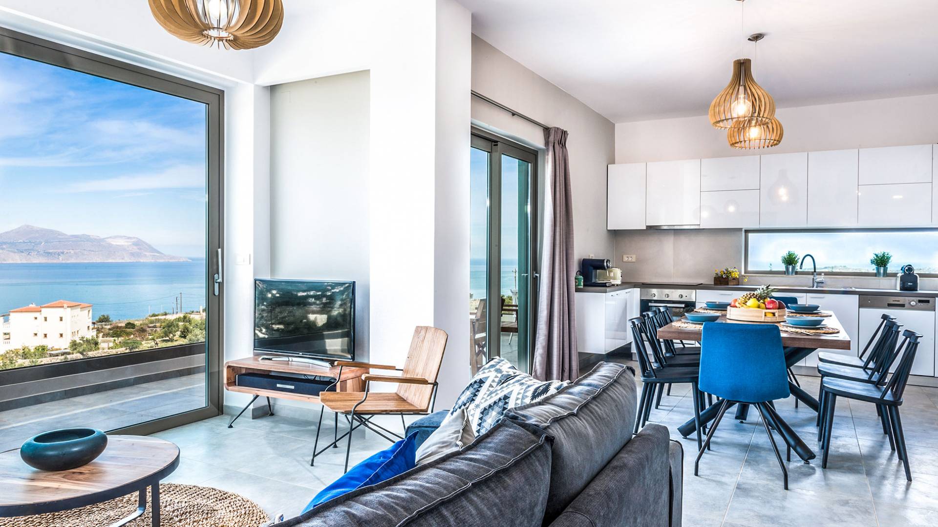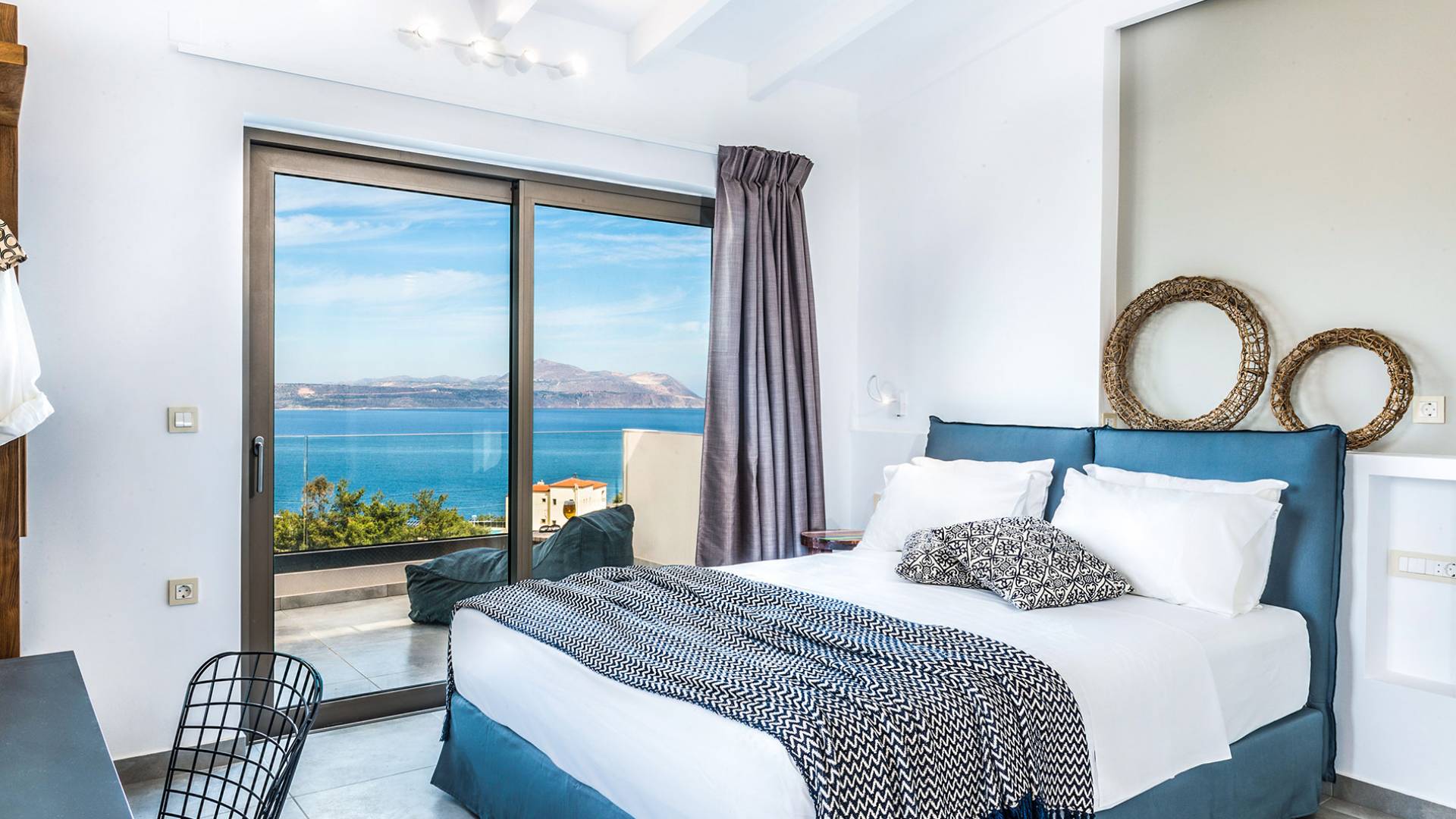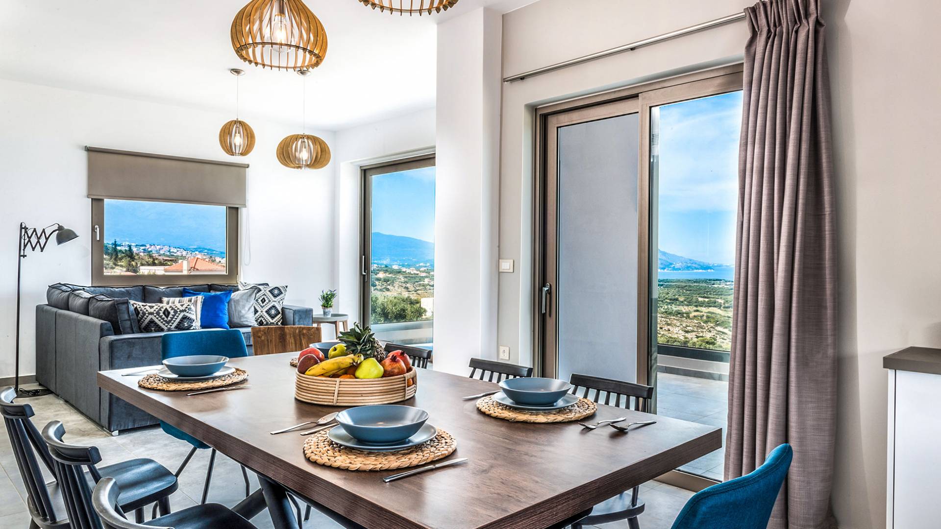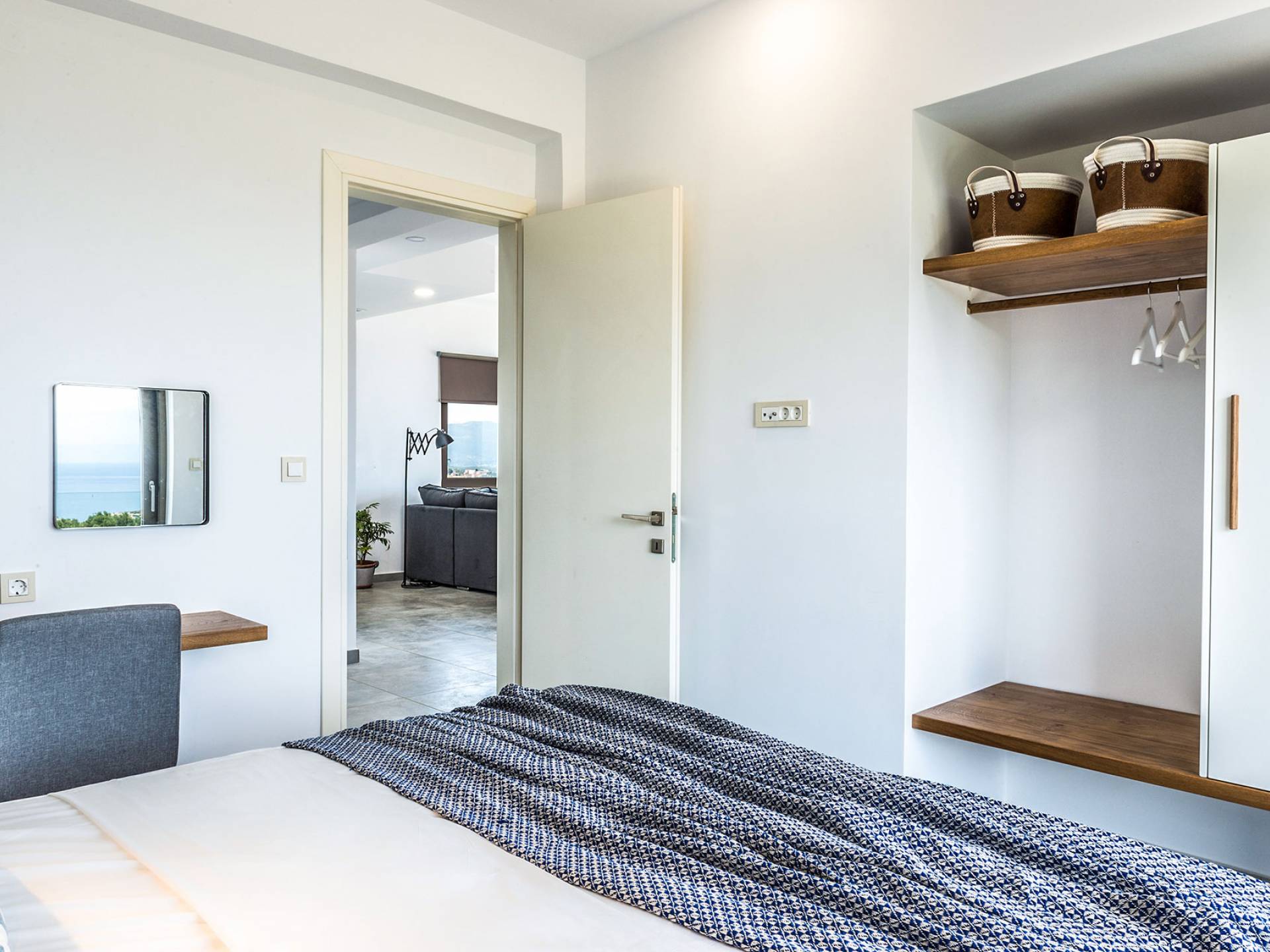 Ramino VIlla Chania with 5 bedrooms grows on three levels following the restless terrain of the land looking out over the spectacular view of Souda Bay leaving room for the spectacular views of the White Mountains. On the ground level, there is a living room with a fully-equipped kitchenette, one bedroom with a 1.60m bed and en-suite bathroom with shower, another bedroom with twin beds convert to 1.70 m bed, and a guest bathroom with shower. Also, there is a separate utility room with a washing machine, dryer, ironing board, and iron.
