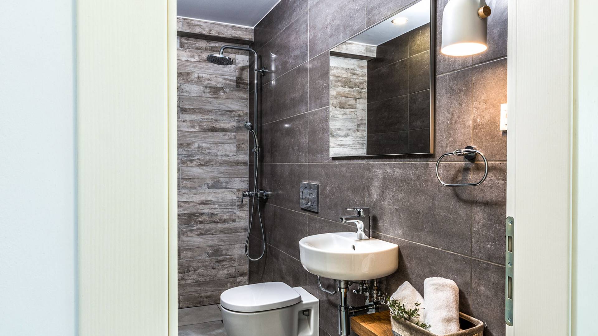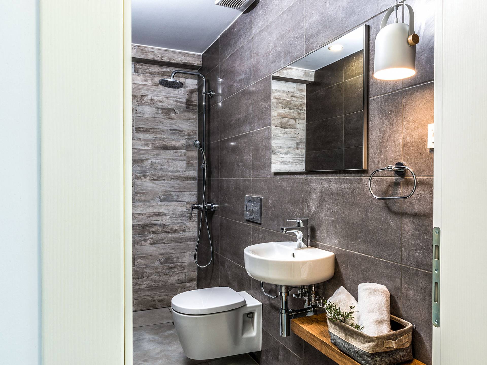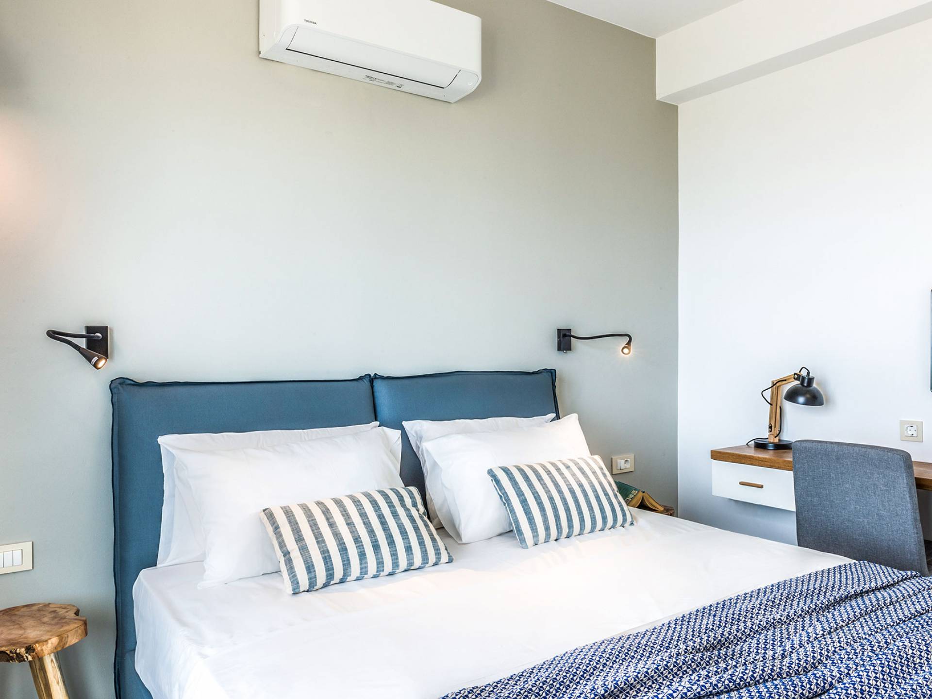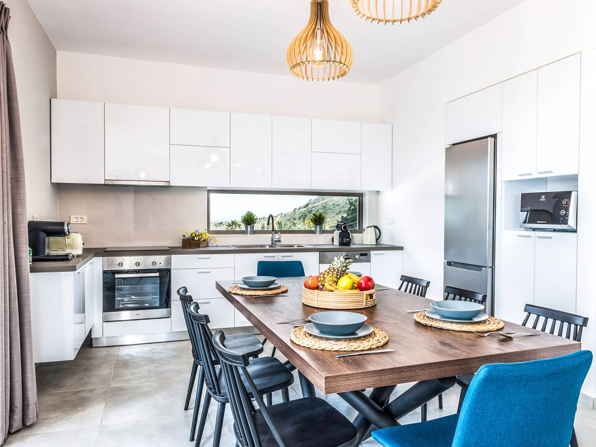 Ramino VIlla Chania with 5 bedrooms grows on three levels following the restless terrain of the land looking out over the spectacular view of Souda Bay leaving room for the spectacular views of the White Mountains. On the ground level, there is a living room with a fully-equipped kitchenette, one bedroom with a 1.60m bed and en-suite bathroom with shower, another bedroom with twin beds convert to 1.70 m bed, and a guest bathroom with shower. Also, there is a separate utility room with a washing machine, dryer, ironing board, and iron.