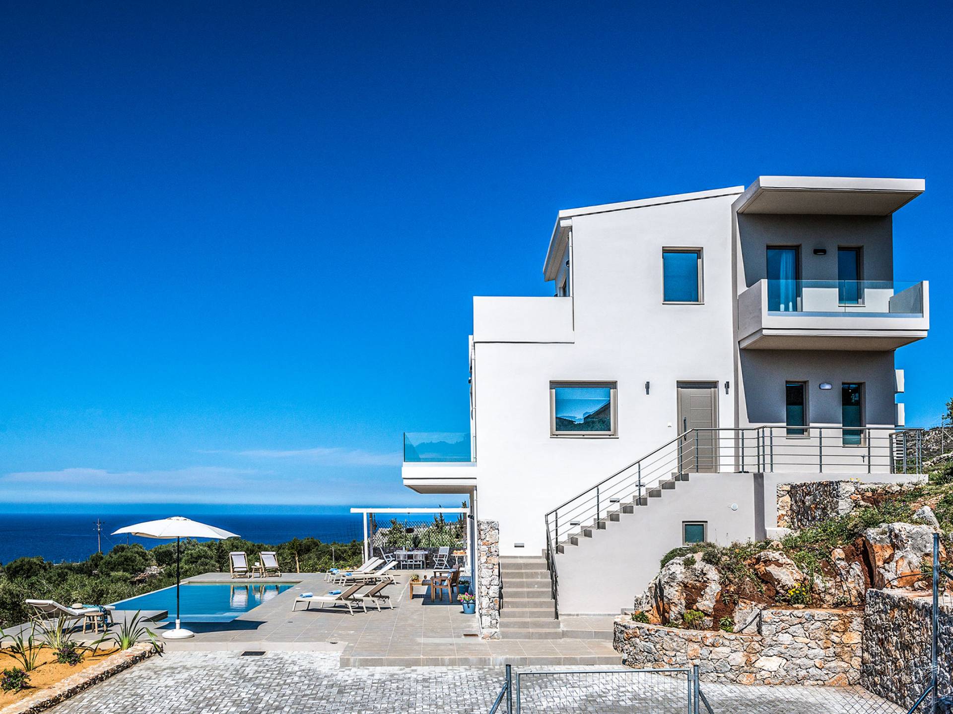 Ramino Villa Chania in Kokkino Chorio, Chania, Crete is an impressive brand new luxury villa that can accommodate 10-11 people. Its architecture is modern and minimalistic. The modern taste of the owners is expressed in every detail of the Ramino Villa Chania.