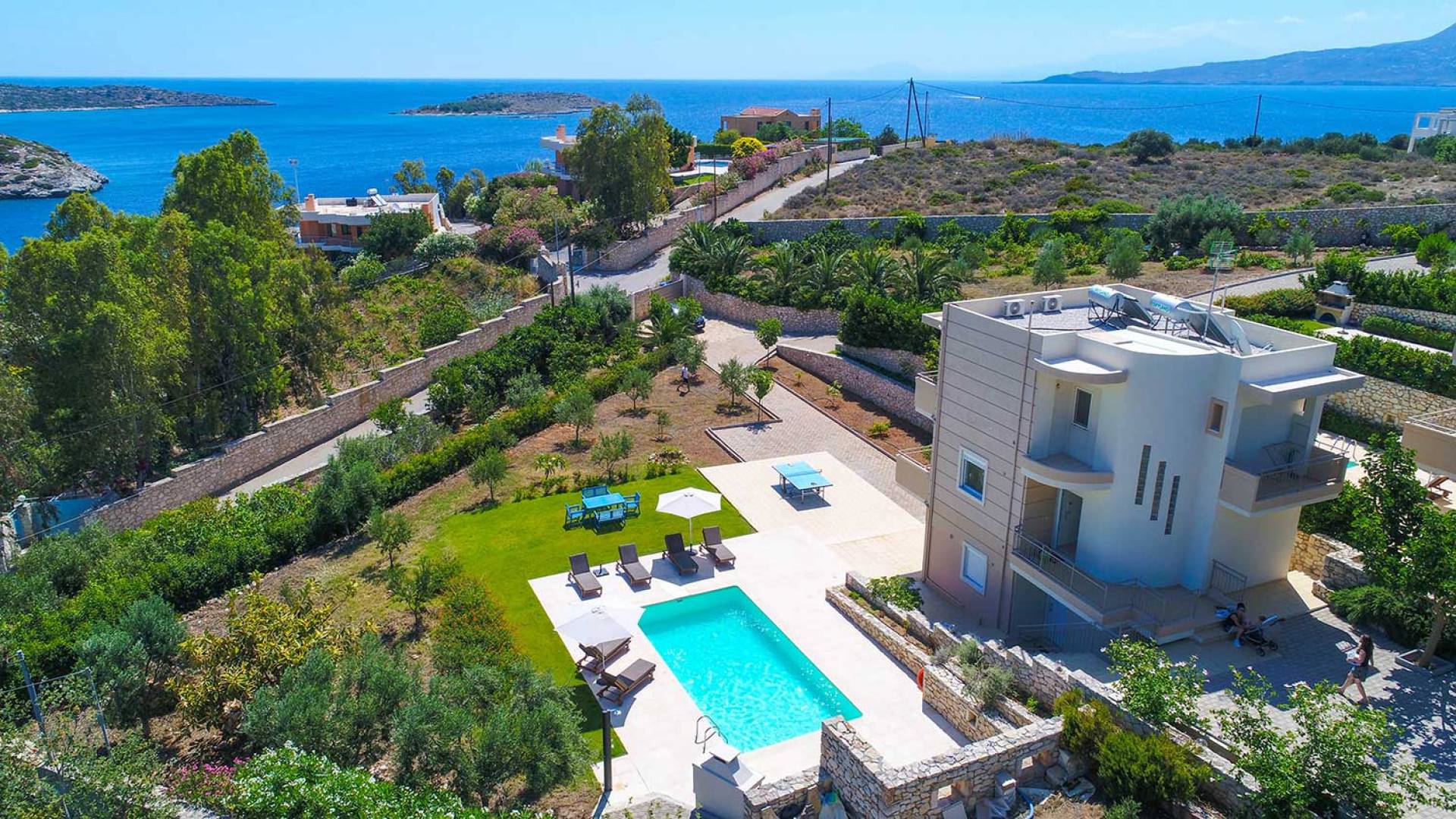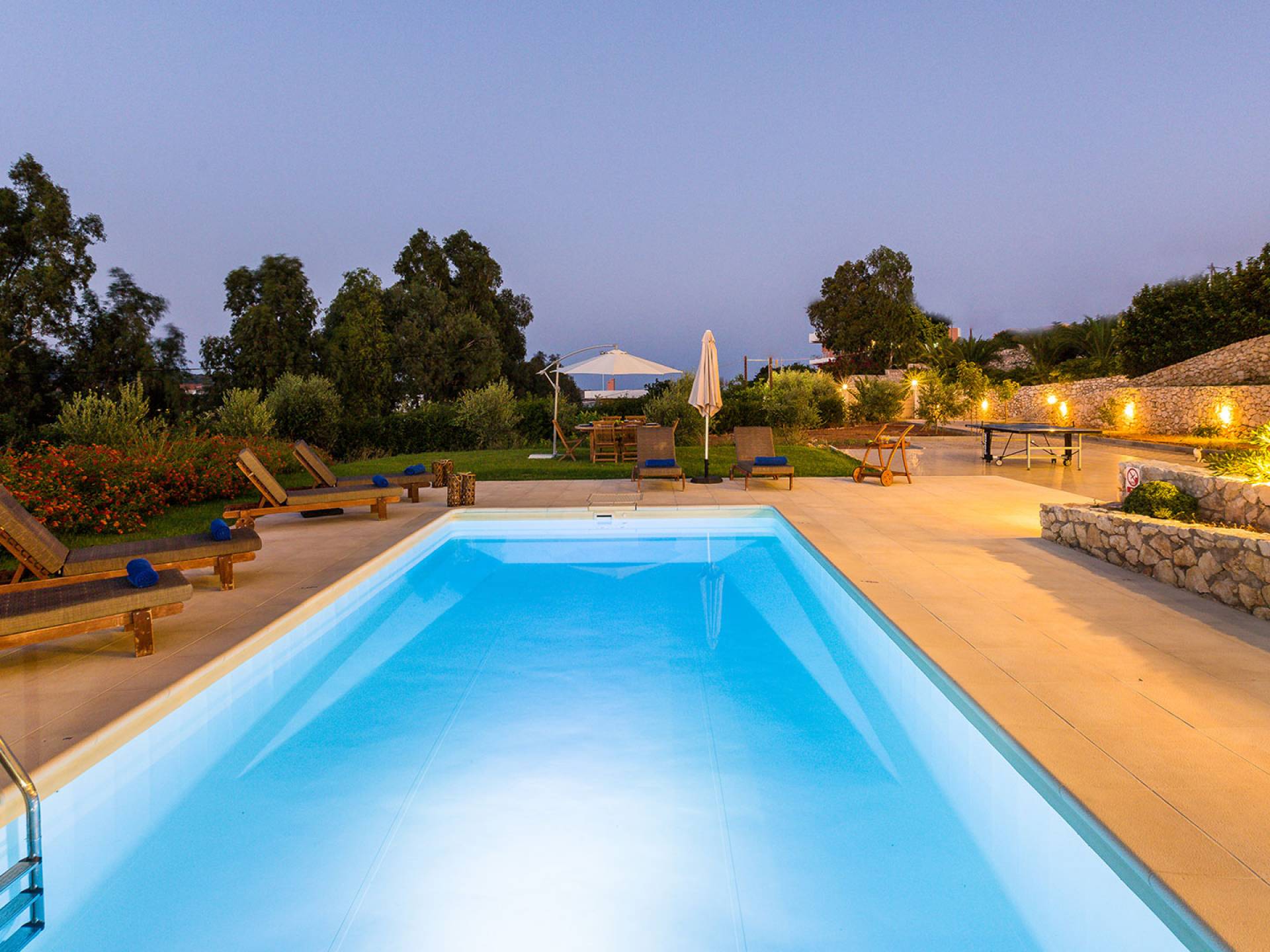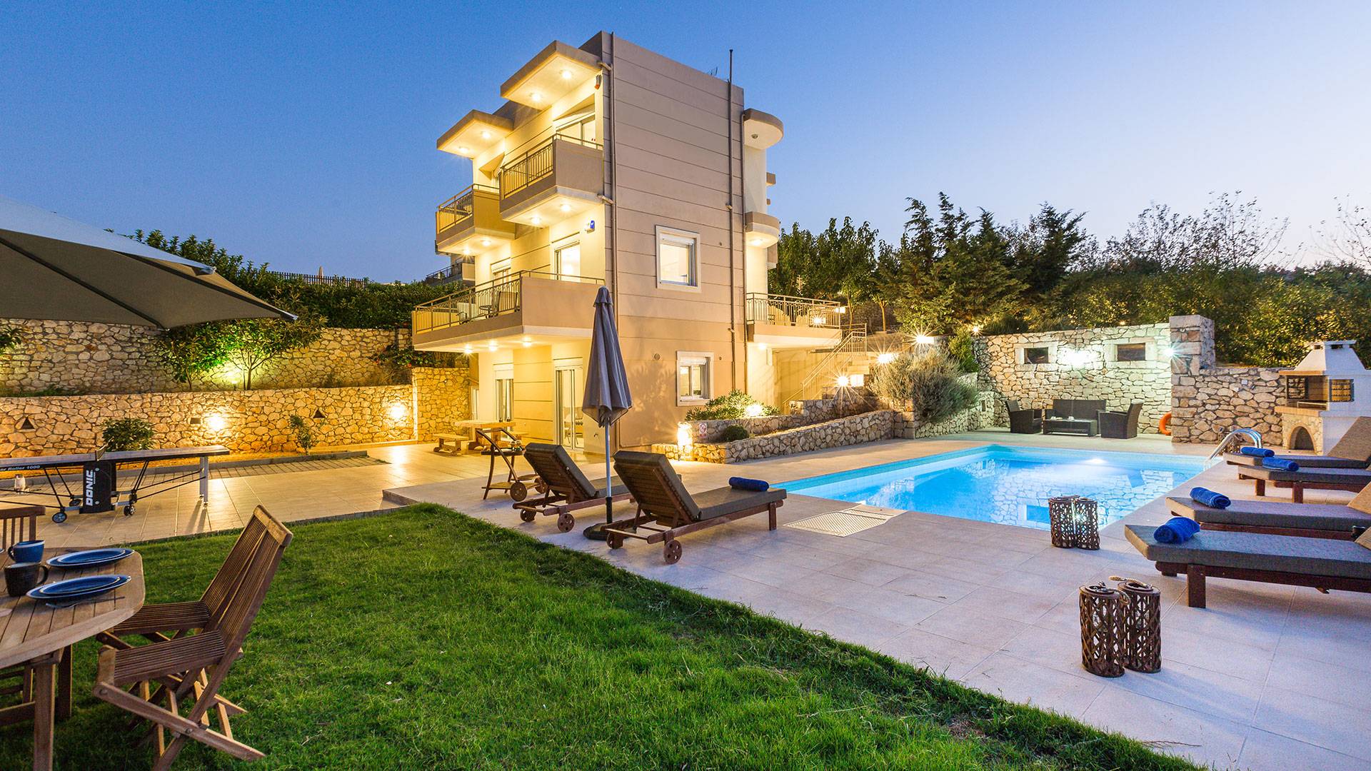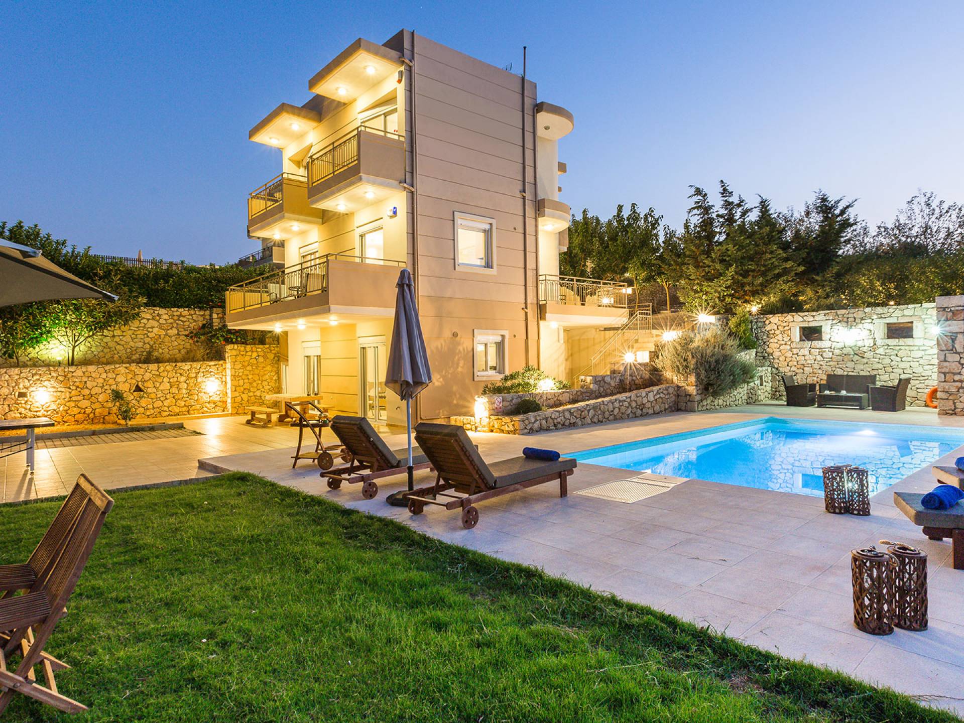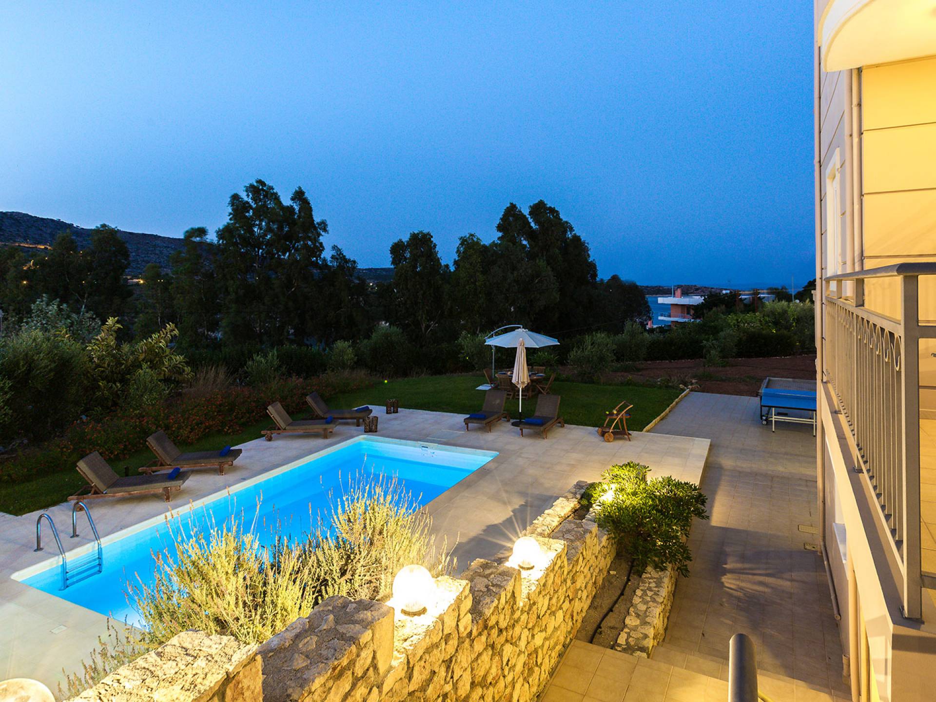 Questo noleggio di lusso è composto da 3 livelli. Al piano terra si trova un'ampia cucina, sala da pranzo e soggiorno, una camera matrimoniale e un bagno con doccia. Al piano d'ingresso troviamo una spaziosa cucina abitabile, una zona pranzo e una zona giorno lungo il lato sinistro con balconi. Su questo piano c'è una camera matrimoniale e un bagno con doccia. Al primo piano si trova una camera matrimoniale con bagno privato con doccia e balcone vista mare. C'è anche una camera doppia con balcone e un bagno. All'esterno è possibile trovare una piscina privata riscaldata senza cloro. Star Villa 2 Chania offre anche lettini e un grande ombrellone, mobili da esterno, ping pong, giardini e parcheggio privato. Puoi rilassarti a bordo piscina e goderti la magica vista sul mare e sulle montagne Il riscaldamento della piscina è disponibile per i mesi di aprile, maggio, settembre e ottobre e prevede un supplemento.