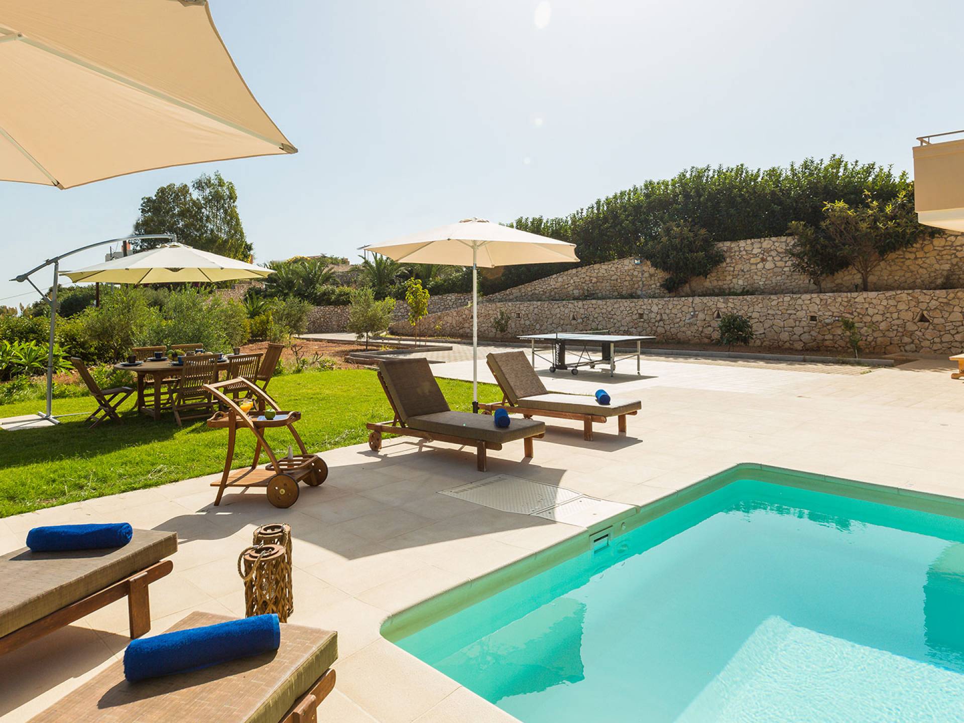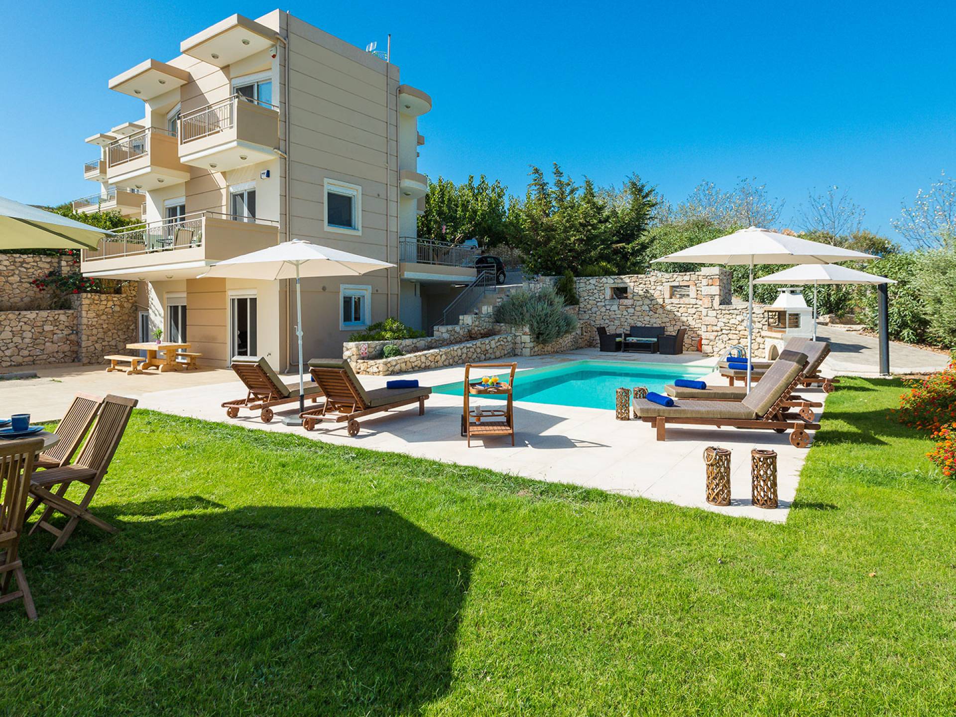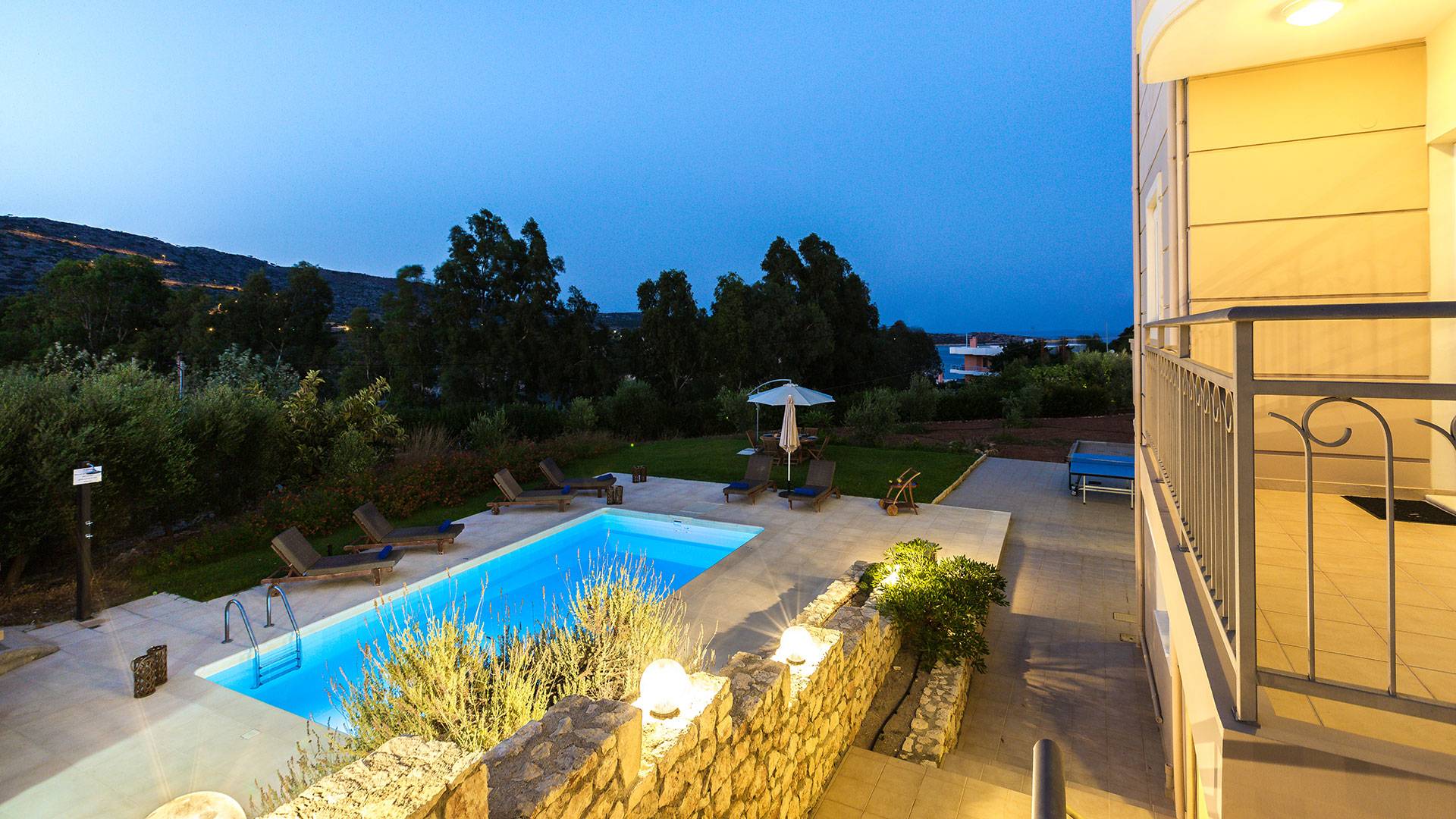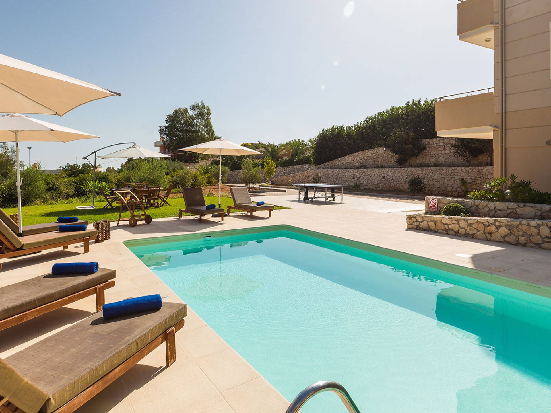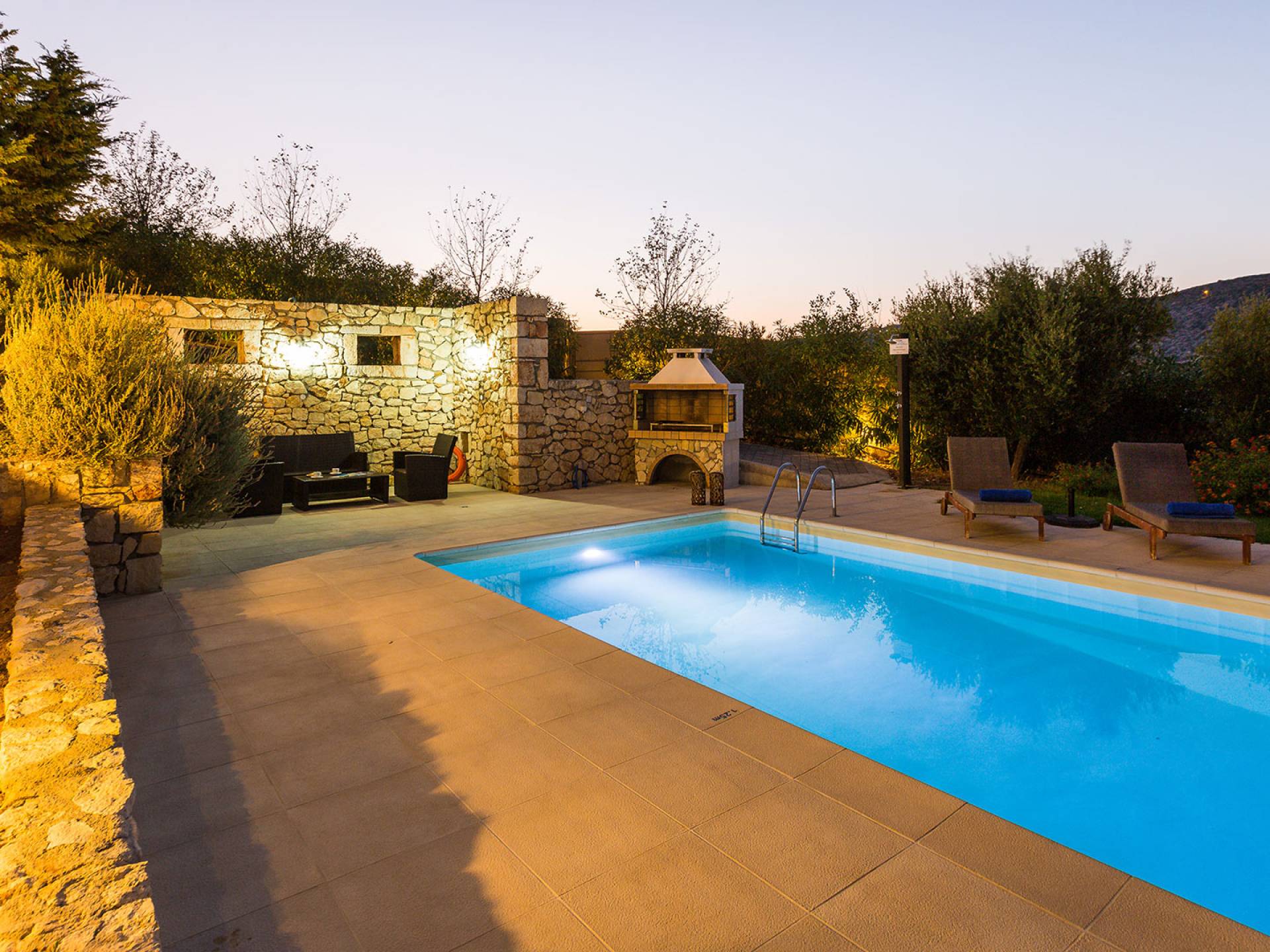 Questo noleggio di lusso è composto da 3 livelli. Al piano terra si trova un'ampia cucina, sala da pranzo e soggiorno, una camera matrimoniale e un bagno con doccia. Al piano d'ingresso troviamo una spaziosa cucina abitabile, una zona pranzo e una zona giorno lungo il lato sinistro con balconi. Su questo piano c'è una camera matrimoniale e un bagno con doccia. Al primo piano si trova una camera matrimoniale con bagno privato con doccia e balcone vista mare. C'è anche una camera doppia con balcone e un bagno. All'esterno è possibile trovare una piscina privata riscaldata senza cloro. Star Villa 2 Chania offre anche lettini e un grande ombrellone, mobili da esterno, ping pong, giardini e parcheggio privato. Puoi rilassarti a bordo piscina e goderti la magica vista sul mare e sulle montagne Il riscaldamento della piscina è disponibile per i mesi di aprile, maggio, settembre e ottobre e prevede un supplemento.