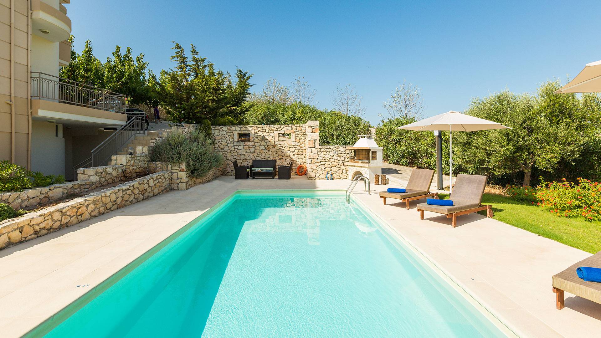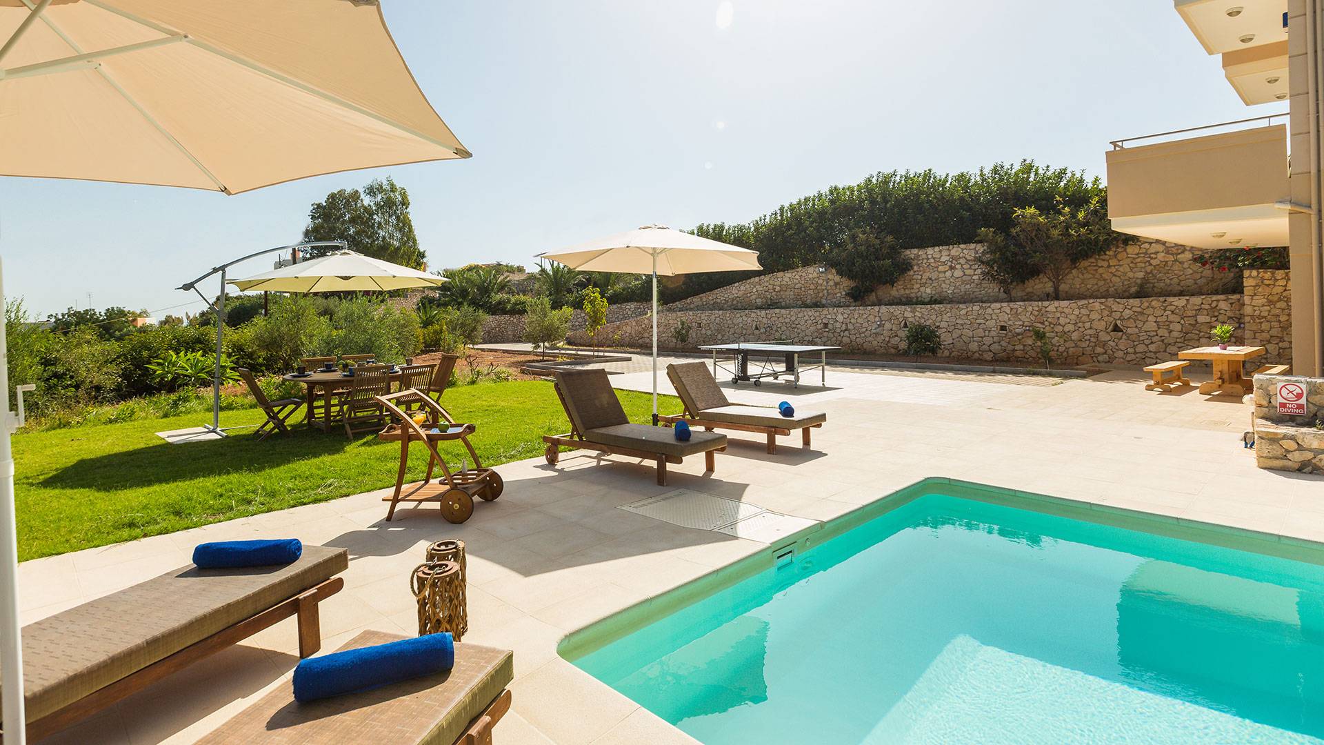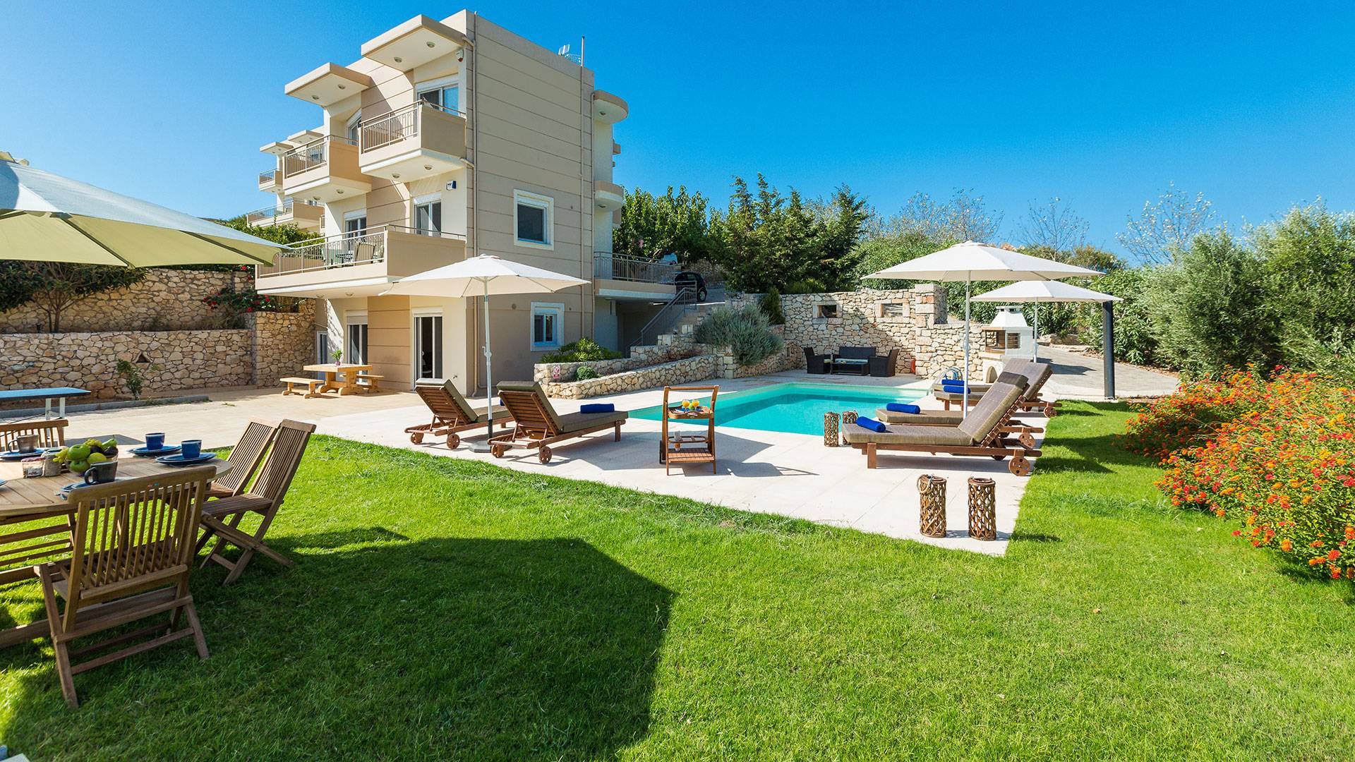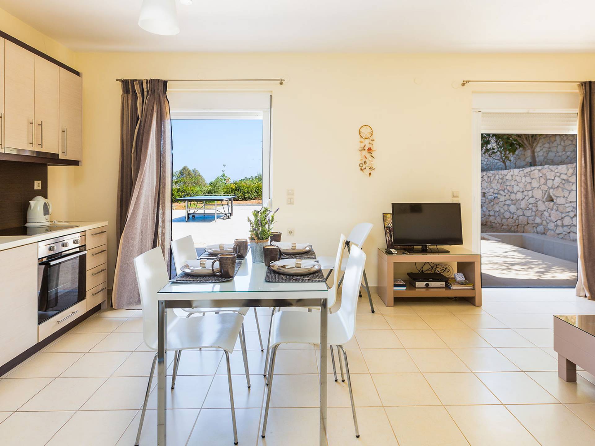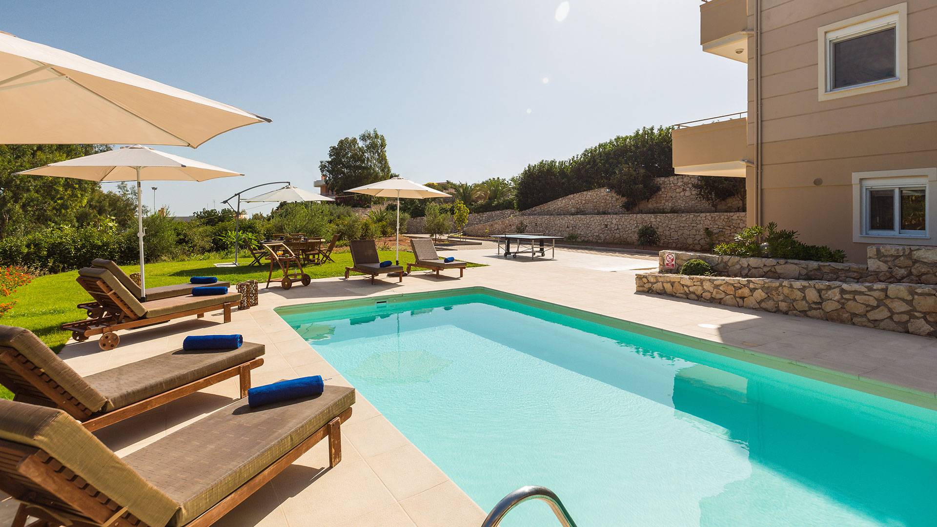 Questo noleggio di lusso è composto da 3 livelli. Al piano terra si trova un'ampia cucina, sala da pranzo e soggiorno, una camera matrimoniale e un bagno con doccia. Al piano d'ingresso troviamo una spaziosa cucina abitabile, una zona pranzo e una zona giorno lungo il lato sinistro con balconi. Su questo piano c'è una camera matrimoniale e un bagno con doccia. Al primo piano si trova una camera matrimoniale con bagno privato con doccia e balcone vista mare. C'è anche una camera doppia con balcone e un bagno. All'esterno è possibile trovare una piscina privata riscaldata senza cloro. Star Villa 2 Chania offre anche lettini e un grande ombrellone, mobili da esterno, ping pong, giardini e parcheggio privato. Puoi rilassarti a bordo piscina e goderti la magica vista sul mare e sulle montagne Il riscaldamento della piscina è disponibile per i mesi di aprile, maggio, settembre e ottobre e prevede un supplemento.