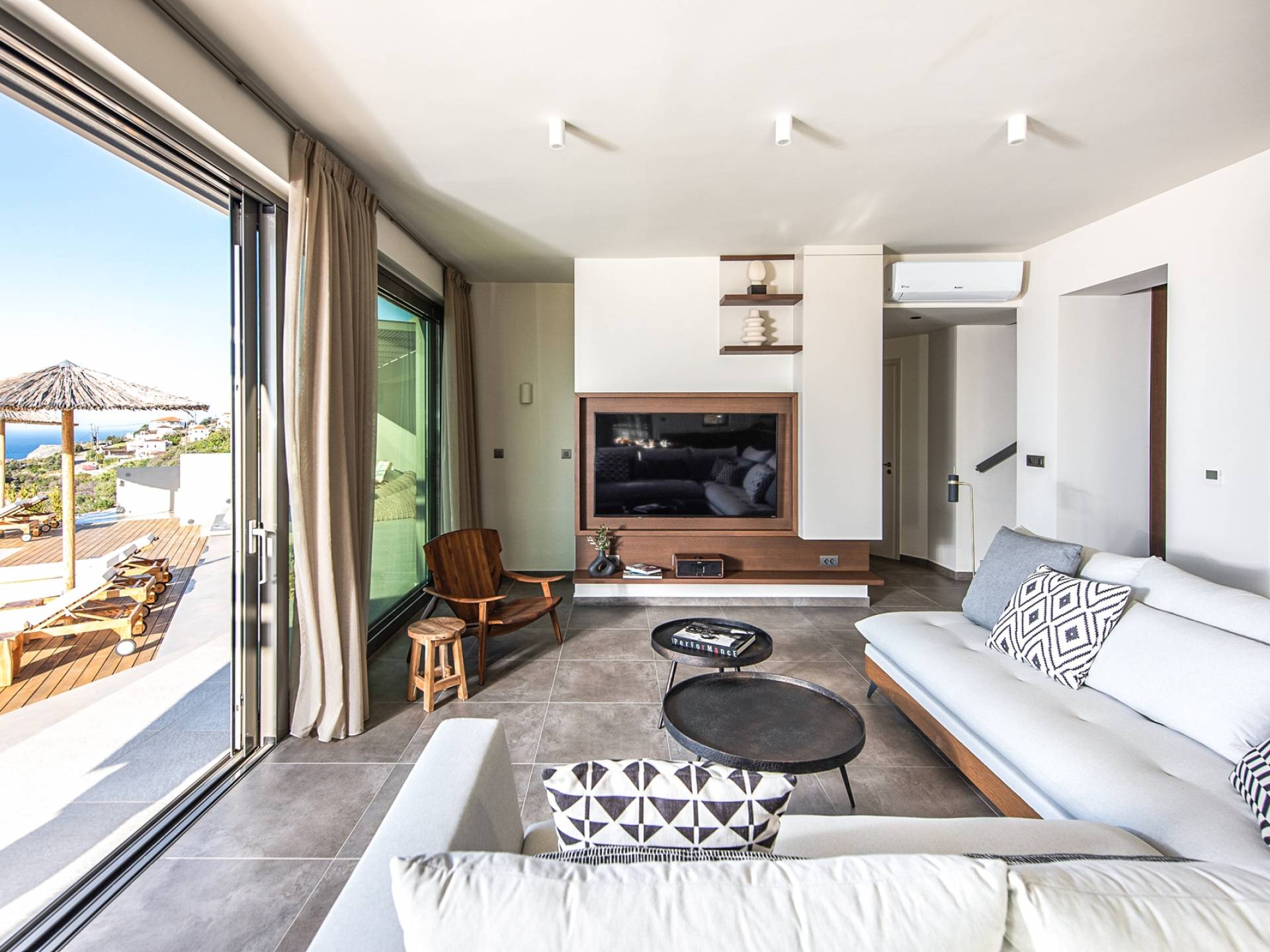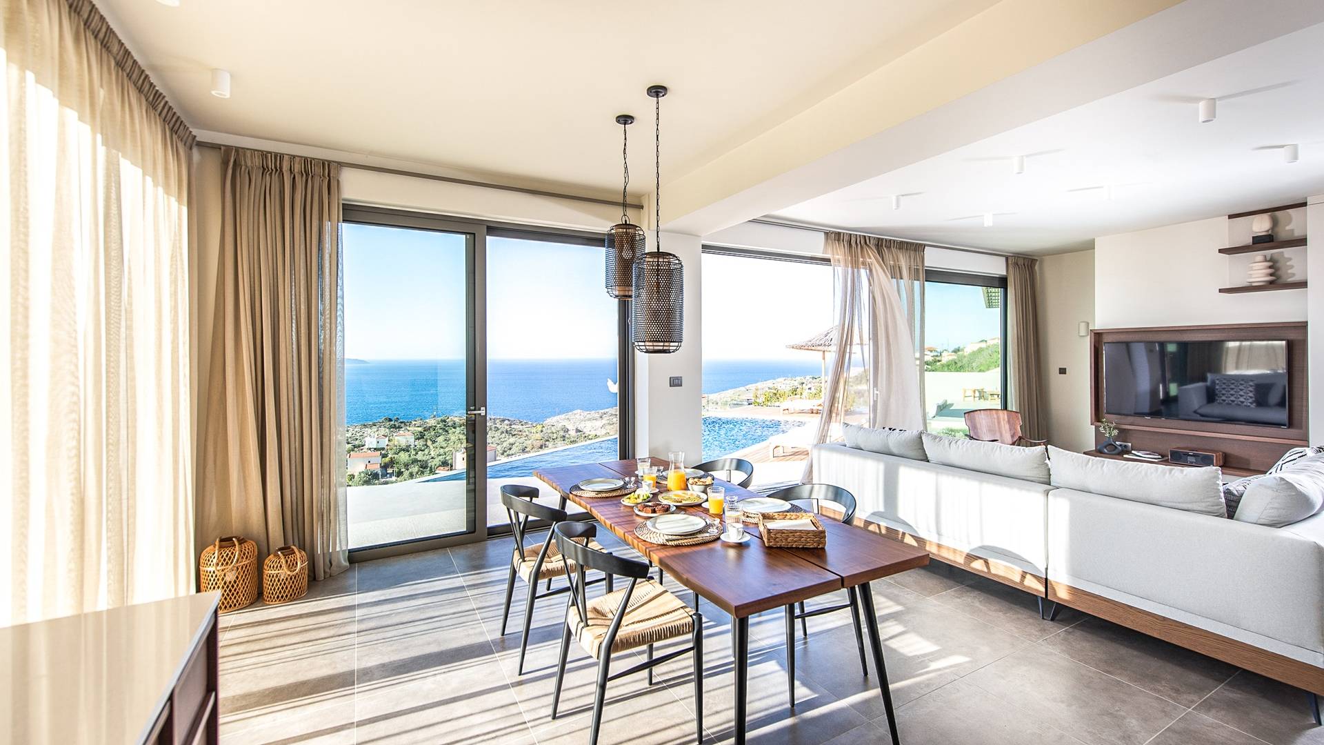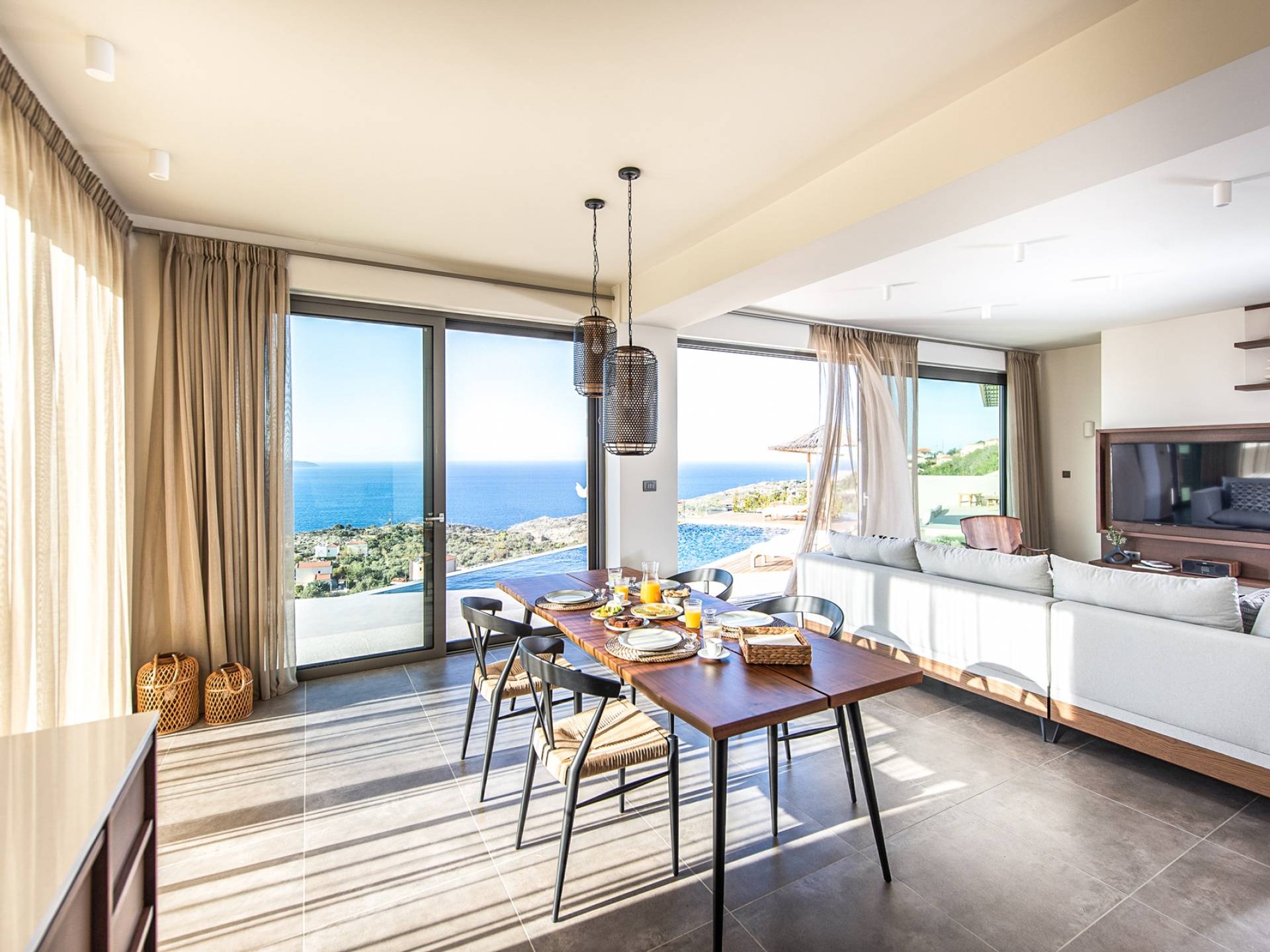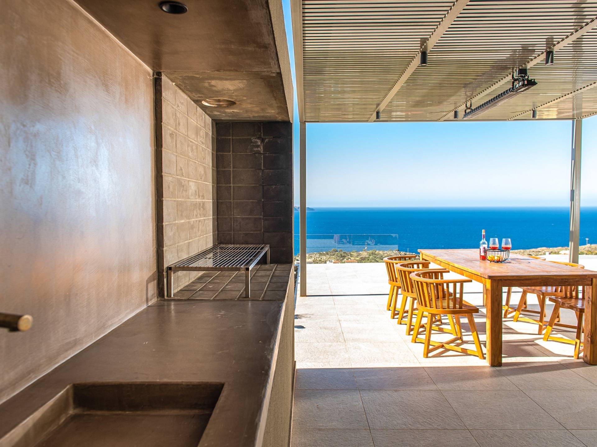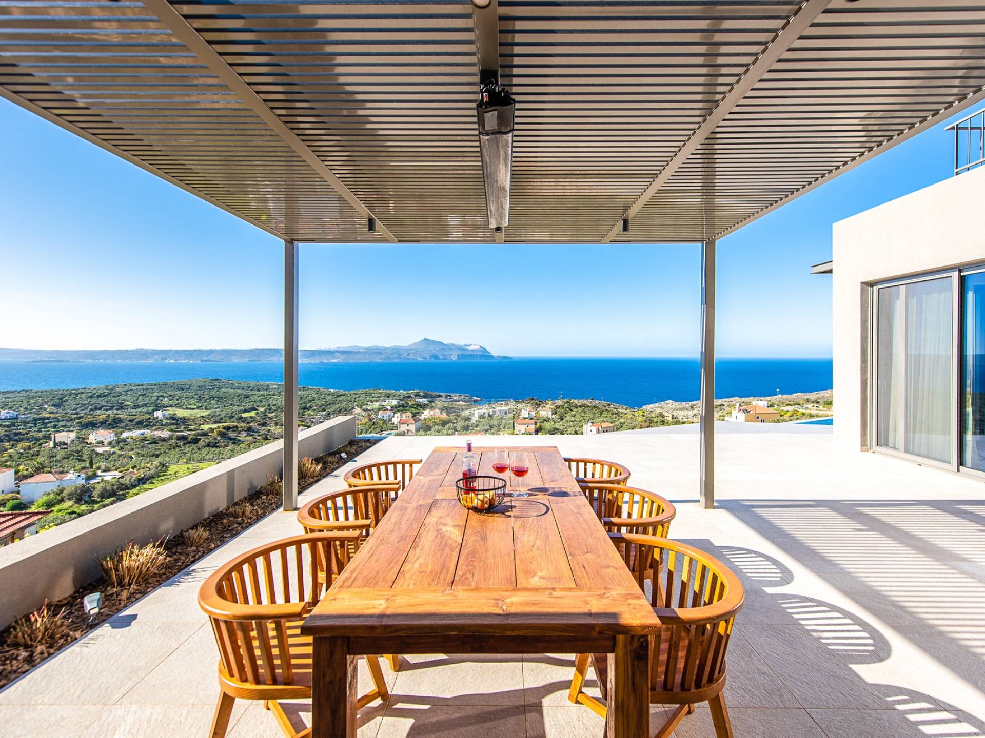 Villa Alenas Chania comfortably sleeps up to 8 people and features 3 double bedrooms and a cinema room with a sleeper sofa that can accommodate up to 2 people, a large heated infinity swimming pool, and a fantastic outdoor dining and BBQ area. Combined with multiple balconies and terraces which were designed to be both private and also showcase the fantastic views, the villa also boasts a spacious open-plan kitchen, dining, and lounge area inside the villa.
