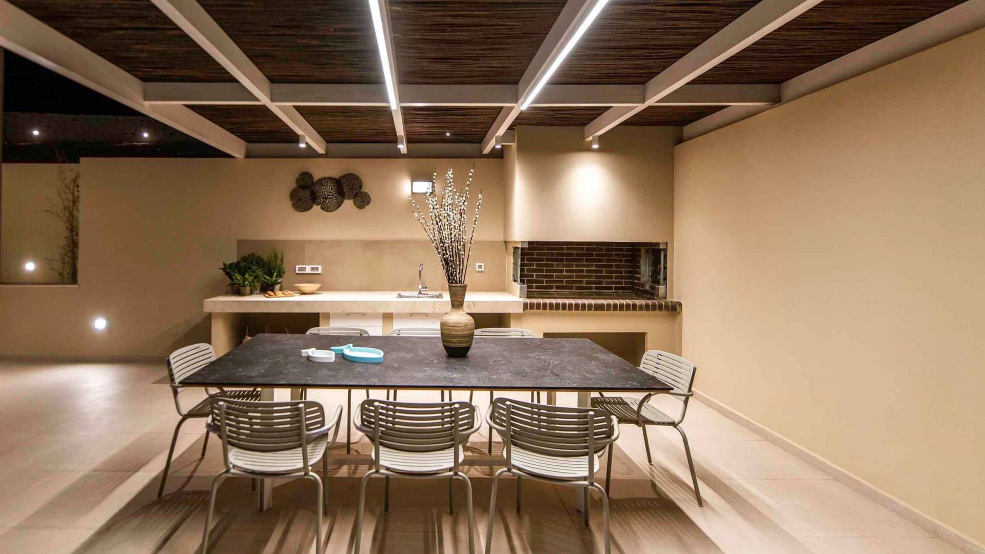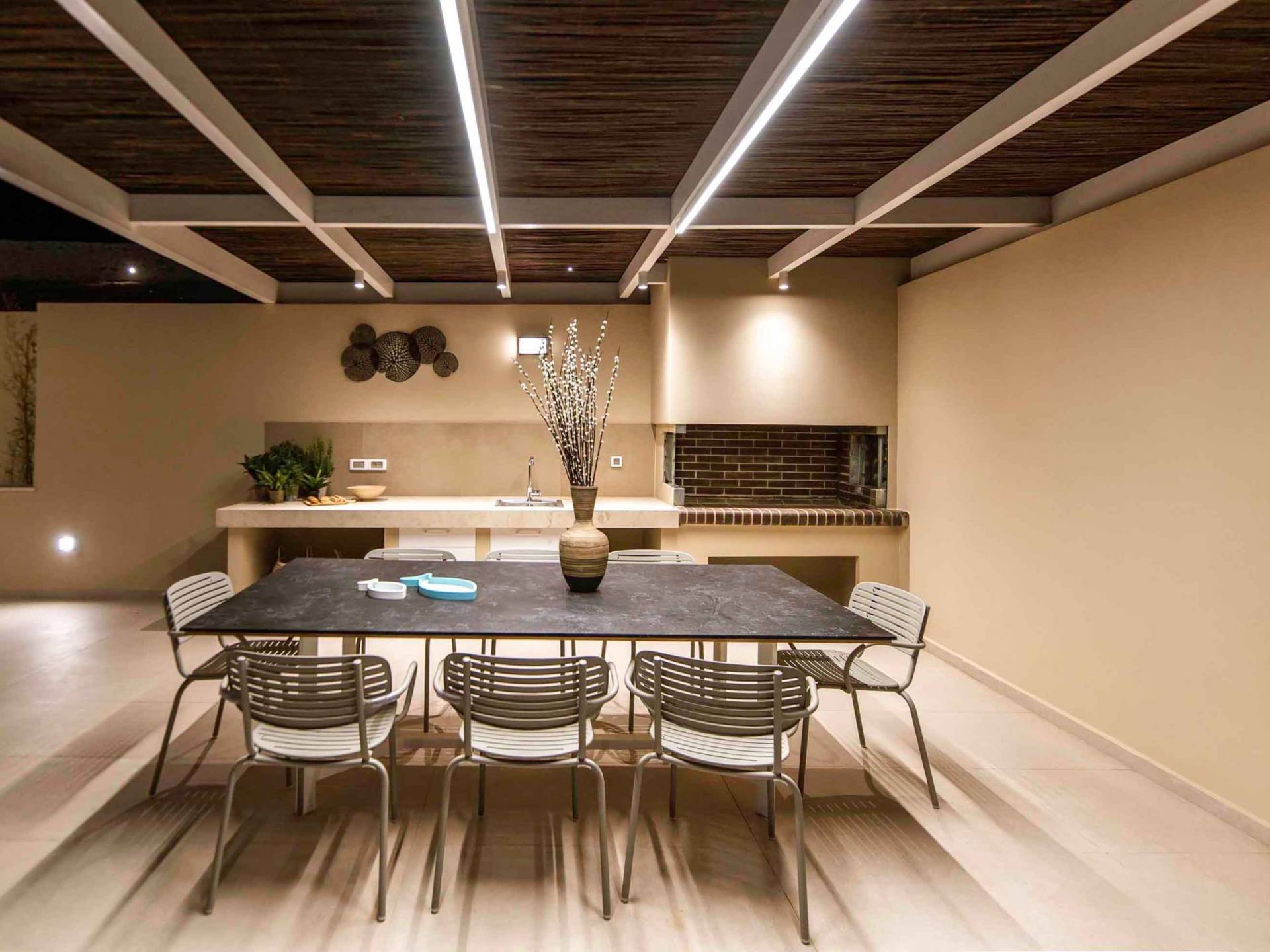 - Open-plan living and dining space with large glass doors opening to the pool terrace