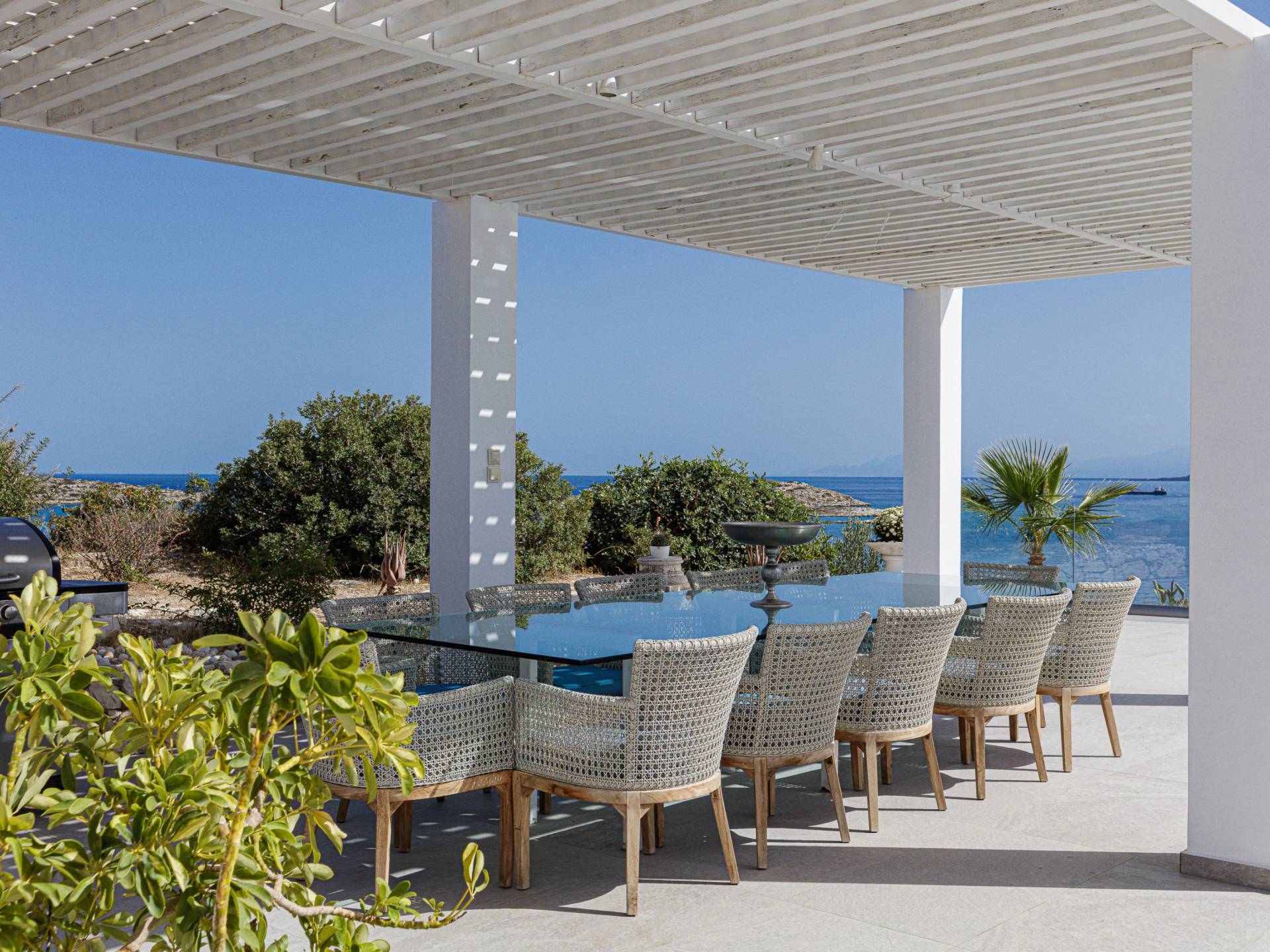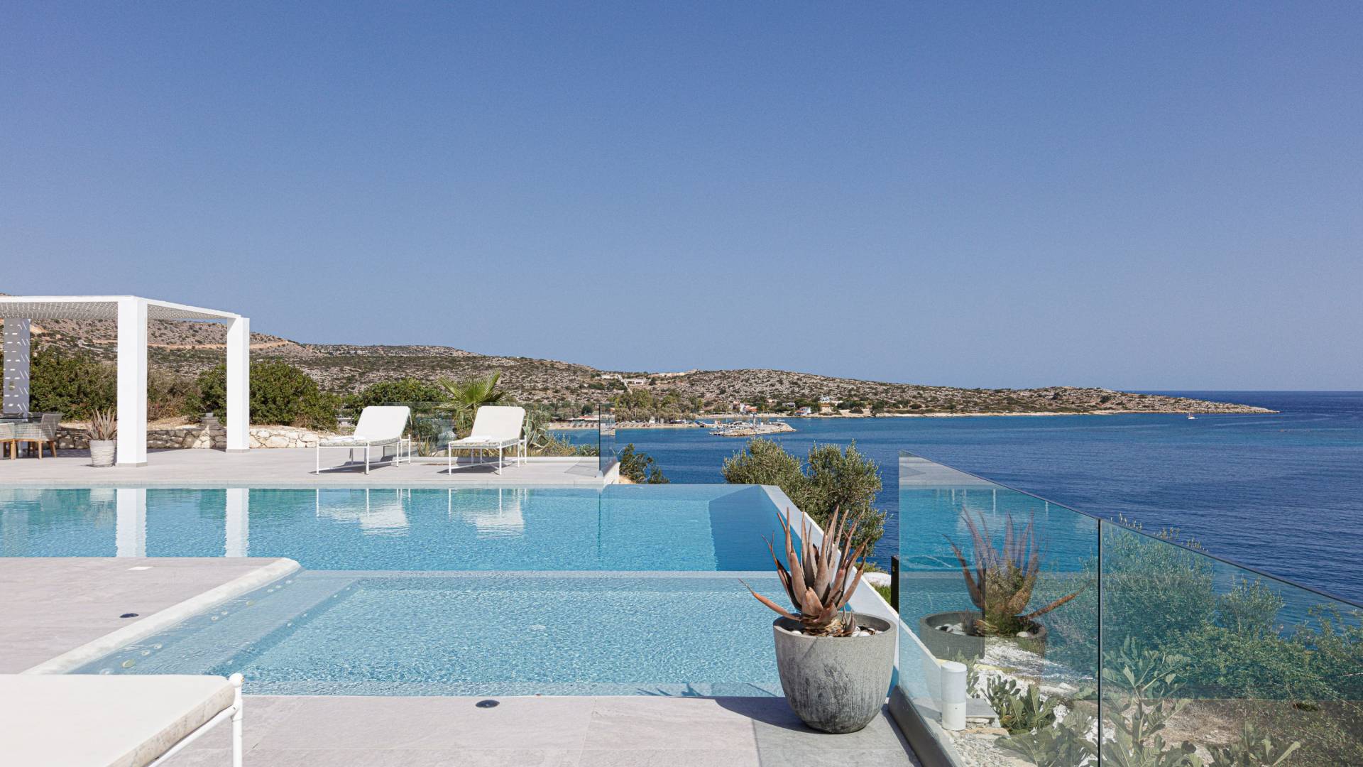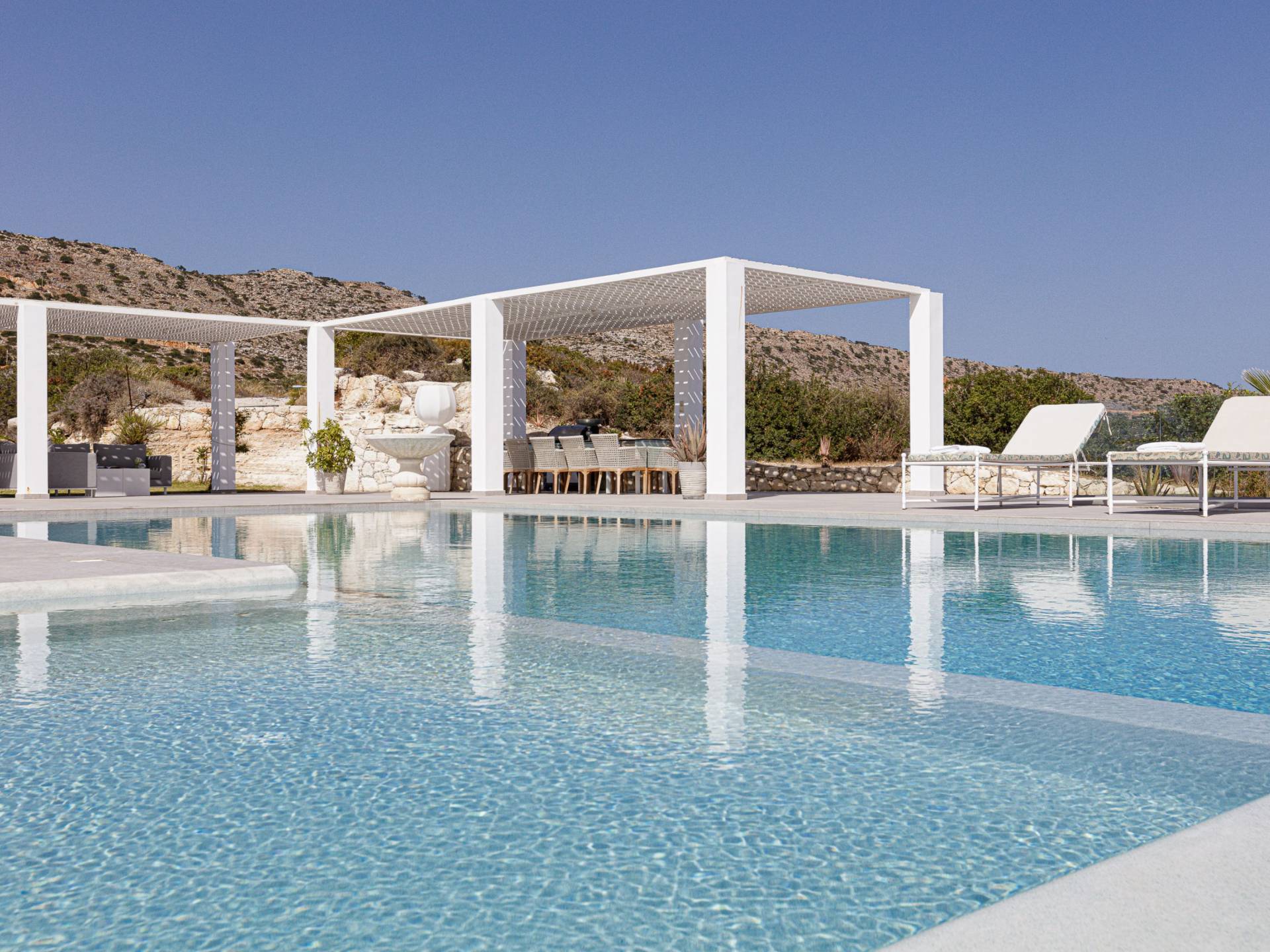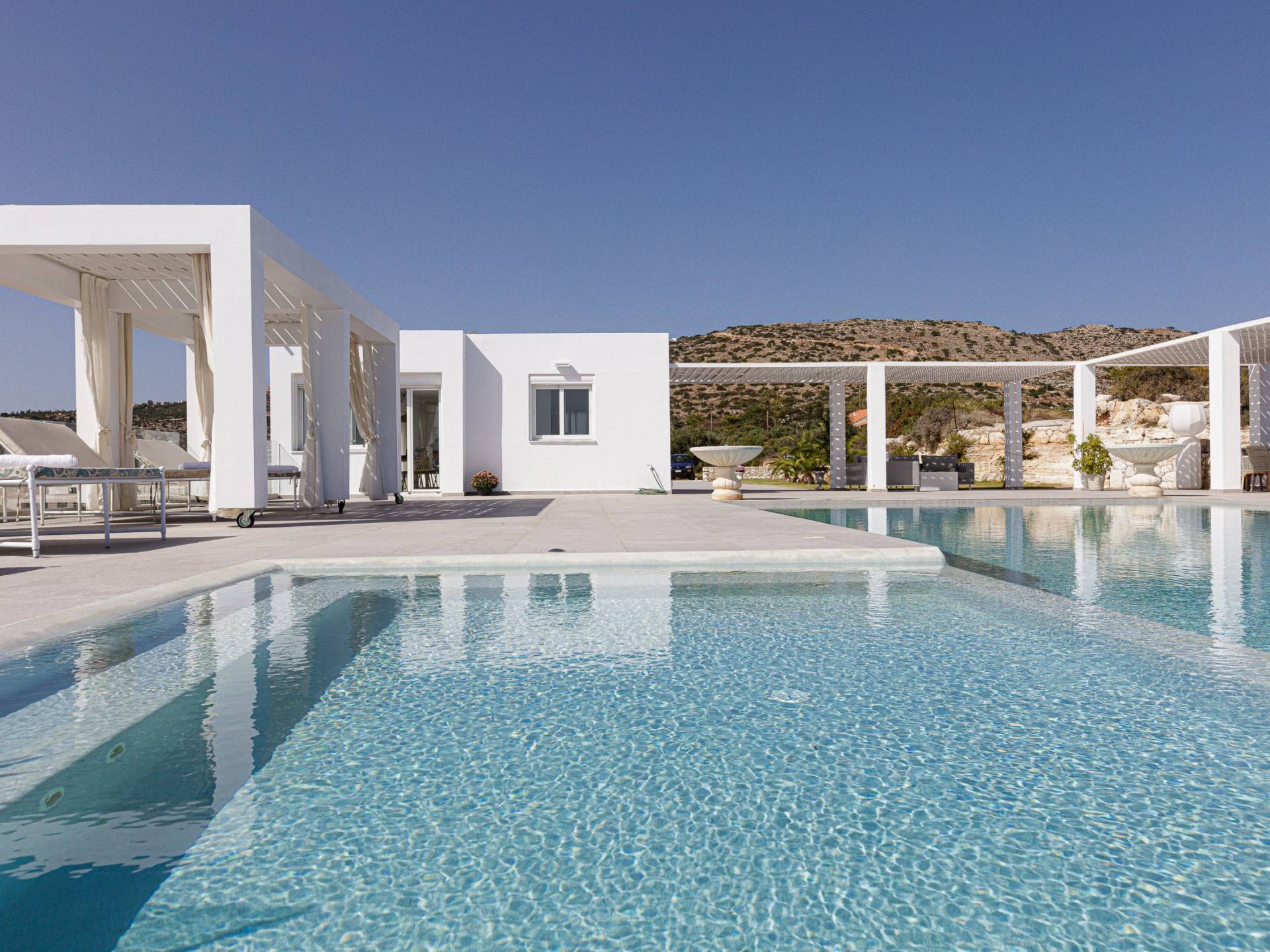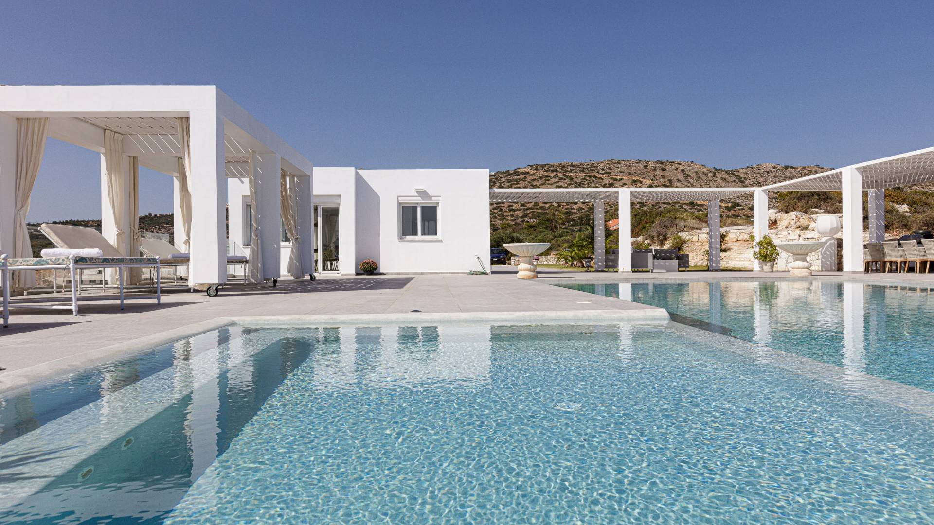La piscina e la vasca idromassaggio integrata sono state progettate in linea con le impressionanti viste sul mare e sul cielo che si possono ammirare dalla villa. Una vista che vi consigliamo di godere all'ombra del pergolato e dei suoi intrecci profumati di gelsomini. Potrete godervi la vita all'aria aperta sedendovi al tavolo dalle linee pulite sotto il pergolato o sdraiandovi sui lettini a bordo piscina. Convenientemente adiacente all'area c'è la cucina completamente bianca con alzatina a specchio, completamente attrezzata con tutti gli accessori moderni, e la zona pranzo e salotto interna che conduce al resto della casa.