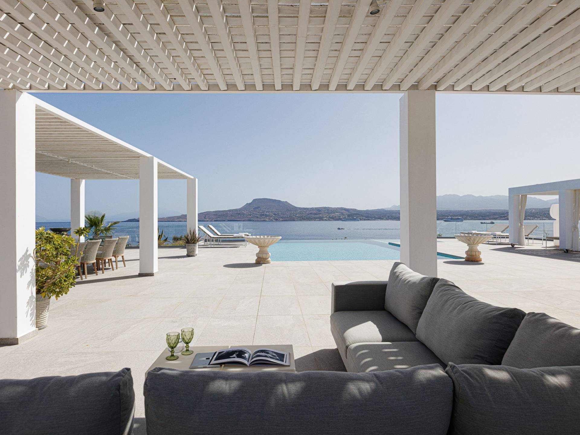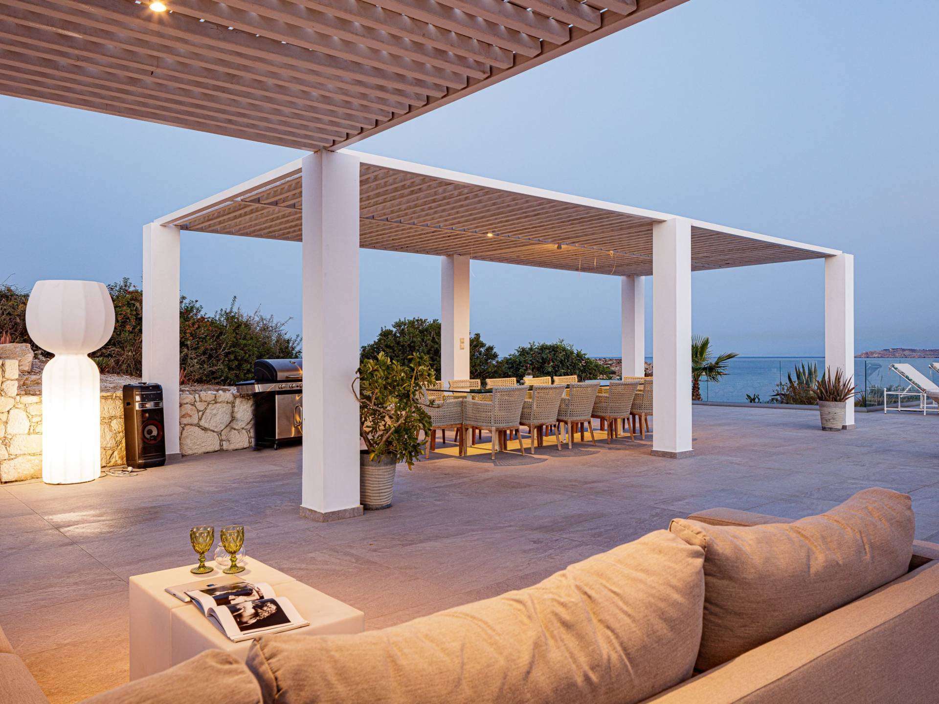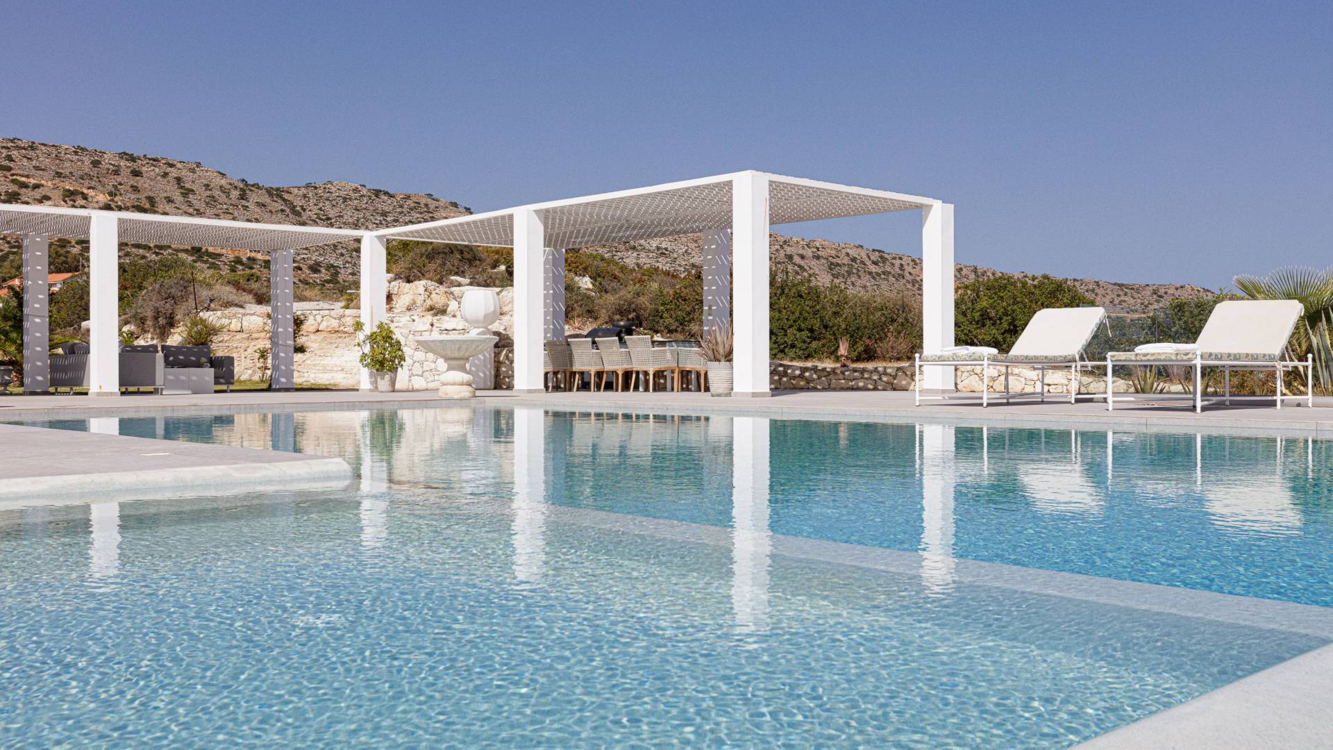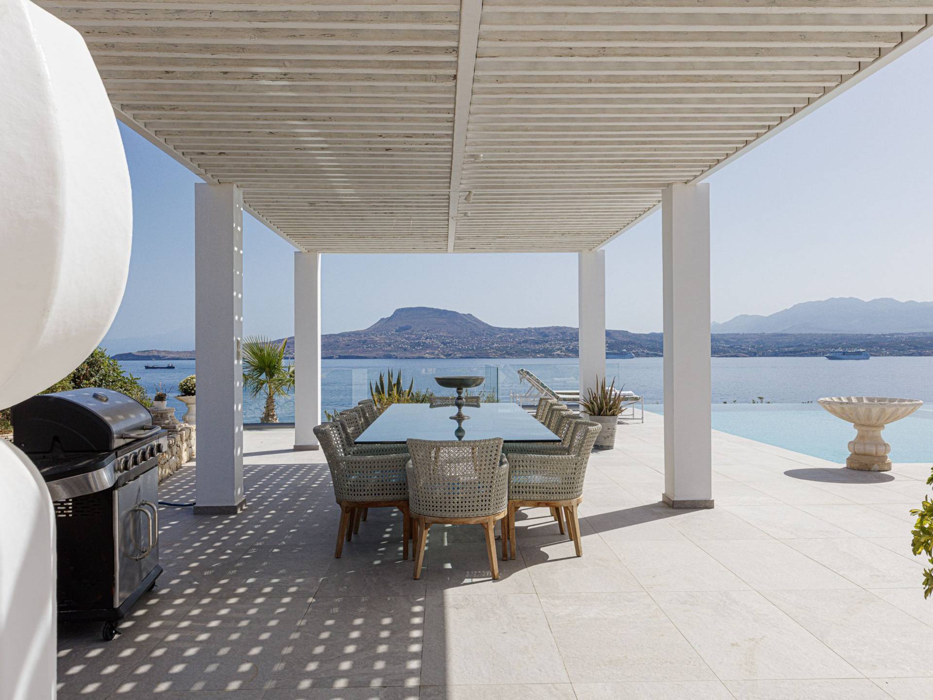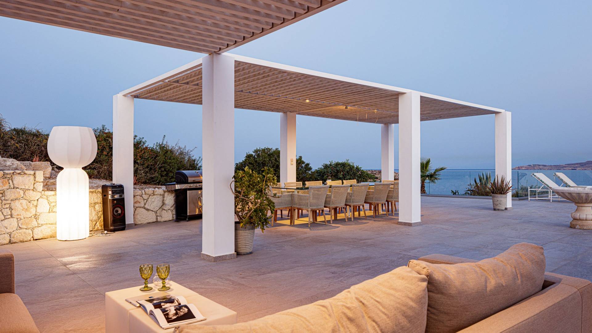La piscina e la vasca idromassaggio integrata sono state progettate in linea con le impressionanti viste sul mare e sul cielo che si possono ammirare dalla villa. Una vista che vi consigliamo di godere all'ombra del pergolato e dei suoi intrecci profumati di gelsomini. Potrete godervi la vita all'aria aperta sedendovi al tavolo dalle linee pulite sotto il pergolato o sdraiandovi sui lettini a bordo piscina. Convenientemente adiacente all'area c'è la cucina completamente bianca con alzatina a specchio, completamente attrezzata con tutti gli accessori moderni, e la zona pranzo e salotto interna che conduce al resto della casa.