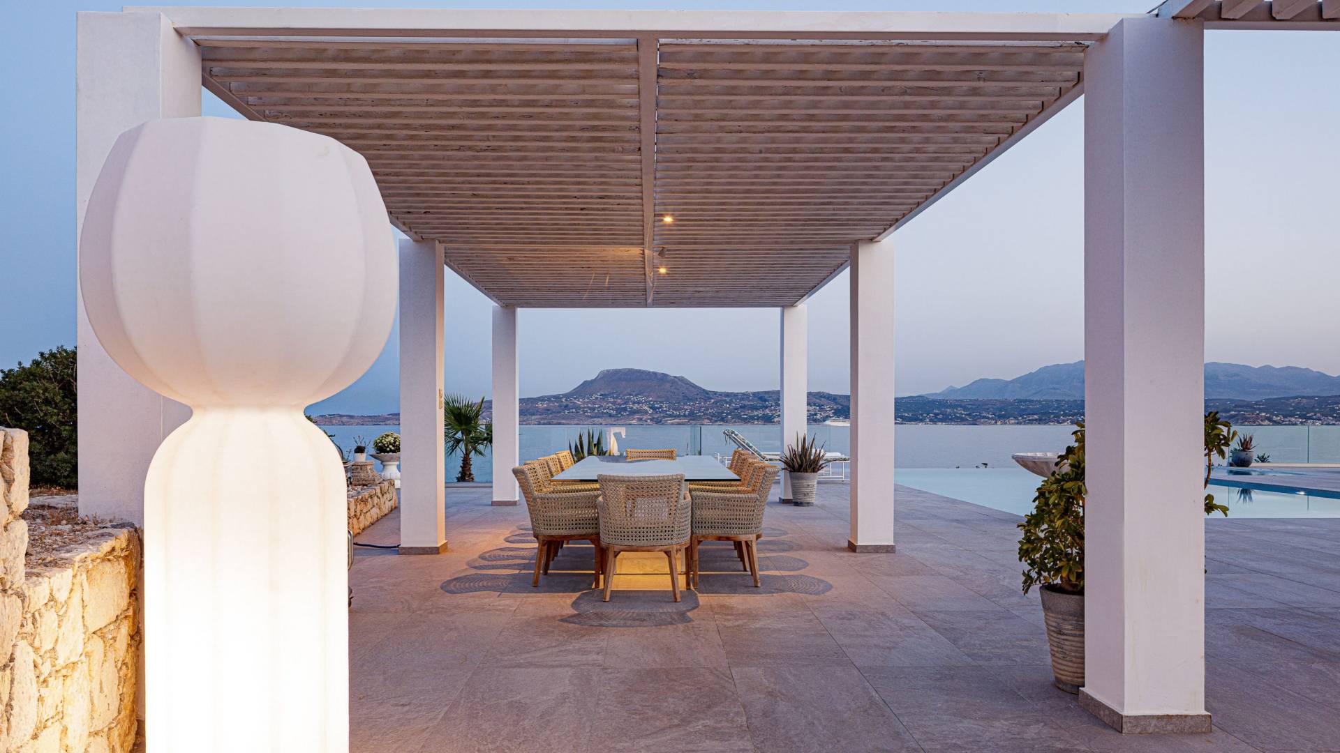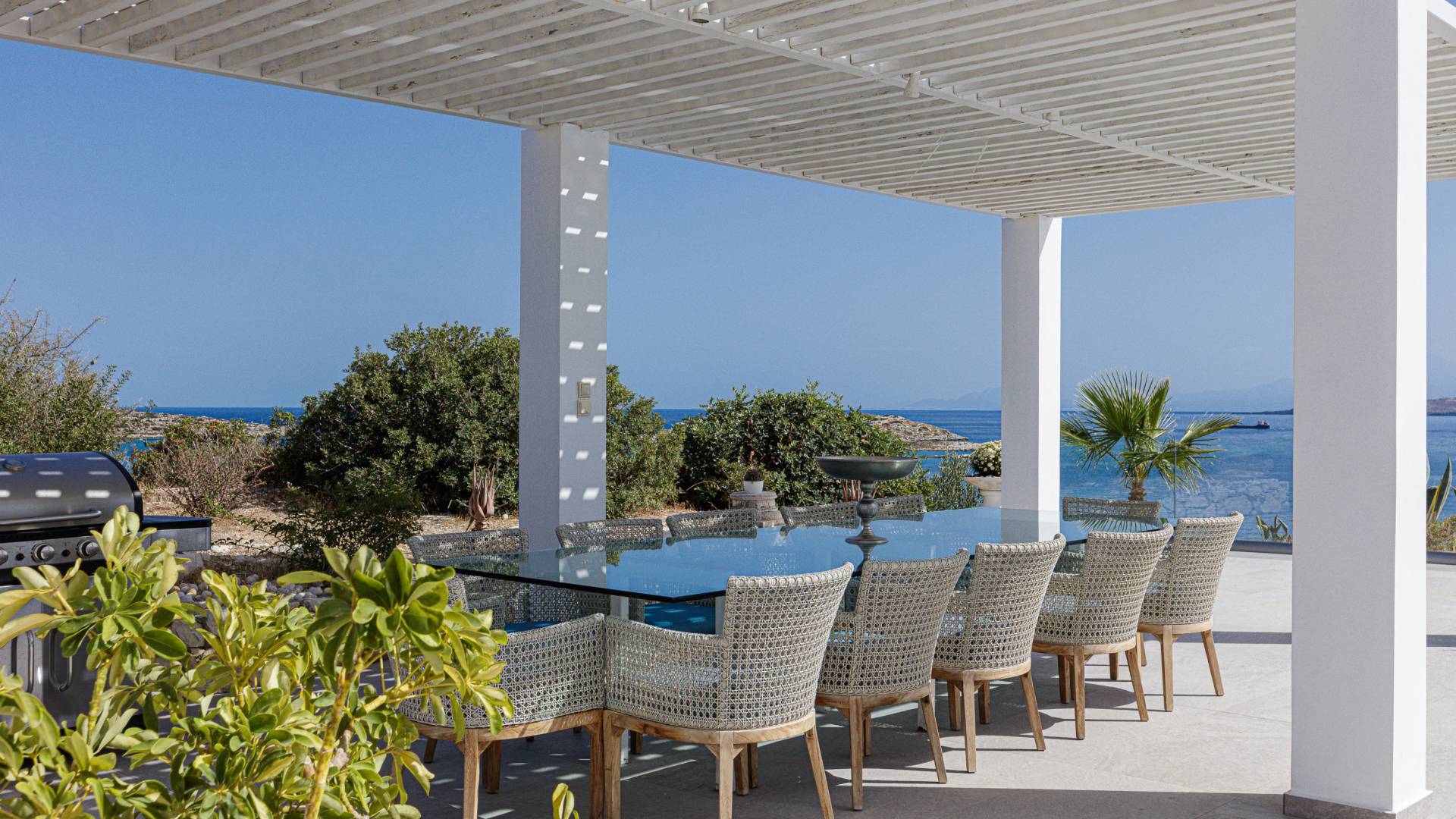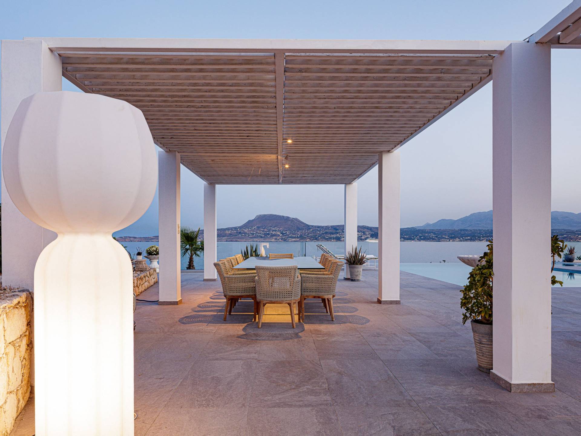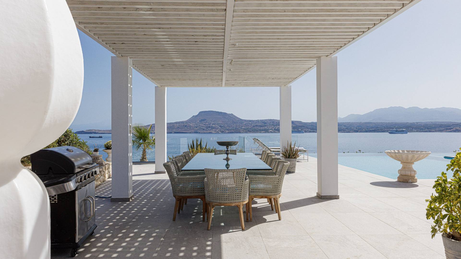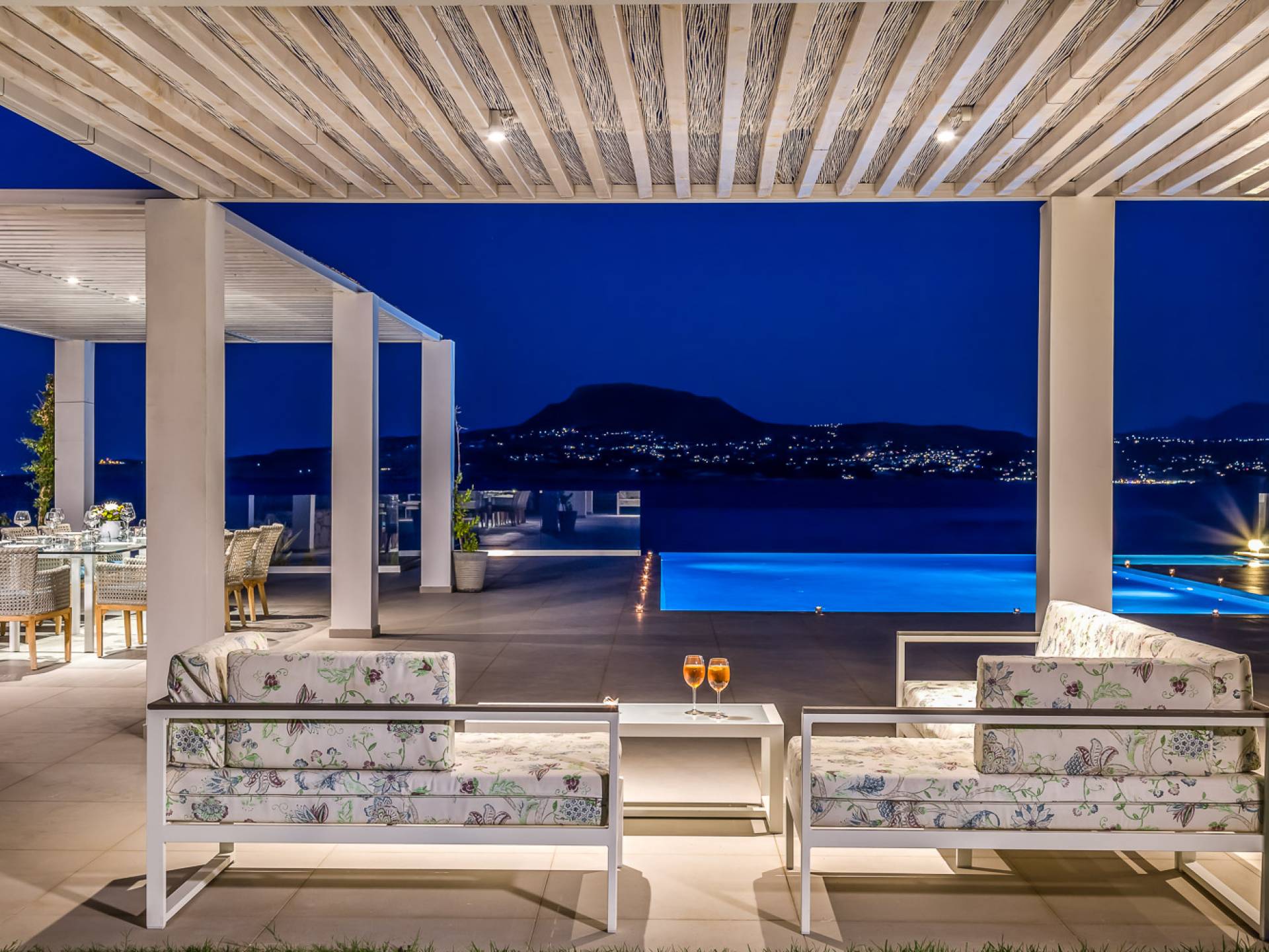 La piscina e la vasca idromassaggio integrata sono state progettate in linea con le impressionanti viste sul mare e sul cielo che si possono ammirare dalla villa. Una vista che vi consigliamo di godere all'ombra del pergolato e dei suoi intrecci profumati di gelsomini. Potrete godervi la vita all'aria aperta sedendovi al tavolo dalle linee pulite sotto il pergolato o sdraiandovi sui lettini a bordo piscina. Convenientemente adiacente all'area c'è la cucina completamente bianca con alzatina a specchio, completamente attrezzata con tutti gli accessori moderni, e la zona pranzo e salotto interna che conduce al resto della casa.