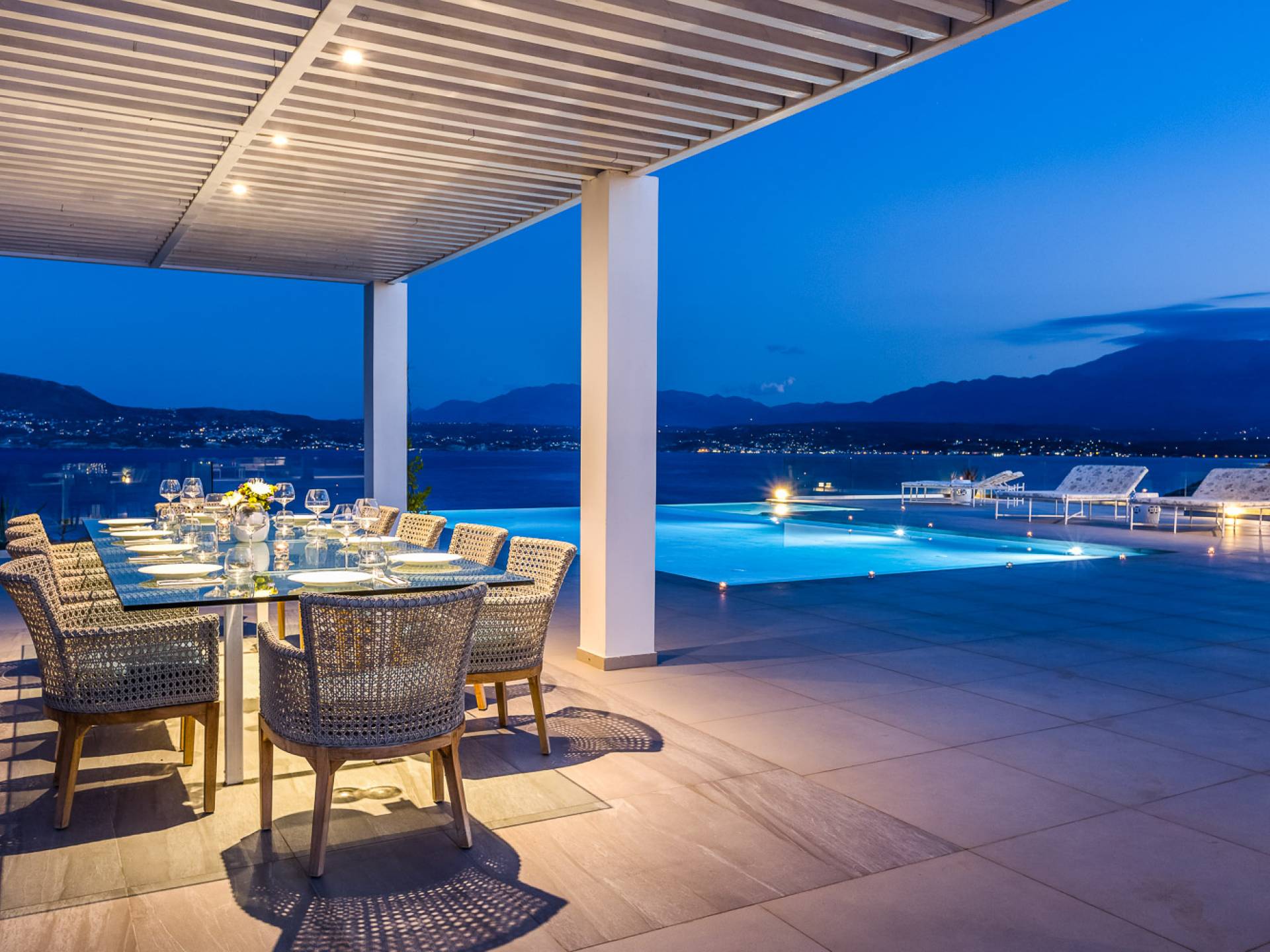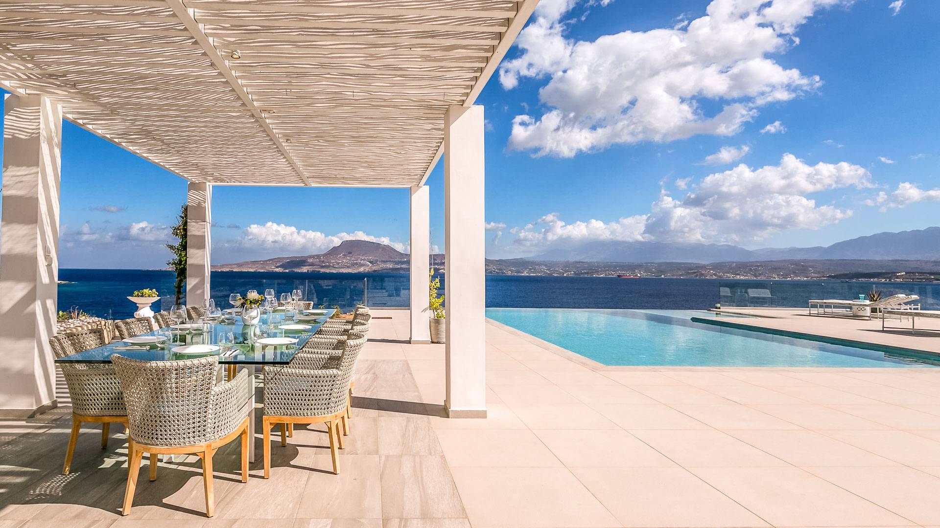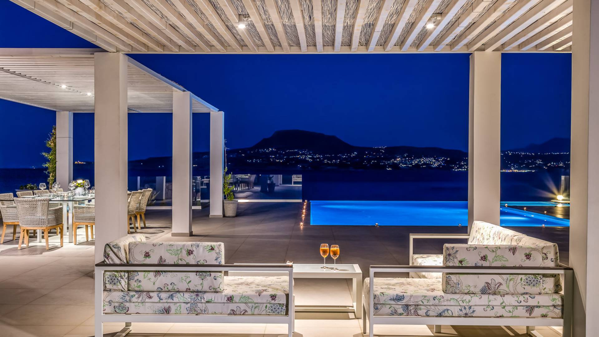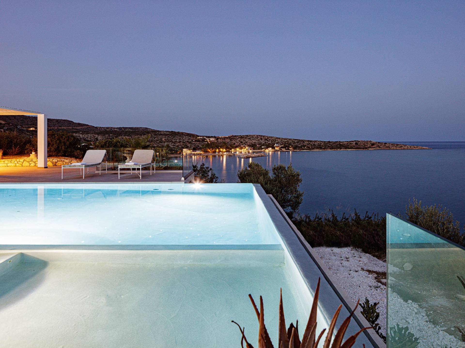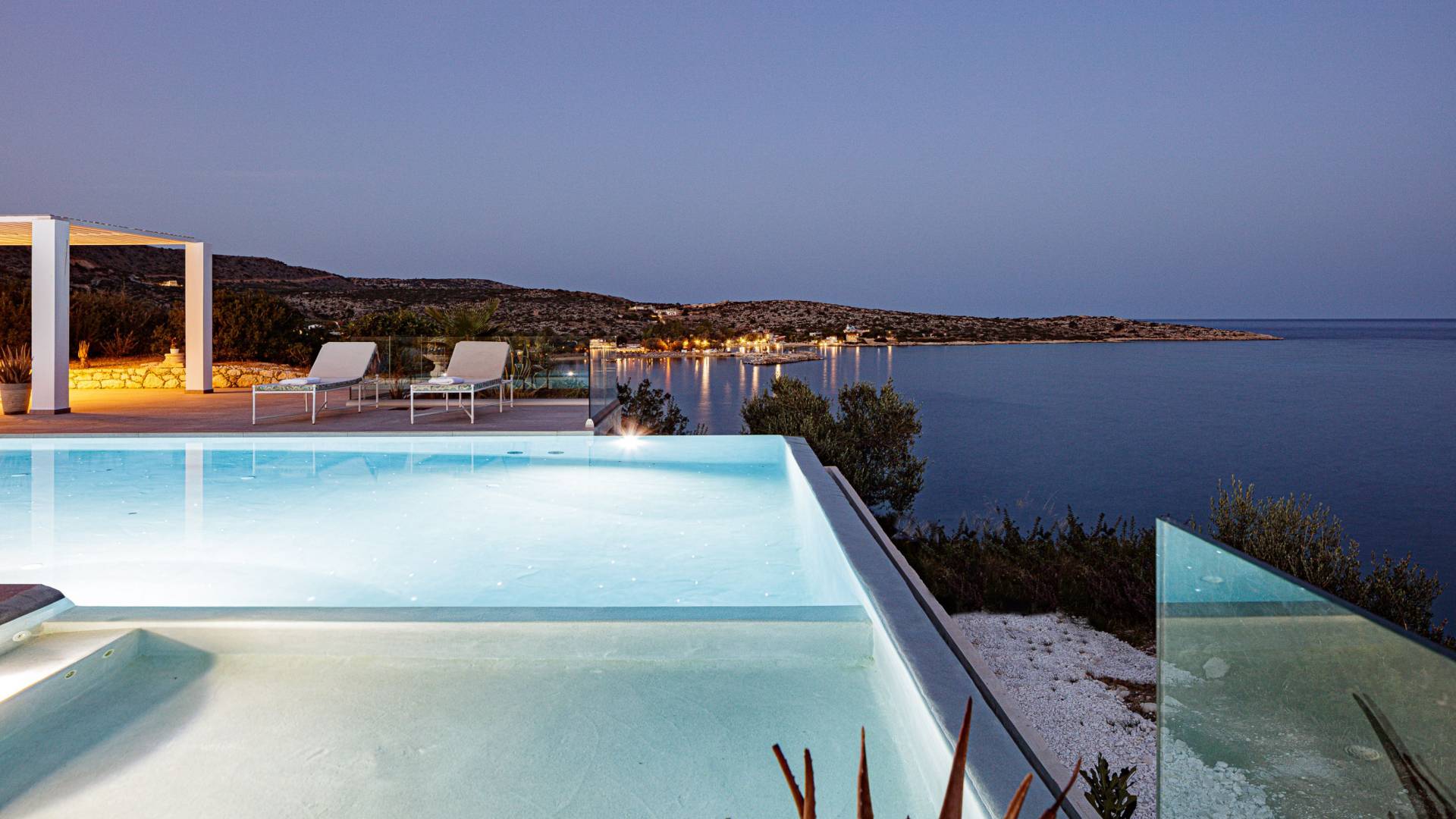 La piscina e la vasca idromassaggio integrata sono state progettate in linea con le impressionanti viste sul mare e sul cielo che si possono ammirare dalla villa. Una vista che vi consigliamo di godere all'ombra del pergolato e dei suoi intrecci profumati di gelsomini. Potrete godervi la vita all'aria aperta sedendovi al tavolo dalle linee pulite sotto il pergolato o sdraiandovi sui lettini a bordo piscina. Convenientemente adiacente all'area c'è la cucina completamente bianca con alzatina a specchio, completamente attrezzata con tutti gli accessori moderni, e la zona pranzo e salotto interna che conduce al resto della casa.