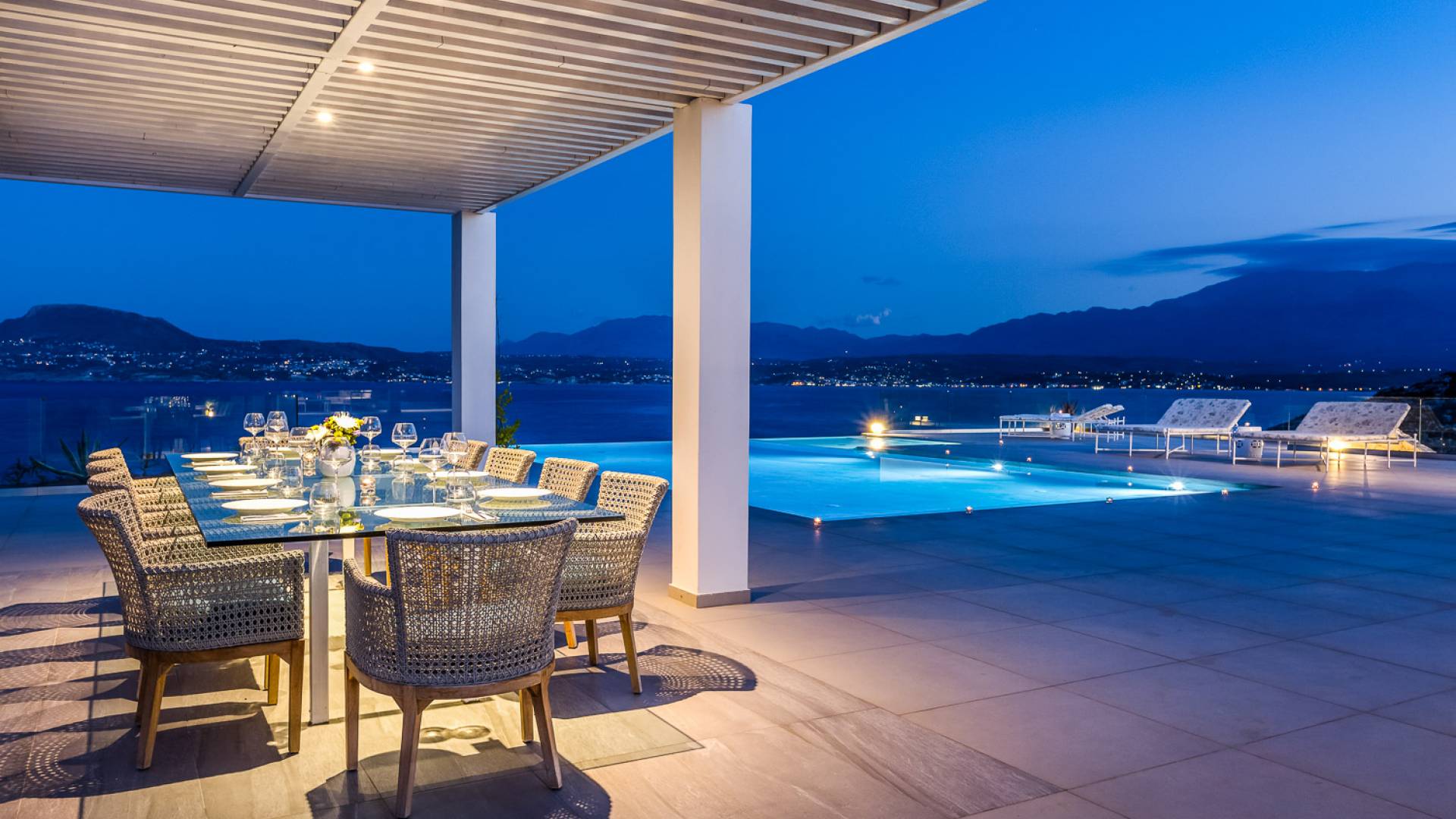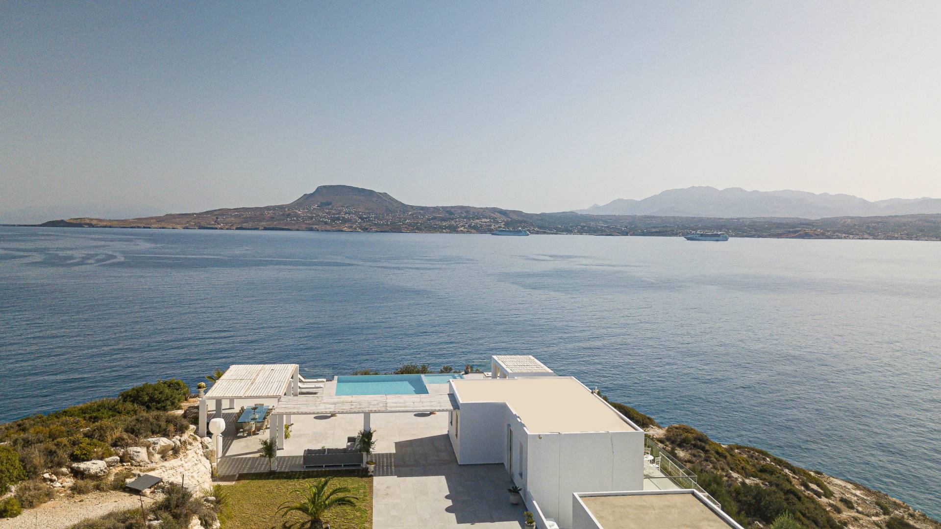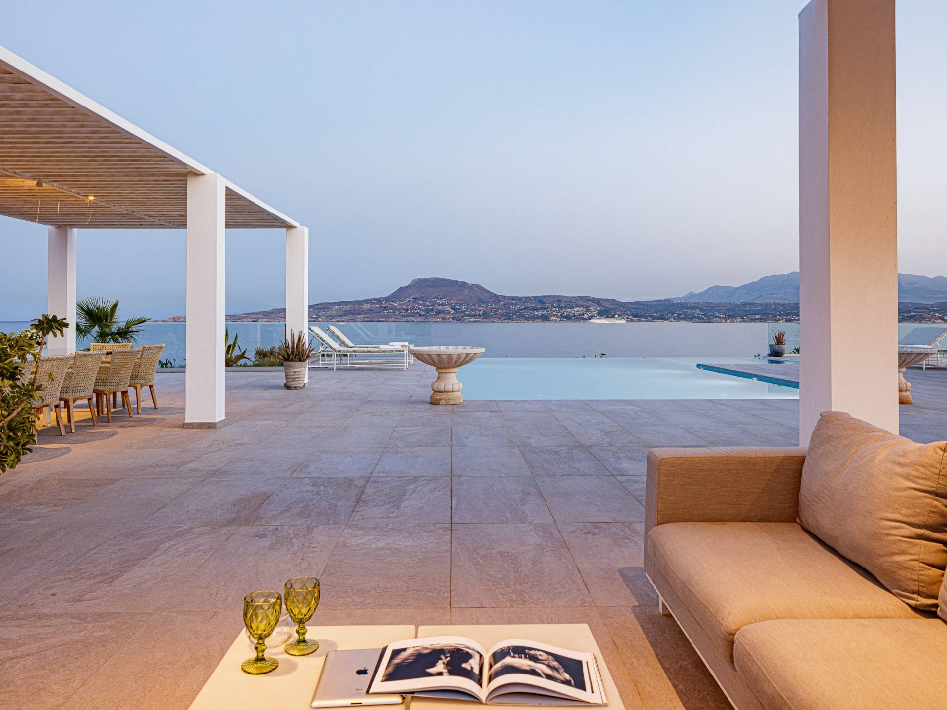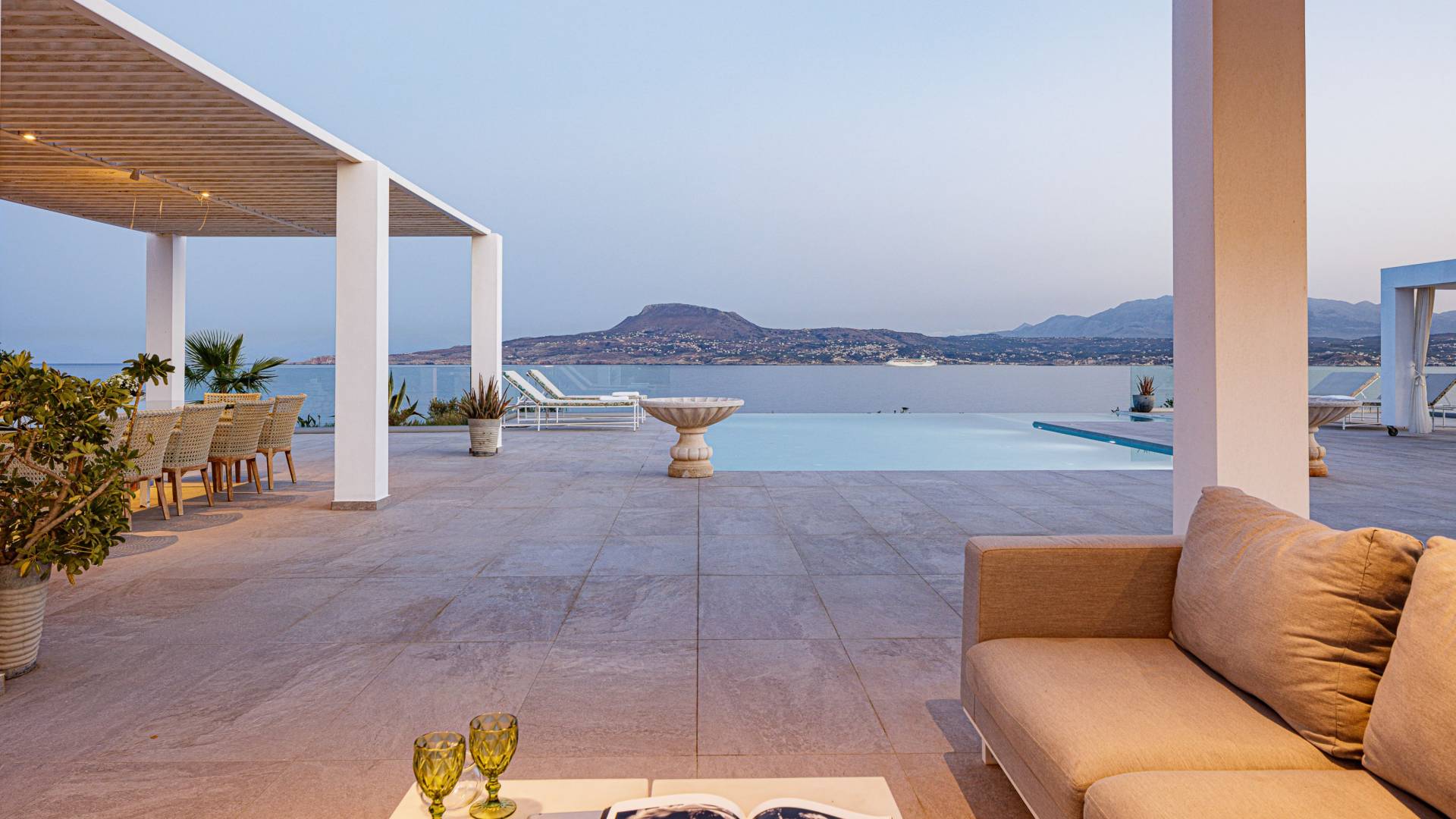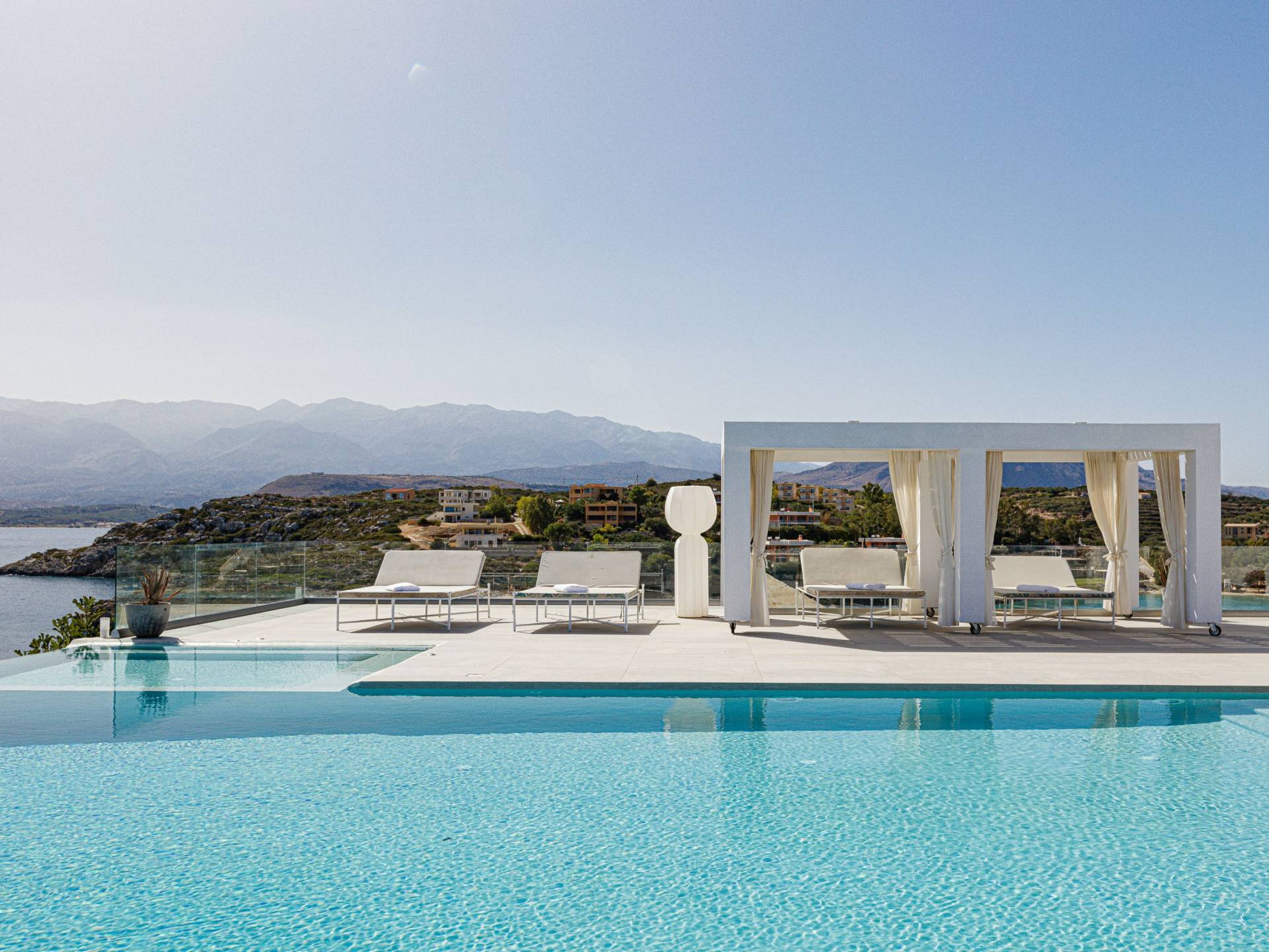 La piscina e la vasca idromassaggio integrata sono state progettate in linea con le impressionanti viste sul mare e sul cielo che si possono ammirare dalla villa. Una vista che vi consigliamo di godere all'ombra del pergolato e dei suoi intrecci profumati di gelsomini. Potrete godervi la vita all'aria aperta sedendovi al tavolo dalle linee pulite sotto il pergolato o sdraiandovi sui lettini a bordo piscina. Convenientemente adiacente all'area c'è la cucina completamente bianca con alzatina a specchio, completamente attrezzata con tutti gli accessori moderni, e la zona pranzo e salotto interna che conduce al resto della casa.