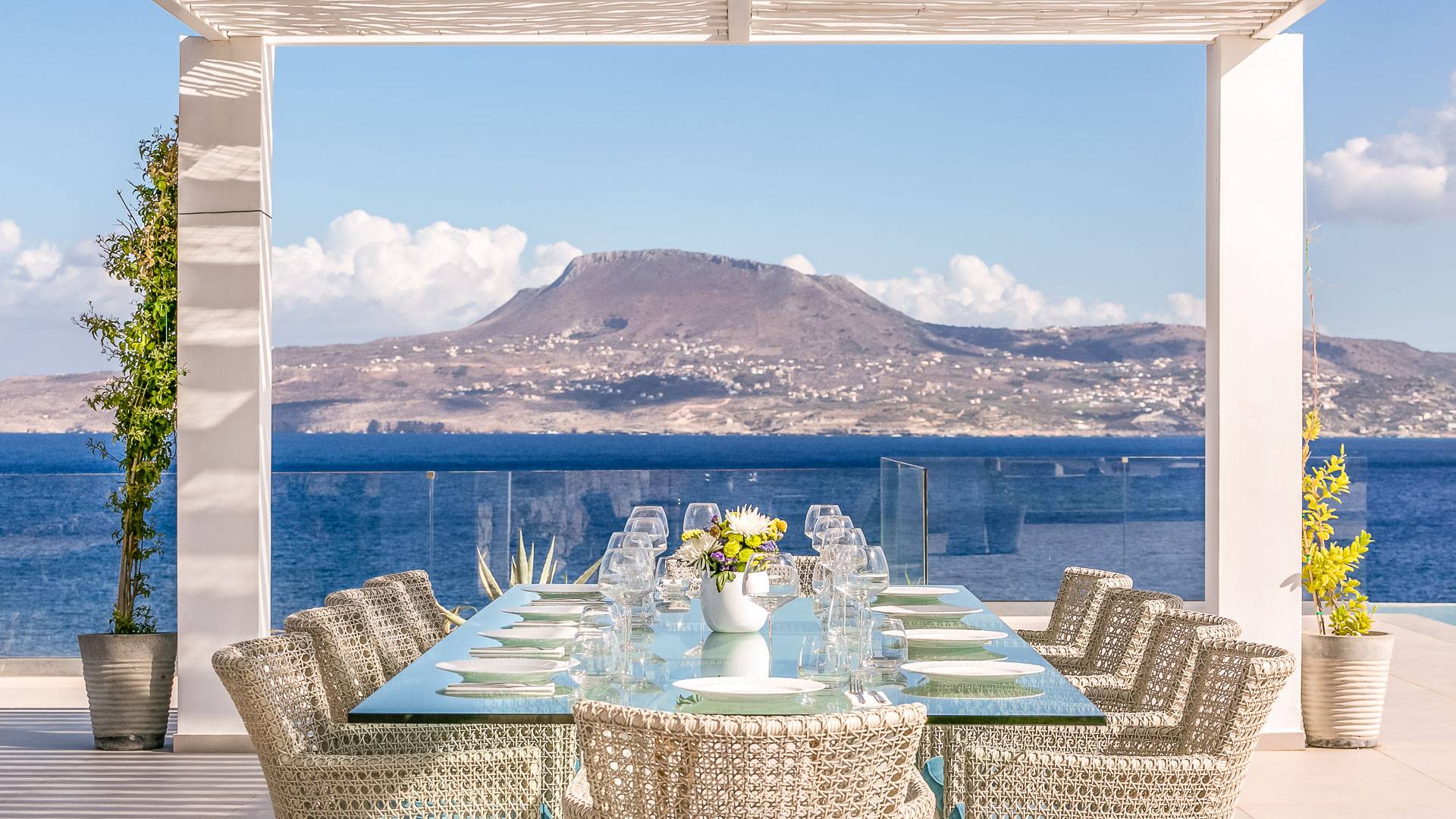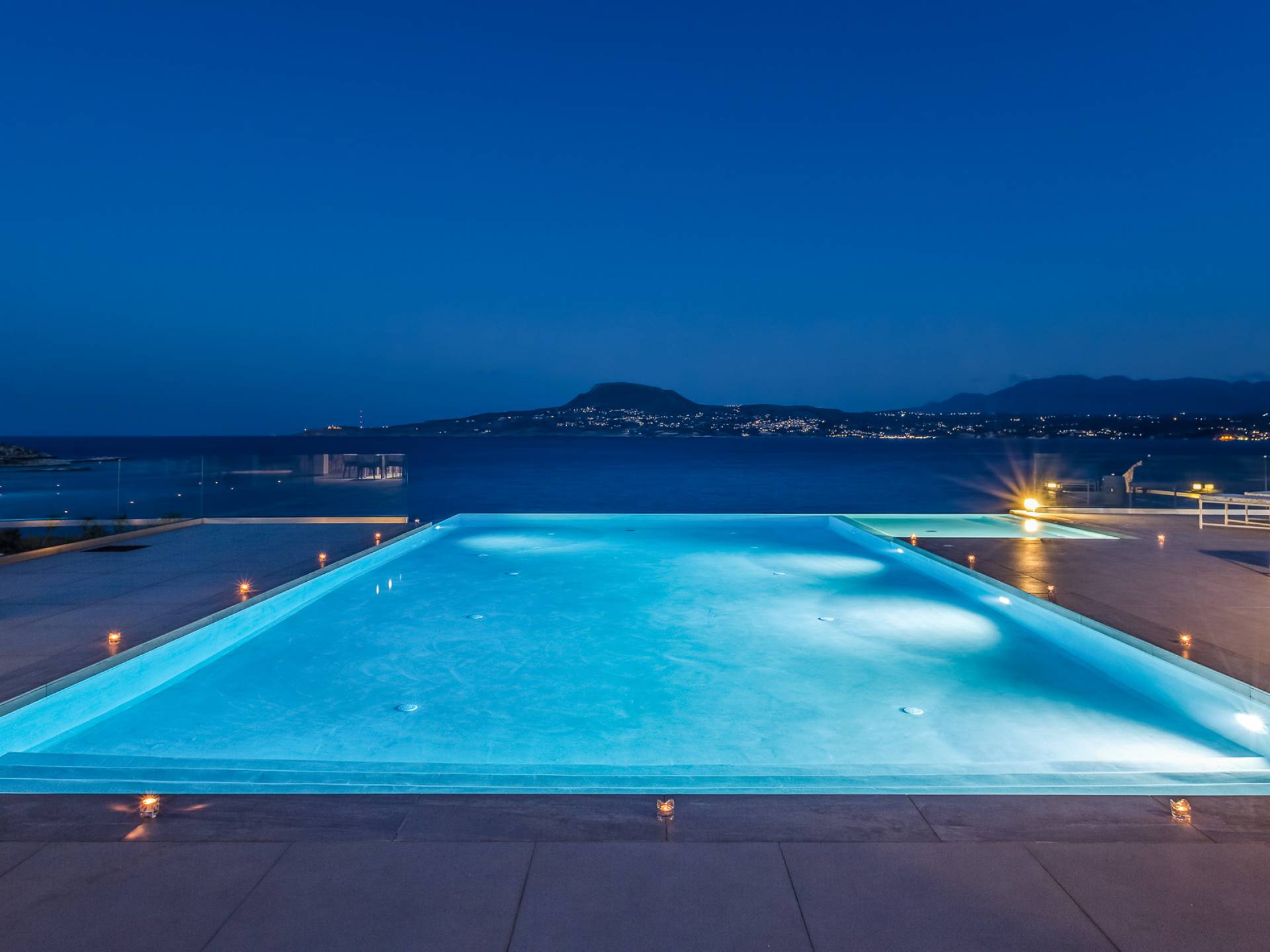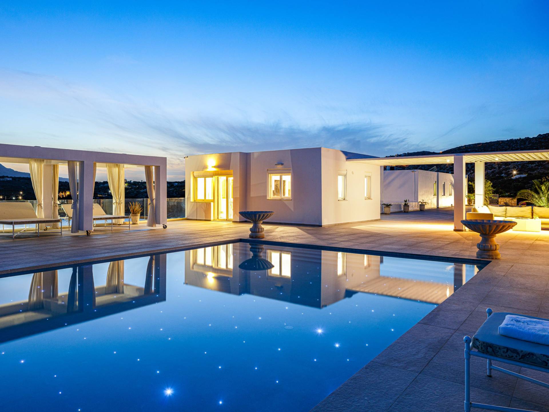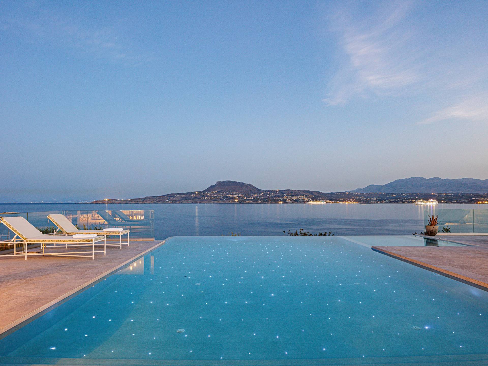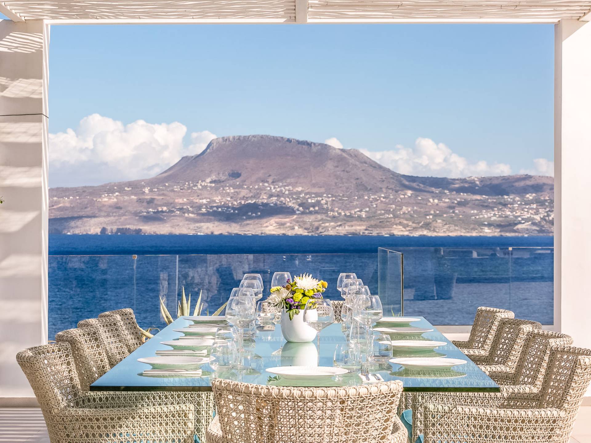 La piscina e la vasca idromassaggio integrata sono state progettate in linea con le impressionanti viste sul mare e sul cielo che si possono ammirare dalla villa. Una vista che vi consigliamo di godere all'ombra del pergolato e dei suoi intrecci profumati di gelsomini. Potrete godervi la vita all'aria aperta sedendovi al tavolo dalle linee pulite sotto il pergolato o sdraiandovi sui lettini a bordo piscina. Convenientemente adiacente all'area c'è la cucina completamente bianca con alzatina a specchio, completamente attrezzata con tutti gli accessori moderni, e la zona pranzo e salotto interna che conduce al resto della casa.