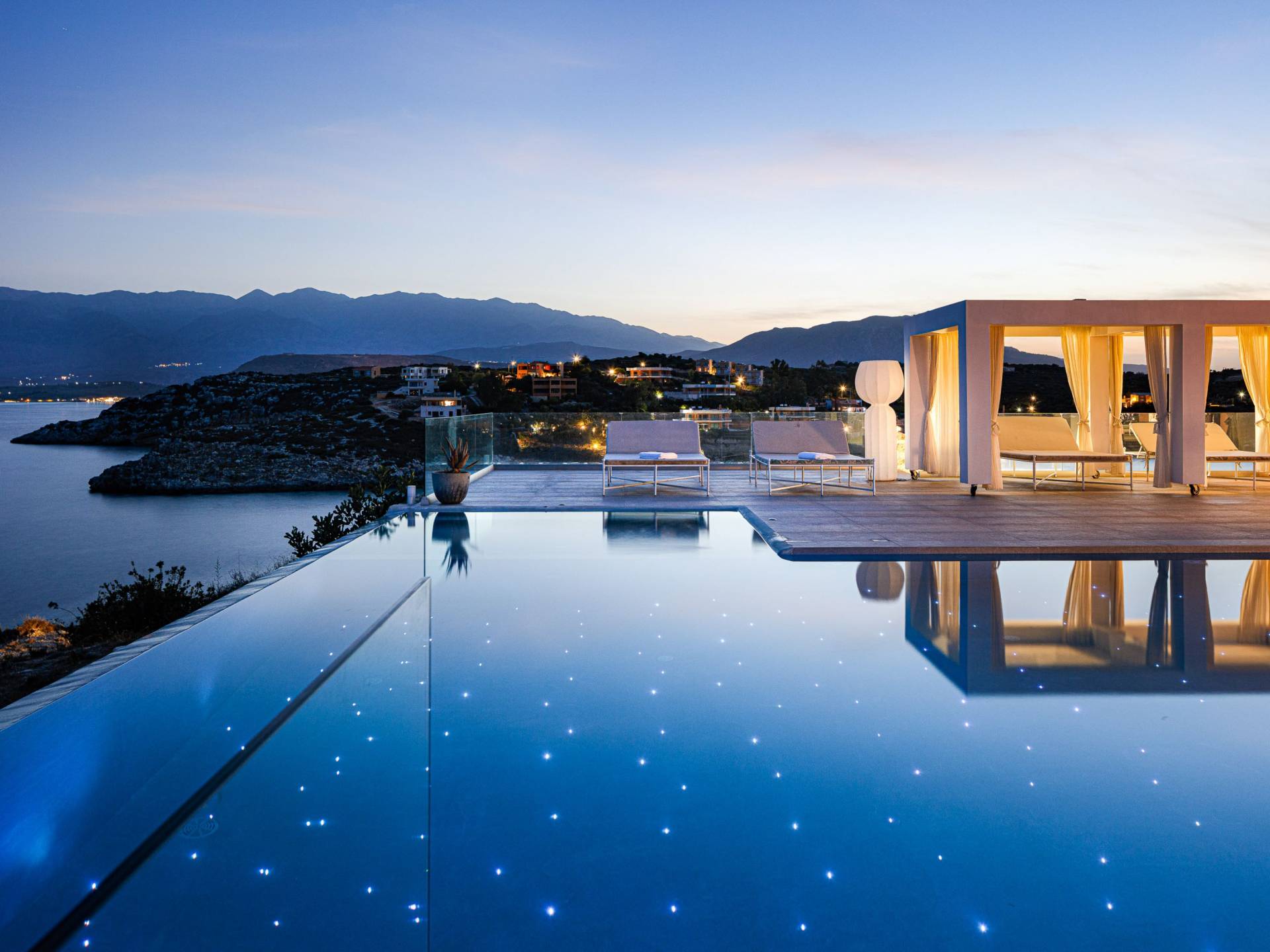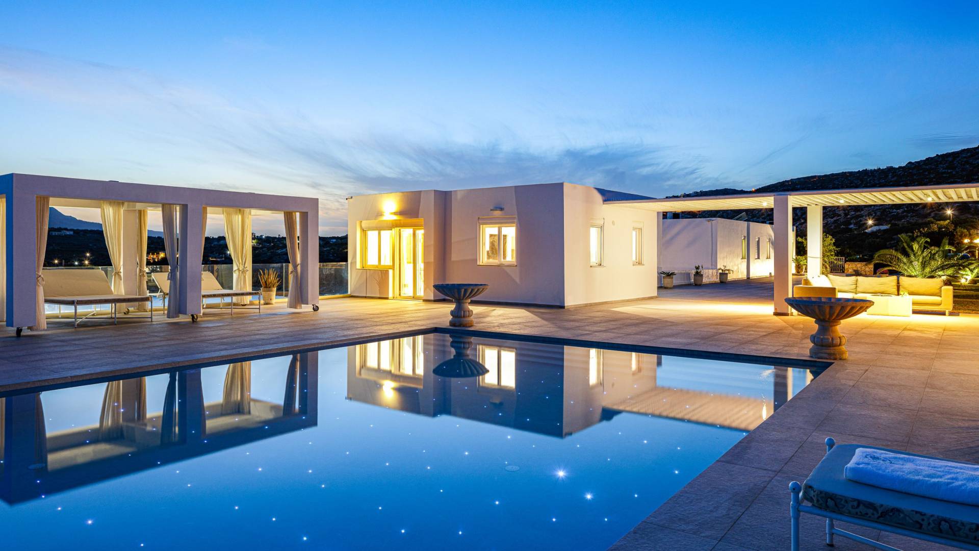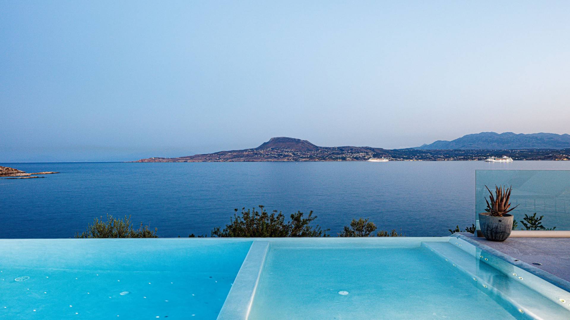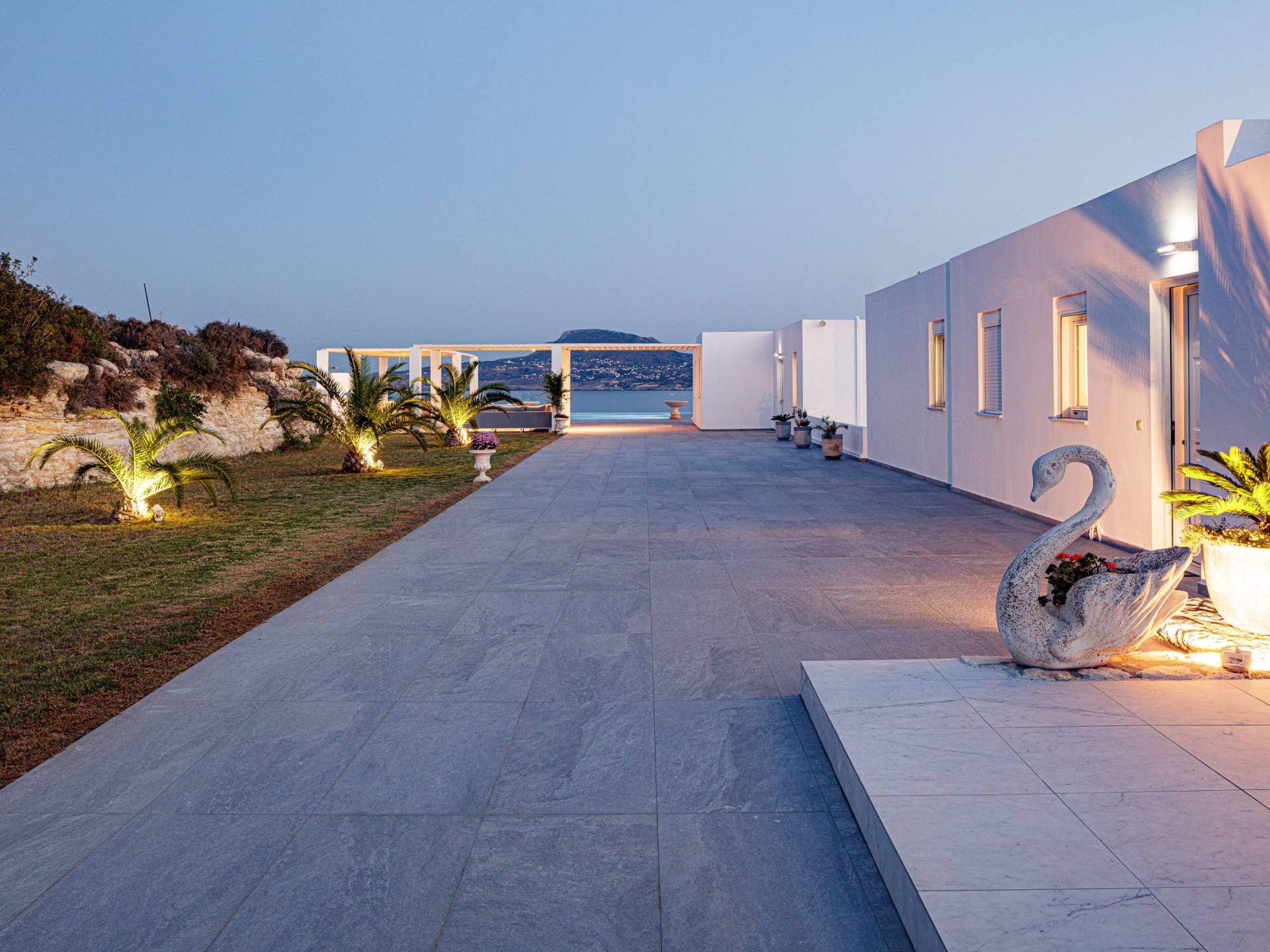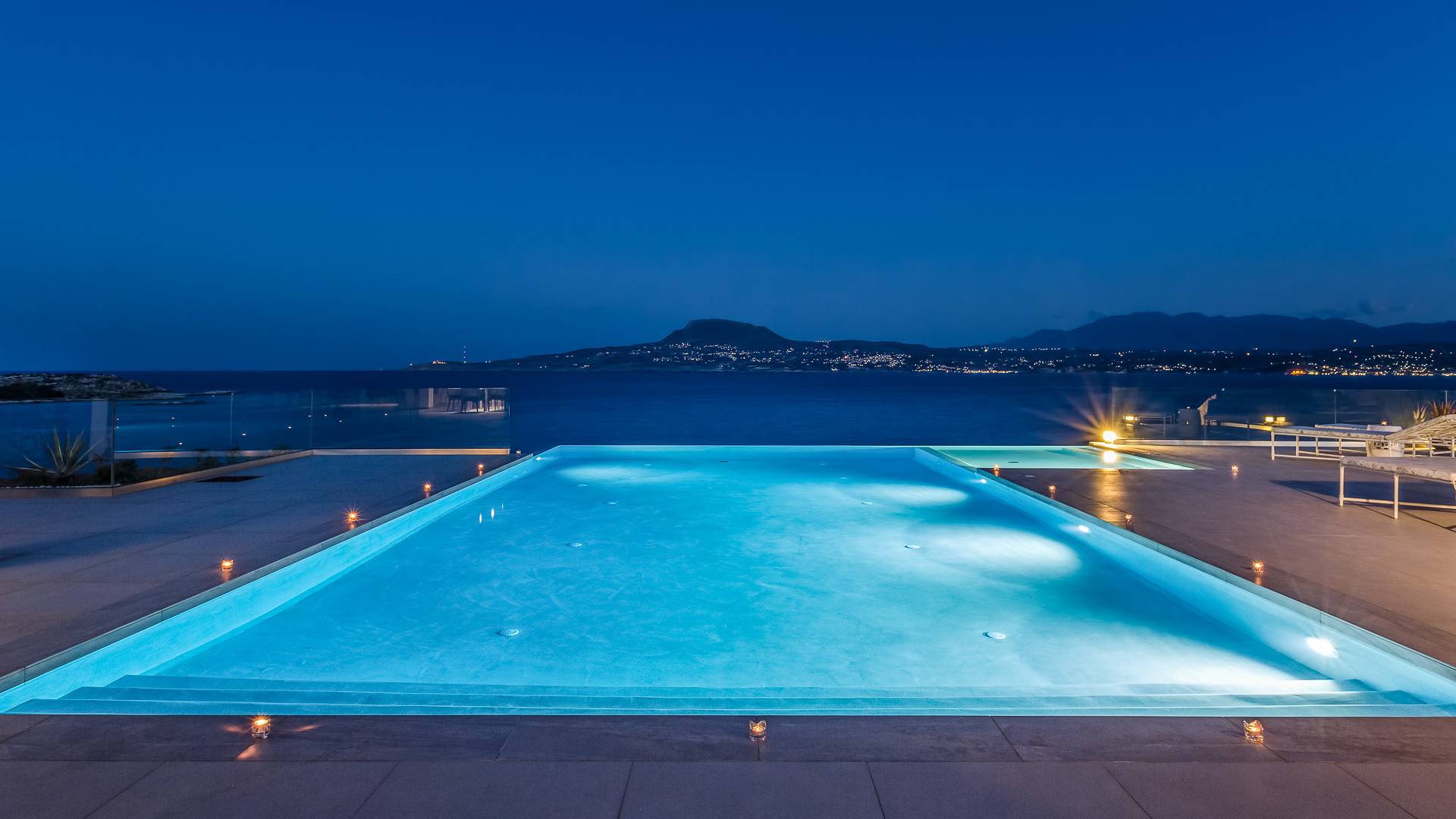 La piscina e la vasca idromassaggio integrata sono state progettate in linea con le impressionanti viste sul mare e sul cielo che si possono ammirare dalla villa. Una vista che vi consigliamo di godere all'ombra del pergolato e dei suoi intrecci profumati di gelsomini. Potrete godervi la vita all'aria aperta sedendovi al tavolo dalle linee pulite sotto il pergolato o sdraiandovi sui lettini a bordo piscina. Convenientemente adiacente all'area c'è la cucina completamente bianca con alzatina a specchio, completamente attrezzata con tutti gli accessori moderni, e la zona pranzo e salotto interna che conduce al resto della casa.