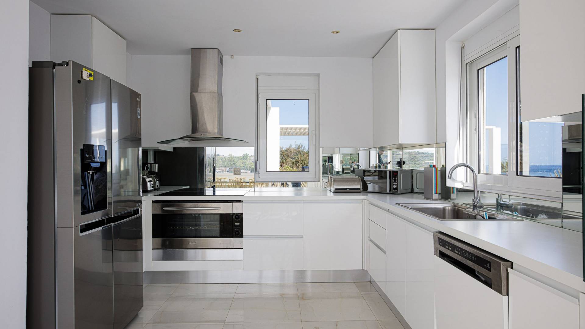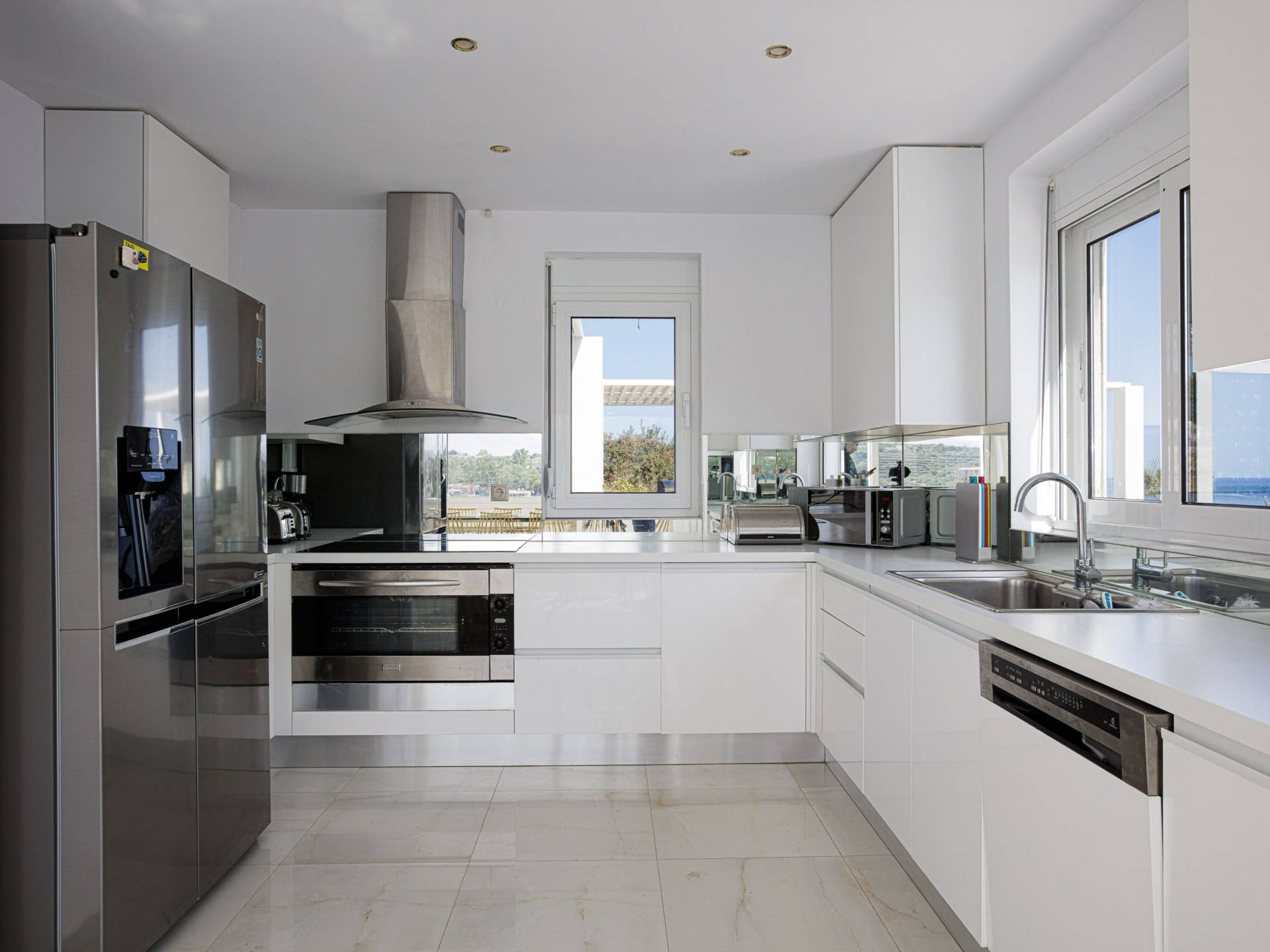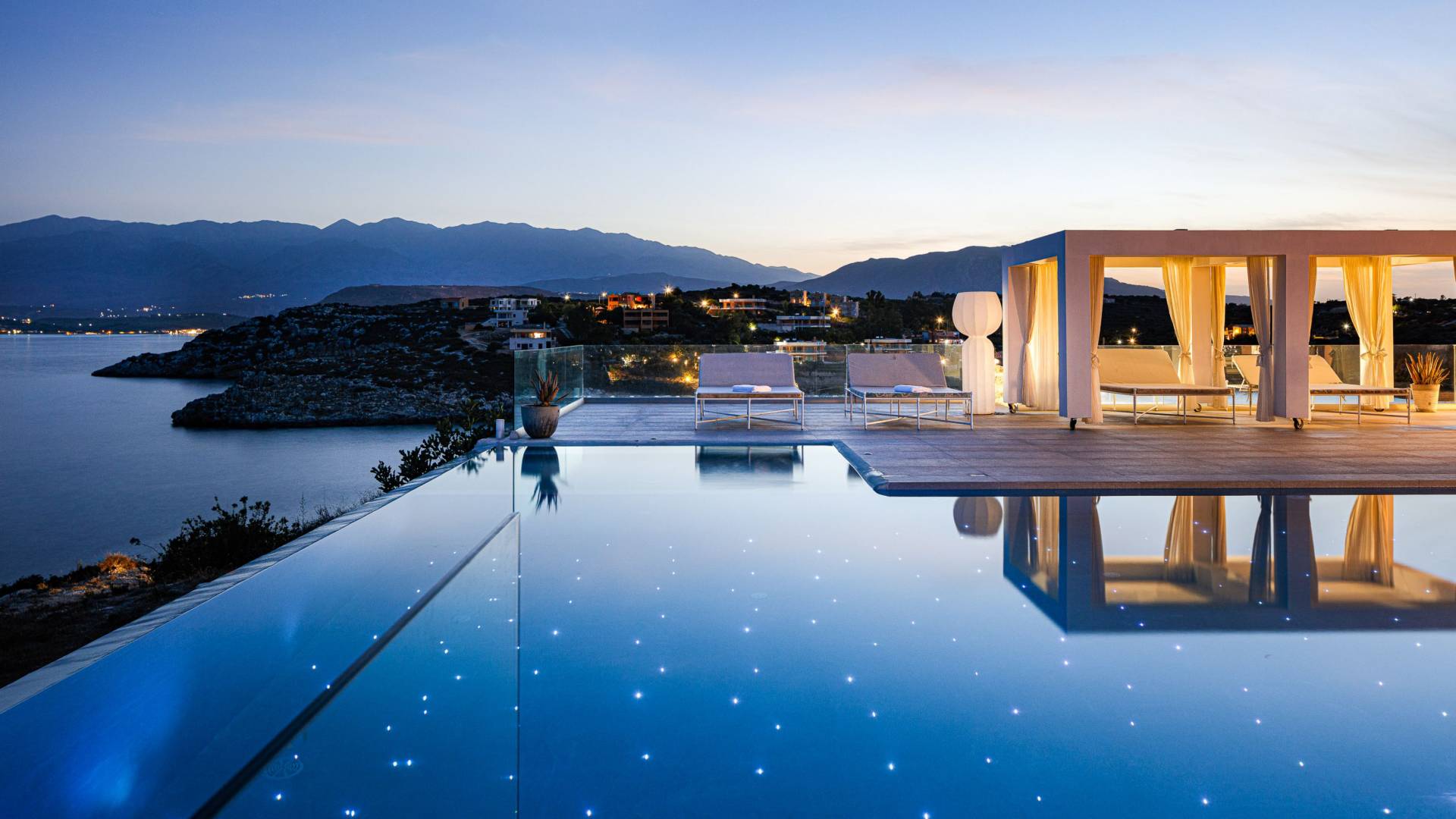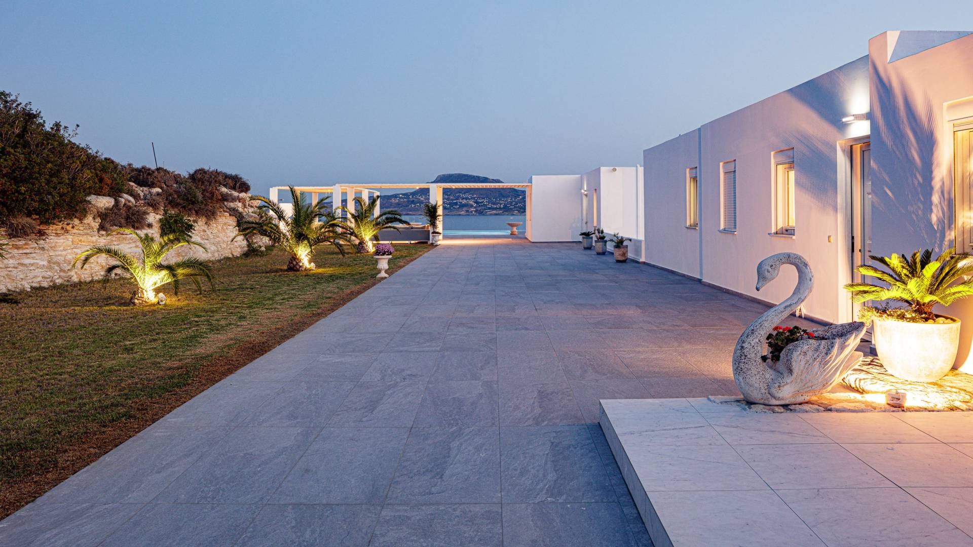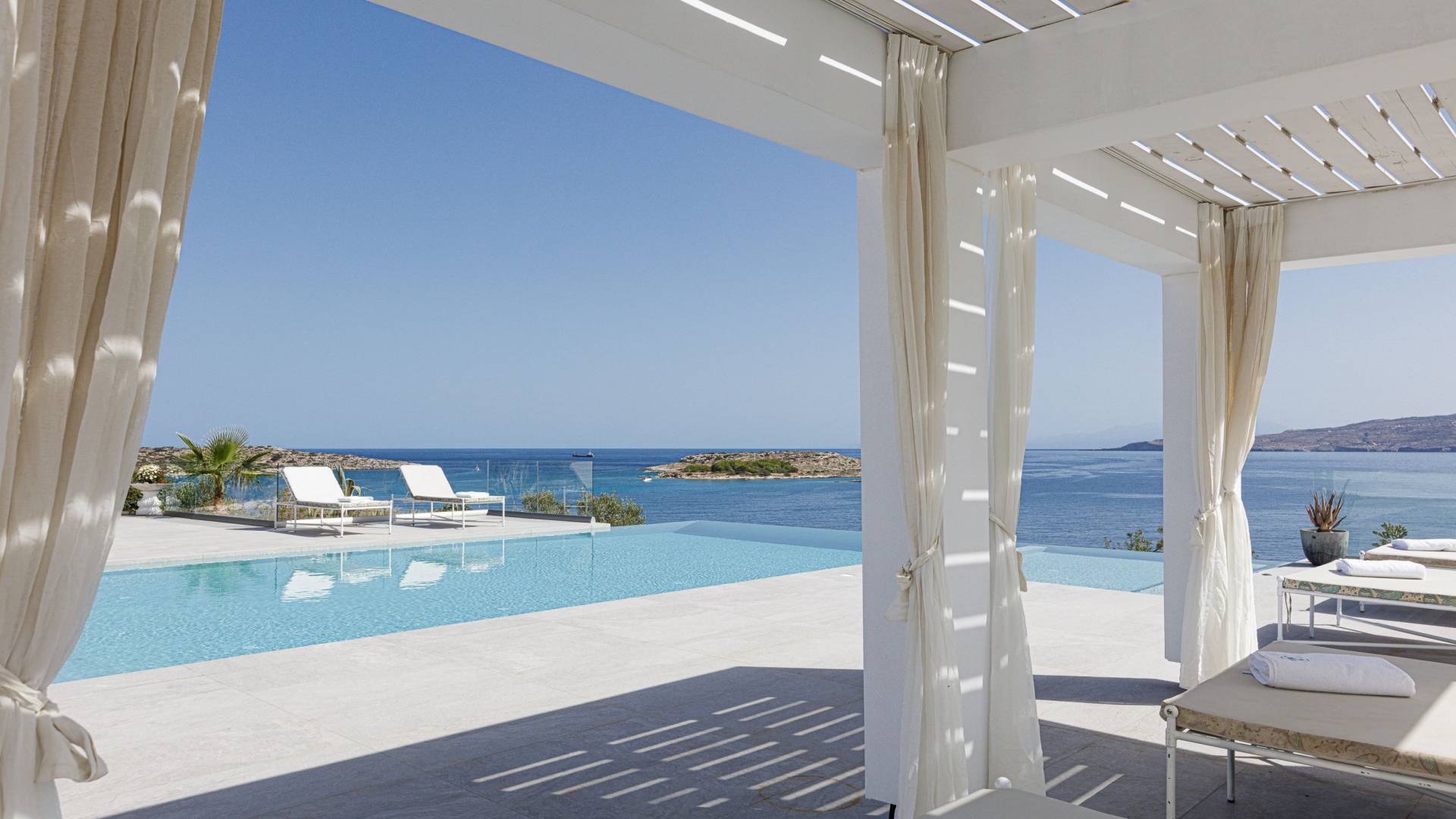 La piscina e la vasca idromassaggio integrata sono state progettate in linea con le impressionanti viste sul mare e sul cielo che si possono ammirare dalla villa. Una vista che vi consigliamo di godere all'ombra del pergolato e dei suoi intrecci profumati di gelsomini. Potrete godervi la vita all'aria aperta sedendovi al tavolo dalle linee pulite sotto il pergolato o sdraiandovi sui lettini a bordo piscina. Convenientemente adiacente all'area c'è la cucina completamente bianca con alzatina a specchio, completamente attrezzata con tutti gli accessori moderni, e la zona pranzo e salotto interna che conduce al resto della casa.
