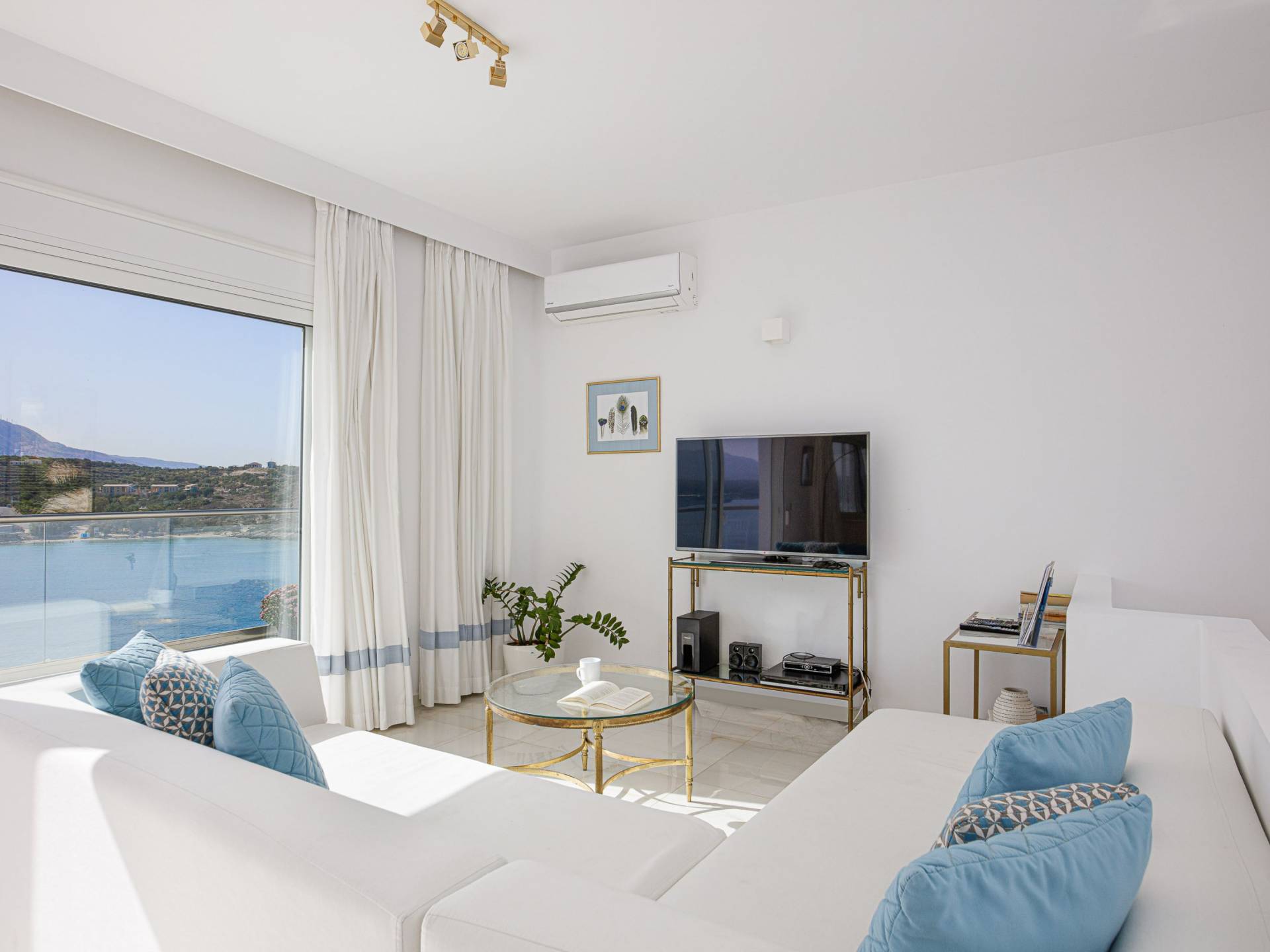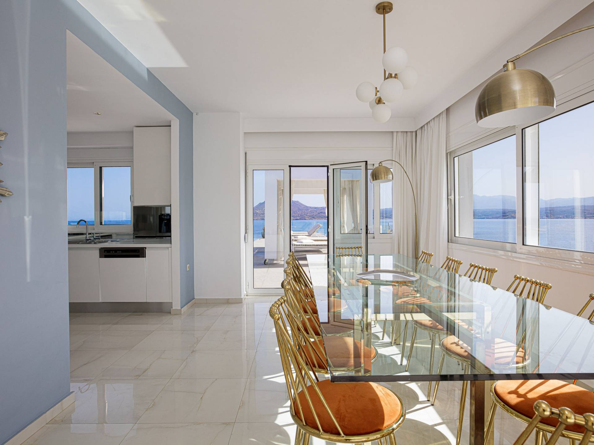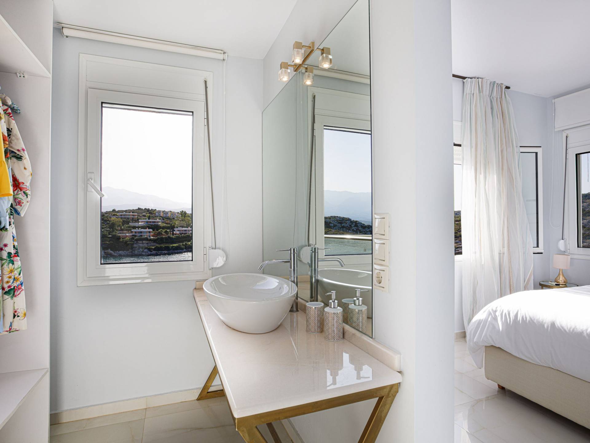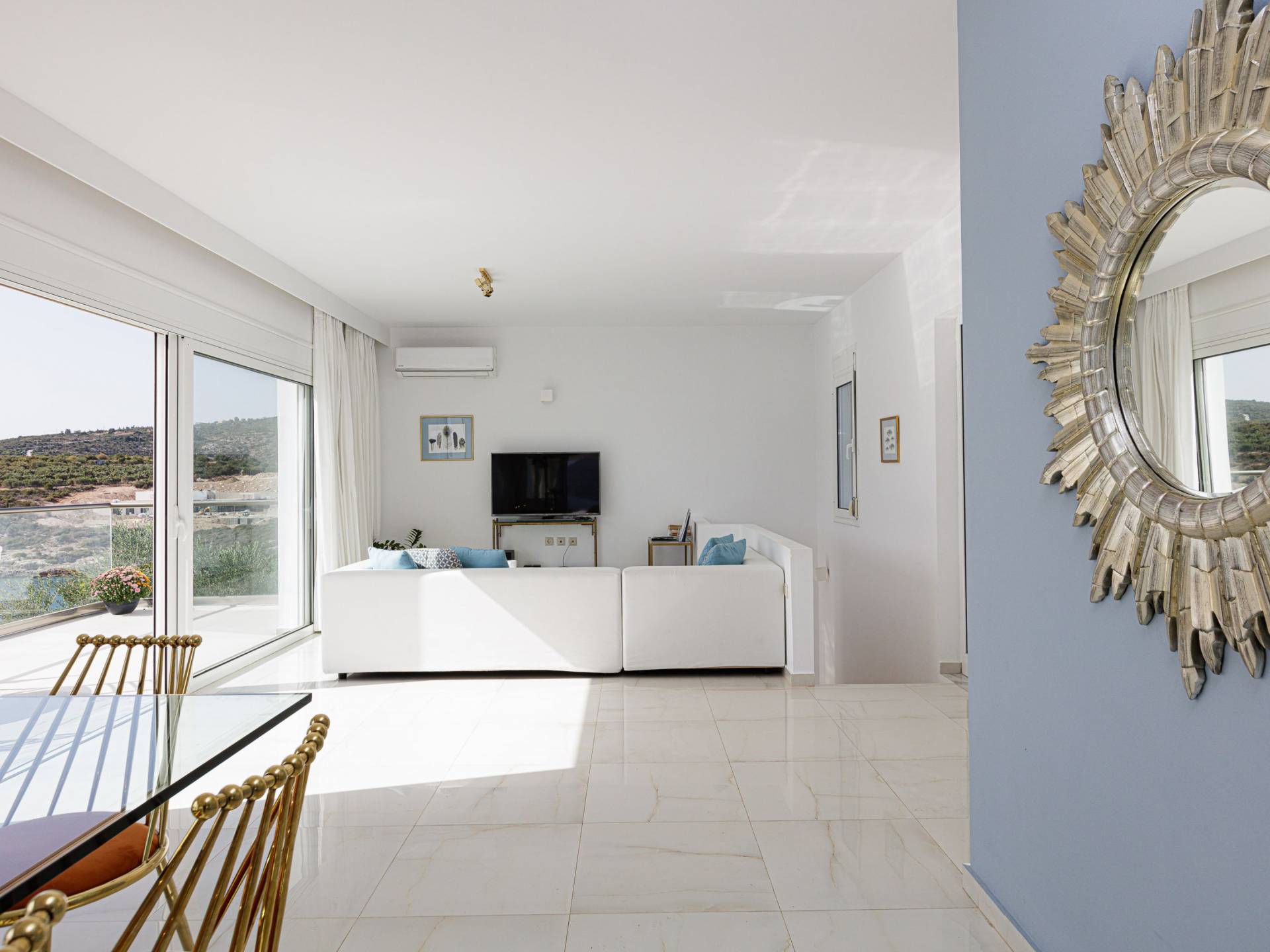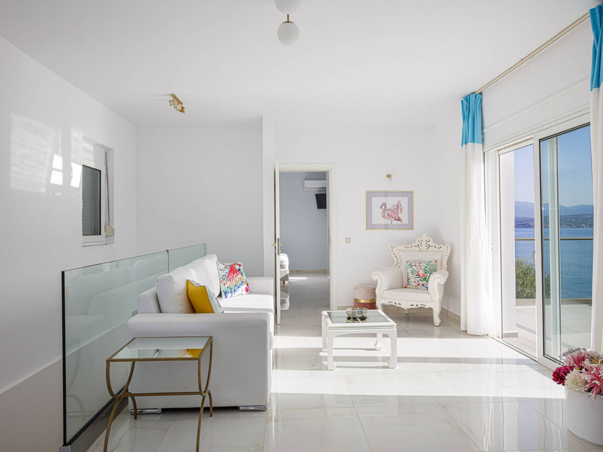 Villa Seasa Chania ha uno stile minimale ma eclettico con tocchi di ottone e colori oro. In tandem con le lussureggianti tende bianche che drappeggiano le porte scorrevoli in vetro che conducono ai balconi che offrono viste discrete sulla baia di Loutraki, l'arredamento ricorda il vecchio stile Regency. Questa è stata la base dell'intera costruzione e decorazione della villa ed è ciò che la rende unica e molto diversa dalle tendenze contemporanee di oggi.